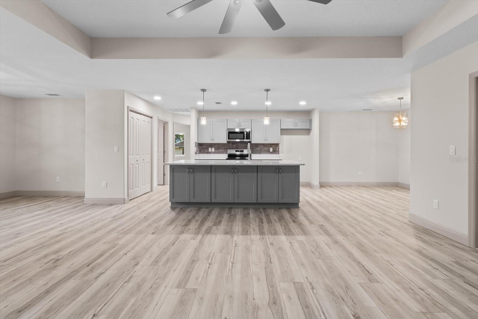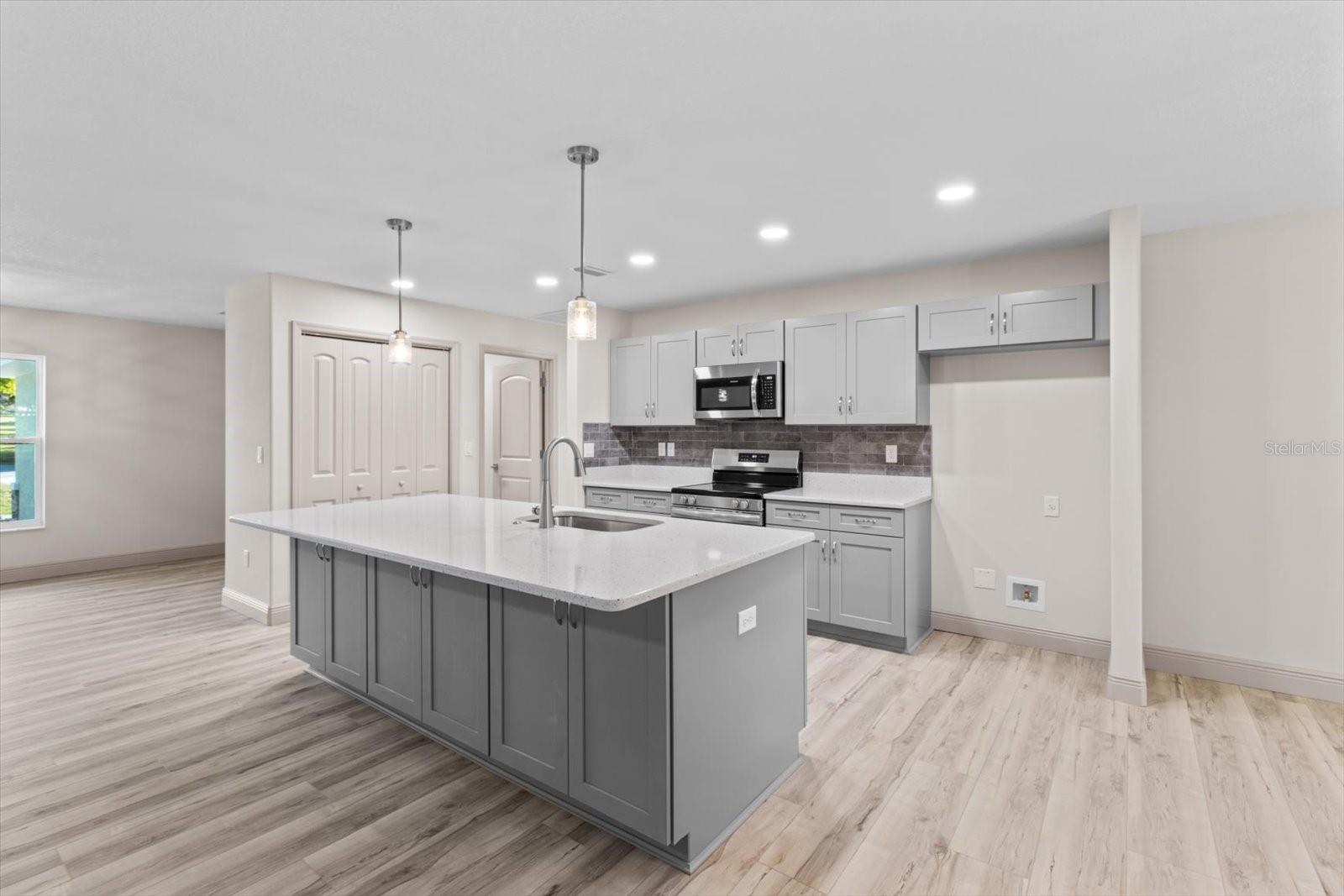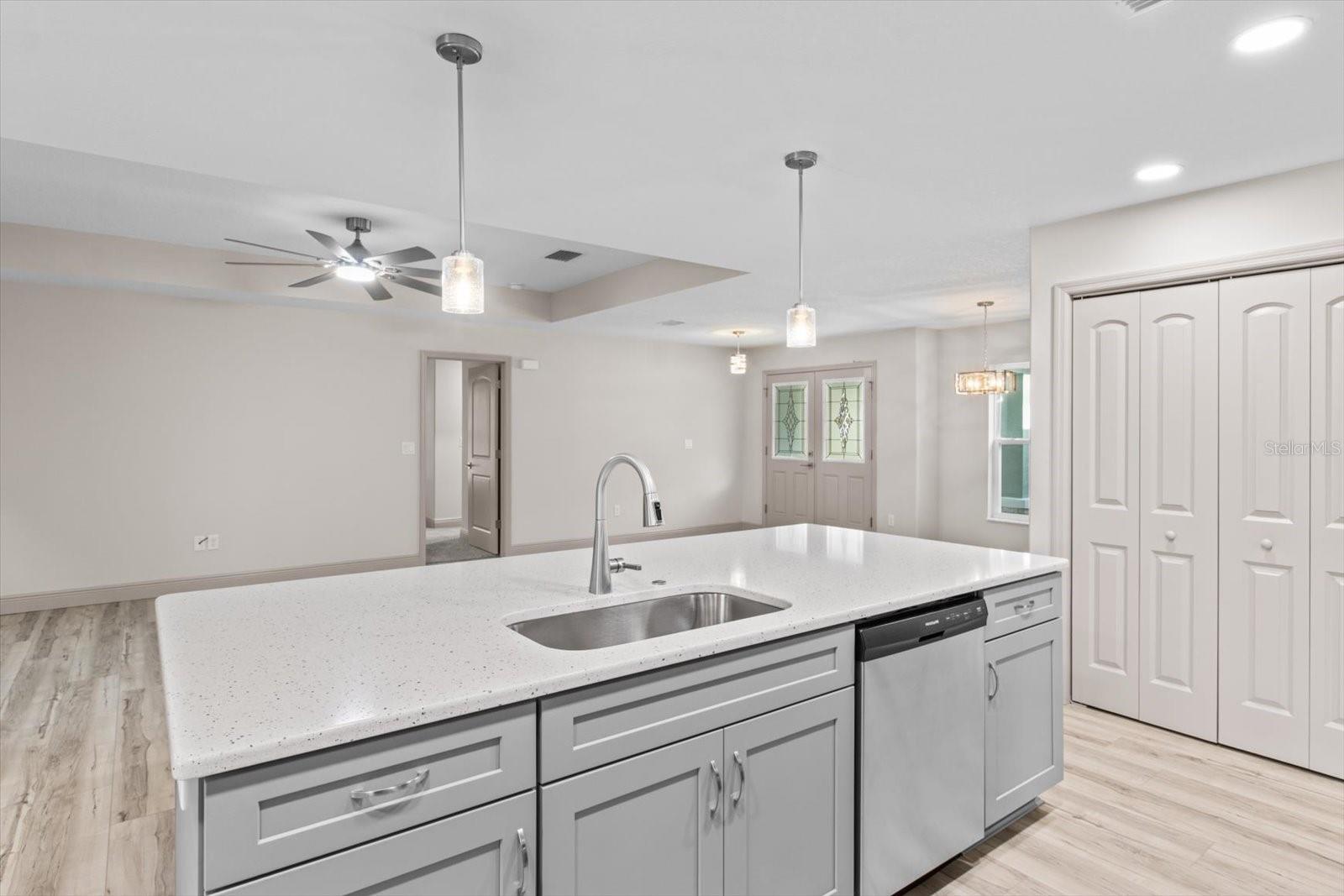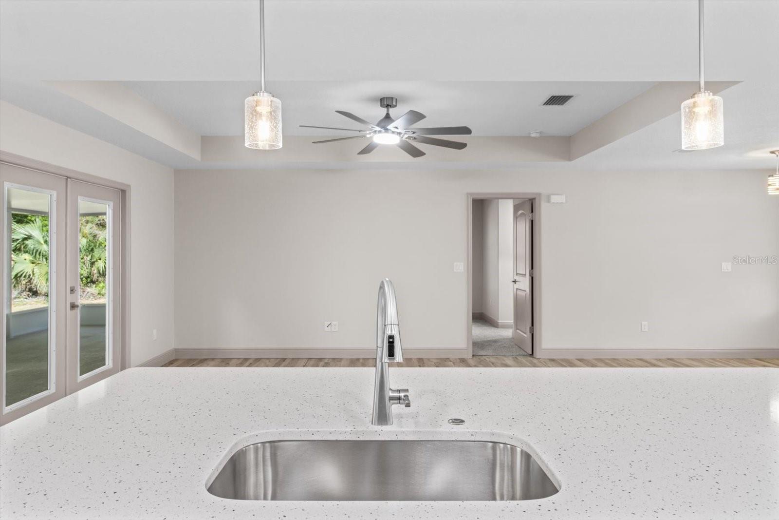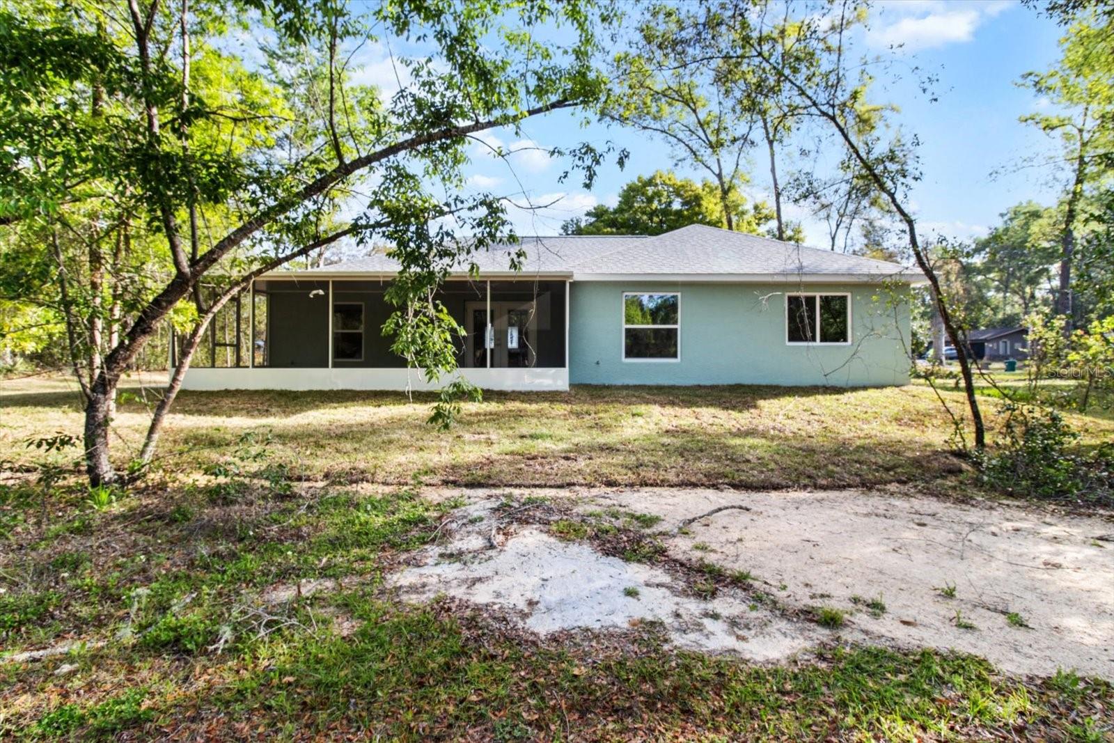 One or more photo(s) has been virtually staged. If you are looking for home in a quite neighborhood with the the golf course right across the street, this home is for you. Come check out this brand new beautifully landscaped home featuring 3 bedrooms, 2 full baths. The kitchen includes stainless-steel appliances, large quartz center island countertop and ceramic tile backsplash. The split-bedroom house plan includes luxury vinyl flooring throughout with carpet in the bedrooms and trey ceilings, . The primary bedroom has 2 large walk in closets and en-suite with a large tiled shower and double sinks. The home also has an interior laundry room and large enclosed lanai to sit and enjoy nature. There is a two car garage with epoxy flooring. There is no Homeowners Association (HOA), only an architectural committee.