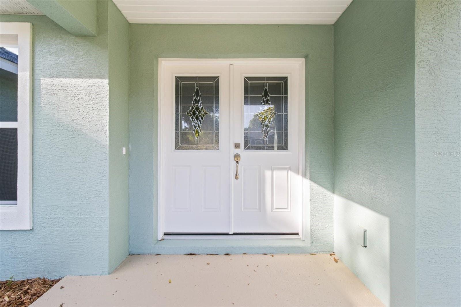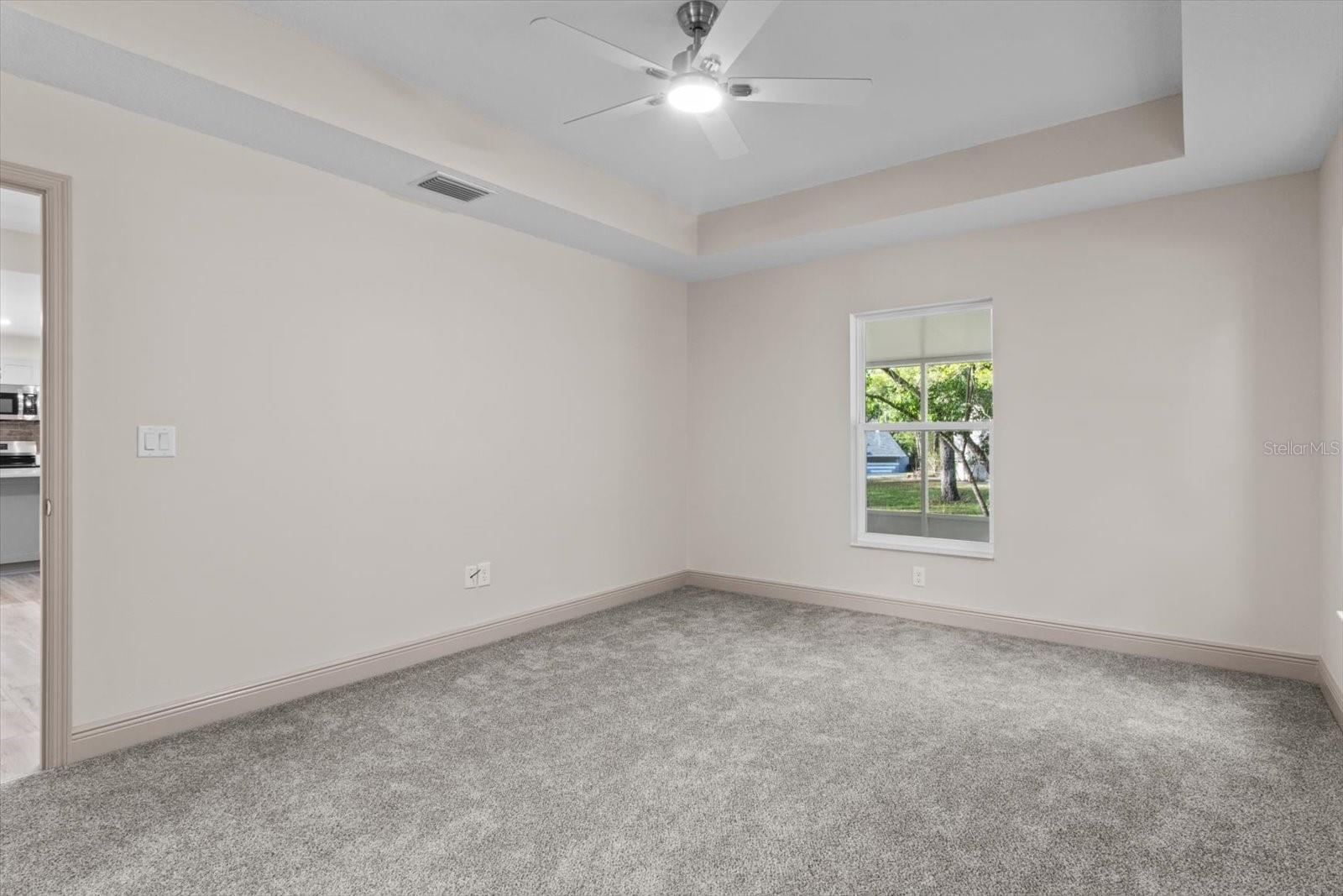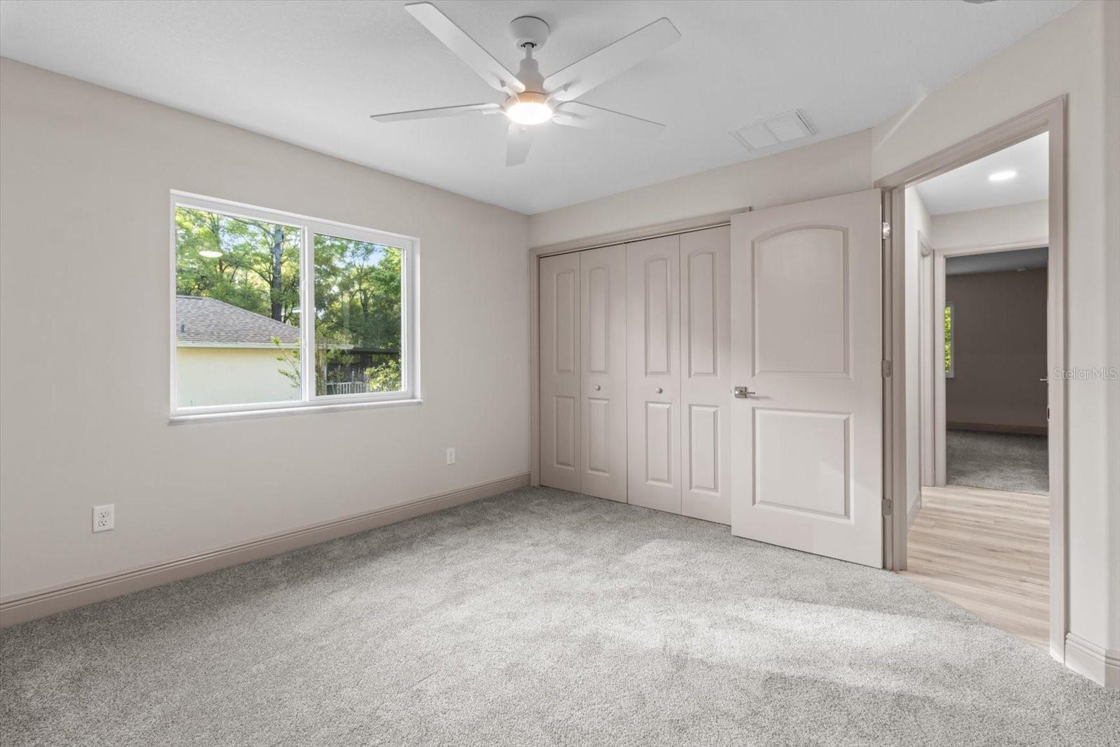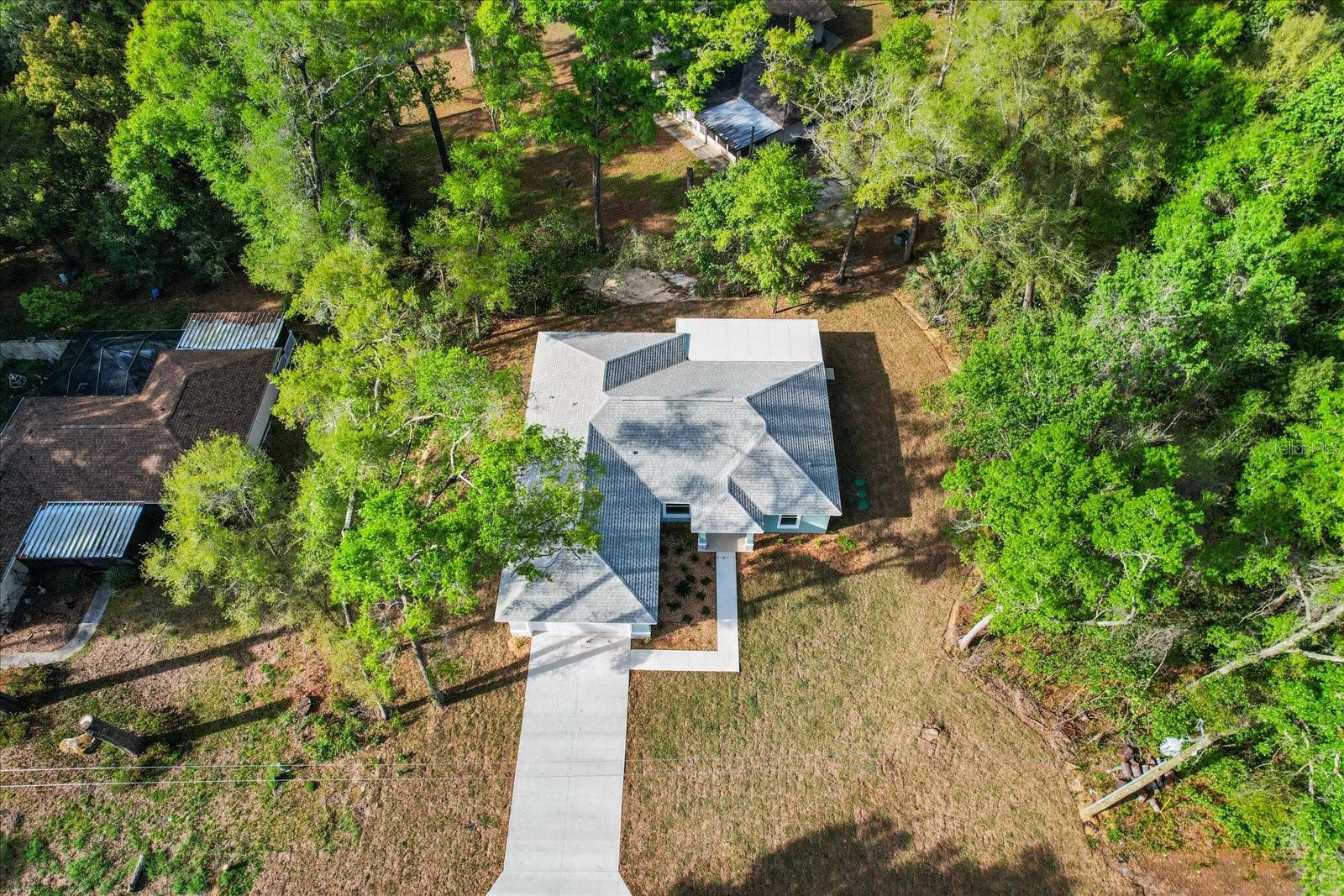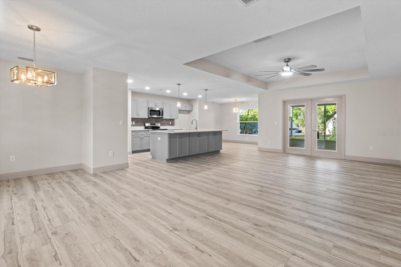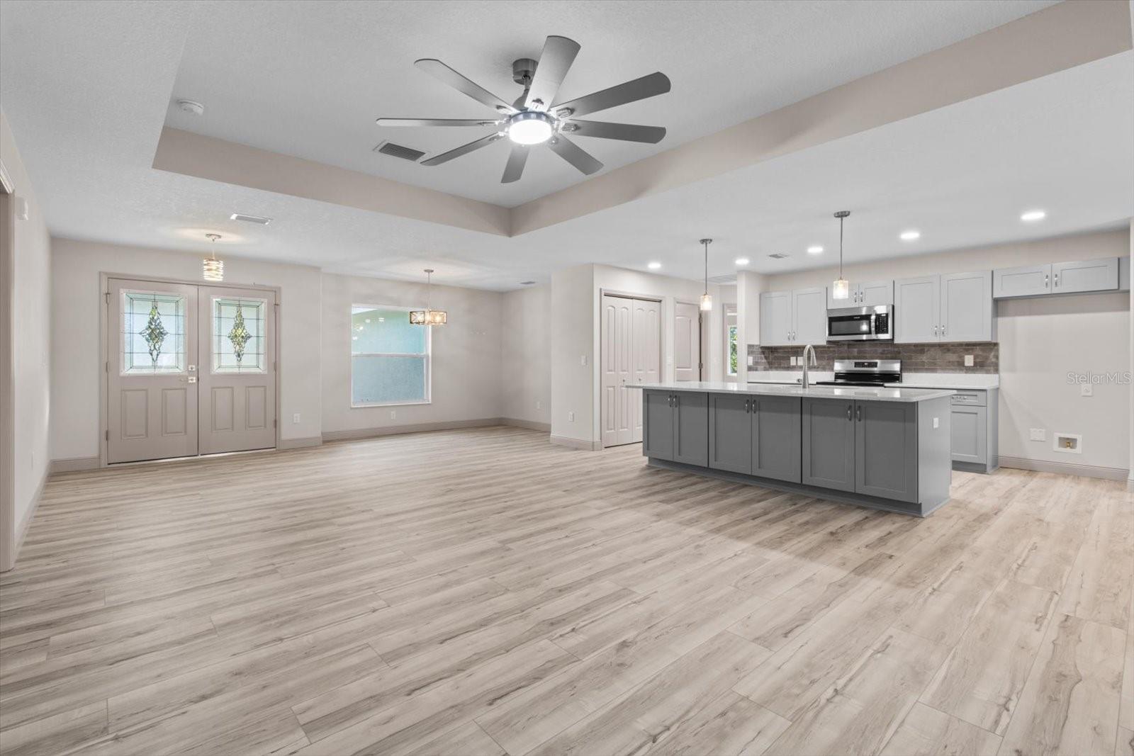 One or more photo(s) has been virtually staged. If you are looking for home in a quite neighborhood with the the golf course right across the street, this home is for you. Come check out this brand new beautifully landscaped home featuring 3 bedrooms, 2 full baths. The kitchen includes stainless-steel appliances, large quartz center island countertop and ceramic tile backsplash. The split-bedroom house plan includes luxury vinyl flooring throughout with carpet in the bedrooms and trey ceilings, . The primary bedroom has 2 large walk in closets and en-suite with a large tiled shower and double sinks. The home also has an interior laundry room and large enclosed lanai to sit and enjoy nature. There is a two car garage with epoxy flooring. There is no Homeowners Association (HOA), only an architectural committee.