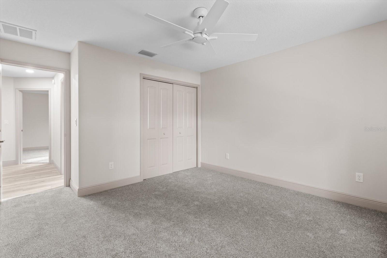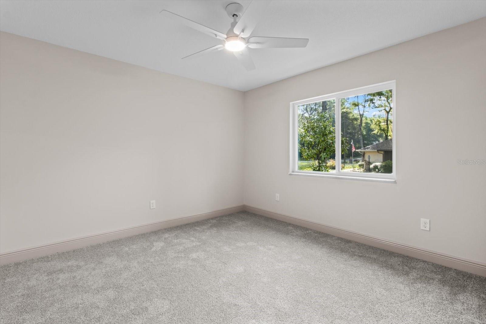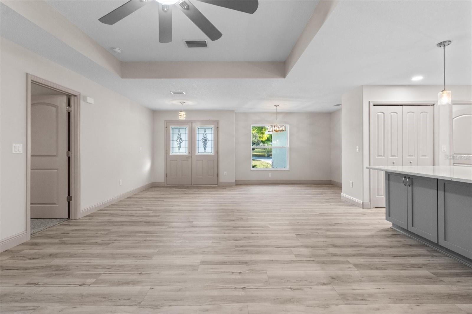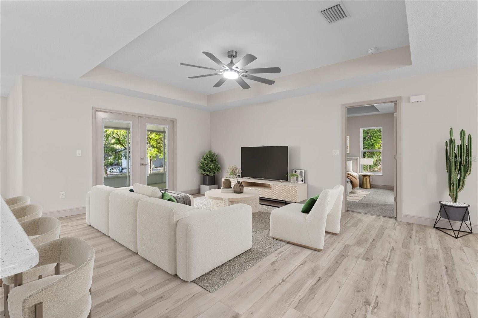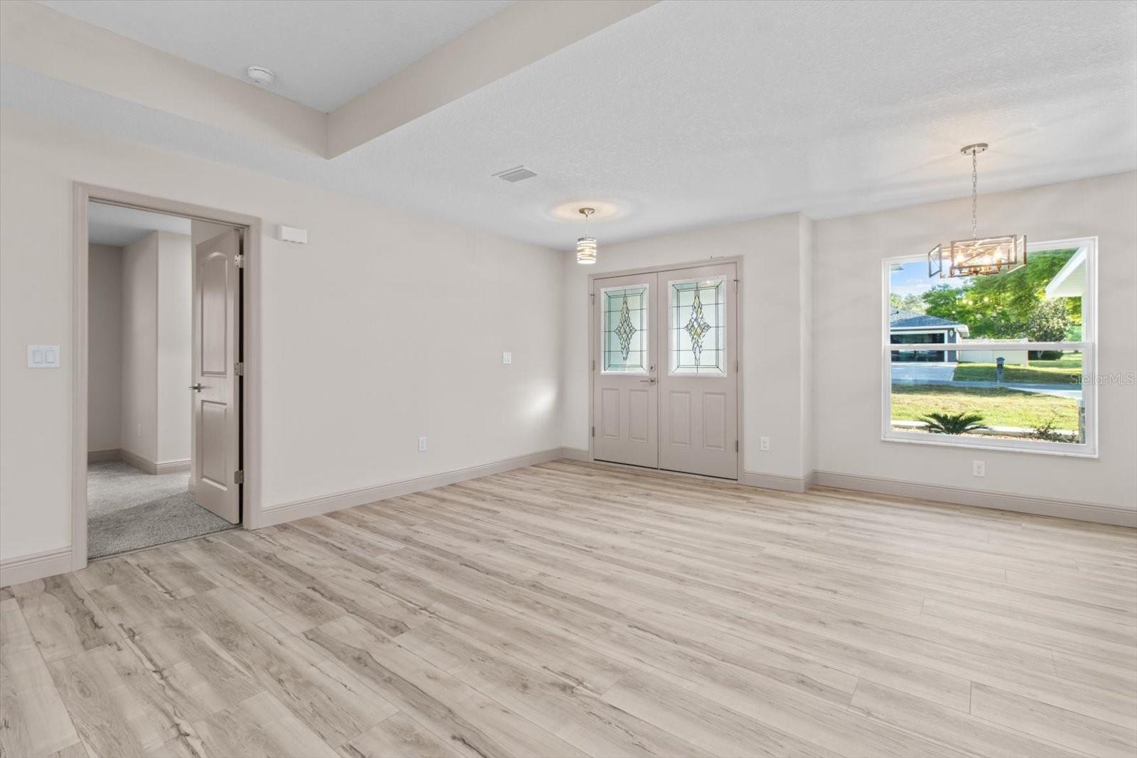 One or more photo(s) has been virtually staged. If you are looking for home in a quite neighborhood with the the golf course right across the street, this home is for you. Come check out this brand new beautifully landscaped home featuring 3 bedrooms, 2 full baths. The kitchen includes stainless-steel appliances, large quartz center island countertop and ceramic tile backsplash. The split-bedroom house plan includes luxury vinyl flooring throughout with carpet in the bedrooms and trey ceilings, . The primary bedroom has 2 large walk in closets and en-suite with a large tiled shower and double sinks. The home also has an interior laundry room and large enclosed lanai to sit and enjoy nature. There is a two car garage with epoxy flooring. There is no Homeowners Association (HOA), only an architectural committee.