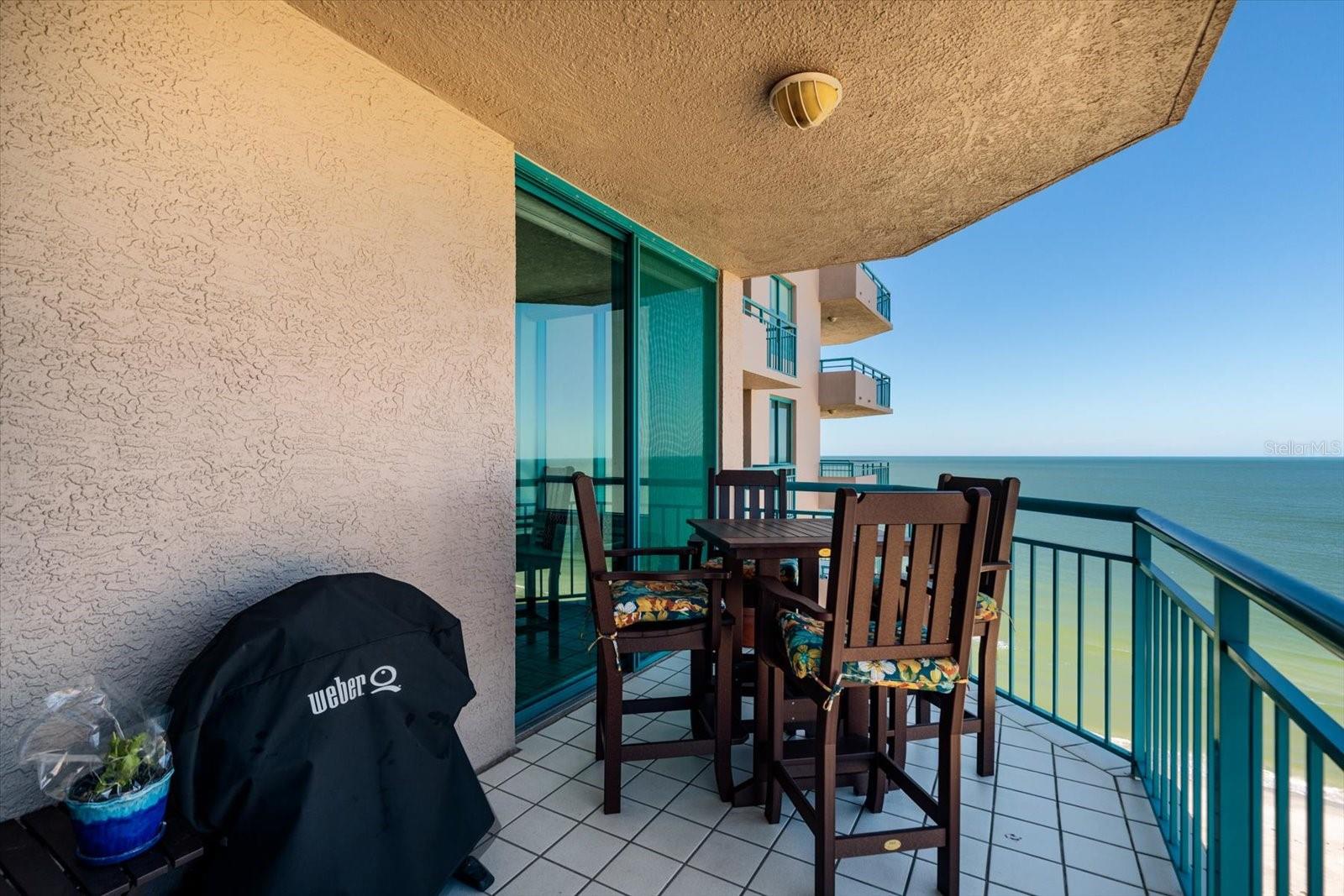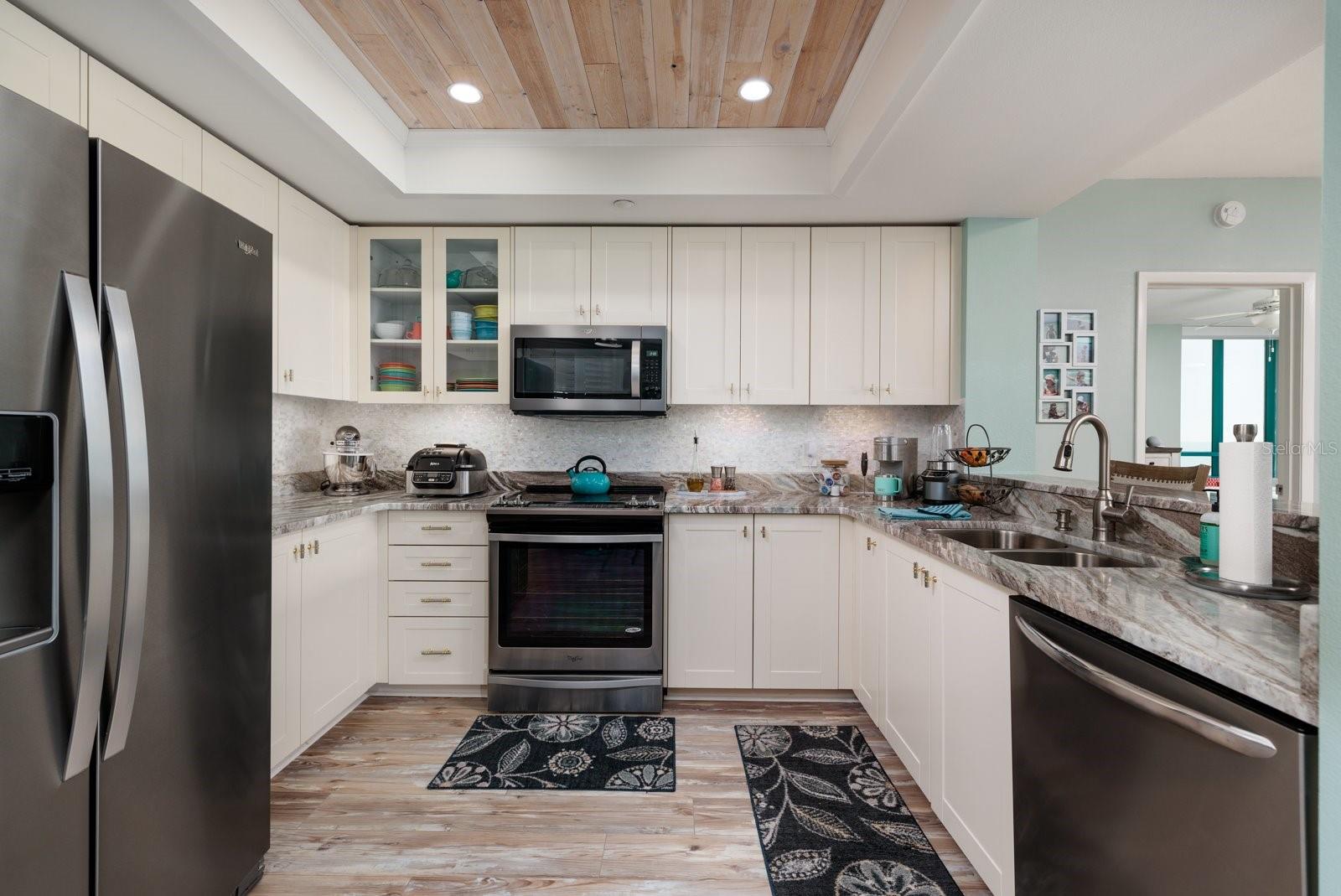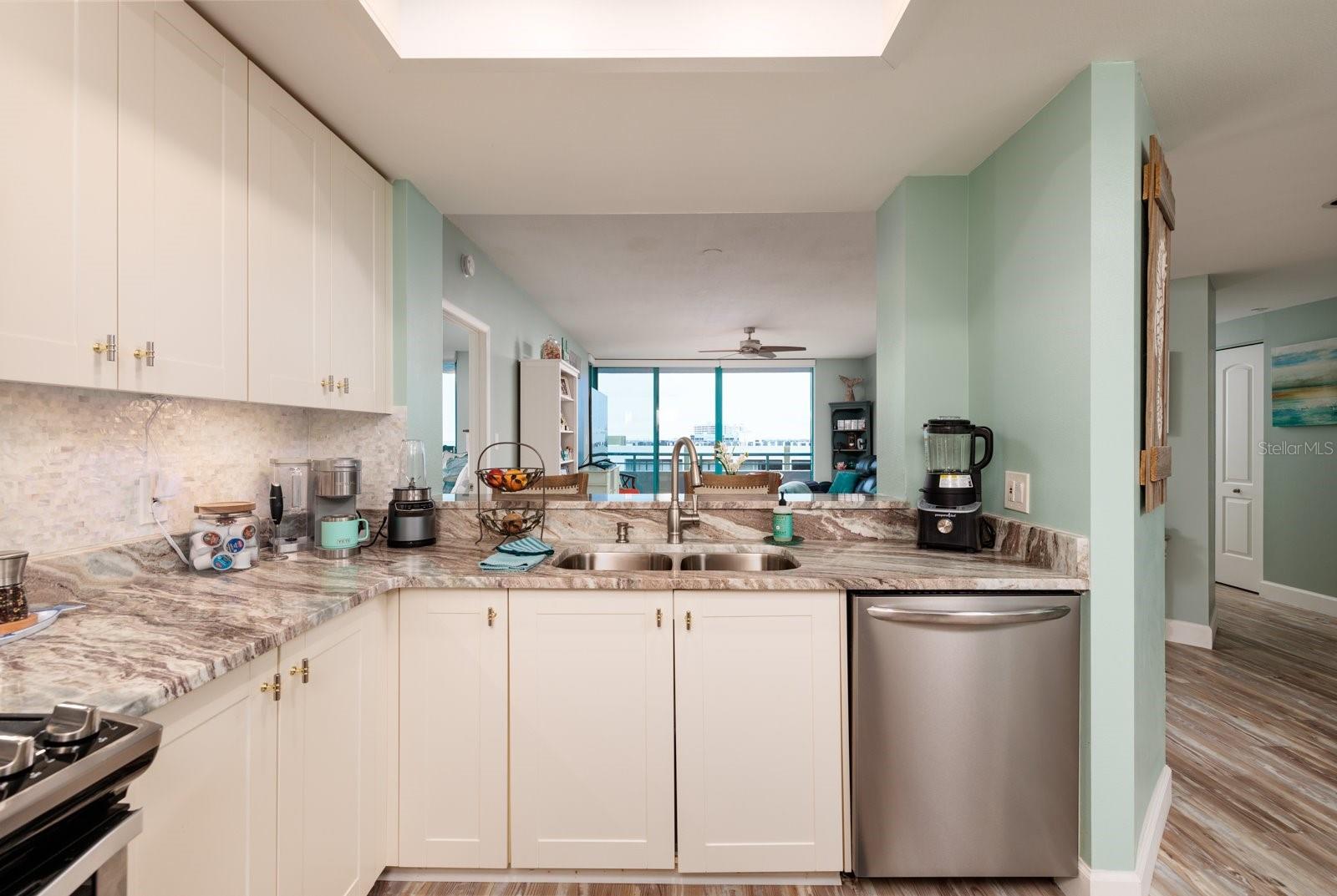 A ROOM WITH A VIEW! Water views from every room. Lovely 2 bedroom, 2 bath condo updated in Coastal style. White kitchen cabinets with Granite tops, Mother of Pearl backsplash, under cabinet lighting & newer Stainless Steel appliances. Plantation shutters in breakfast area. Gourmet kitchen with breakfast bar that opens to the living/dining area. New Luxury Vinyl Planking floors throughout for easy maintenance. Popcorn removed from all ceilings & updated lighting. Interior doors & closet doors replaced. Front loading washer & dryer in laundry closet. Sunshades in living room & guest bedroom with Hunter Douglas Luminettes in Primary Bedroom including black out shades. Primary bedroom has expansive views of the ocean from corner window & sliders. Sliders that open to the balcony featured in Primary bedroom & living room. Enjoy the beautiful views & sounds of the Ocean as you relax on your balcony. Lovely sunsets part of the year. Great views of the Intracoastal with beautiful nighttime lights. Primary bath has huge tile shower with frameless enclosure & bench for comfort. Large storage closet along with linen closet in primary bath. Double vanity with white cabinets & granite tops. Guest bath with updated white vanity, granite top & beautiful tile shower. . Guest bedroom has a beautiful view of the ocean as well. Both bedrooms have large walk-in closets. New A/C 4/2025. The Ultimar is a world class condo complex on Sand Key of famous Clearwater Beach. Miles of white sand. Lush tropical landscaped grounds are expertly maintained. 24 hr guard gated. True Resort Style Living with 3 geothermal heated pools w/spas (1 a lap pool), 3 tennis courts, pickle ball, basketball court, putting green, croquet lawn, shuffle board, grill area, fire pit area, fitness, steam & sauna, billiards room, media room, social room with catering kitchen. Walk to great restaurants & shops or catch the Beach Trolley right out in front of the building. A short drive to Tampa & the airport plus all of the sports venues of our championship teams. Parking Space #29 See virtual tour! Start Living the Florida Beach Lifestyle Today!! Call today for your private appointment to tour.
