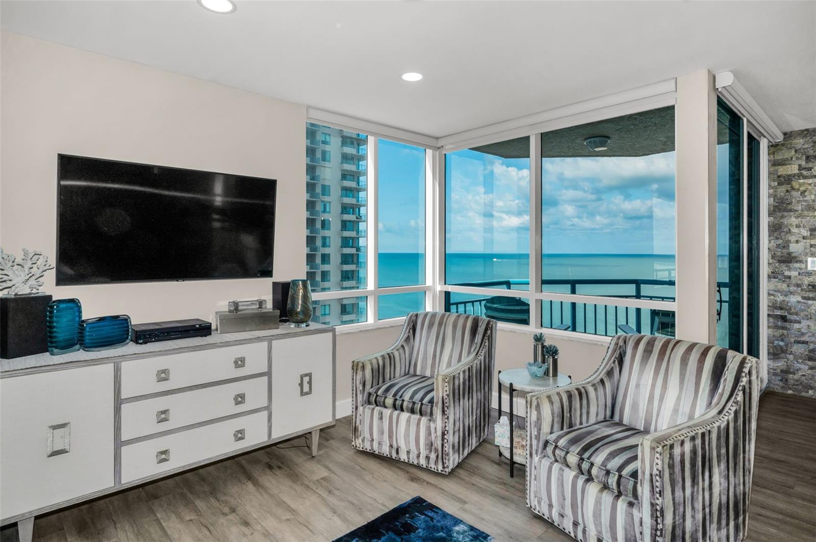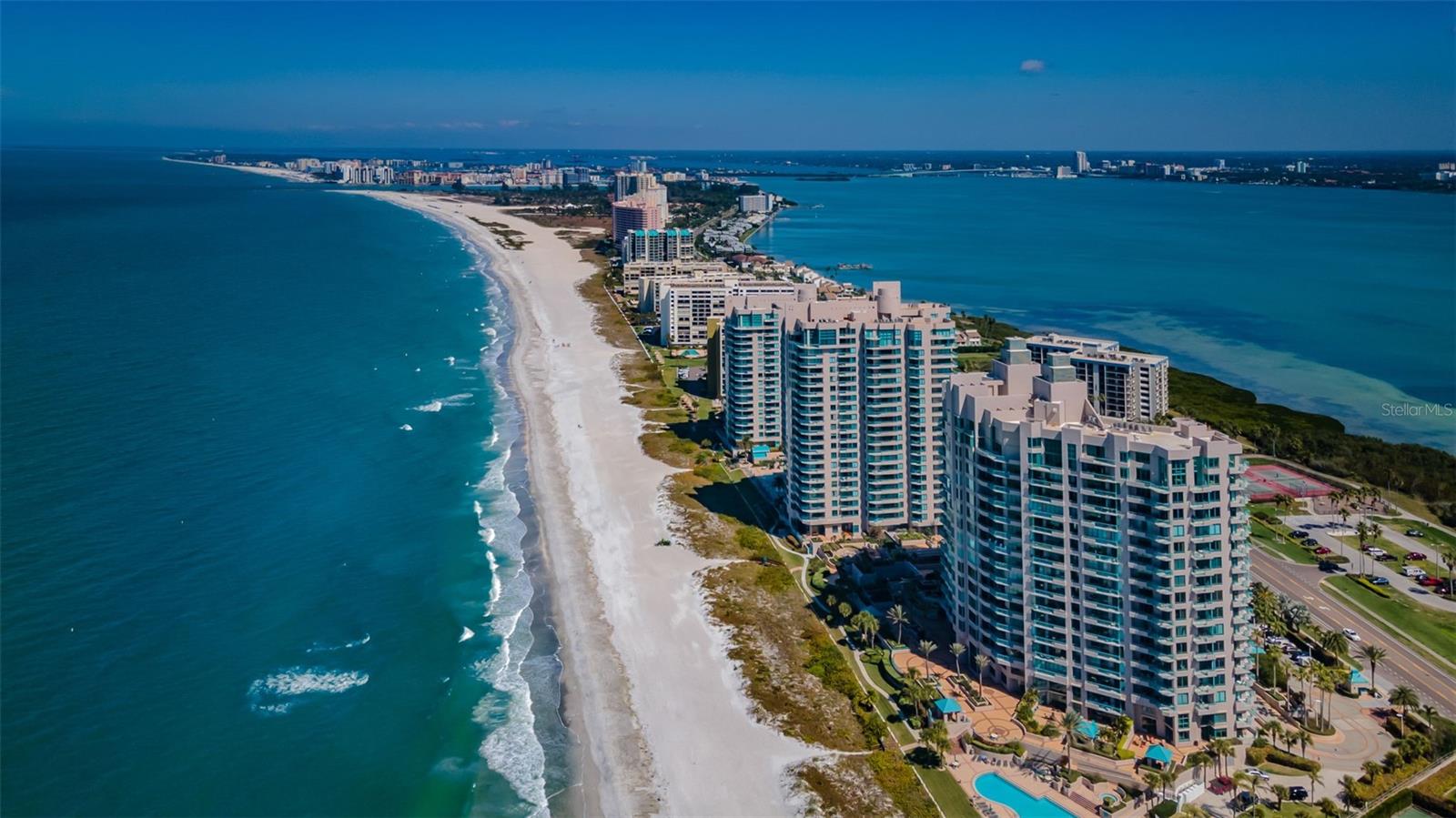Presenting The "Ultimate" Ultimar # 1407 Sky Residence, Inspiring Resort property on the Shimmering Shores of Pristine Sand Key. 2 Bedroom, 2 Bath, Comfort meets Contemporary Inspired Interior Style Featuring Direct Gulf Panoramic Aquamarine Seascape Views, Spectacular Nightly Sunsets, Dual Wrap Around Terraces. The warmth of Southern Exposure & Generous Terrace Ideal for the Avid Sun Worshipper! Residence has incorporated a Bold Array Color & Texture, POSH Furnishings included with the Right Offer. Creativity meets Functionality in a Symphony of Style with a Custom Interior Furnishings Package under a Carefully Curated Design Plan of Opulence. This Luxury Residence Conveys your Own Under Building Coveted Deeded Private Garage. Chic Contemporary Inspired Design with an Abundance of Natural Light Throughout! View, View, View from Every Room! Cucina Features the GE Cafe' Collection Stainless, Double Convention Oven, Dish Washer, Granite Surfaces, Custom Cabinetry, Accessorized Fixtures & More! Dining Area Scenic Surround Sweeping Ebb & Flow of Gulf Waters. Master Suite Scenic Surround to Aquamarine Panorama Features a Bath Retreat, Dual Sink Vanity, Walk In Closet Dress Area & Spacious Walk In Shower. Ownership has Incorporated Premium Luxury, Comforts & Commitment to Pride of Ownership with Attention to Detail. Additionally, Posh Furnishings, Motorized Shades, Plank Flooring Throughout, Contemporary Pendant & Recessed Lighting & More! LG Washer & Dryer, Proline Water Heater 2021, American Standard HVAC 2015. The Ultimar Resort Properties Boasts Striking Architecture Design & Contemporary Common Areas Setting in a Gated Gulf Front Community Offering the Finest of Amenities including Gulf Front Heated Pools, Tennis, Basketball, Putting Green, Croquet, Fitness & Social Center including Billiards & More! Ideally Located to Acclaimed Shopping, Dining Choices & Steps to Your Sand Key Beach Paradiso.