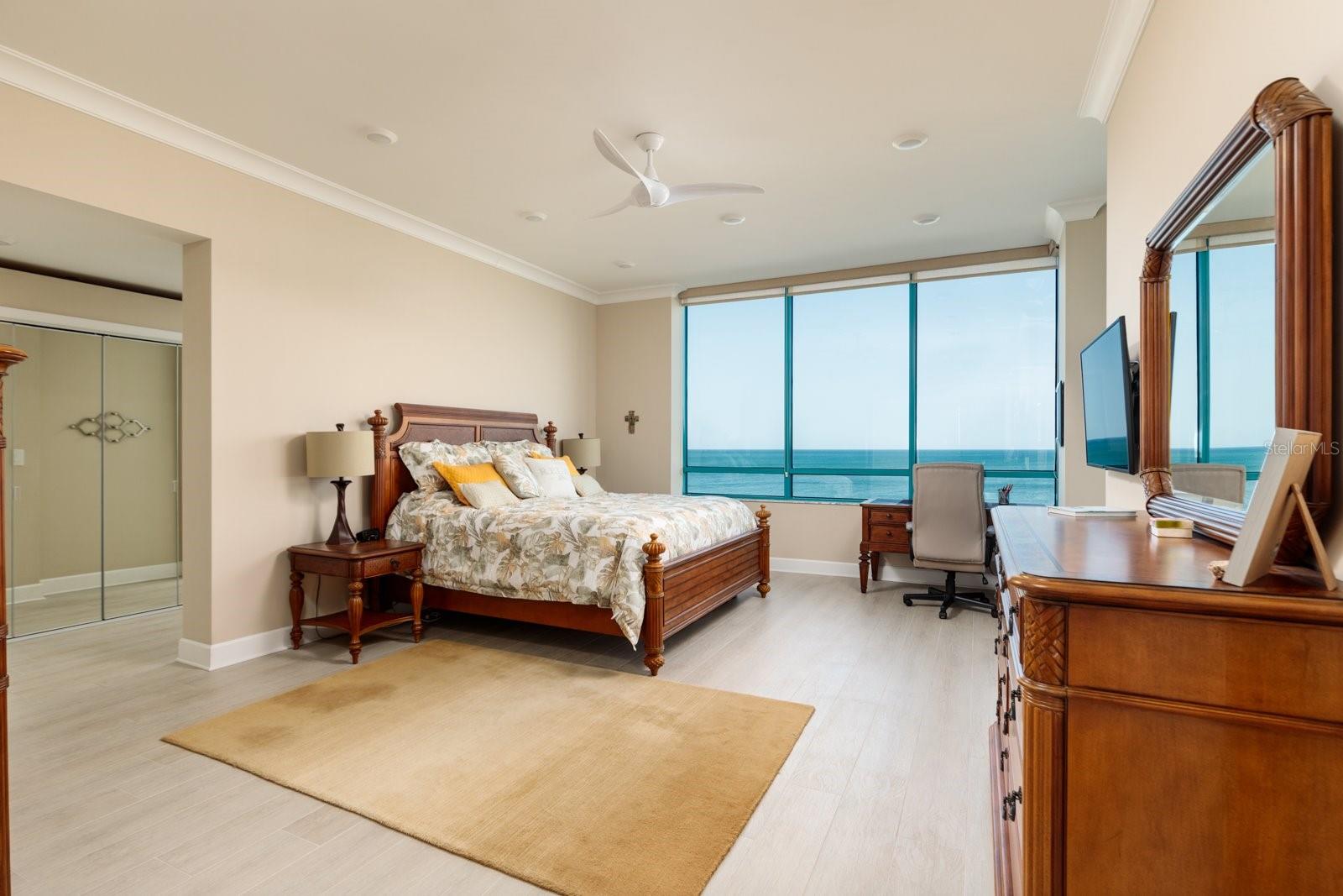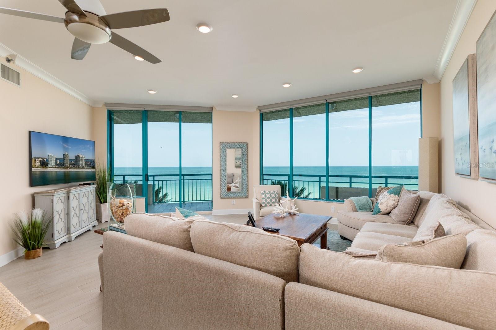 Exceptional Clearwater Beach condo features fantastic waterfront views of the Gulf, direct access to a vast white sand beach and ideal vantage points for scenic sunrises to sunsets. The spacious open floor plan is accented by wall-to-wall, floor-to-ceiling windows and sliding glass doors that provide unobstructed views from nearly every room. Spanning 2,563 square feet, this updated three-bedroom, three-bathroom home feels even more expansive due to 10-foot high ceilings throughout that optimize the abundant natural light and natural beauty defining this location. Crown molding, 6" baseboards & can lighting. Two covered balconies create ideal areas for al fresco dining, entertaining guests or relaxing while relishing the east to west elevated views from this fifth floor residence. Designed for convenience and comfort, the layout includes a formal living room and family room, dining area that easily accommodates seating for friends & family, a fully outfitted gourmet kitchen with new stainless steel appliances, granite counters, countertop dining, and adjoining walk-in pantry, a separate laundry room plus butler’s pantry. A split bedroom plan provides privacy for owners as well as guests. The primary bedroom ensuite includes direct access to the Gulfside balcony, a walk-in closet and marble bathroom countertops The Ultimar is a world class condo complex on Sand Key of famous Clearwater Beach. Miles of pure white sand. Lush tropical landscaped grounds are expertly maintained. 24 hr guard gated. True Resort Style complex has 3 geo thermal heated pools w/spas, 3 tennis courts, pickle ball, basketball ct, putting green, croquet lawn, grill area, firepit area, shuffleboard, corn hole, gym, steam & sauna, billiards rm, media rm, social rm with catering kitchen and baby grand piano. Walk to great restaurants & shops or catch the Beach Trolley right out in front of the building. A short drive to Tampa & the airport plus all of the sports venues of our championship teams. START LIVING THE FLORIDA BEACH LIFESTYLE TODAY!! Buyer to verify room dimensions. Sold furnished.