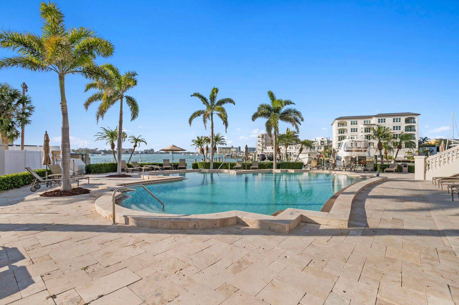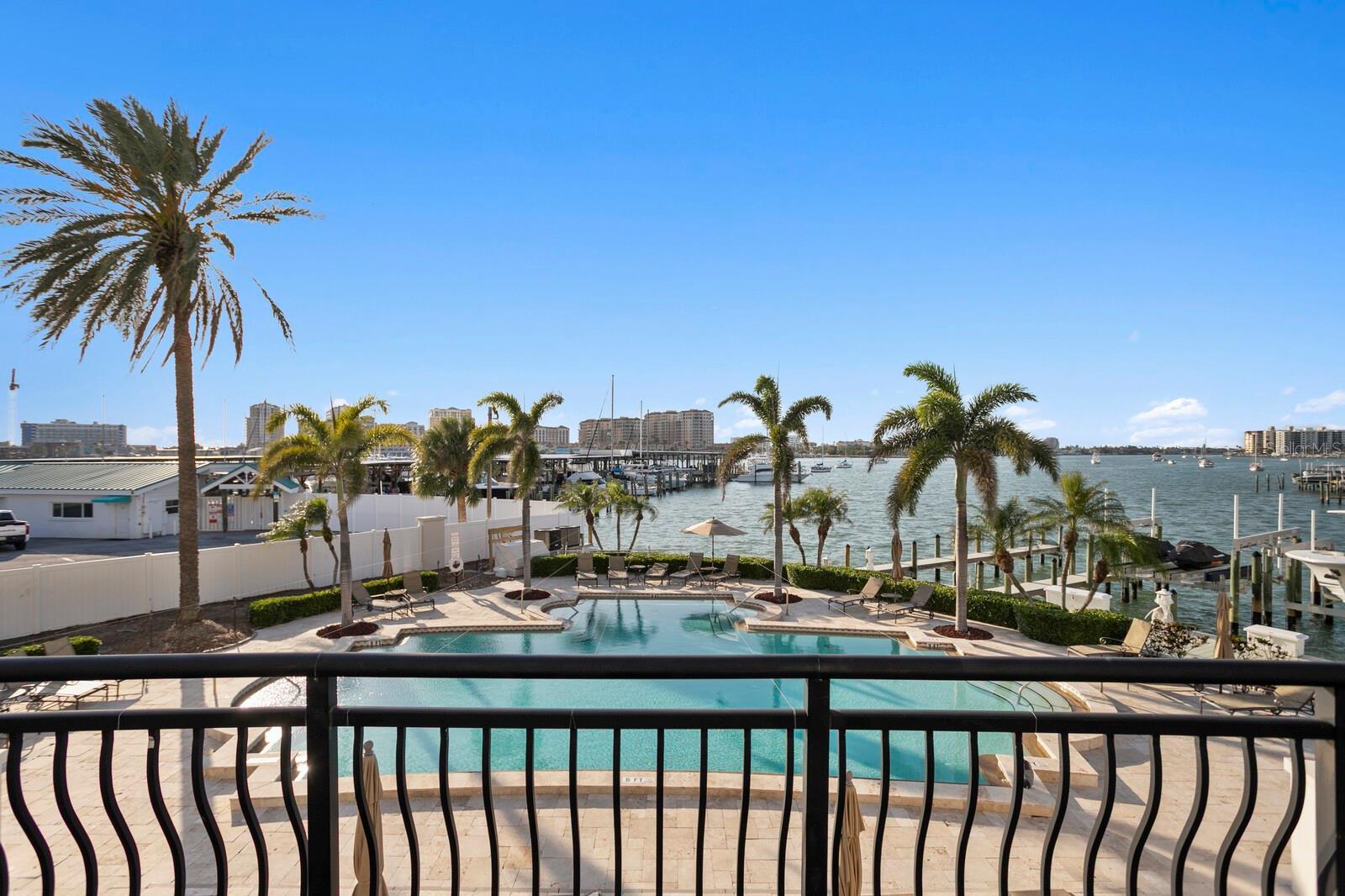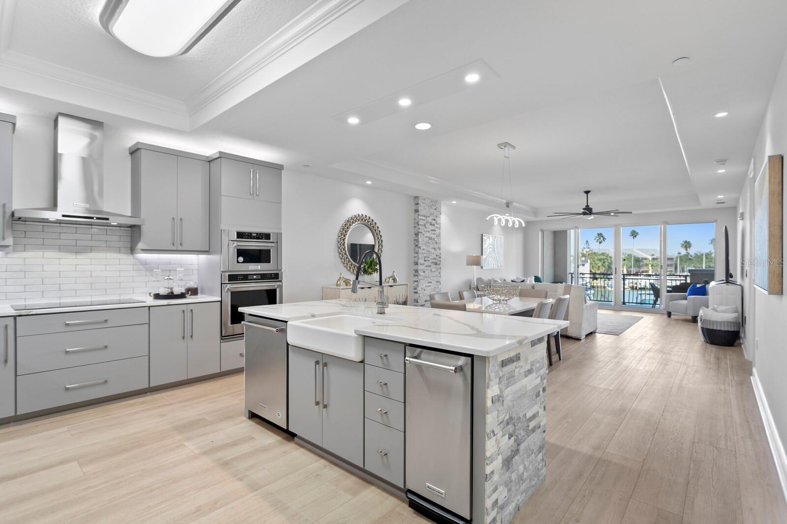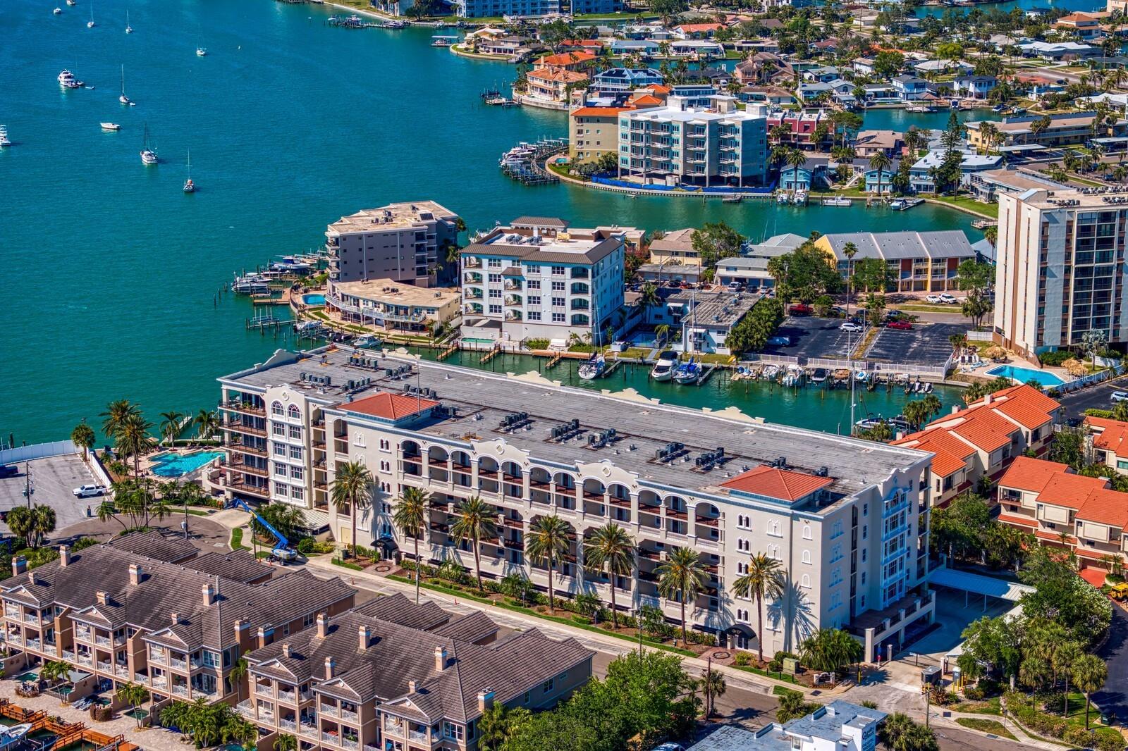 Stunning Waterfront Condo located on idyllic Island Estates just minutes to Clearwater Beach! Welcome to coastal living at its finest. This beautifully appointed 3 bedroom, 3.5 bathroom, open floor-plan condo offers the perfect blend of luxury, comfort, and convenience. No expense was spared and no detail was overlooked in the renovation of this gorgeous condo! The heart of the home is a sleek modern kitchen, complete with a farmhouse sink in the large island, stainless steel Kitchen Aid appliance package (including refrigerator, induction range w/hood, wall oven and microwave, garbage compactor and dishwasher), quartz countertops, and beautiful grey cabinets with lighting above and below. The open-concept dining room and family room combo features sliding glass doors with electric shades, that allows for a seamless flow onto a private, large balcony overlooking the Intracoastal Waterway - perfect for al fresco dining and watching boats glide by. Each of the 3 spacious bedrooms features a private en suite bathroom, ensuring comfort and privacy for family and guests alike. All bedroom closets are equipped with convenient organization systems. The spacious primary suite boasts 4 closets (2 walk-in) and a spa-like bath, complete with jacuzzi tub, his & hers sinks and large shower stall. Step out to the oversized balcony through hurricane-rated sliding doors to start your day with tranquil water views and end it with breathtaking sunsets. The additional 2.5 bathrooms have also been updated with designer features and finishes. Even the laundry room has quartz counters, stylish cabinets and a stainless sink. This home has been upgraded completely including the AC and water-heater. Your condo at The Residences at Windward Passage includes 2 under-building parking spaces. This unit is one of the only ones with power hook-up for your EV or a golf cart. The garage area has volume ceiling height and is gated at entry and exit for security. Each unit also includes an assigned storage locker in a locked room. The resort-style grounds feature lush landscaping, a heated saltwater Pool, BBQ grills and restrooms. The exclusive Clubhouse is equipped with multiple TVs, billiards, an oversized bar area, and serving kitchen for your private functions. The building is 07 construction meeting all hurricane and building codes and reflects this with some of the lowest maintenance fees in the area. The first floor of living space is 16 feet above sea level. Island Estates offers the convenience of a new Publix grocery store, restaurants, hair salon and more. Living here is like being on vacation every day!