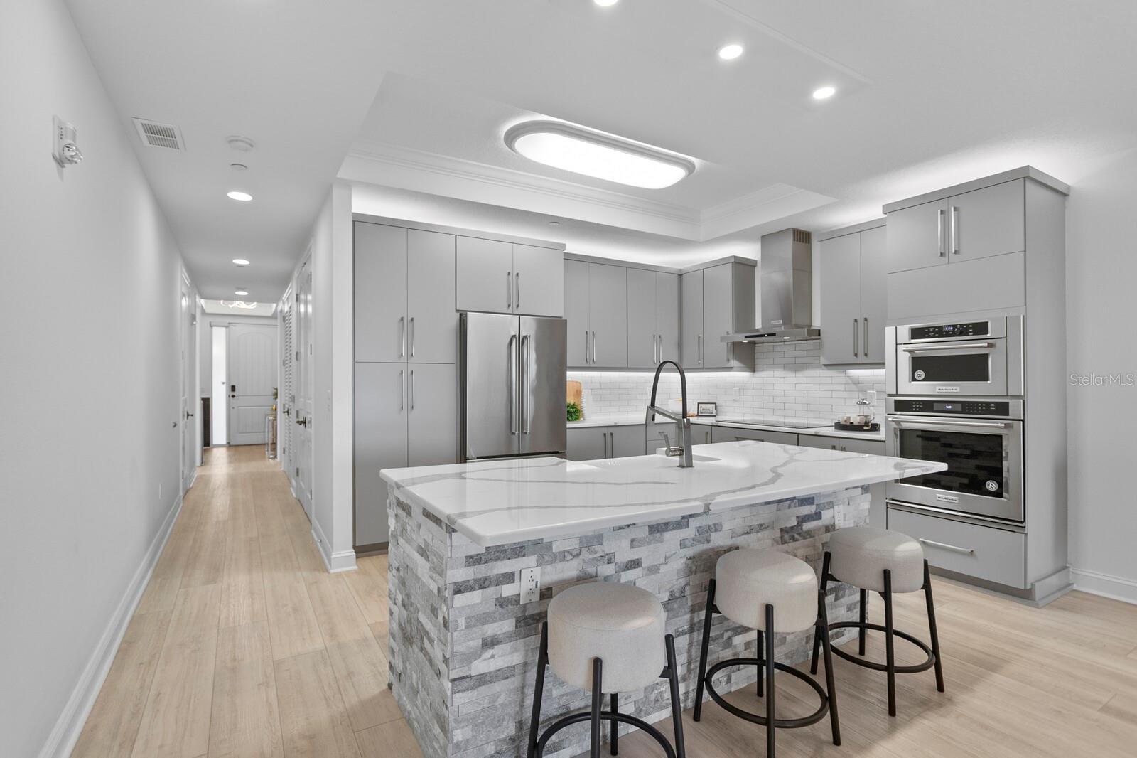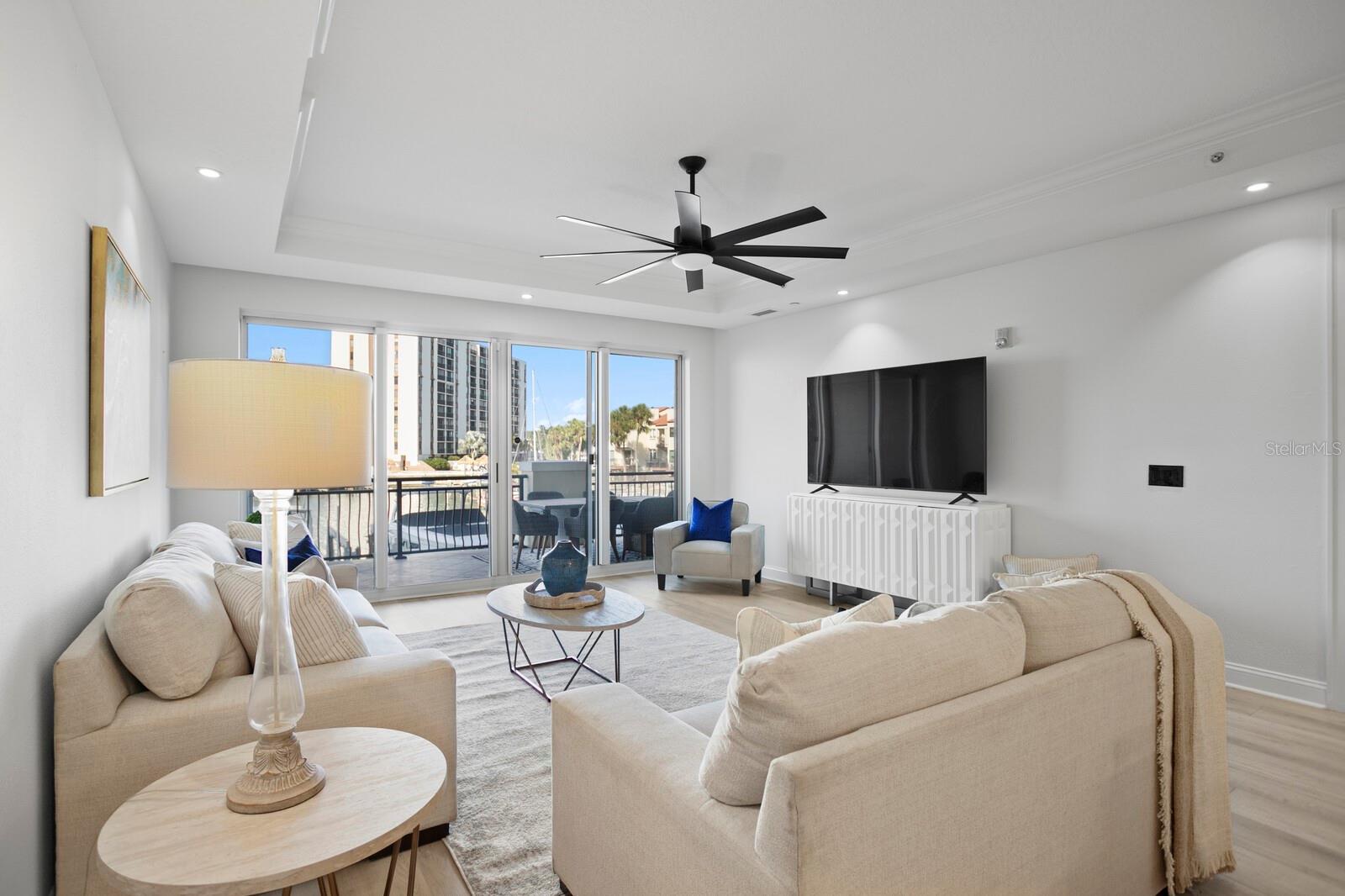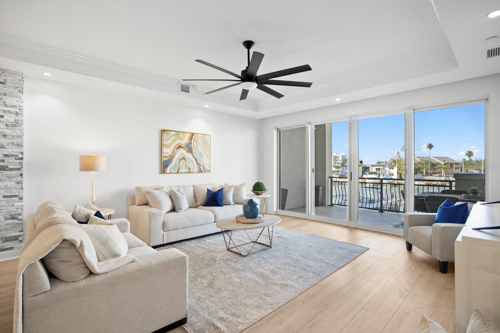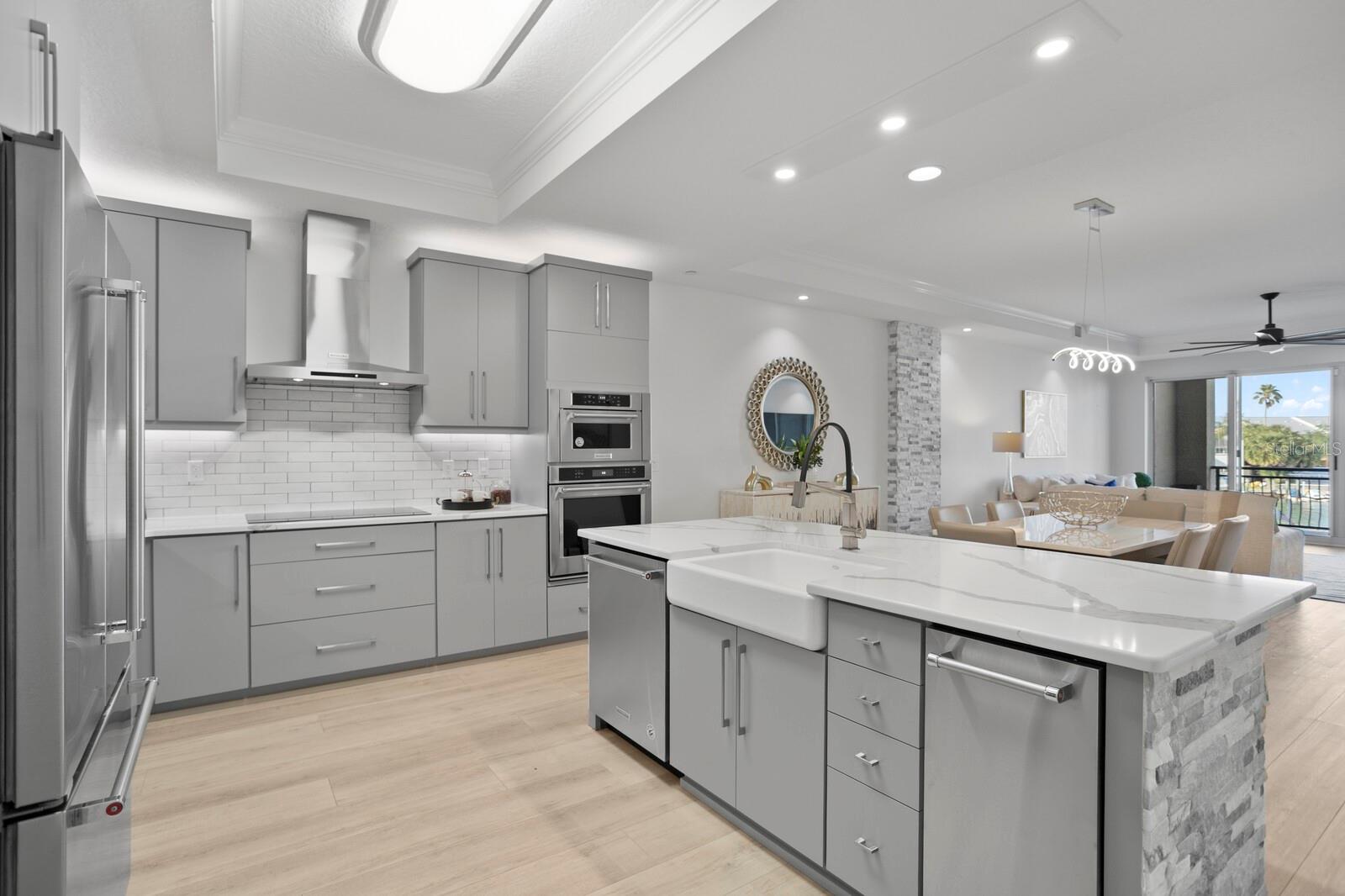 Stunning Waterfront Condo located on idyllic Island Estates just minutes to Clearwater Beach! Welcome to coastal living at its finest. This beautifully appointed 3 bedroom, 3.5 bathroom, open floor-plan condo offers the perfect blend of luxury, comfort, and convenience. No expense was spared and no detail was overlooked in the renovation of this gorgeous condo! The heart of the home is a sleek modern kitchen, complete with a farmhouse sink in the large island, stainless steel Kitchen Aid appliance package (including refrigerator, induction range w/hood, wall oven and microwave, garbage compactor and dishwasher), quartz countertops, and beautiful grey cabinets with lighting above and below. The open-concept dining room and family room combo features sliding glass doors with electric shades, that allows for a seamless flow onto a private, large balcony overlooking the Intracoastal Waterway - perfect for al fresco dining and watching boats glide by. Each of the 3 spacious bedrooms features a private en suite bathroom, ensuring comfort and privacy for family and guests alike. All bedroom closets are equipped with convenient organization systems. The spacious primary suite boasts 4 closets (2 walk-in) and a spa-like bath, complete with jacuzzi tub, his & hers sinks and large shower stall. Step out to the oversized balcony through hurricane-rated sliding doors to start your day with tranquil water views and end it with breathtaking sunsets. The additional 2.5 bathrooms have also been updated with designer features and finishes. Even the laundry room has quartz counters, stylish cabinets and a stainless sink. This home has been upgraded completely including the AC and water-heater. Your condo at The Residences at Windward Passage includes 2 under-building parking spaces. This unit is one of the only ones with power hook-up for your EV or a golf cart. The garage area has volume ceiling height and is gated at entry and exit for security. Each unit also includes an assigned storage locker in a locked room. The resort-style grounds feature lush landscaping, a heated saltwater Pool, BBQ grills and restrooms. The exclusive Clubhouse is equipped with multiple TVs, billiards, an oversized bar area, and serving kitchen for your private functions. The building is 07 construction meeting all hurricane and building codes and reflects this with some of the lowest maintenance fees in the area. The first floor of living space is 16 feet above sea level. Island Estates offers the convenience of a new Publix grocery store, restaurants, hair salon and more. Living here is like being on vacation every day!