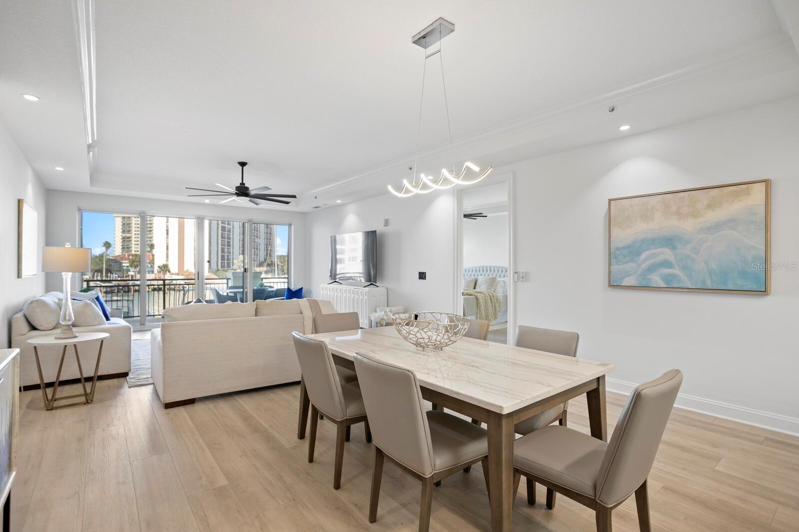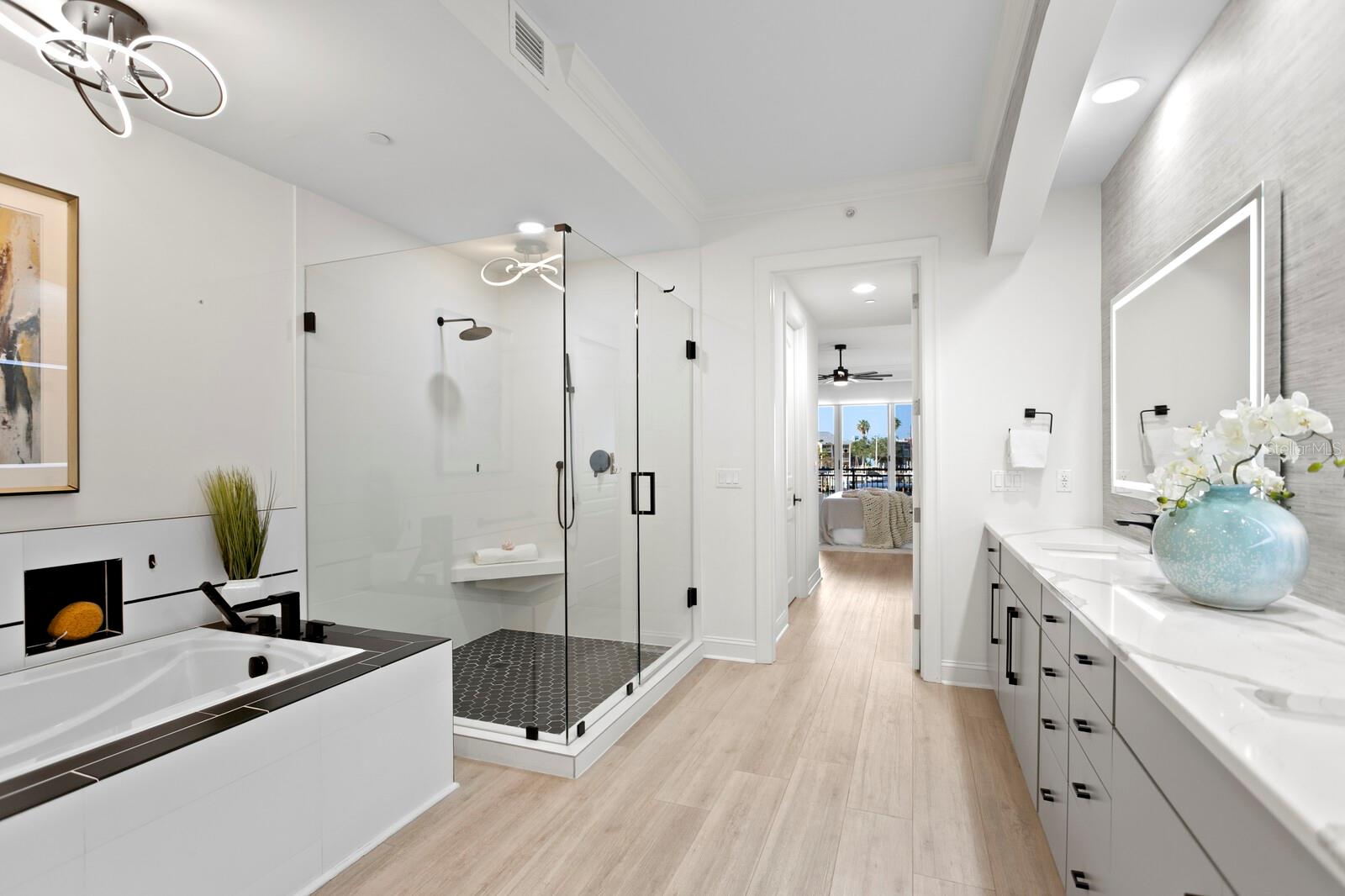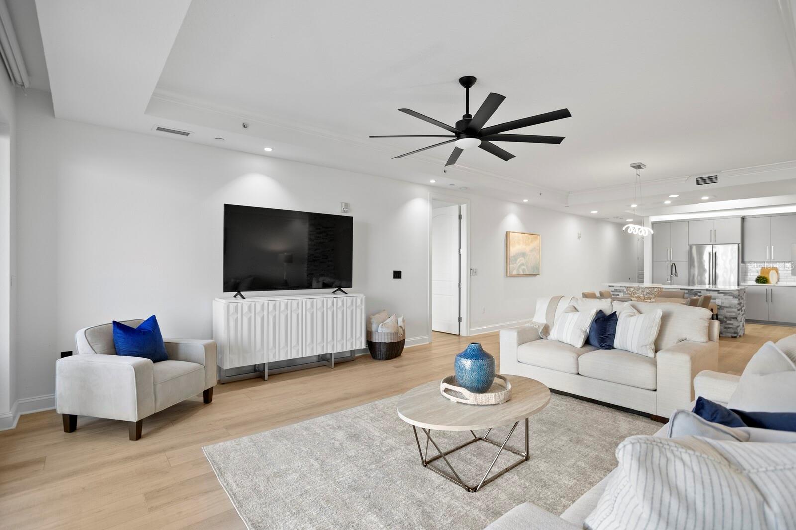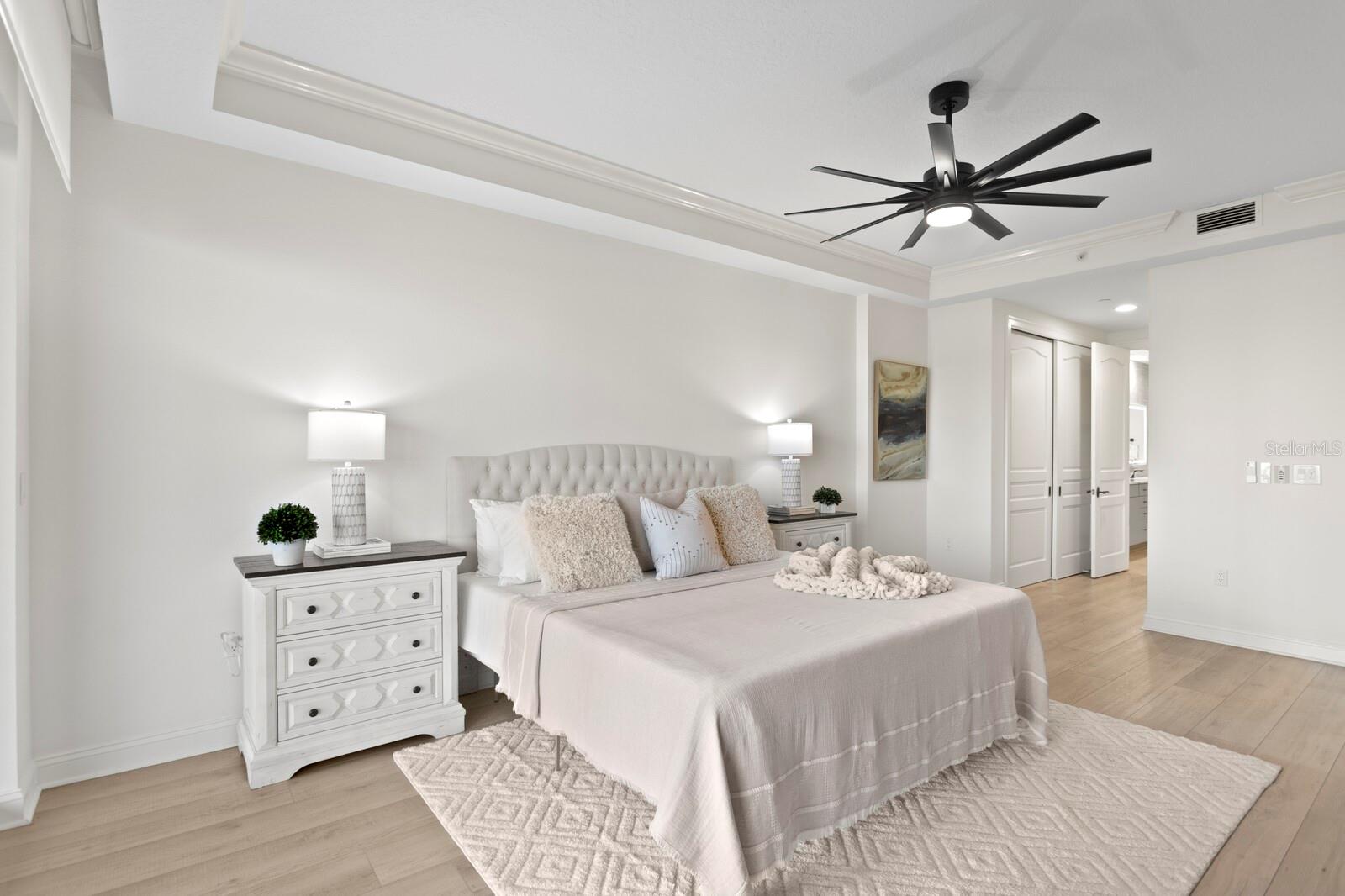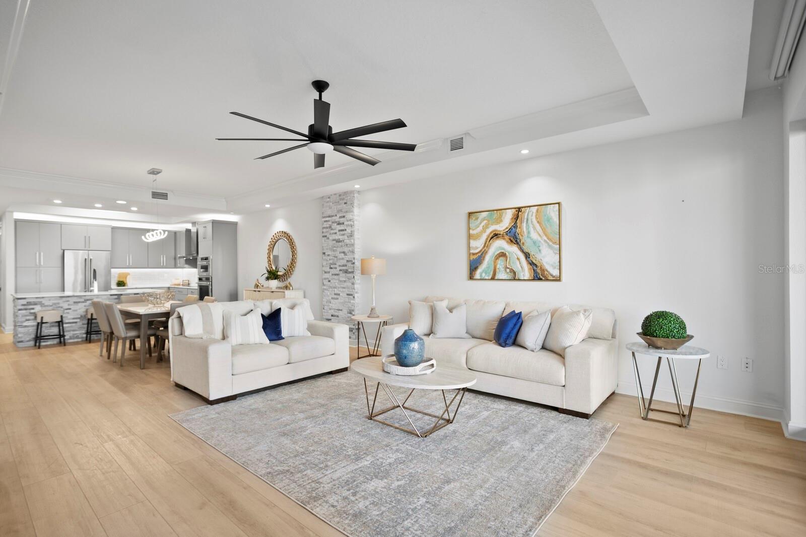 Stunning Waterfront Condo located on idyllic Island Estates just minutes to Clearwater Beach! Welcome to coastal living at its finest. This beautifully appointed 3 bedroom, 3.5 bathroom, open floor-plan condo offers the perfect blend of luxury, comfort, and convenience. No expense was spared and no detail was overlooked in the renovation of this gorgeous condo! The heart of the home is a sleek modern kitchen, complete with a farmhouse sink in the large island, stainless steel Kitchen Aid appliance package (including refrigerator, induction range w/hood, wall oven and microwave, garbage compactor and dishwasher), quartz countertops, and beautiful grey cabinets with lighting above and below. The open-concept dining room and family room combo features sliding glass doors with electric shades, that allows for a seamless flow onto a private, large balcony overlooking the Intracoastal Waterway - perfect for al fresco dining and watching boats glide by. Each of the 3 spacious bedrooms features a private en suite bathroom, ensuring comfort and privacy for family and guests alike. All bedroom closets are equipped with convenient organization systems. The spacious primary suite boasts 4 closets (2 walk-in) and a spa-like bath, complete with jacuzzi tub, his & hers sinks and large shower stall. Step out to the oversized balcony through hurricane-rated sliding doors to start your day with tranquil water views and end it with breathtaking sunsets. The additional 2.5 bathrooms have also been updated with designer features and finishes. Even the laundry room has quartz counters, stylish cabinets and a stainless sink. This home has been upgraded completely including the AC and water-heater. Your condo at The Residences at Windward Passage includes 2 under-building parking spaces. This unit is one of the only ones with power hook-up for your EV or a golf cart. The garage area has volume ceiling height and is gated at entry and exit for security. Each unit also includes an assigned storage locker in a locked room. The resort-style grounds feature lush landscaping, a heated saltwater Pool, BBQ grills and restrooms. The exclusive Clubhouse is equipped with multiple TVs, billiards, an oversized bar area, and serving kitchen for your private functions. The building is 07 construction meeting all hurricane and building codes and reflects this with some of the lowest maintenance fees in the area. The first floor of living space is 16 feet above sea level. Island Estates offers the convenience of a new Publix grocery store, restaurants, hair salon and more. Living here is like being on vacation every day!