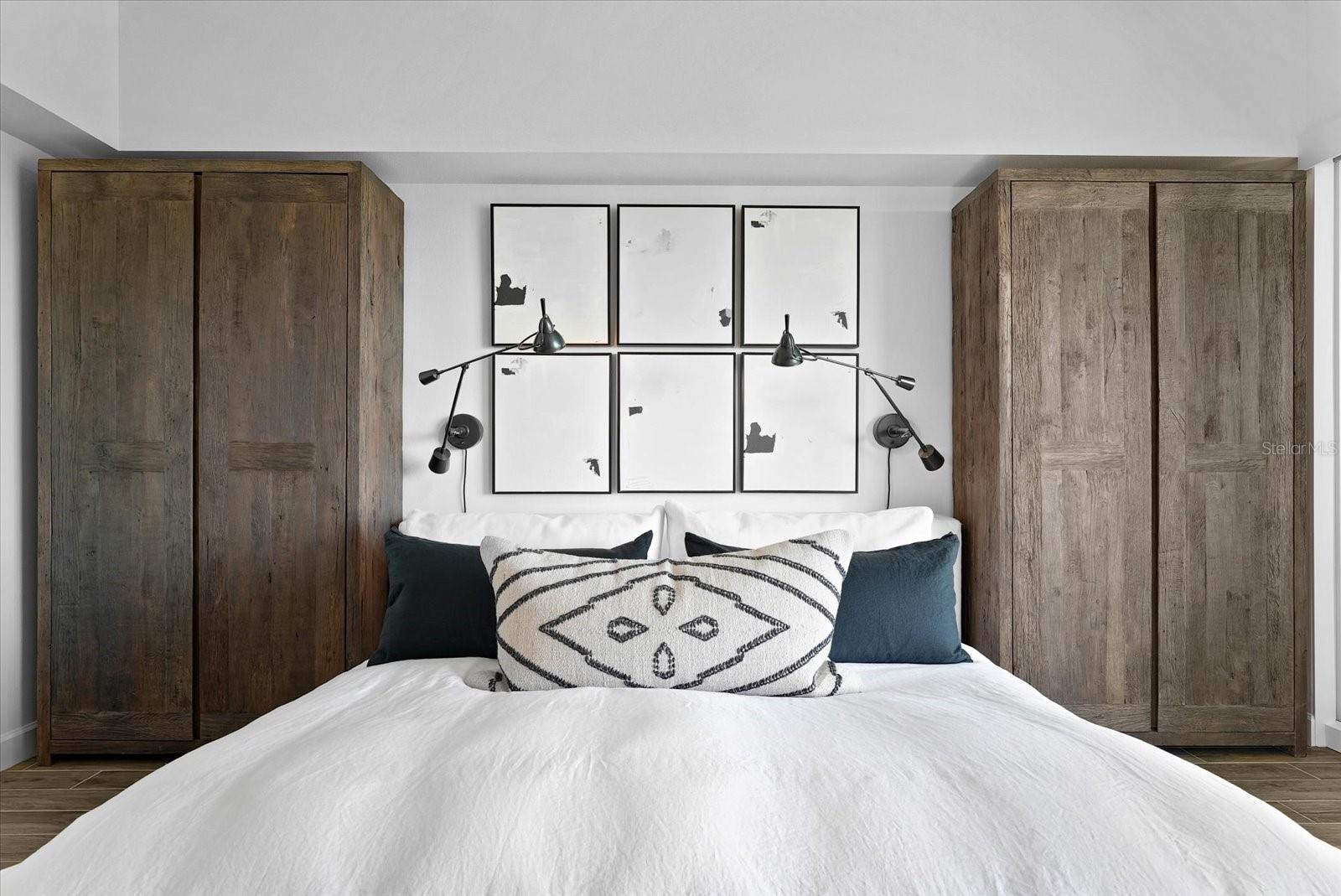 Welcome to refined waterfront living in a boutique 27-residence community. Completed in 2022, this 3-bedroom, 2-bath residence offers 1,850 sq ft of elevated coastal design, complemented by private amenities including a dedicated boat slip, two finished cabanas, and a climate-controlled storage suite. Inside, every detail has been thoughtfully curated. Ten-foot ceilings, wood-look tile throughout, solid-core doors, RH-appointed cabinetry and finishes, custom shiplap and millwork, upgraded lighting, and modern fans create a polished and cohesive aesthetic. Automated Lutron lighting, motorized shades with blackout options in the bedrooms, Ring security, keyless entry, upgraded thermostats, enhanced central air filtration, and a whole-home water softener enhance comfort and ease. The kitchen features a Wolf range, Viking microwave, Sub-Zero refrigerator, Cove dishwasher, and an oversized island. A custom bar with a Sub-Zero beverage refrigerator and Scotsman nugget ice maker adds an effortless entertaining element. The primary suite offers a frameless glass shower, while the guest bath includes a porcelain tub with glass enclosure. Designer wallpaper, custom closets in guest rooms, and custom cabinetry throughout add style and continuity to the home. A tiled balcony captures serene sunrise views and includes a weather-resistant TV cabinet, surround sound, hose hookup, balcony fans with dimmable lighting, and app-controlled hurricane shutters. Two private cabanas add rare versatility: Cabana 1 features travertine flooring, stucco finishes, and keyless entry; Cabana 15 includes custom built-ins, TV setup, hose hookup, and storage. Community amenities include a waterfront pool, hot tub, grill area, and tranquil water views. A secure lobby, covered parking, and a quiet yet convenient location near beaches, dining, and boating complete the experience. This residence combines thoughtful upgrades with elevated coastal design, offering a seamless lock-and-leave lifestyle on the water.