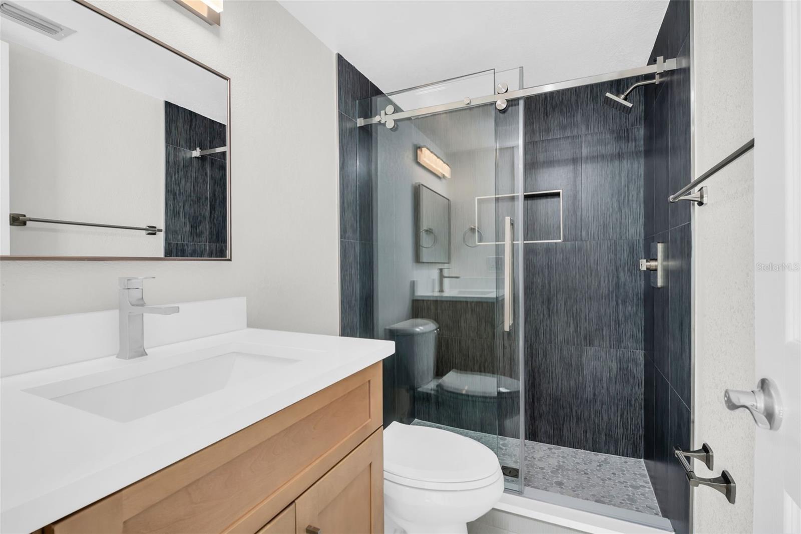 One or more photo(s) was virtually staged. Ground-Floor Waterfront Condo with direct access to residents only white sandy beach in Clearwater Point’s Admiral House (55+) has been meticulously remodeled and is move-in ready. Beautiful Southern views of the Intracoastal Waterway, Sand Key Bridge, and the Gulf of Mexico through floor-to-ceiling windows & sliding doors. Walk out onto the oceanfront patio that connects the main living areas directly to the shoreline. The interior offers 2 bedrooms, 2 full bathrooms, an open kitchen/dining/great room, and a separate Florida room, all oriented toward the water. The new kitchen includes new cabinetry, island with seating and storage, quartz countertops, tiled backsplash, and stainless-steel appliances. Both bathrooms are fully updated with tiled walk-in showers and new vanities. All flooring, doors, lighting, and fixtures have been replaced, and a dedicated laundry room with a new stackable Samsung washer and dryer is located inside the unit. The primary suite features open-water views and direct access to the patio and beach. High-impact hurricane-rated windows and sliders provide peace of mind. Assigned parking space #20 is included with the condo. Residents have use of a large beachfront patio area, 3 heated pools and a spa, waterfront grill stations with dining tables & firepit, and the Clearwater Point beach. The community also offers tennis courts, pickleball, shuffleboard, and security in an active 55+ setting. Located in South Clearwater Beach, the property is close to local restaurants, shops, and entertainment, and is steps from Clearwater Yacht Club and Sand Key Bridge for convenient access on and off the beach. Admiral House has completed both the Milestone Inspection and the Reserve Study, and the association is currently fully funded with no special assessments planned, offering added financial stability for current and future owners. Recent HOA funded improvements include a new tile roof in 2020, flat roof in 2023, and redone car ports.