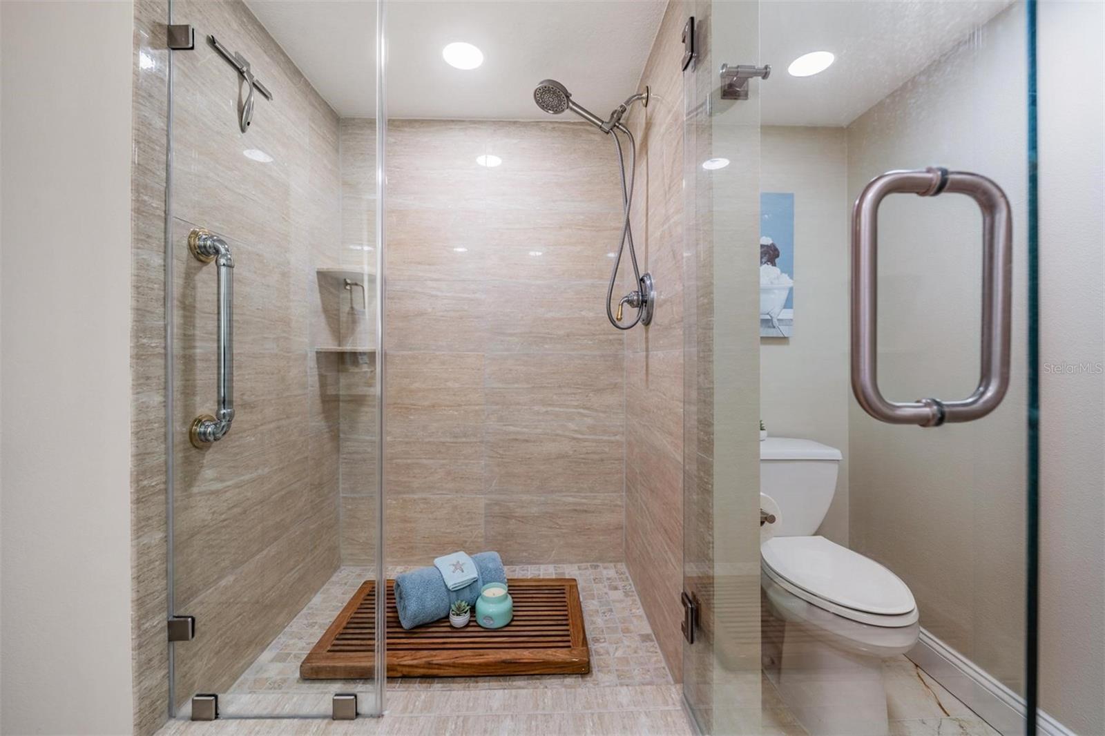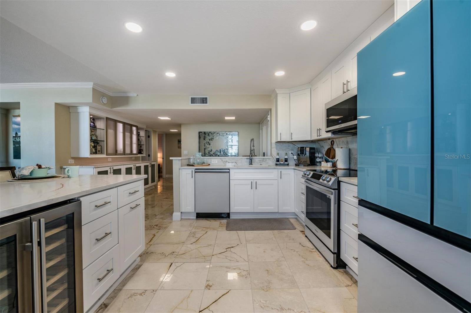 Welcome to a rare first-floor, corner Gulf-front residence offering direct ocean exposure and effortless coastal living in the highly sought-after Sand Key community. This spacious 2-bedroom, 2-bath condominium features an exceptional 20x40 private ocean-facing terrace—one of the largest in the building—creating a seamless indoor-outdoor lifestyle with panoramic Gulf views and breathtaking sunset vistas. The fully renovated, turnkey interior showcases cohesive, high-end finishes throughout, including marble tile flooring across the entire residence. The brand-new open-concept kitchen features custom white cabinetry, quartz countertops, modern hardware, stainless steel appliances, and generous island seating, ideal for both everyday living and entertaining. A custom built-in entertainment wall with integrated electric fireplace, display shelving, accent lighting, and glass shelving adds both function and architectural interest. The oversized primary suite is a private retreat featuring a custom walk-in closet with built-in drawers, shelving, and abundant hanging space. The second bedroom also includes a tailored closet system, ensuring organization and functionality. Both spa-inspired bathrooms have been beautifully updated with new cabinetry, refined countertops, and elegant finishes. Additional conveniences include an in-unit washer and dryer, under-building parking, and a private storage unit. Elevated first-floor positioning provides added peace of mind, while the gated building offers electronically guarded entry and secure keypad access. Residents enjoy a community pool with a charming tiki-style seating area—ideal for relaxing or hosting guests. The building has recently been painted and refreshed, enhancing both curb appeal and long-term value. All assessments have been paid in full. Situated in the quiet, walkable Sand Key neighborhood—renowned for its privacy and residential feel— this residence offers private beach access, scenic walking paths, and a tranquil coastal setting. Experience the perfect blend of luxury, security, and beachfront serenity.