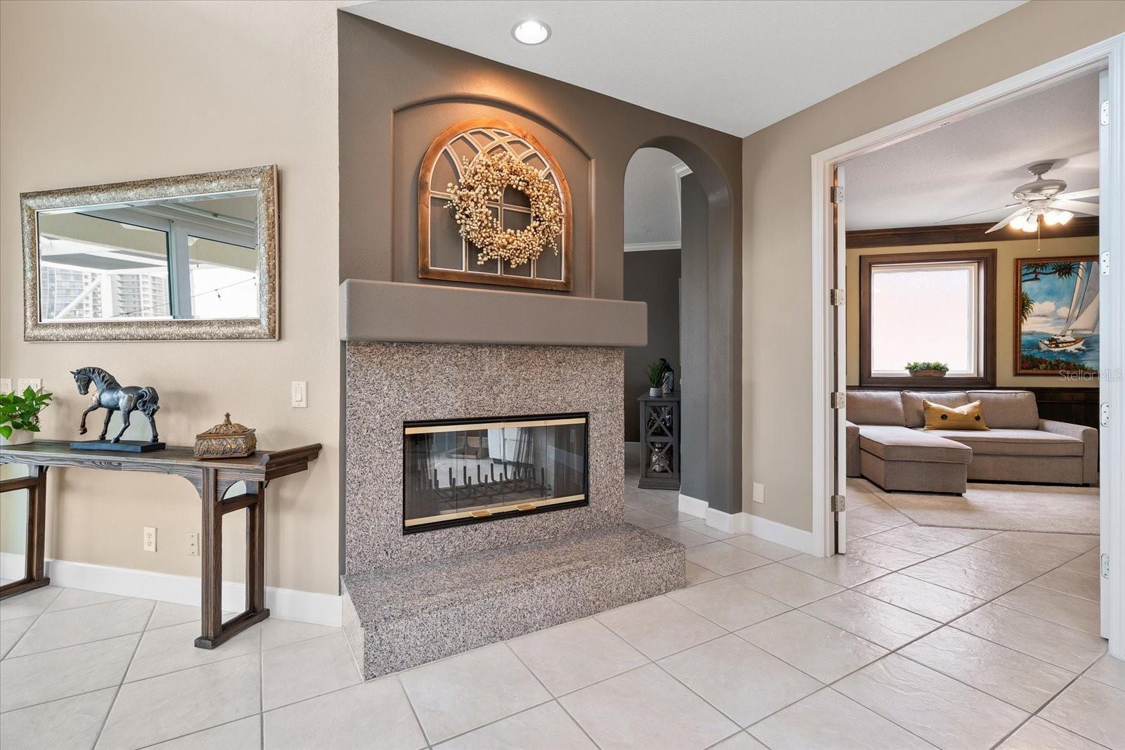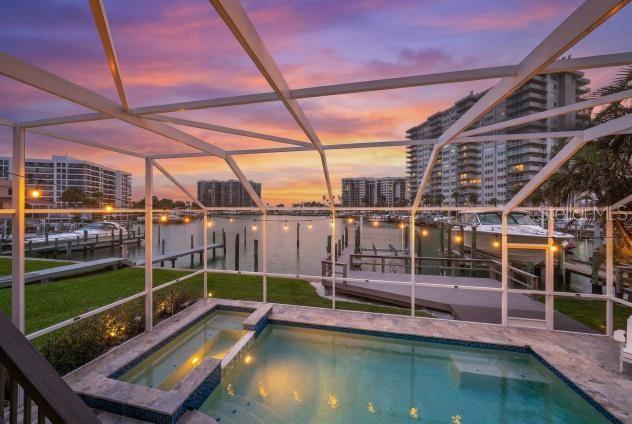 Extremely Rare Gulf View Waterfront Estate — Own One of Sand Key’s Most Exclusive Locations. Experience breathtaking western sunset views over the Gulf from this exceptional waterfront residence, located in the only single-family gated waterfront community of its kind on Sand Key. This impeccably updated Florida-style estate offers 3,002 square feet of elegant living space, featuring three bedrooms, three bathrooms, a spacious entertainment room, and a versatile den or office. Designed for both comfort and sophistication, the home showcases soaring ceilings, abundant natural light, and panoramic open water views that create a bright and inviting atmosphere throughout. The grand living and dining areas are centered around a stunning double-sided fireplace, adding warmth and architectural charm. The fully renovated designer kitchen, completed in 2020, is a true showpiece with custom solid wood white shaker cabinetry, beach-inspired granite countertops, stainless steel appliances, a double oven, and a natural gas cooktop. A generous breakfast bar allows for effortless entertaining while enjoying the surrounding water views. The oversized primary suite serves as a private retreat, offering spectacular Gulf views and a rare second balcony where you can unwind with evening sunsets and watch dolphins pass by. The home has been freshly repainted inside and out, reflecting meticulous care and no expense spared. Outdoor living is equally impressive, featuring a newly resurfaced Pebble Tec heated saltwater pool and spa, complemented by a spacious screened-in deck finished with luxurious travertine tile. An extended composite sun deck provides a seamless connection to the waterfront, creating the perfect setting for relaxation and entertaining. For boating enthusiasts, this property is truly exceptional. The deep-water dock is equipped with power and water and includes a 30,000-pound boat lift installed in 2020, along with an additional wet slip for a yacht, sailboat, or personal watercraft. With no fixed bridges to the Gulf of Mexico and a protected harbor intracoastal location, the home offers both convenience and peace of mind. Additional upgrades include a new roof in 2021, high-impact hurricane windows and doors installed in 2019, updated interior and exterior paint in 2024 and 2026, wood flooring throughout the second level and stairways, and a whole-house water softener system that even extends to the dock. The home is built with block construction on pilings at a high elevation, helping to keep flood insurance costs low, with an assumable policy currently at just $977 annually. Located within the prestigious Moorings of Sand Key, a 24-hour guard-gated community, this residence offers an exclusive and secure lifestyle ideal for those who appreciate luxury waterfront living. The Moorings properties and this home remained high and dry during the 2024 hurricane season — proving its safety and superior location. Just a short walk to beach access and conveniently positioned near the guard house, this home perfectly balances privacy, elegance, and the ultimate Florida boating lifestyle.