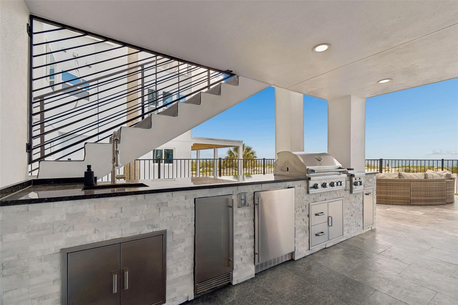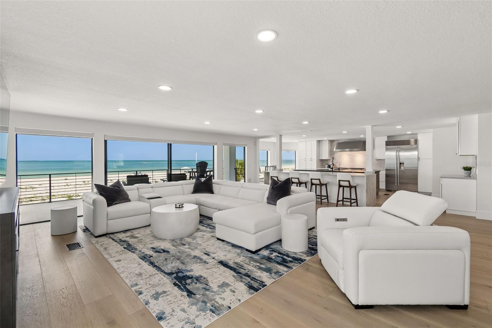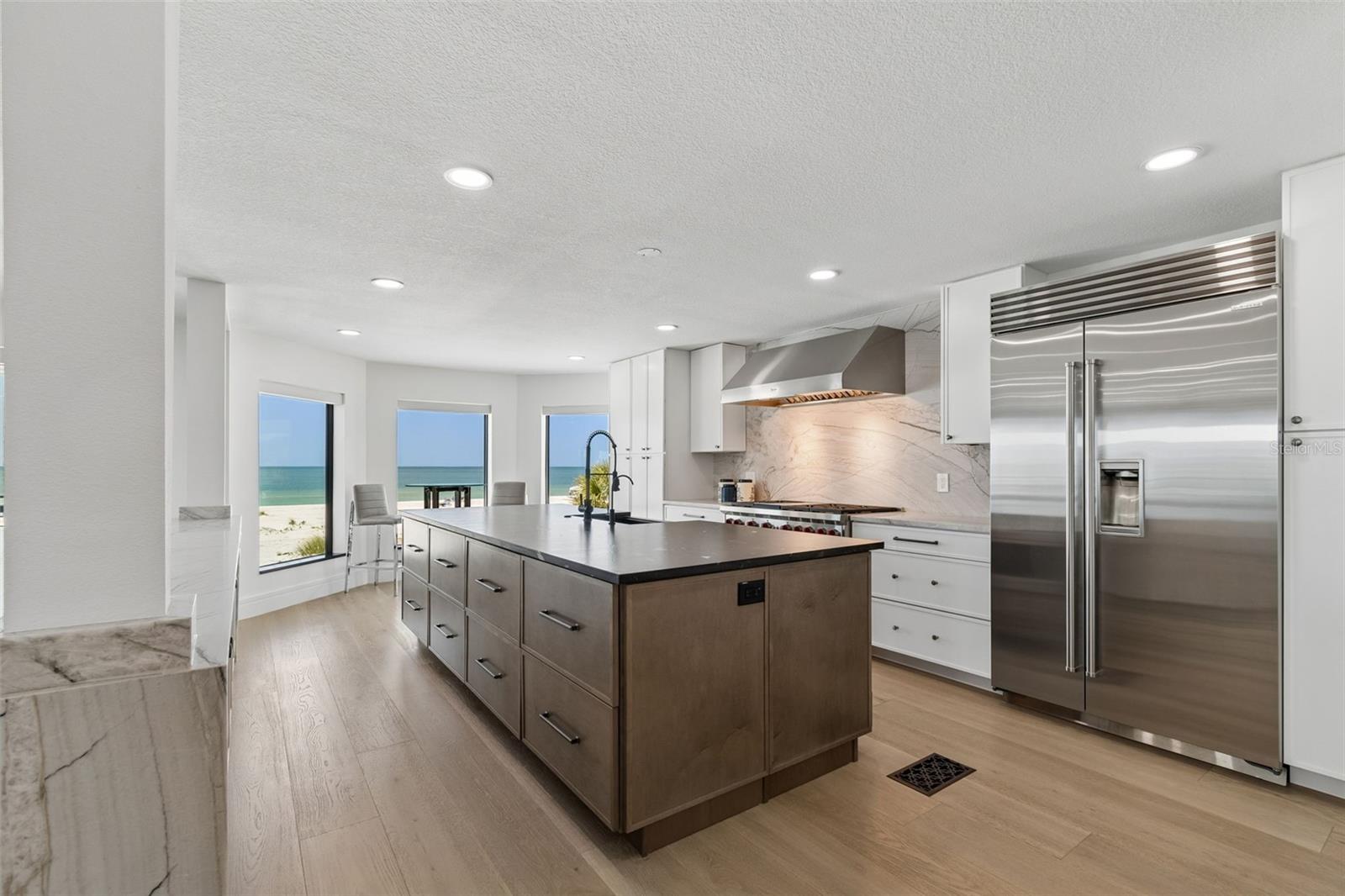 Welcome to a completely reimagined coastal masterpiece at 930 Eldorado Avenue. An extraordinary coastal retreat, masterfully remodeled to embody the pinnacle of modern luxury living in the heart of Clearwater Beach. Perfectly positioned just moments from the Gulf’s sugar sands, this exceptional residence captures breathtaking panoramic water views while offering a seamless blend of sophistication, comfort, and effortless coastal elegance. Completely renovated from top to bottom, this home showcases uncompromising quality and craftsmanship. Every major system has been thoughtfully upgraded, including a new roof, dual 4-ton HVAC systems, all-new electrical and plumbing, and a gas tankless hot water tank. Spanning three beautifully designed levels, the interior unfolds with a refined, light-filled aesthetic and impeccable custom finishes throughout. The ground level makes a striking first impression with a spacious four-car garage, epoxy floors, custom workbench, and direct access to the resort-style pool and full bath. The main living level is designed for both elevated entertaining and relaxed coastal living, featuring expansive open-concept spaces bathed in natural light. Floor-to-ceiling glass frames, stunning 24-foot panoramic Gulf views, while designer elements including a dramatic floating staircase, custom railings, wide-plank engineered hardwood flooring, automatic blinds create a truly elevated living experience. The gourmet chef’s kitchen is a statement of both form and function, appointed with large dual islands, 42-inch Sub-Zero refrigerator, 48-inch Wolf gas range, Thermador vent hood, Cove dishwasher, custom cabinetry, and exquisite quartzite and quartz surfaces. The main level also features 1 bedroom, 1 full bathroom and laundry room. The upper level is anchored by a serene primary suite, where wall-to-wall sliding glass doors open to a private balcony overlooking the Gulf, an idyllic setting for evening sunsets. The spa-inspired ensuite bath features a soaking tub, glass-enclosed shower, and refined designer finishes, complemented by a boutique-style walk-in closet reminiscent of a high-end retail showroom. Two additional bedrooms, a full bath, and a spiral staircase leading to a charming loft lookout complete this level, offering a perfect vantage point for unforgettable sunset views. Outdoors, the home transforms into a private resort-style oasis designed for year-round enjoyment. The saltwater pool, complete with electric heater and gas-heated spa, is surrounded by lush new St. Augustine sod and enhanced by a fully updated irrigation system and privacy fencing. The expansive outdoor living area features a fully equipped 12-foot chef’s kitchen with natural gas grill, refrigerator, ice maker, gas fire pit, fire tray and outdoor sound system creating an exceptional setting for entertaining. A full pool bath and additional outdoor shower add both convenience and luxury. Additional enhancements include a private elevator, hurricane-impact windows and doors, concrete driveway pavers, integrated security cameras with ADT system, new garage doors, designer lighting, fresh interior and exterior paint, and premium finishes throughout. Being steps away from Clearwater Beach’s top restaurants, shopping, and recreational activities is also no small bonus. This is a rare opportunity to own a truly turnkey coastal masterpiece in one of Florida’s most coveted beach communities.