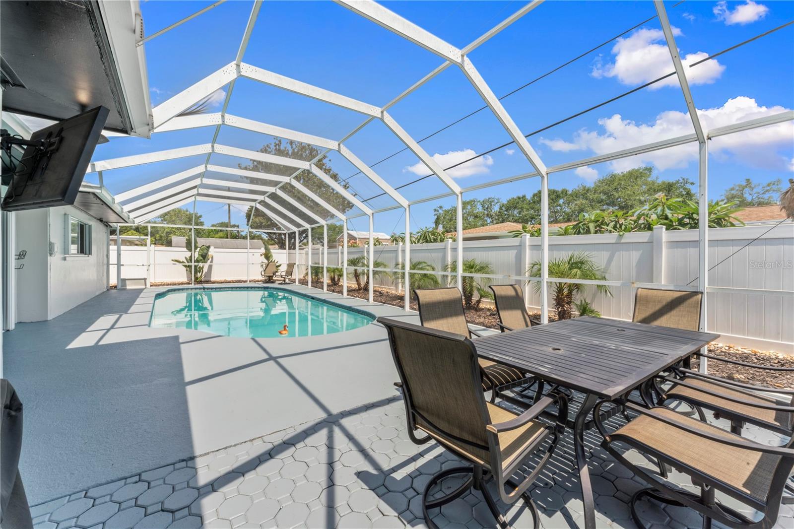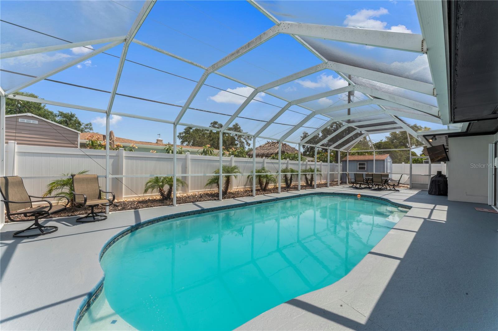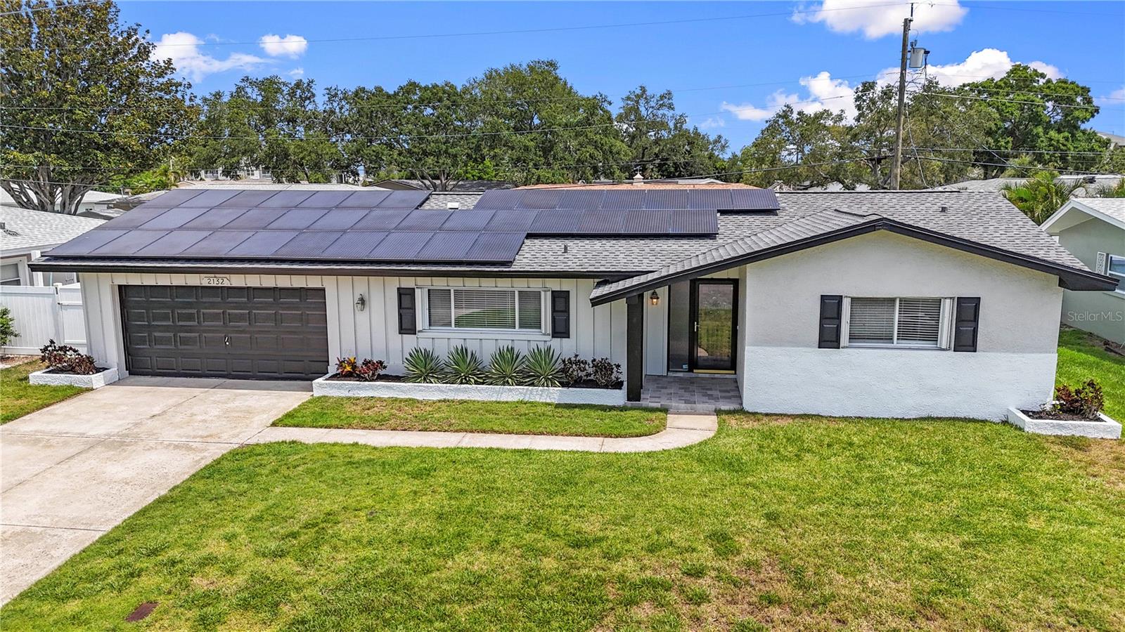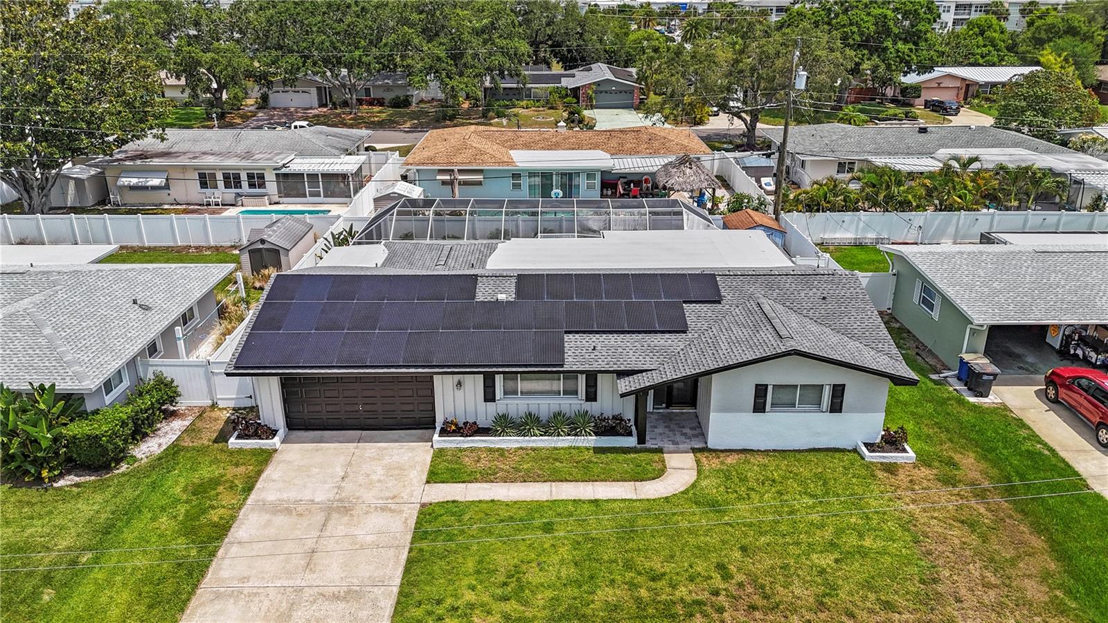 Under contract-accepting backup offers. Welcome this tastefully updated, nearly 2,100 sq ft pool home which offers 4 bedrooms, 3 full bathrooms and a 2-car garage and is located in one of Clearwater’s most desirable neighborhoods. This property sustained no storm or flood damage from last year’s hurricanes and is located in flood zone x, meaning no flood insurance is required. It's also in a non-evacuation zone, with no HOA fees, and comes equipped with numerous energy-efficient upgrades including a fully paid-off 11 kw solar panel system for significant cost savings and year-round peace of mind. Inside, you’ll find elegant wood-look tile flooring throughout the entire home (yes, no carpet!), and a gourmet kitchen featuring quartz countertops, a Frigidaire Professional built-in refrigerator and freezer as well as ample cabinet space. The open-concept living and dining area, complete with french doors, flows seamlessly to a large screened-in lanai and pool area which is perfect for entertaining or relaxing in private comfort. The flexible floor plan includes two large bedrooms with ensuite bathrooms, ideal for multi-generational living or a luxurious guest suite. Two additional bedrooms provide endless possibilities. Additional features include new exterior paint (2025), newer roof (2022), newer HVAC and water heater, built-in hurricane shutters, an impact-rated garage door, and a whole-house water filtration system. This home is ideally situated being just 15 minutes from world-famous Clearwater Beach, less than 15 minutes to Costco, Target, Home Depot, Lowe’s, countless dining options, Ruth Eckerd Hall, Safety Harbor, Dunedin and the St. Pete-Clearwater Airport, 25 minutes from Downtown St Petersburg and the Tampa International Airport and 30 minutes from Downtown Tampa. This home combines convenience, comfort, and long-term value. Don’t miss your opportunity to see this exceptional property, schedule your private showing today!