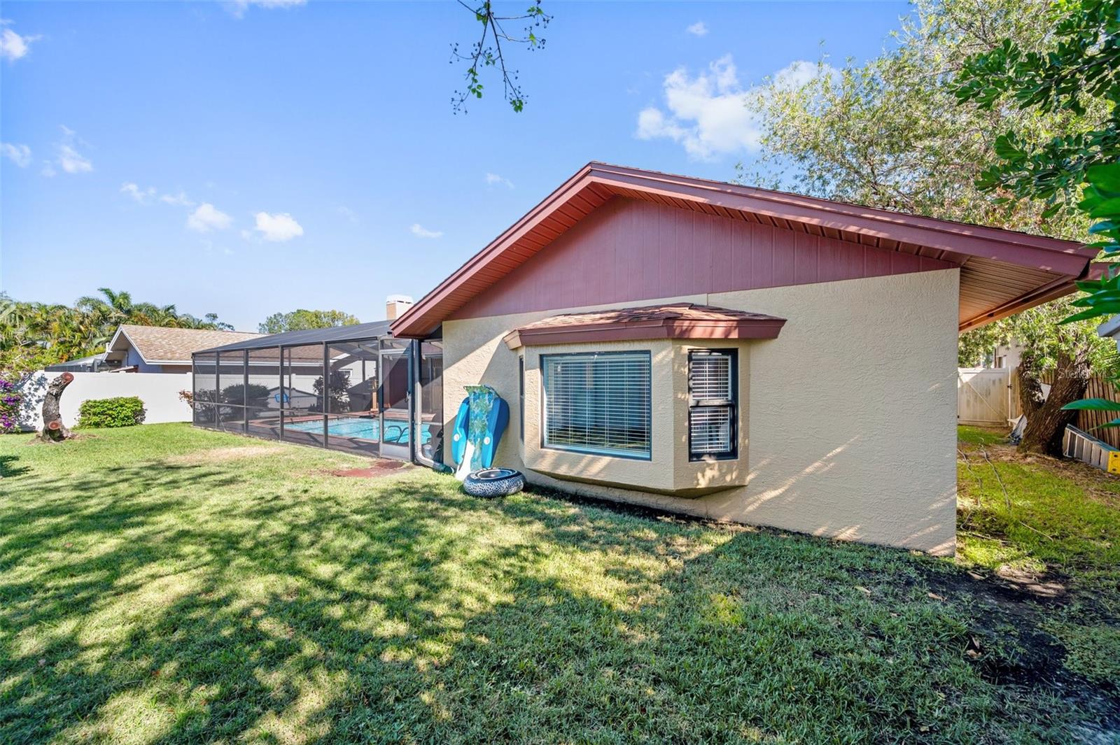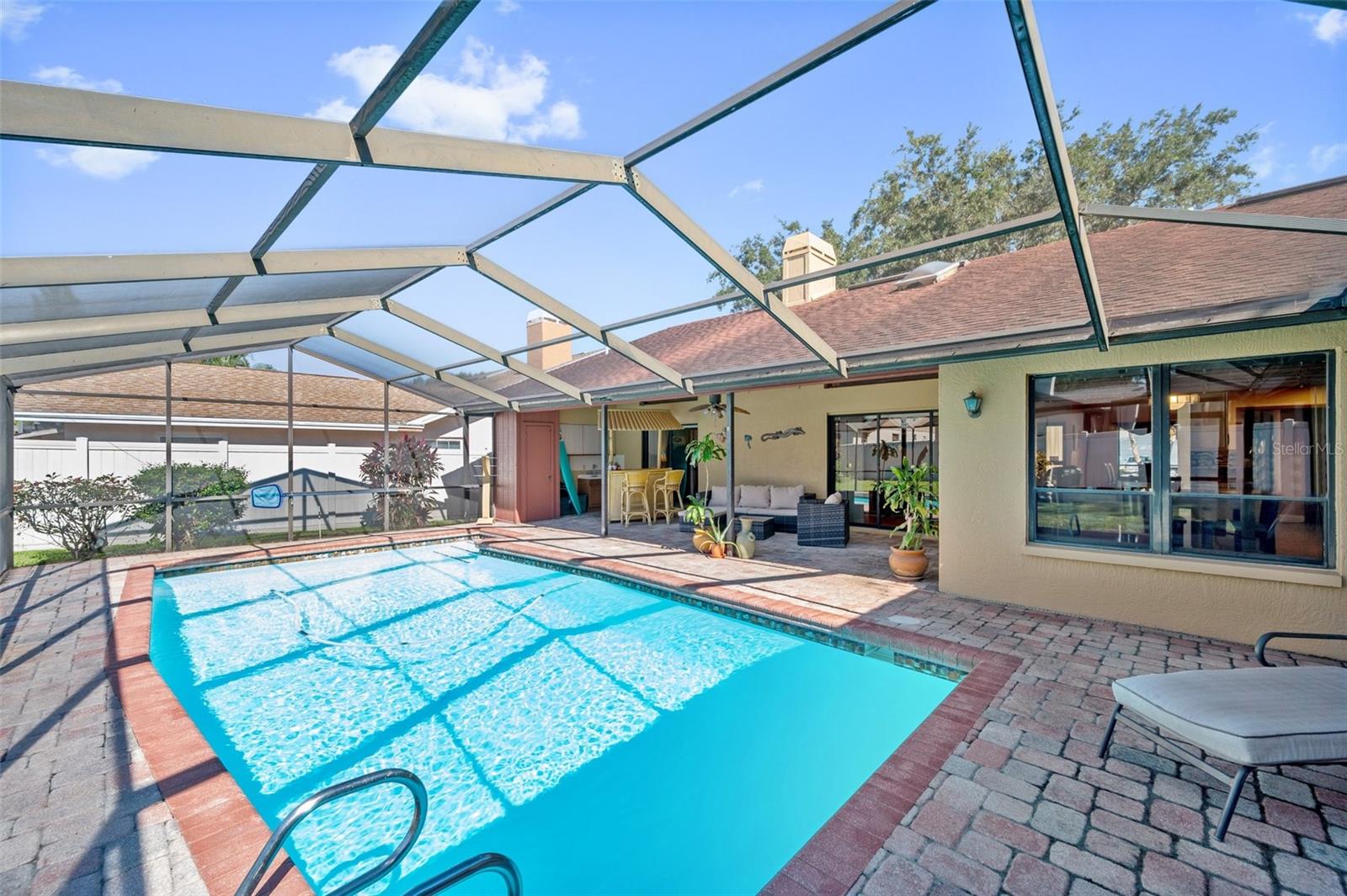 This location in the Countryside Community continues to be in high demand. The proximity to shopping, dining, entertainment, and medical facilities are numerous. A quick drive to Dunedin, Clearwater Beach,Honeymoon Island, Safety Harbor, Tarpon Springs, St Pete, and Tampa. Approximately 30 minutes to the TPA or PIE Airports. Recreational activities abound, with many Golf courses, Rec centers, Pinellas bicycle trails, and Parks. Once inside the home, the foyer flows into the family room with vaulted ceilings, a wood-burning fireplace, hardwood floors, and sliders opening directly onto the Lanai. A separate dining room is at the front of this floorplan and flows into the remodeled kitchen with its granite counters, stainless steel appliances, reverse osmosis water filter, and a full seating area that opens onto the patio with glass sliders. This split plan Home has the spacious and comfortable primary bedroom suite to the right, boasting a walk-in closet, ensuite bathroom with double sinks, separate shower, and garden tub. Double glass sliding doors open from the bedroom onto the enclosed pool and lanai. On the left side of this split floorplan, you will find a laundry room and garage access up front, followed by 2 ample-sized bedrooms. The bathroom services the 2 original bedrooms, and a sliding pocket door opens into the added fourth bedroom, oversized at 17'x19'. This fourth bedroom has the option of being an in-home office, bonus room, or in-law suite, with its private French doors opening again onto the lanai pool area. The screen-enclosed pool features pavers, a built-in bar counter with a sink, a closet, and a bar area. This all leads to the expansive vinyl-fenced back and side yard for your pets and family to run and play safely, with an 8x10 shed for extra storage. Upgrades include; New Roof & 3 new Skylights 11/2024, HVAC 2023, Garage Door Opener 2024, Washer & Dryer 2024, Exterior of home Painted 2023, Pool Pump & Filter 2023, Pool sweep 2024, Pool Resurfaced 2022, Sprinkler Irrigation system and pump 2022, Vinyl Fence 2018, Bonus parking pad. Contact us today to schedulea viewing of this spacious gem- don’t miss the opportunity to make it yours!