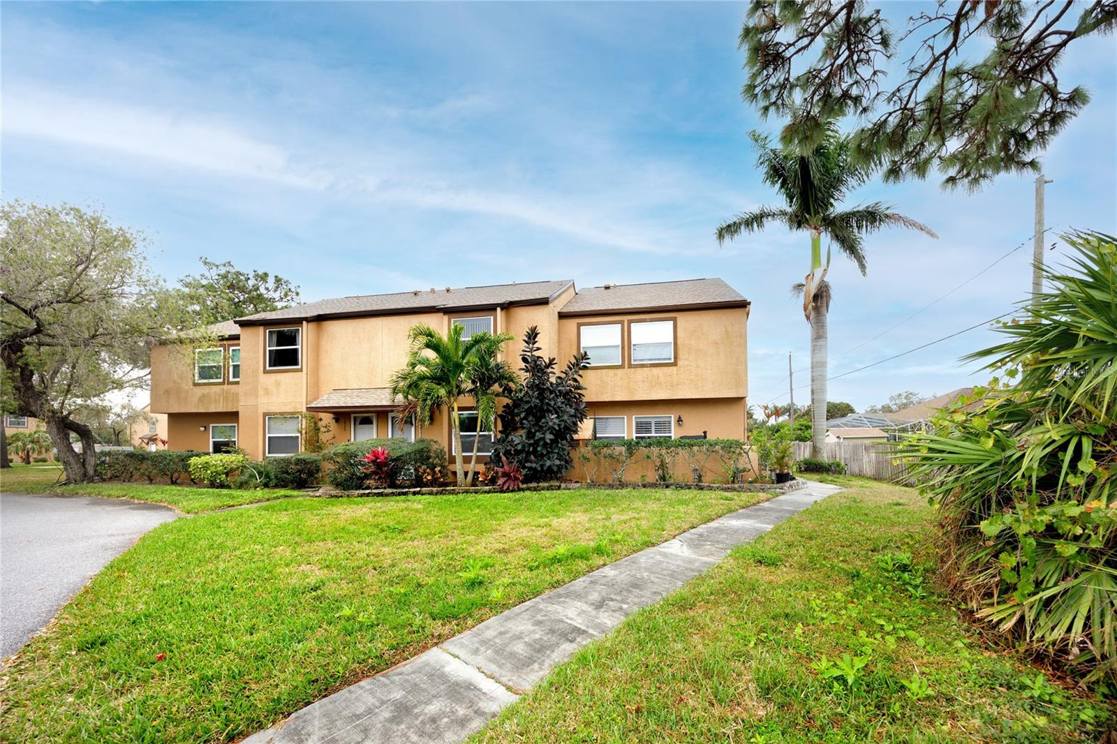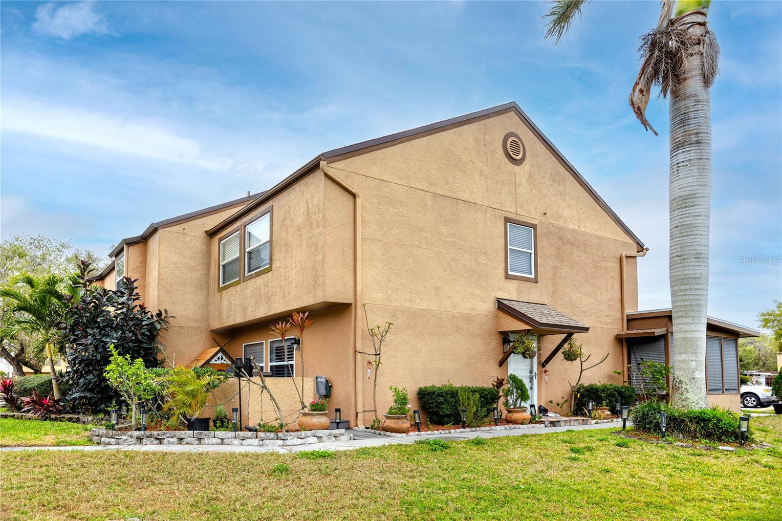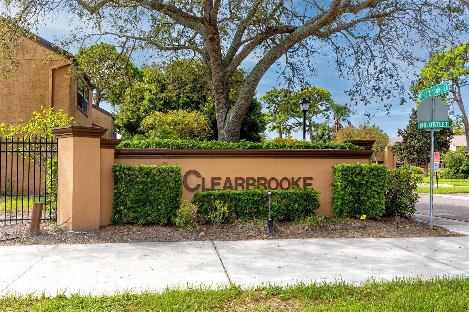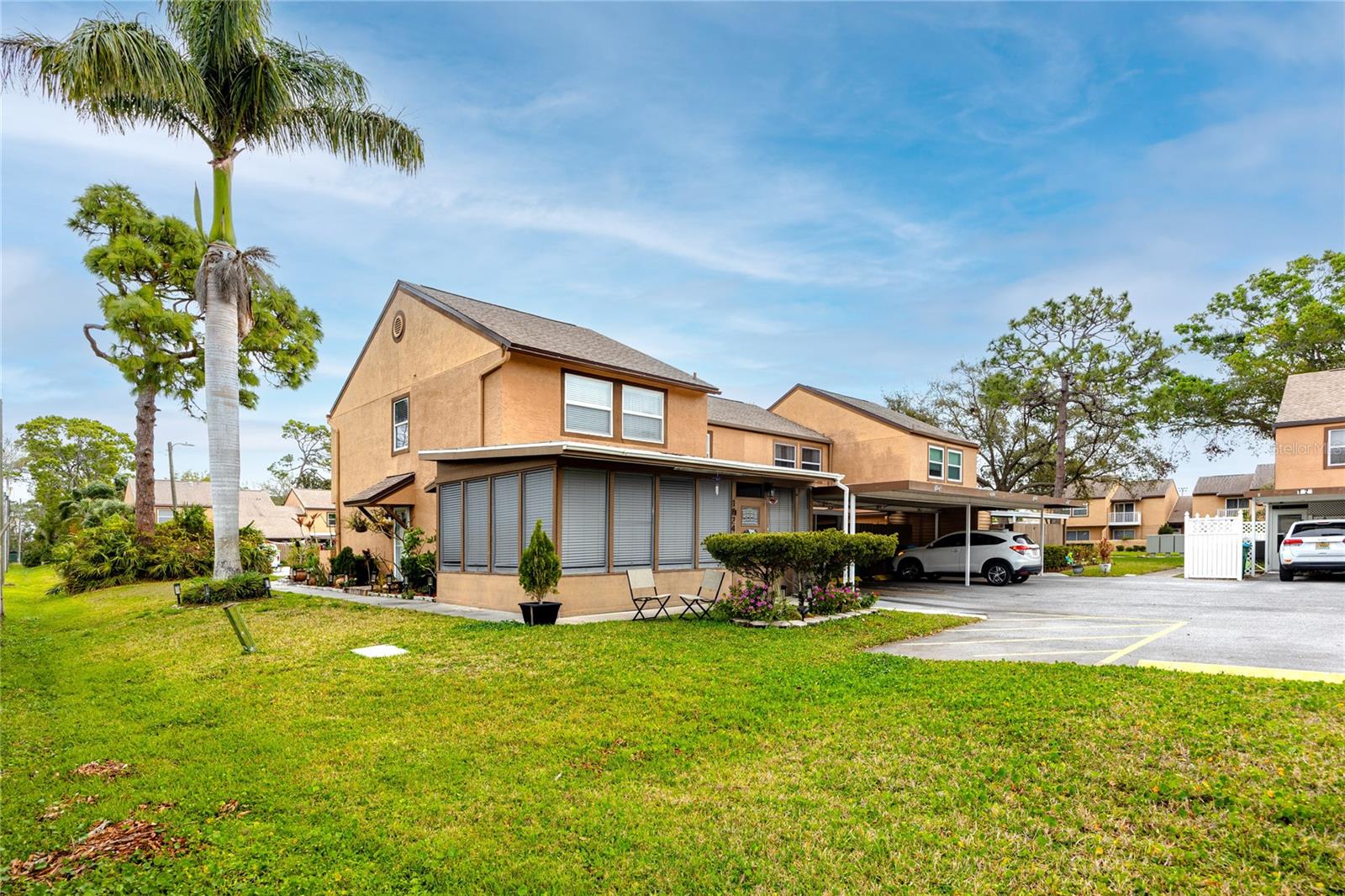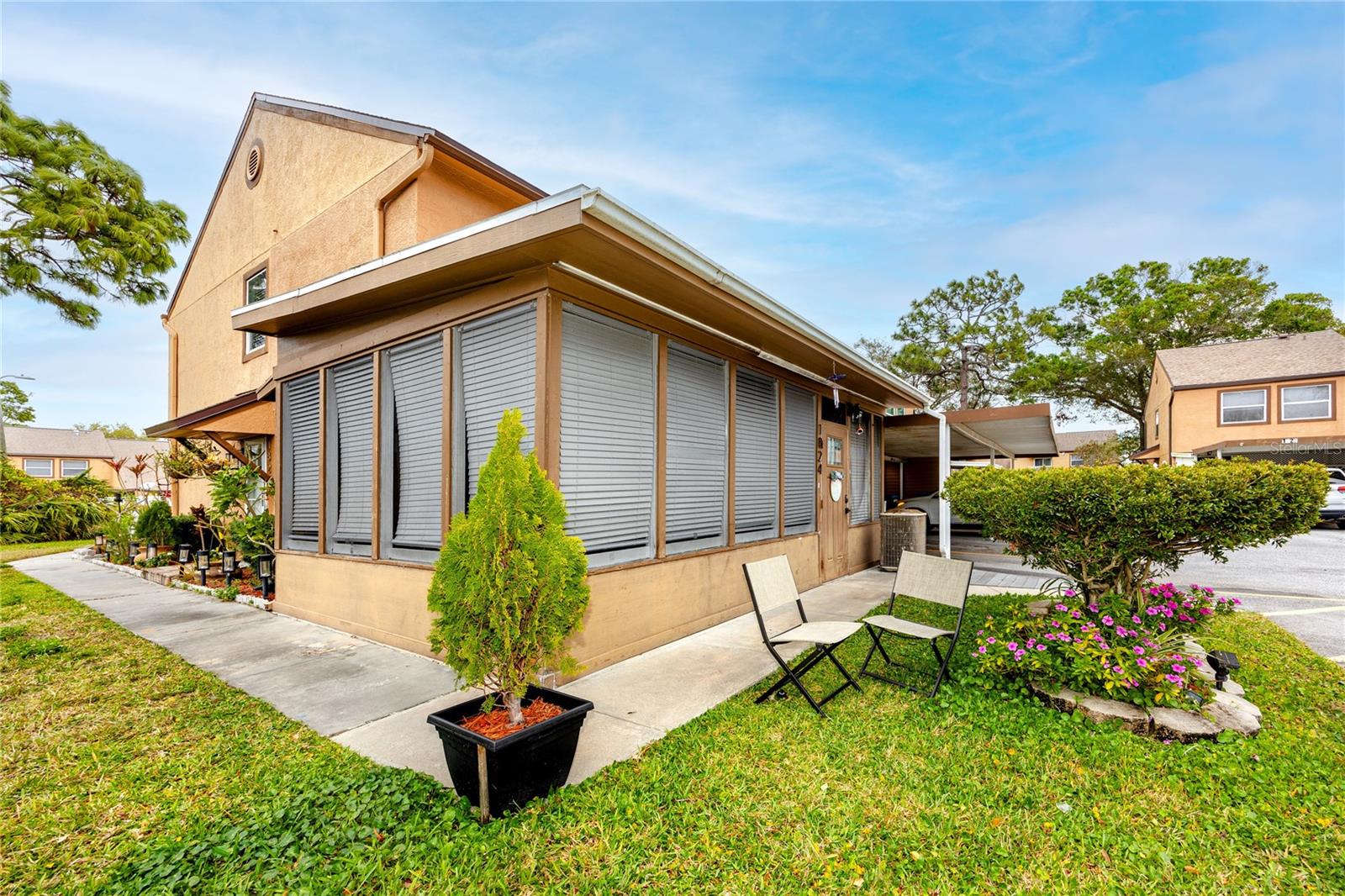 Price Improvement ! This spacious end-unit 2 story townhouse in the sought-after Clearbrooke neighborhood features 3 bedrooms and 2.5 baths. The kitchen boasts dark wood cabinets, granite countertops, a travertine backsplash, and stainless steel appliances. A custom 6-foot granite island/dining table offers extra seating and storage. The living room includes window PLANTATION SHUTTERS and a entrance door, while modern built-in lighting enhances the textured ceilings. Unit has a new electrical panel. The bottom floor features a nice sized living room, kitchen and dining combo plus a half bath and the top floor has 3 bedrooms and 2 bathrooms. French doors lead to a large 22x14 covered, screened-in tiled patio with a ceiling fan and blinds—perfect for entertaining. The unit also has a laundry closet with ample storage and a newer washer/dryer. Please note that this is not part of the 1260 sq ft. and is extra space to be enjoyed ! You will love the green space, a front porch for barbecuing, an attached carport, and an assigned second parking spot right outside the patio door, plus plenty of visitor parking. This well-maintained community offers a pool, gazebo, clubhouse, sidewalks under mature trees, and a dog park. Conveniently located near Old Tampa Bay but outside the flood zone, it's close to schools, beaches, golf courses, airports, and the downtowns of Clearwater, St. Pete, Dunedin, Safety Harbor, and Tampa. Don't miss this opportunity—come see it today!