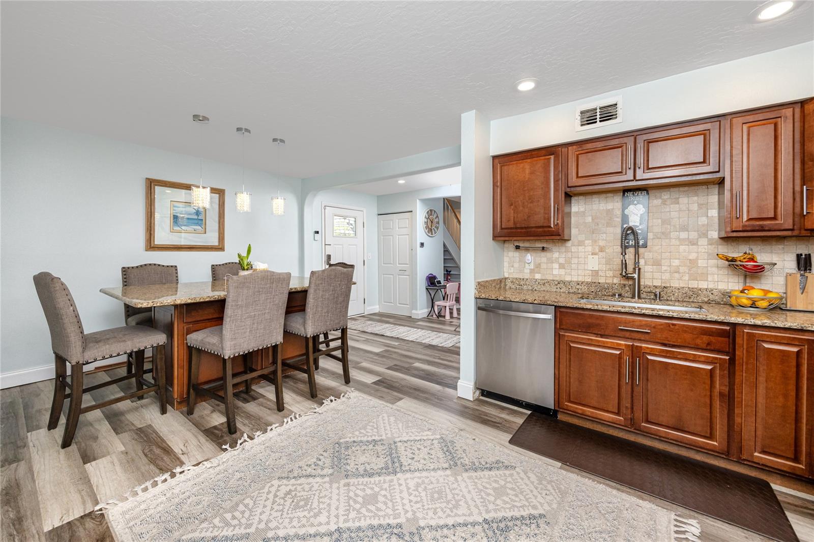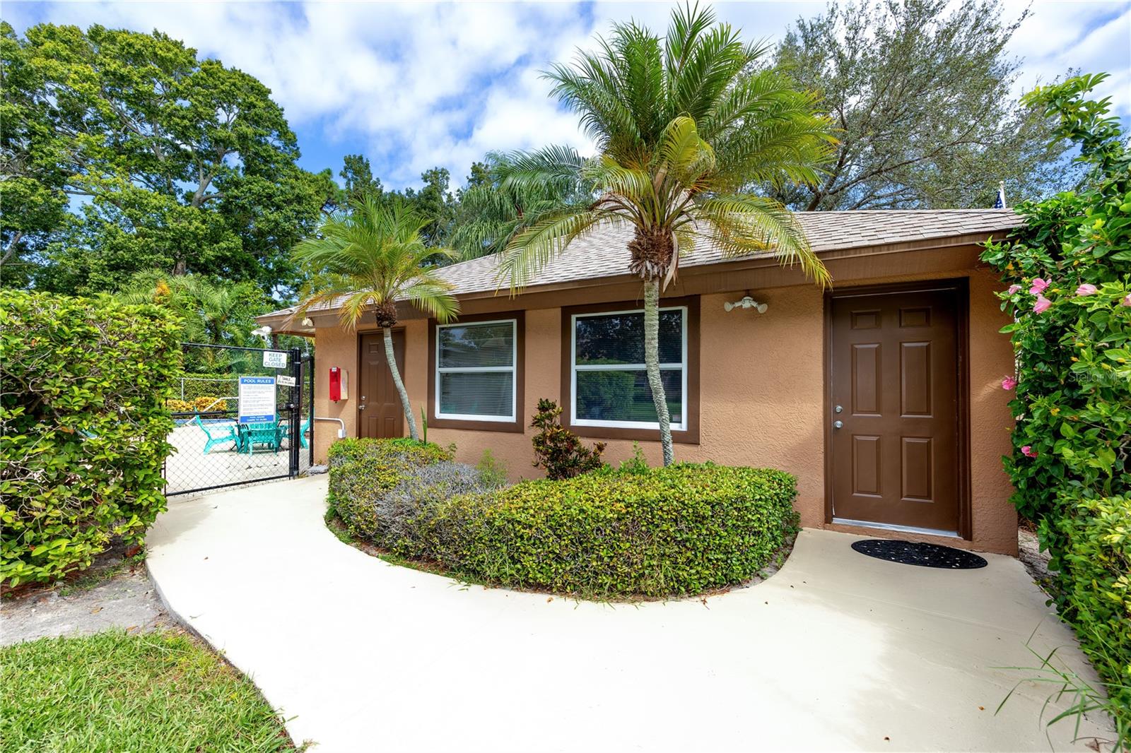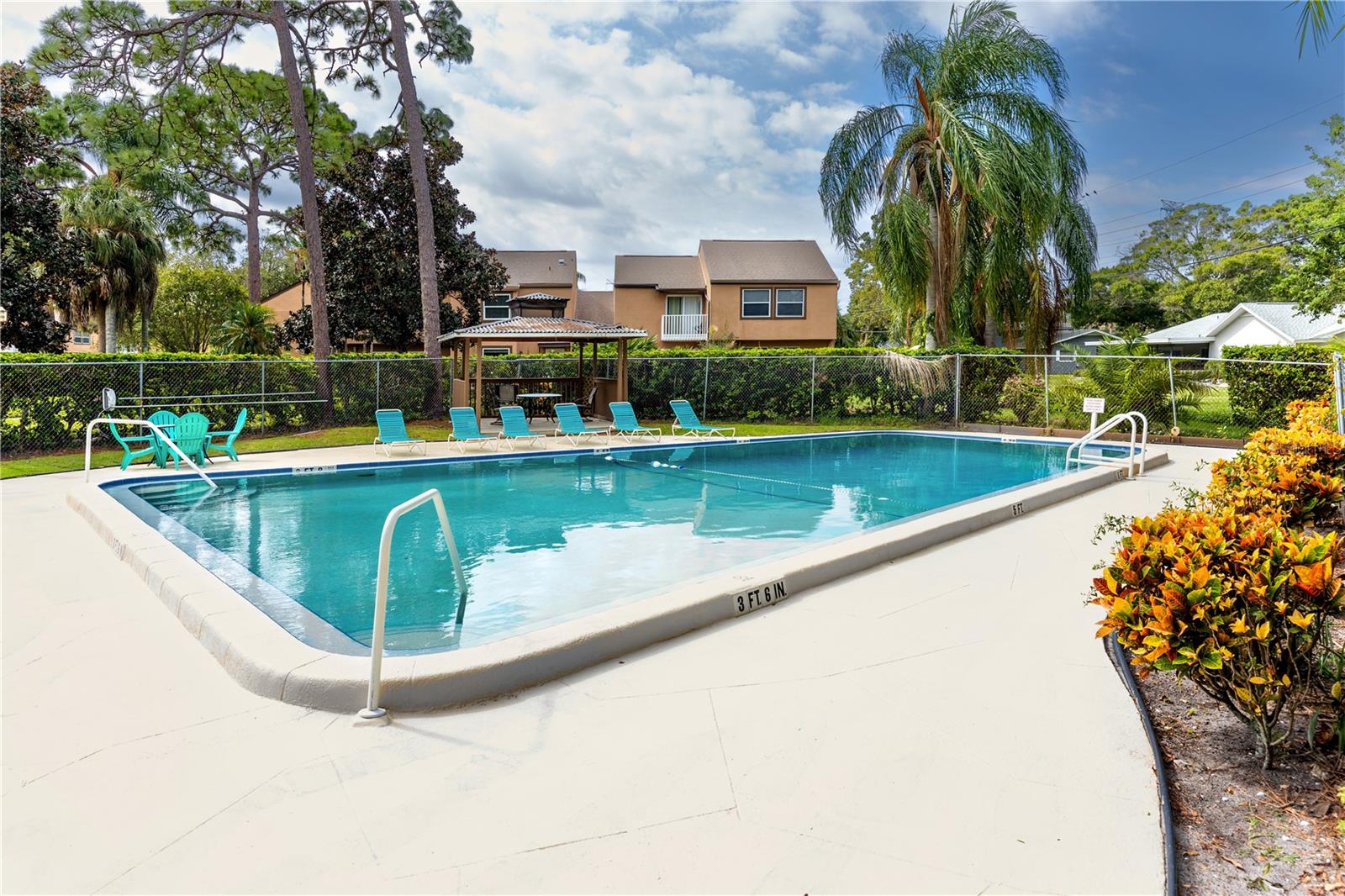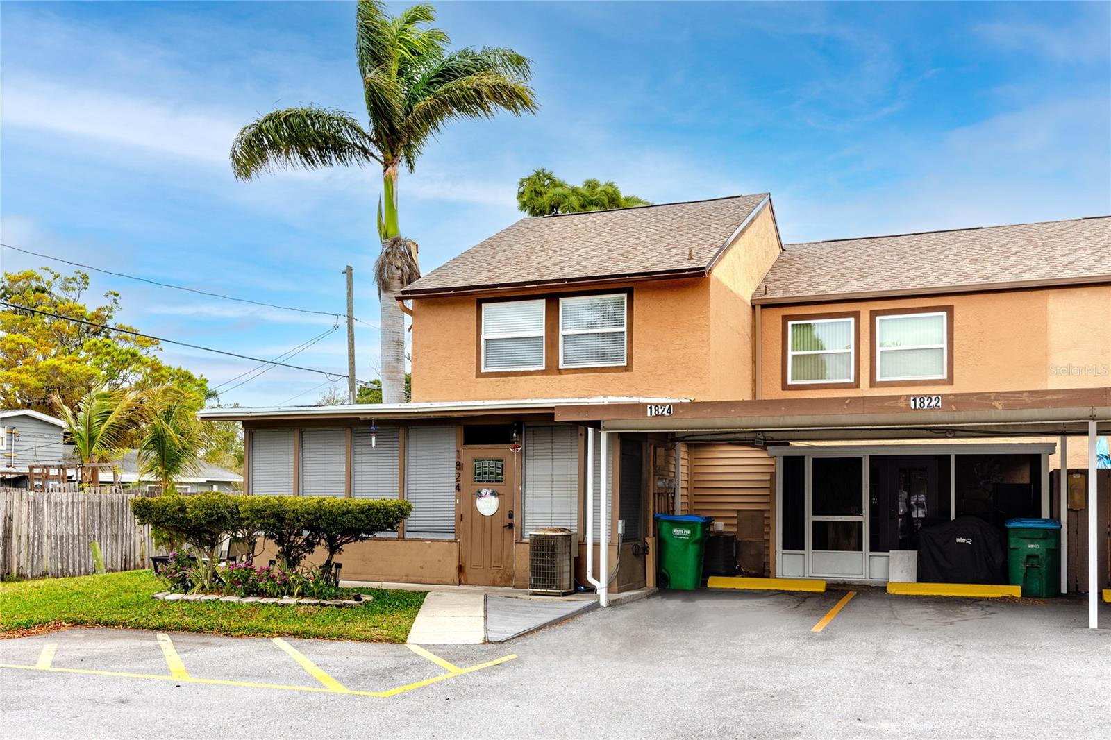 Price Improvement ! This spacious end-unit 2 story townhouse in the sought-after Clearbrooke neighborhood features 3 bedrooms and 2.5 baths. The kitchen boasts dark wood cabinets, granite countertops, a travertine backsplash, and stainless steel appliances. A custom 6-foot granite island/dining table offers extra seating and storage. The living room includes window PLANTATION SHUTTERS and a entrance door, while modern built-in lighting enhances the textured ceilings. Unit has a new electrical panel. The bottom floor features a nice sized living room, kitchen and dining combo plus a half bath and the top floor has 3 bedrooms and 2 bathrooms. French doors lead to a large 22x14 covered, screened-in tiled patio with a ceiling fan and blinds—perfect for entertaining. The unit also has a laundry closet with ample storage and a newer washer/dryer. Please note that this is not part of the 1260 sq ft. and is extra space to be enjoyed ! You will love the green space, a front porch for barbecuing, an attached carport, and an assigned second parking spot right outside the patio door, plus plenty of visitor parking. This well-maintained community offers a pool, gazebo, clubhouse, sidewalks under mature trees, and a dog park. Conveniently located near Old Tampa Bay but outside the flood zone, it's close to schools, beaches, golf courses, airports, and the downtowns of Clearwater, St. Pete, Dunedin, Safety Harbor, and Tampa. Don't miss this opportunity—come see it today!