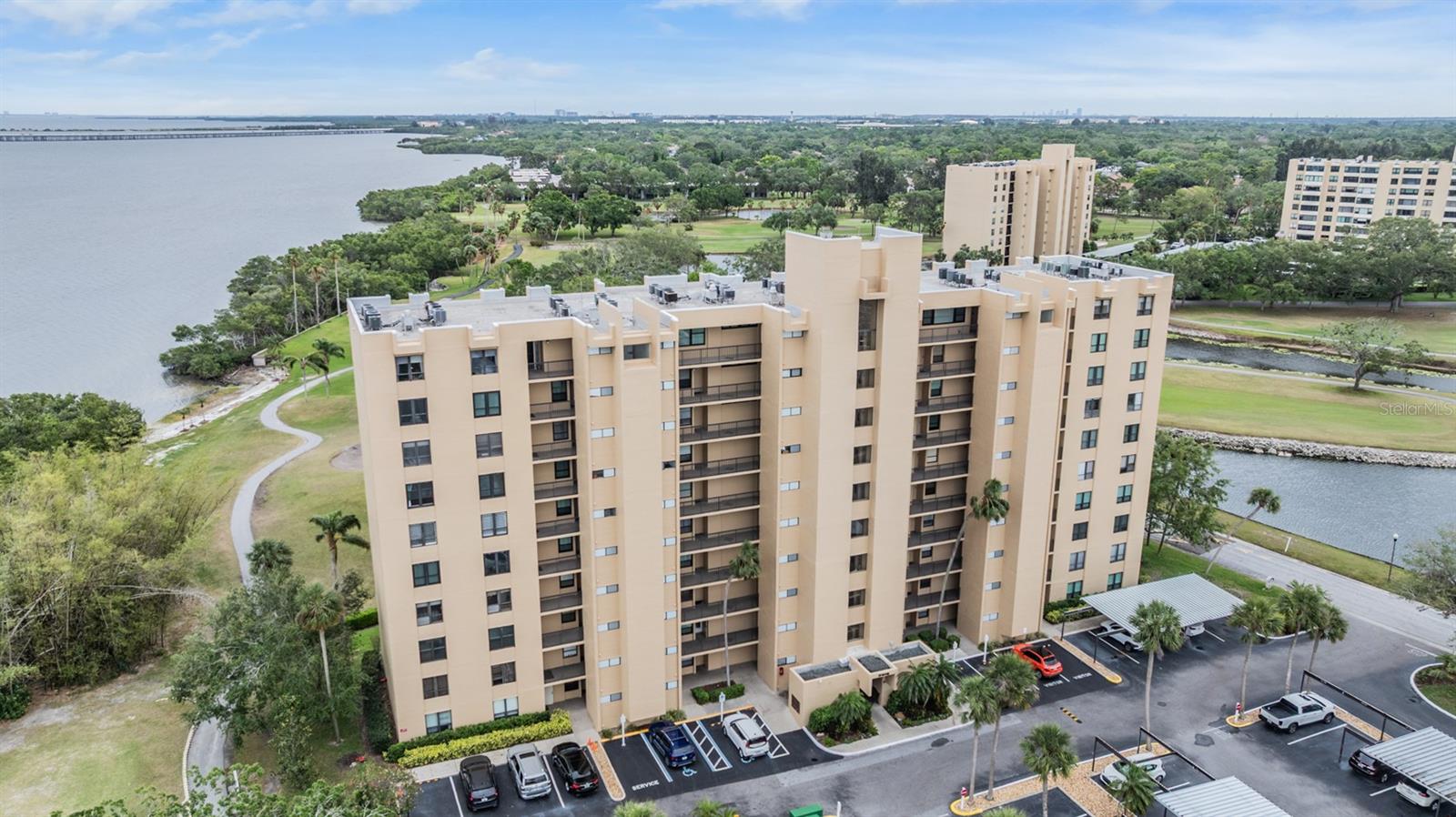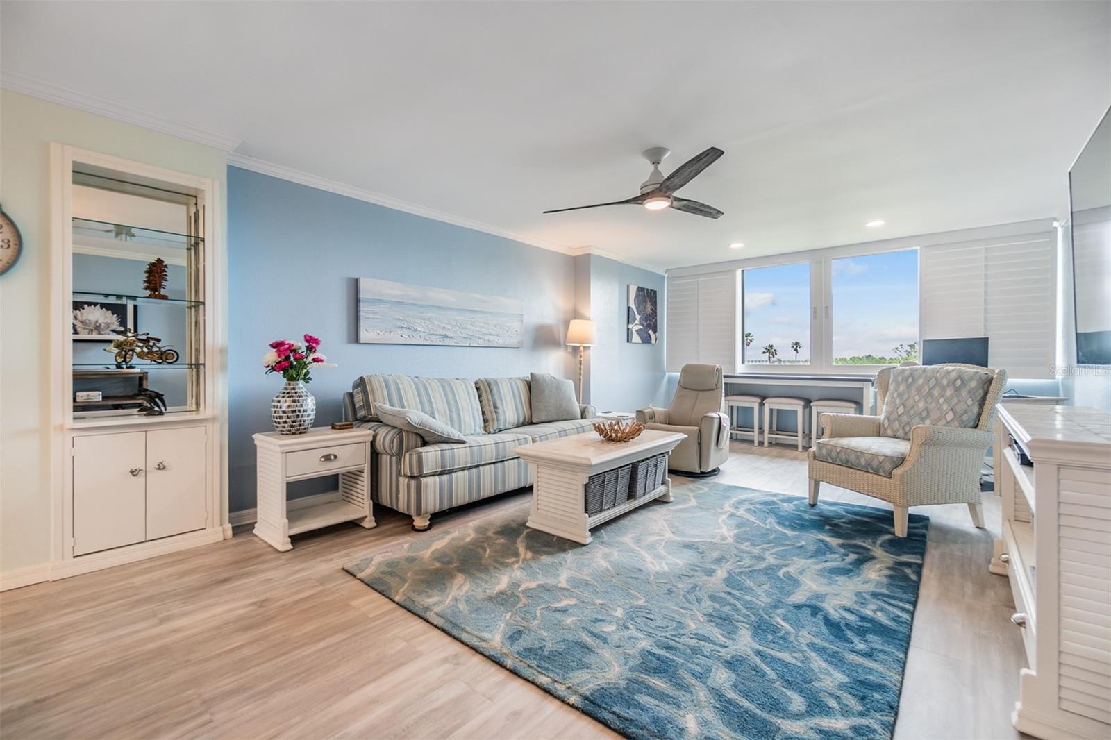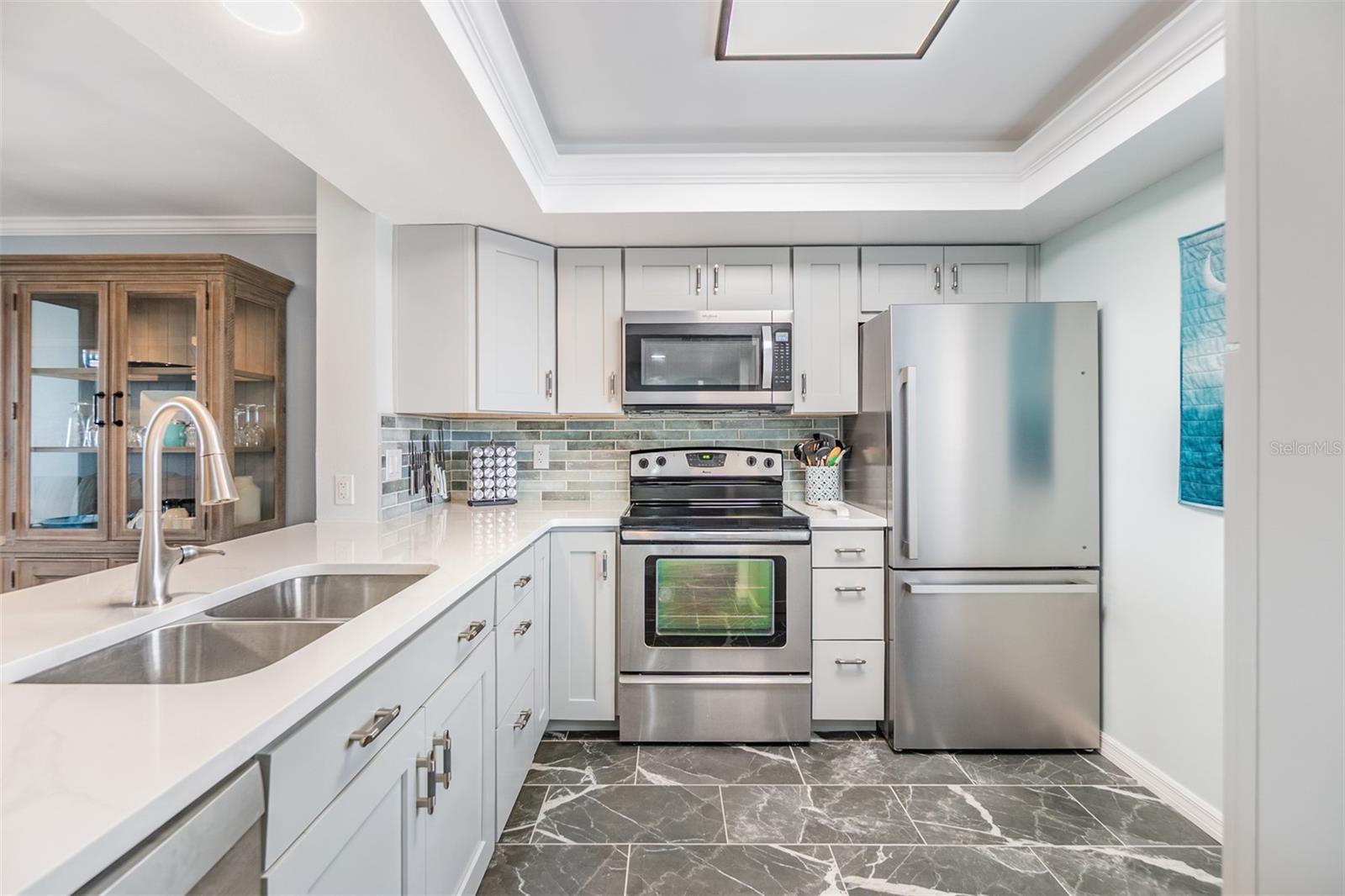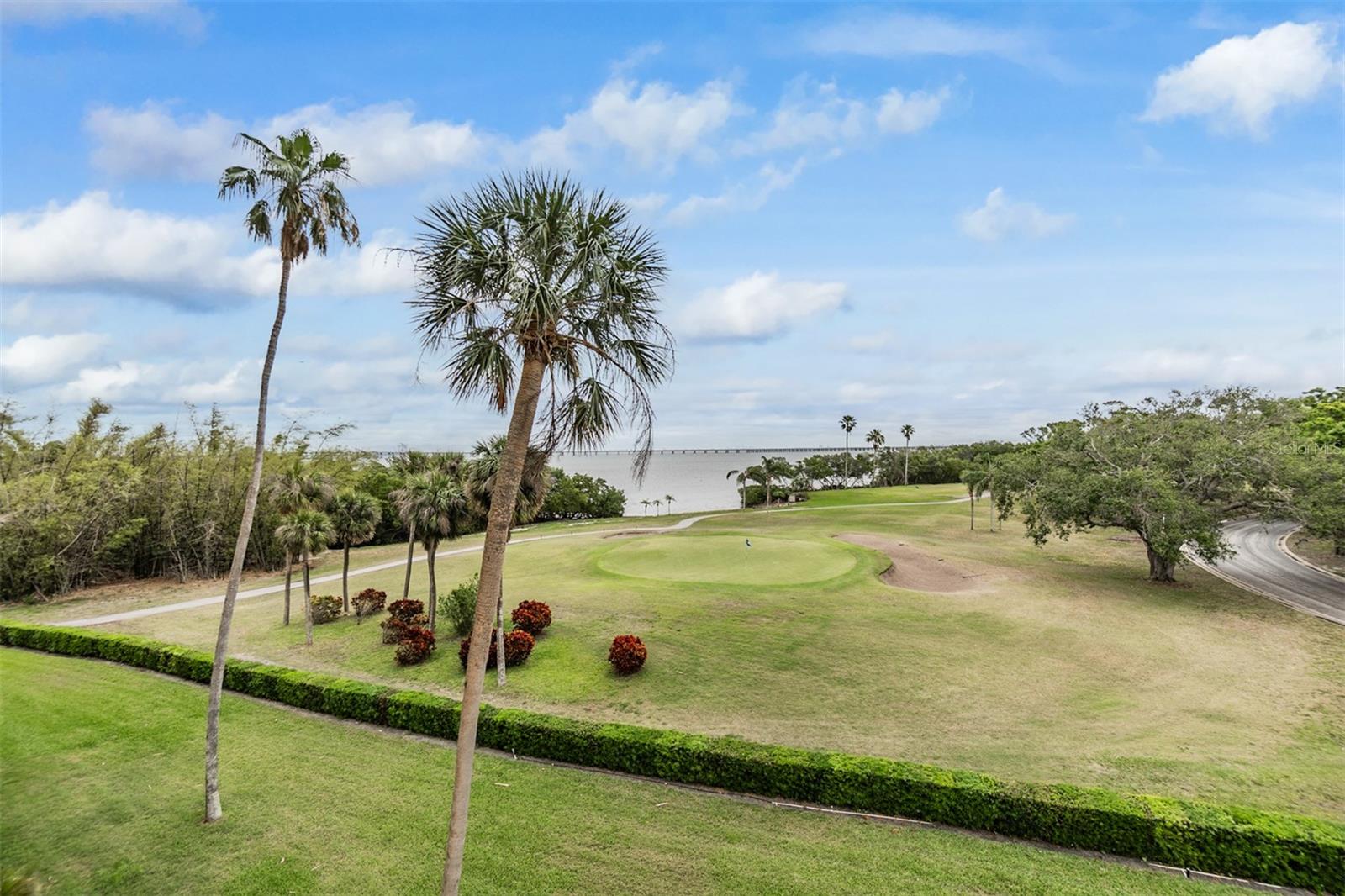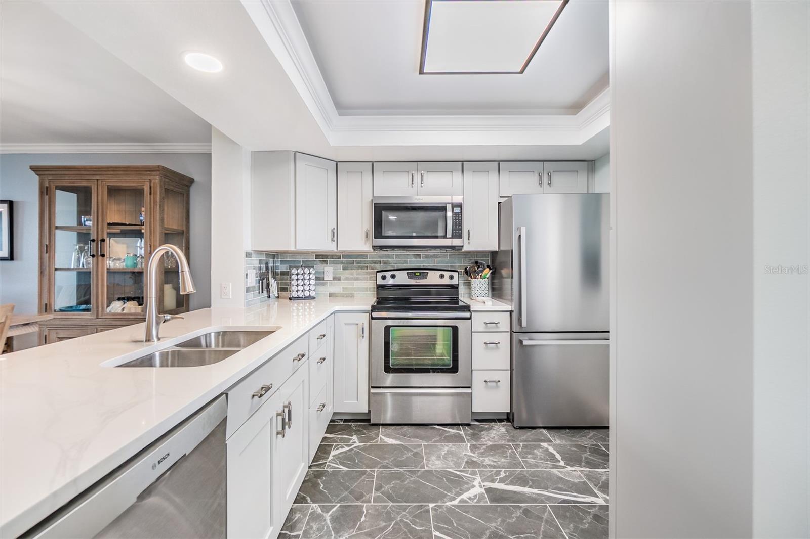 Step into this beautifully renovated 2-bedroom, 2-bath condo and prepare to be wowed—every detail has been updated with style and sophistication in mind. Nestled in the sought-after Cove Cay community, this gem offers sweeping views of the sparkling waters of Tampa Bay and the lush, manicured 16th green of the golf course. Dolphins playing alongside golfers is quite a treat to behold. It’s the best of both worlds, and it’s all yours. The heart of the home is a show-stopping open kitchen with sleek pale gray cabinetry, a dramatic raised ceiling with crown molding and color-changing, remote-controlled lighting (yes, really), and a spacious quartz serving bar perfect for entertaining. The cool glass tile backsplash adds just the right pop of personality, and the 2024 stainless steel bottom-freezer fridge makes this space as functional as it is fabulous. Your eyes will pop at the beautiful and dramatic tile flooring in this area, completing the perfect kitchen area. Throughout the main living areas, upgraded Pergo flooring flows seamlessly, complemented by fresh, on-trend paint colors and detailed crown molding. Every room feels crisp, modern, and move-in ready and there is no pesky popcorn in any main room. There is a room-width hurricane sliding window in the living room and also an updated window in the master bedroom. All windows are complemented with gorgeous Plantation shutters, allowing you to adjust the light as you please. Other great features include a newer water heater, covered parking to protect your vehicle, and a full size laundry room with washer and dryer(for your use only) across the hall from the front door. Whether you're enjoying your morning coffee with bay breezes or watching the sunset over the fairway, you'll love calling this place home. Beautifully furnished for seller's convenience and yours!! This is the one you are looking for. Welcome to easy Florida living with all the upgrades—and all the views. Cove Cay is located on the shores of Tampa Bay with golf and water views all around. The 24 hour guard, lovely recreation area with pool table, fitness room, heated pool and spa in your village, golf course with restaurant open 7 days a week and an available marina (golf, dining and marina not included in condo fees) without going out of the gate and more make this the Paradise Found that you have been looking for.