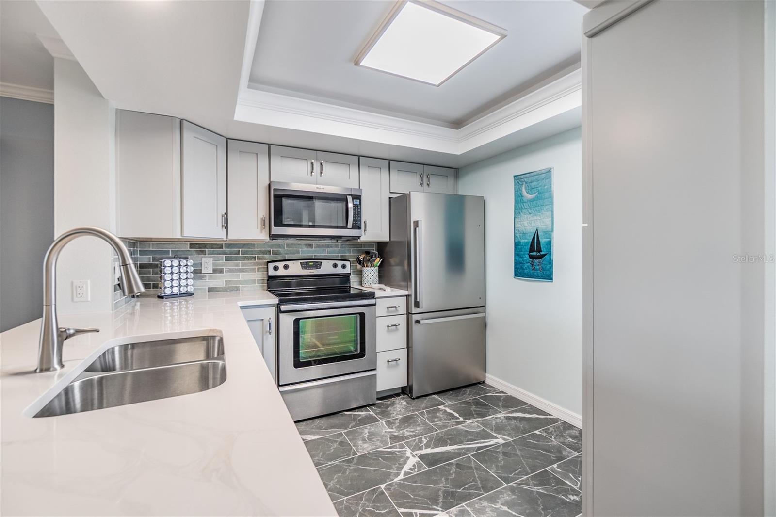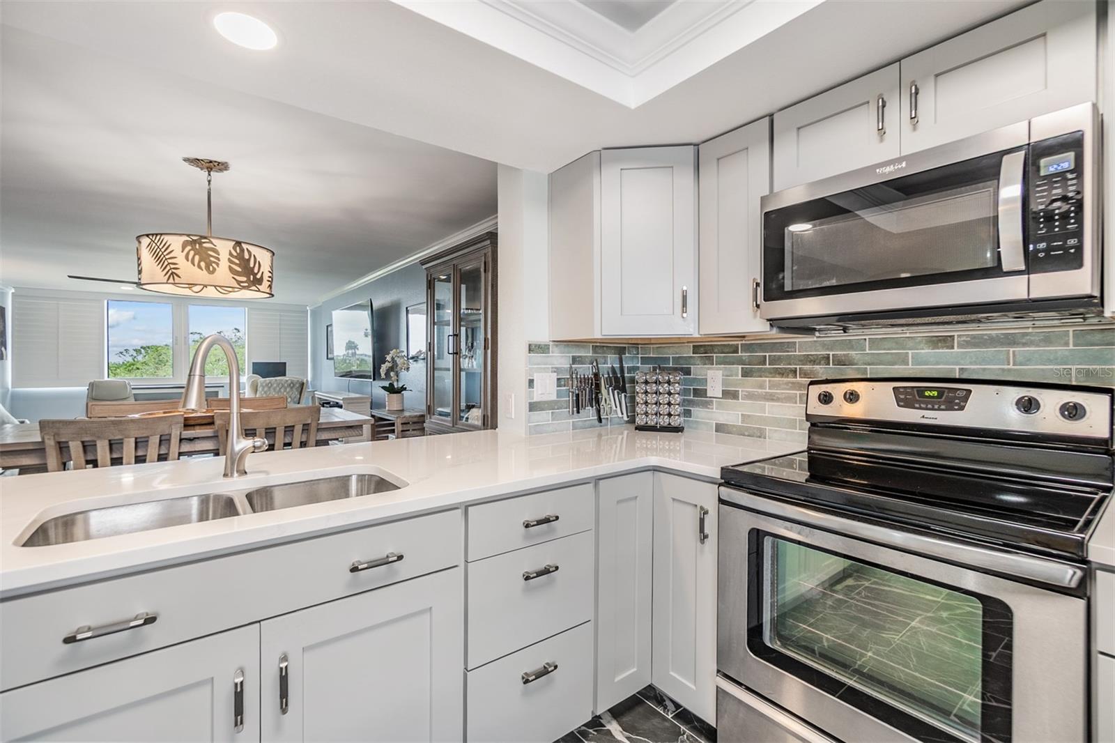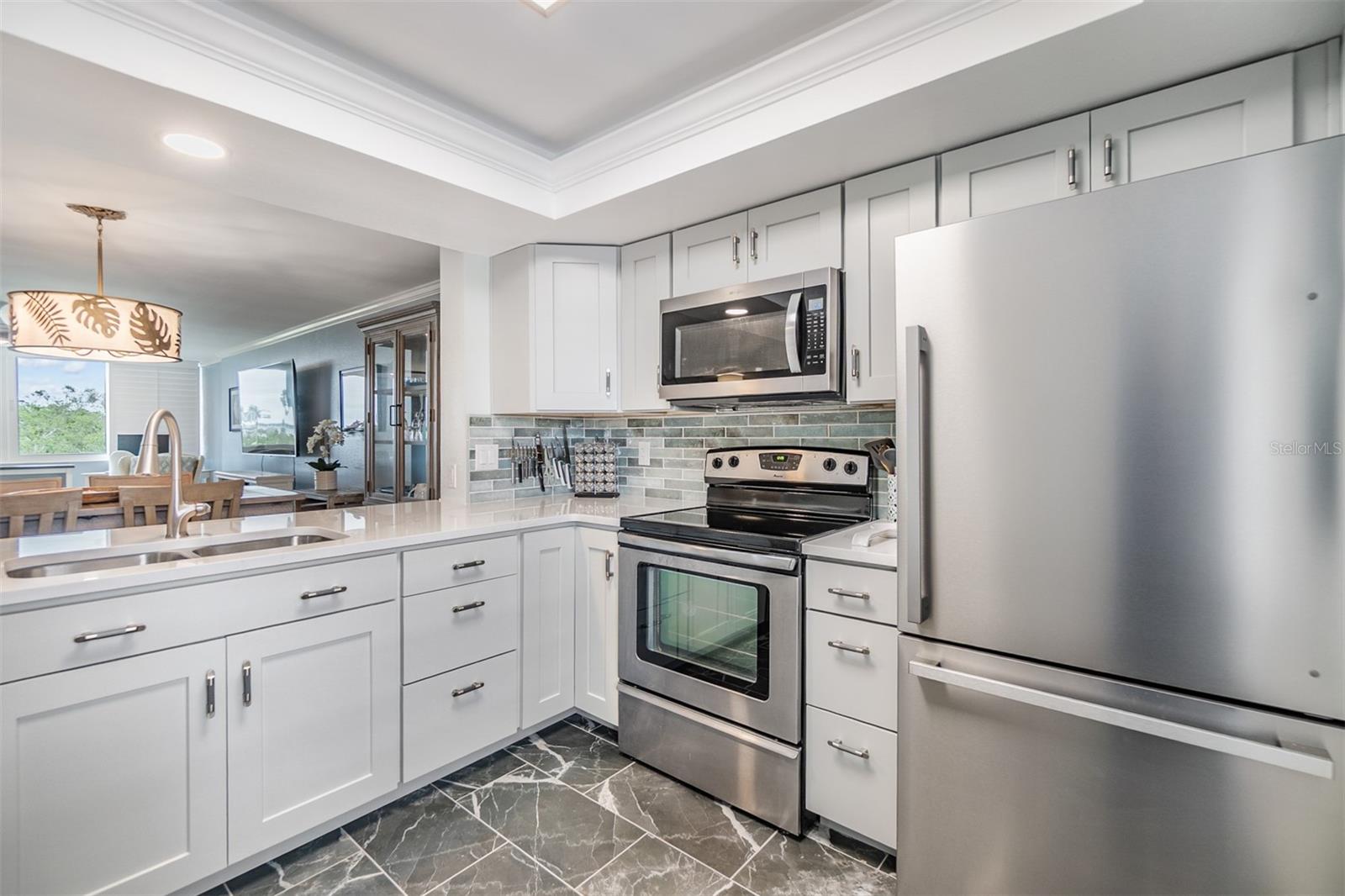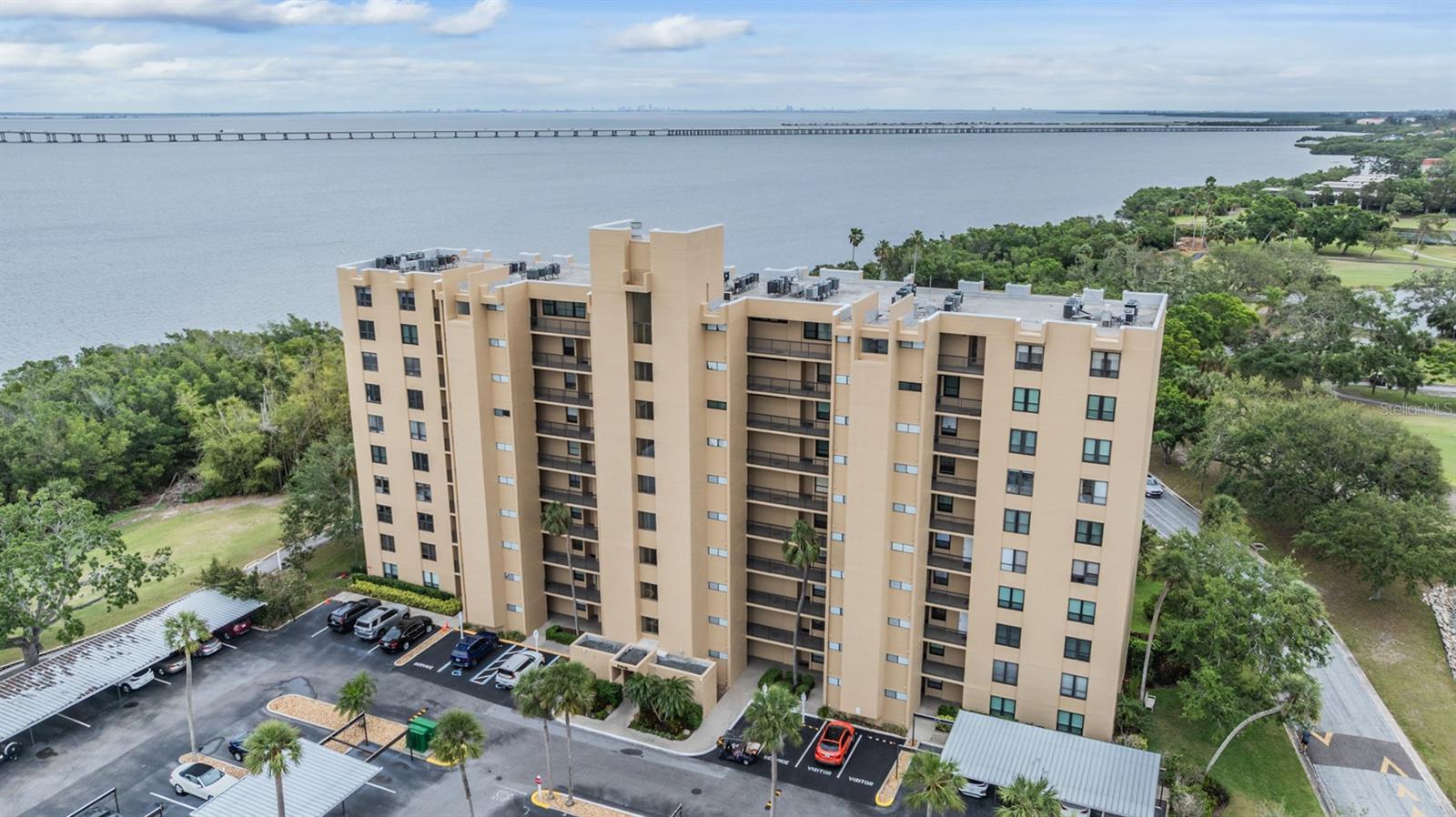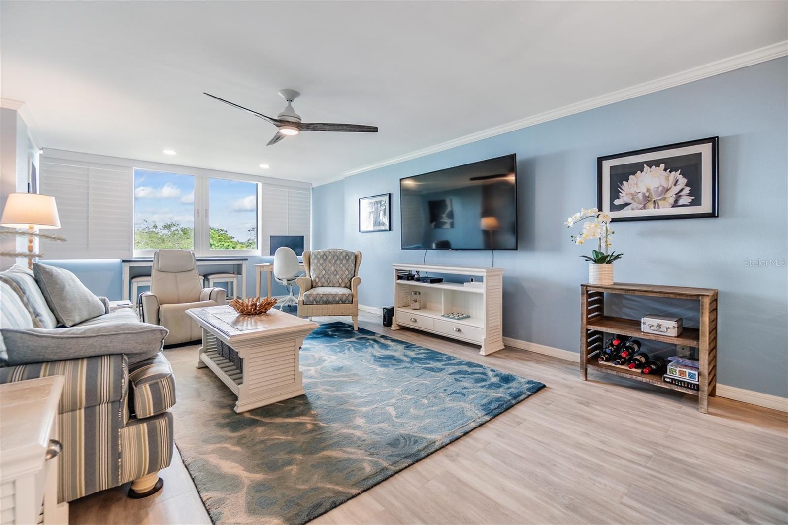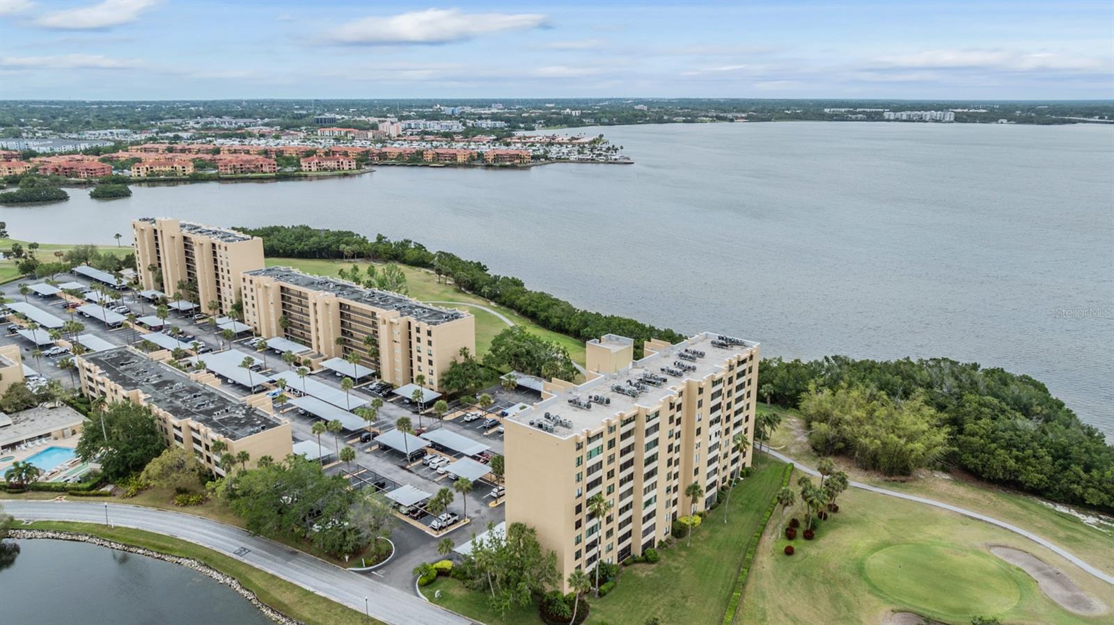 Step into this beautifully renovated 2-bedroom, 2-bath condo and prepare to be wowed—every detail has been updated with style and sophistication in mind. Nestled in the sought-after Cove Cay community, this gem offers sweeping views of the sparkling waters of Tampa Bay and the lush, manicured 16th green of the golf course. Dolphins playing alongside golfers is quite a treat to behold. It’s the best of both worlds, and it’s all yours. The heart of the home is a show-stopping open kitchen with sleek pale gray cabinetry, a dramatic raised ceiling with crown molding and color-changing, remote-controlled lighting (yes, really), and a spacious quartz serving bar perfect for entertaining. The cool glass tile backsplash adds just the right pop of personality, and the 2024 stainless steel bottom-freezer fridge makes this space as functional as it is fabulous. Your eyes will pop at the beautiful and dramatic tile flooring in this area, completing the perfect kitchen area. Throughout the main living areas, upgraded Pergo flooring flows seamlessly, complemented by fresh, on-trend paint colors and detailed crown molding. Every room feels crisp, modern, and move-in ready and there is no pesky popcorn in any main room. There is a room-width hurricane sliding window in the living room and also an updated window in the master bedroom. All windows are complemented with gorgeous Plantation shutters, allowing you to adjust the light as you please. Other great features include a newer water heater, covered parking to protect your vehicle, and a full size laundry room with washer and dryer(for your use only) across the hall from the front door. Whether you're enjoying your morning coffee with bay breezes or watching the sunset over the fairway, you'll love calling this place home. Beautifully furnished for seller's convenience and yours!! This is the one you are looking for. Welcome to easy Florida living with all the upgrades—and all the views. Cove Cay is located on the shores of Tampa Bay with golf and water views all around. The 24 hour guard, lovely recreation area with pool table, fitness room, heated pool and spa in your village, golf course with restaurant open 7 days a week and an available marina (golf, dining and marina not included in condo fees) without going out of the gate and more make this the Paradise Found that you have been looking for.