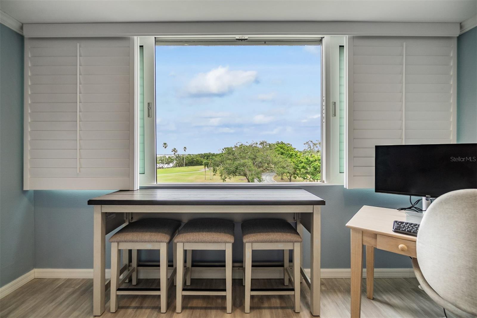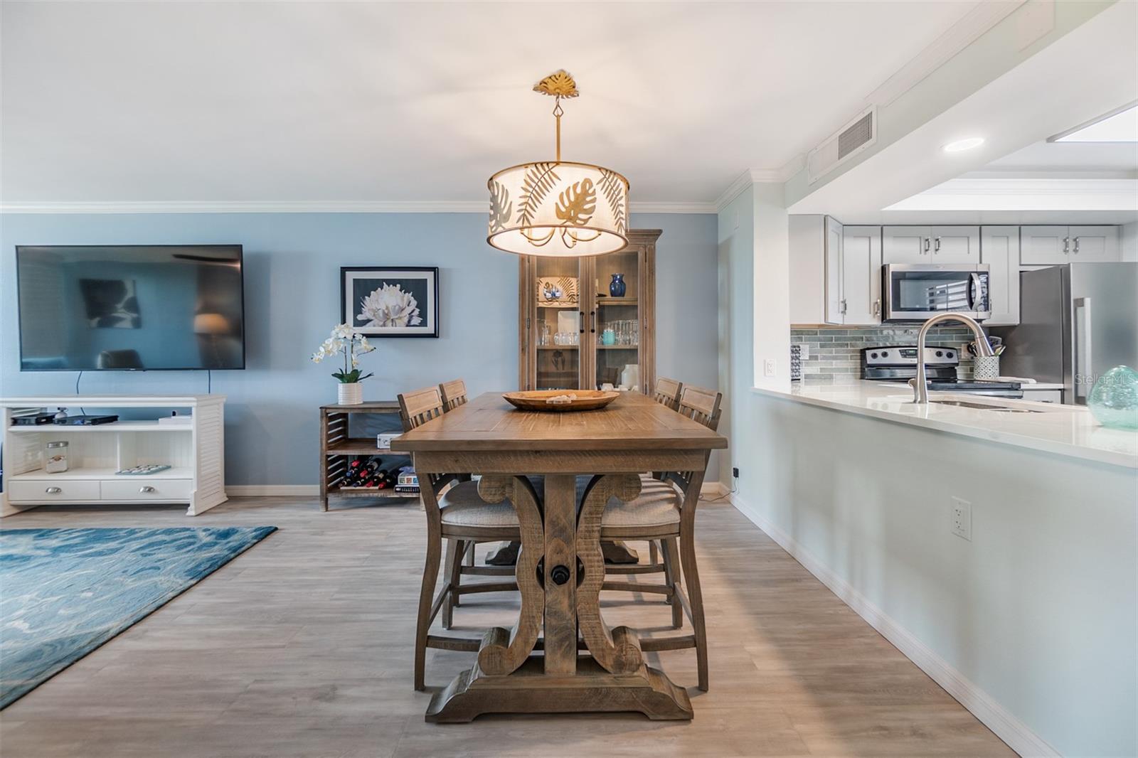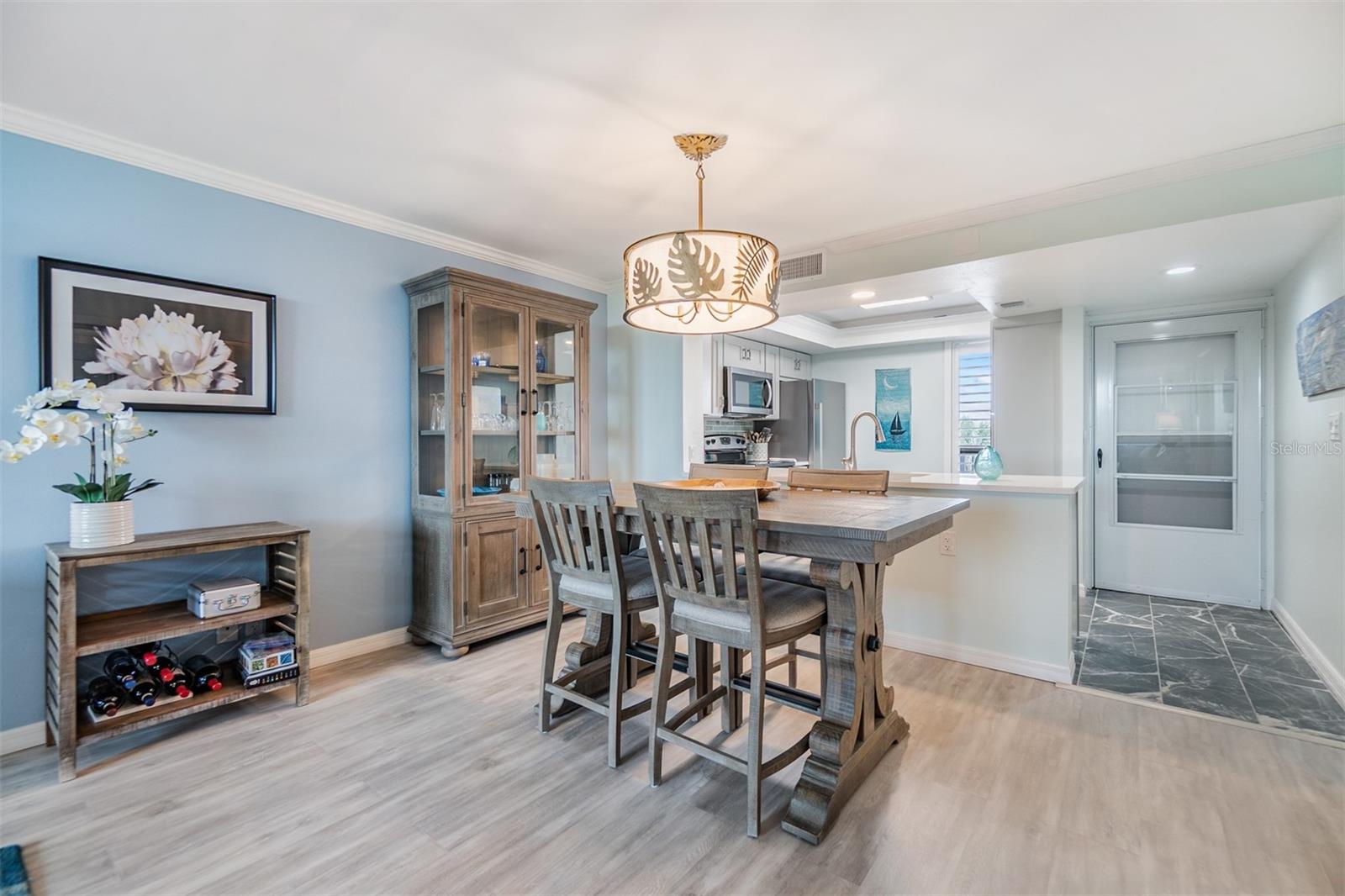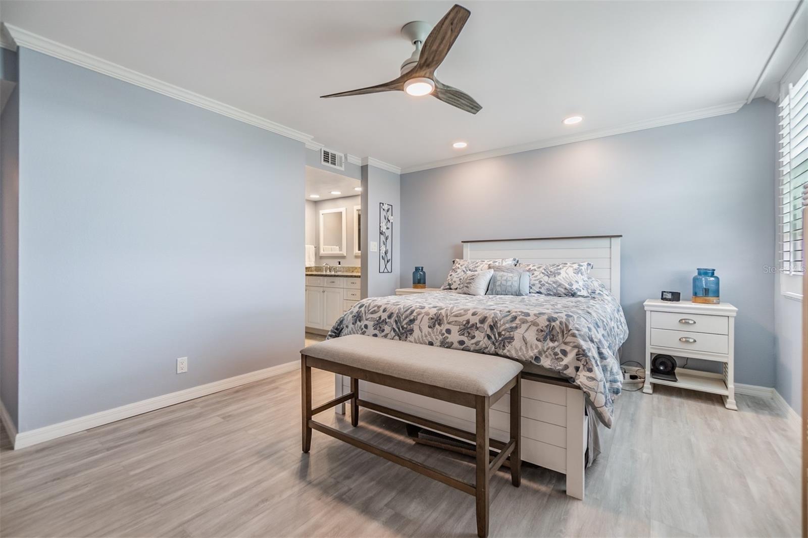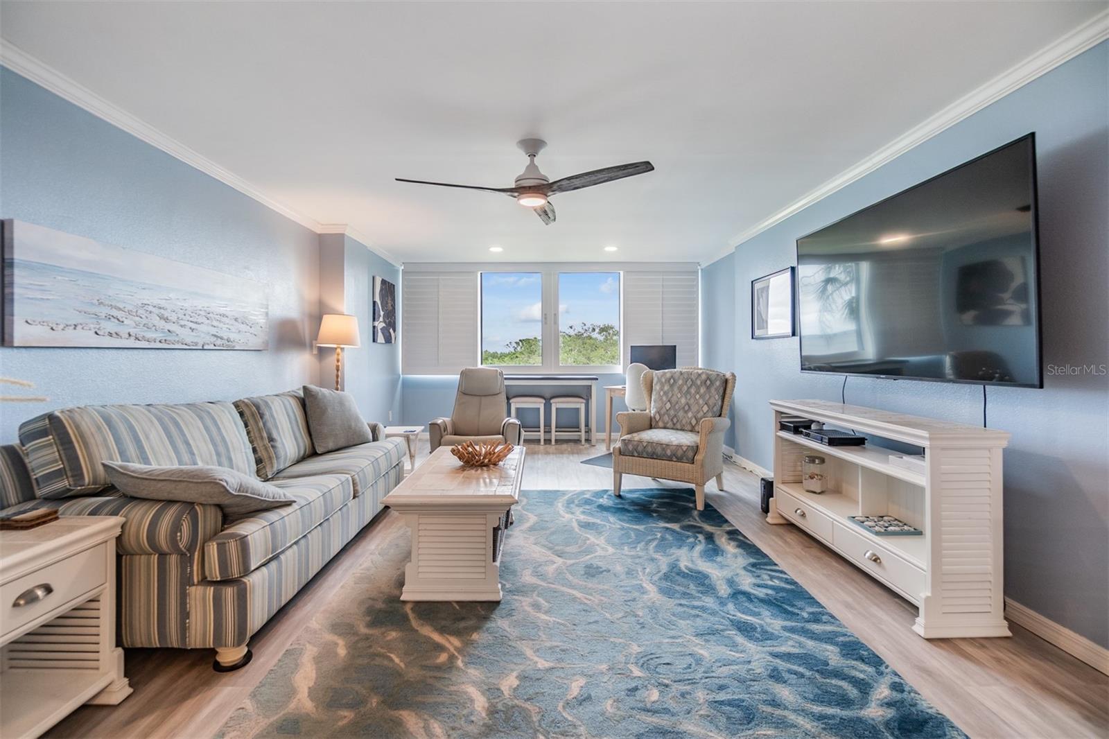 Step into this beautifully renovated 2-bedroom, 2-bath condo and prepare to be wowed—every detail has been updated with style and sophistication in mind. Nestled in the sought-after Cove Cay community, this gem offers sweeping views of the sparkling waters of Tampa Bay and the lush, manicured 16th green of the golf course. Dolphins playing alongside golfers is quite a treat to behold. It’s the best of both worlds, and it’s all yours. The heart of the home is a show-stopping open kitchen with sleek pale gray cabinetry, a dramatic raised ceiling with crown molding and color-changing, remote-controlled lighting (yes, really), and a spacious quartz serving bar perfect for entertaining. The cool glass tile backsplash adds just the right pop of personality, and the 2024 stainless steel bottom-freezer fridge makes this space as functional as it is fabulous. Your eyes will pop at the beautiful and dramatic tile flooring in this area, completing the perfect kitchen area. Throughout the main living areas, upgraded Pergo flooring flows seamlessly, complemented by fresh, on-trend paint colors and detailed crown molding. Every room feels crisp, modern, and move-in ready and there is no pesky popcorn in any main room. There is a room-width hurricane sliding window in the living room and also an updated window in the master bedroom. All windows are complemented with gorgeous Plantation shutters, allowing you to adjust the light as you please. Other great features include a newer water heater, covered parking to protect your vehicle, and a full size laundry room with washer and dryer(for your use only) across the hall from the front door. Whether you're enjoying your morning coffee with bay breezes or watching the sunset over the fairway, you'll love calling this place home. Beautifully furnished for seller's convenience and yours!! This is the one you are looking for. Welcome to easy Florida living with all the upgrades—and all the views. Cove Cay is located on the shores of Tampa Bay with golf and water views all around. The 24 hour guard, lovely recreation area with pool table, fitness room, heated pool and spa in your village, golf course with restaurant open 7 days a week and an available marina (golf, dining and marina not included in condo fees) without going out of the gate and more make this the Paradise Found that you have been looking for.