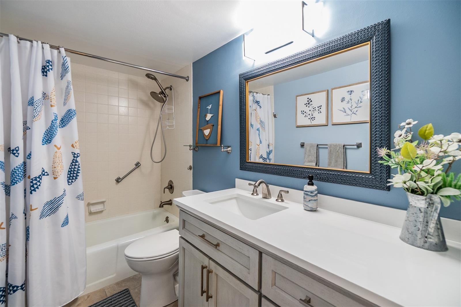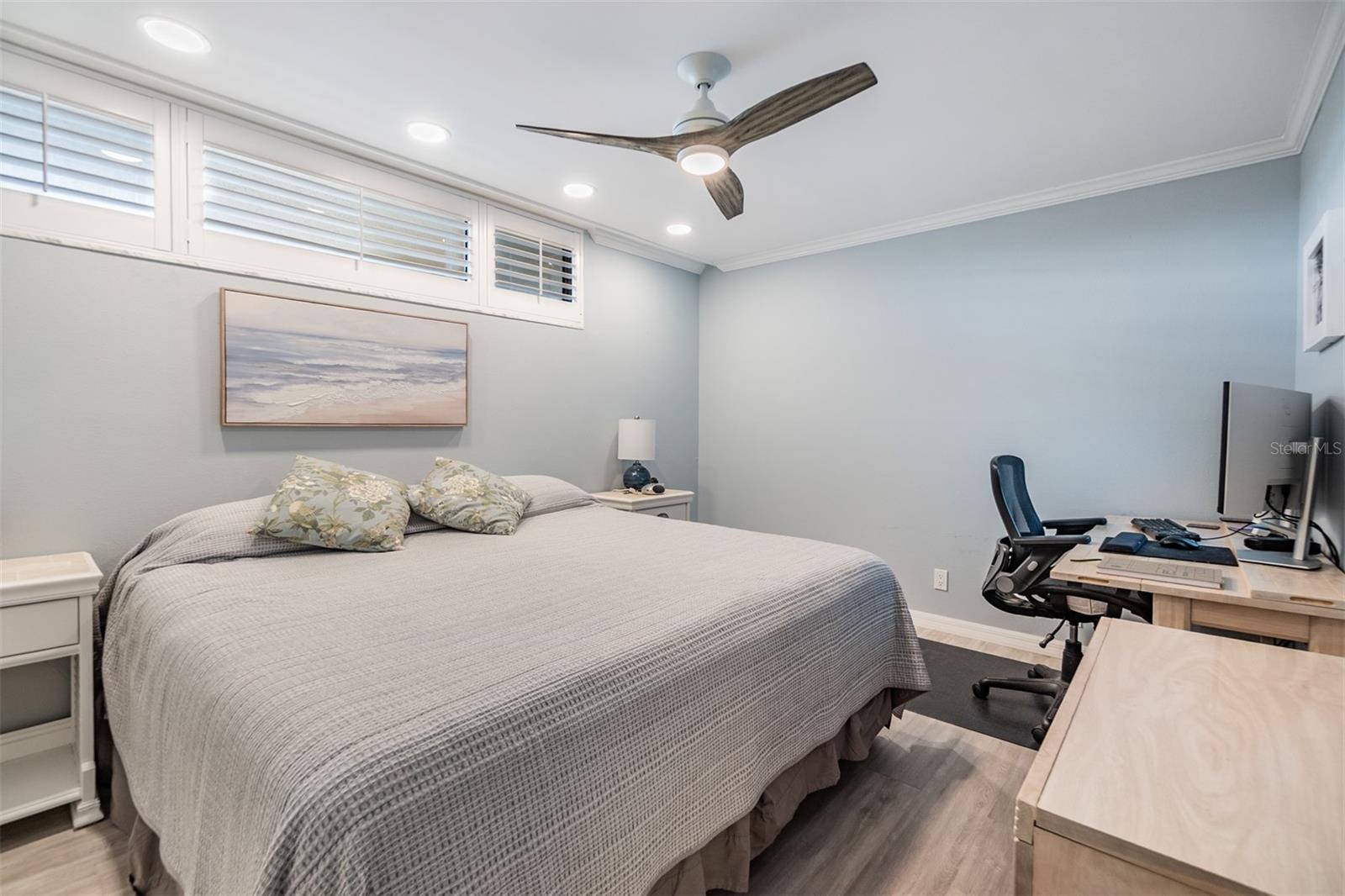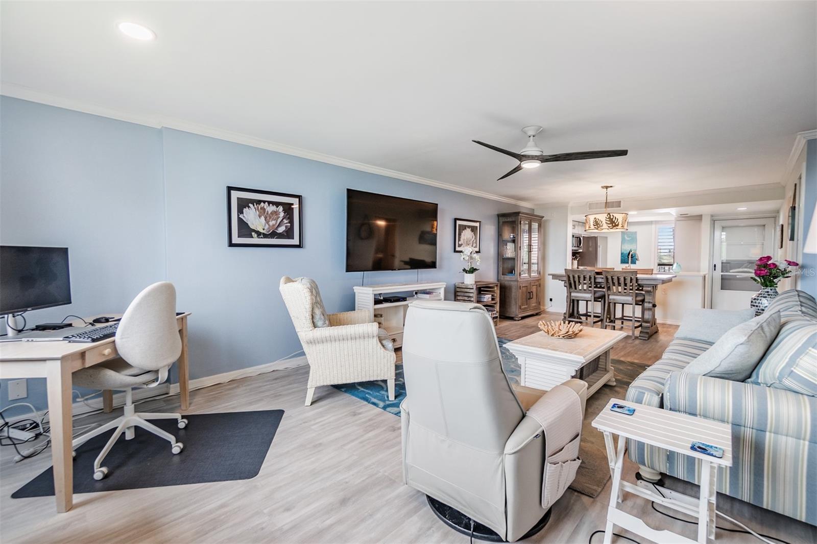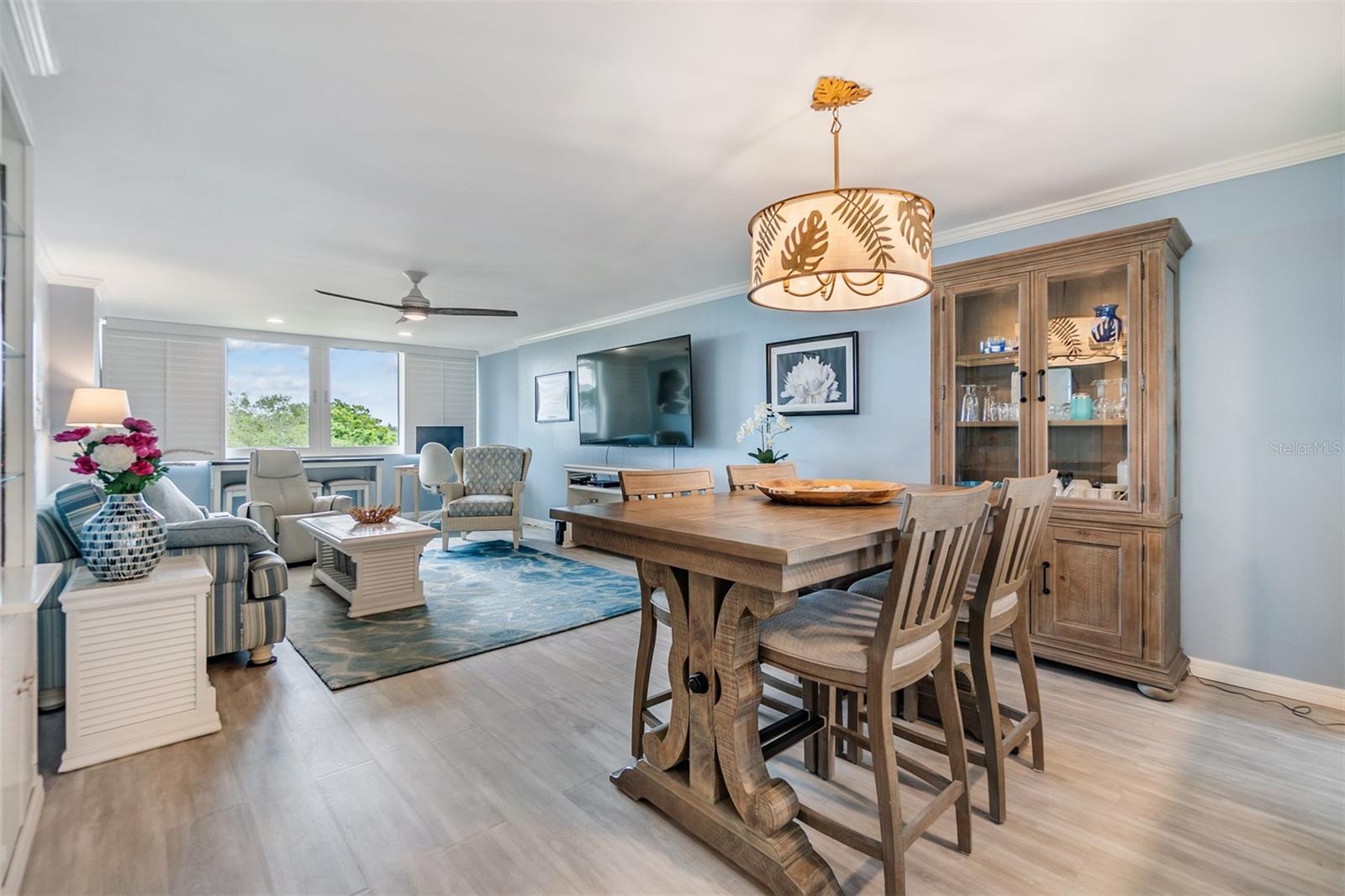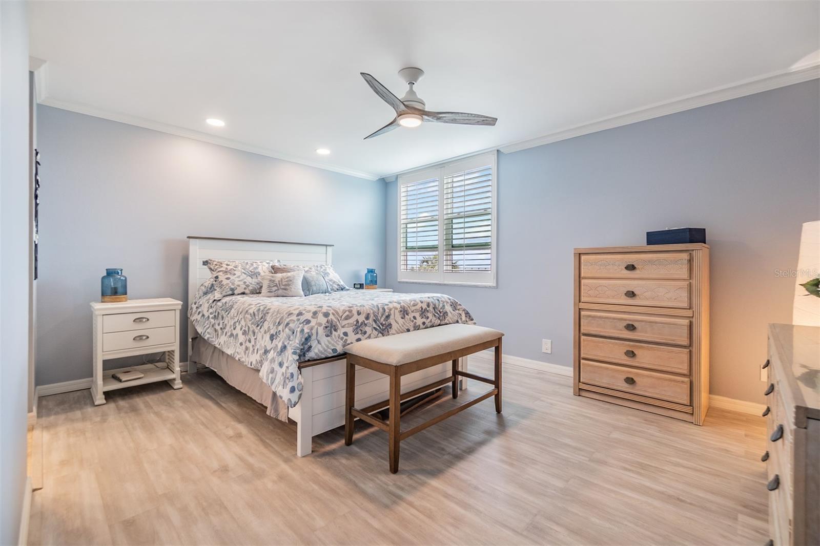 Step into this beautifully renovated 2-bedroom, 2-bath condo and prepare to be wowed—every detail has been updated with style and sophistication in mind. Nestled in the sought-after Cove Cay community, this gem offers sweeping views of the sparkling waters of Tampa Bay and the lush, manicured 16th green of the golf course. Dolphins playing alongside golfers is quite a treat to behold. It’s the best of both worlds, and it’s all yours. The heart of the home is a show-stopping open kitchen with sleek pale gray cabinetry, a dramatic raised ceiling with crown molding and color-changing, remote-controlled lighting (yes, really), and a spacious quartz serving bar perfect for entertaining. The cool glass tile backsplash adds just the right pop of personality, and the 2024 stainless steel bottom-freezer fridge makes this space as functional as it is fabulous. Your eyes will pop at the beautiful and dramatic tile flooring in this area, completing the perfect kitchen area. Throughout the main living areas, upgraded Pergo flooring flows seamlessly, complemented by fresh, on-trend paint colors and detailed crown molding. Every room feels crisp, modern, and move-in ready and there is no pesky popcorn in any main room. There is a room-width hurricane sliding window in the living room and also an updated window in the master bedroom. All windows are complemented with gorgeous Plantation shutters, allowing you to adjust the light as you please. Other great features include a newer water heater, covered parking to protect your vehicle, and a full size laundry room with washer and dryer(for your use only) across the hall from the front door. Whether you're enjoying your morning coffee with bay breezes or watching the sunset over the fairway, you'll love calling this place home. Beautifully furnished for seller's convenience and yours!! This is the one you are looking for. Welcome to easy Florida living with all the upgrades—and all the views. Cove Cay is located on the shores of Tampa Bay with golf and water views all around. The 24 hour guard, lovely recreation area with pool table, fitness room, heated pool and spa in your village, golf course with restaurant open 7 days a week and an available marina (golf, dining and marina not included in condo fees) without going out of the gate and more make this the Paradise Found that you have been looking for.