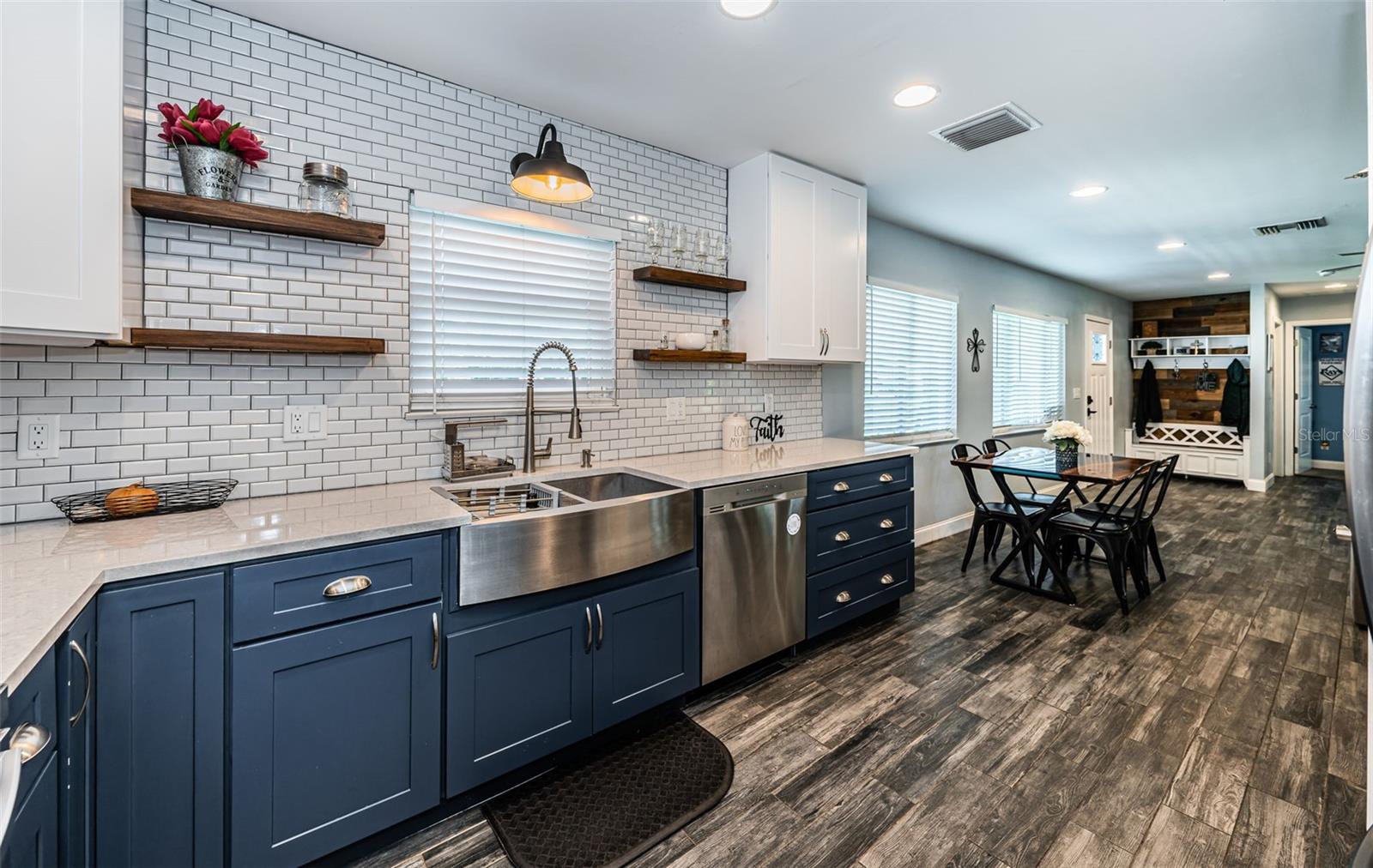 Built in 2021, this modern coastal gem in unincorporated Clearwater perfectly combines luxury, comfort, and timeless Florida charm. Completely rebuilt from top to bottom, this 3-bedroom, 2-bathroom home offers the flexibility of short-term rentals (Airbnb or VRBO permitted), making it ideal for homeowners or investors seeking a move-in-ready property in one of Pinellas County’s most desirable areas. Step inside to an open-concept floor plan filled with natural light and wood-look ceramic tile flooring throughout the main living areas. The chef’s kitchen is a showstopper with stainless steel appliances, quartz countertops, elegant 40-inch white upper cabinets, bold blue lower cabinets, a stylish backsplash, and a large farmhouse sink that blends design and function. A built-in work nook provides the perfect space for remote work or homework. The spacious owner’s suite offers a relaxing retreat, complete with a large walk-in closet featuring a built-in organization system and a spa-inspired ensuite bathroom. Enjoy a rainfall shower with dual shower heads, river rock flooring, a built-in bench, and double vanities topped with quartz counters and striking teal and black tile work. The second and third bedrooms are generously sized, ideal for guests, children, or a home office. Through French doors, step out to a covered lanai with a ceiling fan and TV hookup—perfect for entertaining or quiet evenings outdoors. The oversized lot with side access to the backyard provides plenty of room for a play area, or even boat and RV parking. A detached man cave or she shed offers extra space for hobbies, a workshop, or storage. Additional highlights include an indoor laundry room, a tankless water heater, hurricane straps on the roof, and a charming front porch with an electrical outlet—perfect for morning coffee or evening chats. Located in a no flood and no evacuation zone, this home is minutes from Clearwater Beach, Downtown Dunedin, Tampa International Airport, shopping, dining, and several spring training baseball stadiums. Everything is brand new from 2021, offering peace of mind and modern efficiency. Whether you’re searching for your dream home, a profitable short-term rental, or a seasonal escape, this Clearwater boat and RV friendly neighborhood offers the ultimate Florida lifestyle with every modern upgrade. Schedule your private showing today and experience the beauty, comfort, and opportunity this home provides.