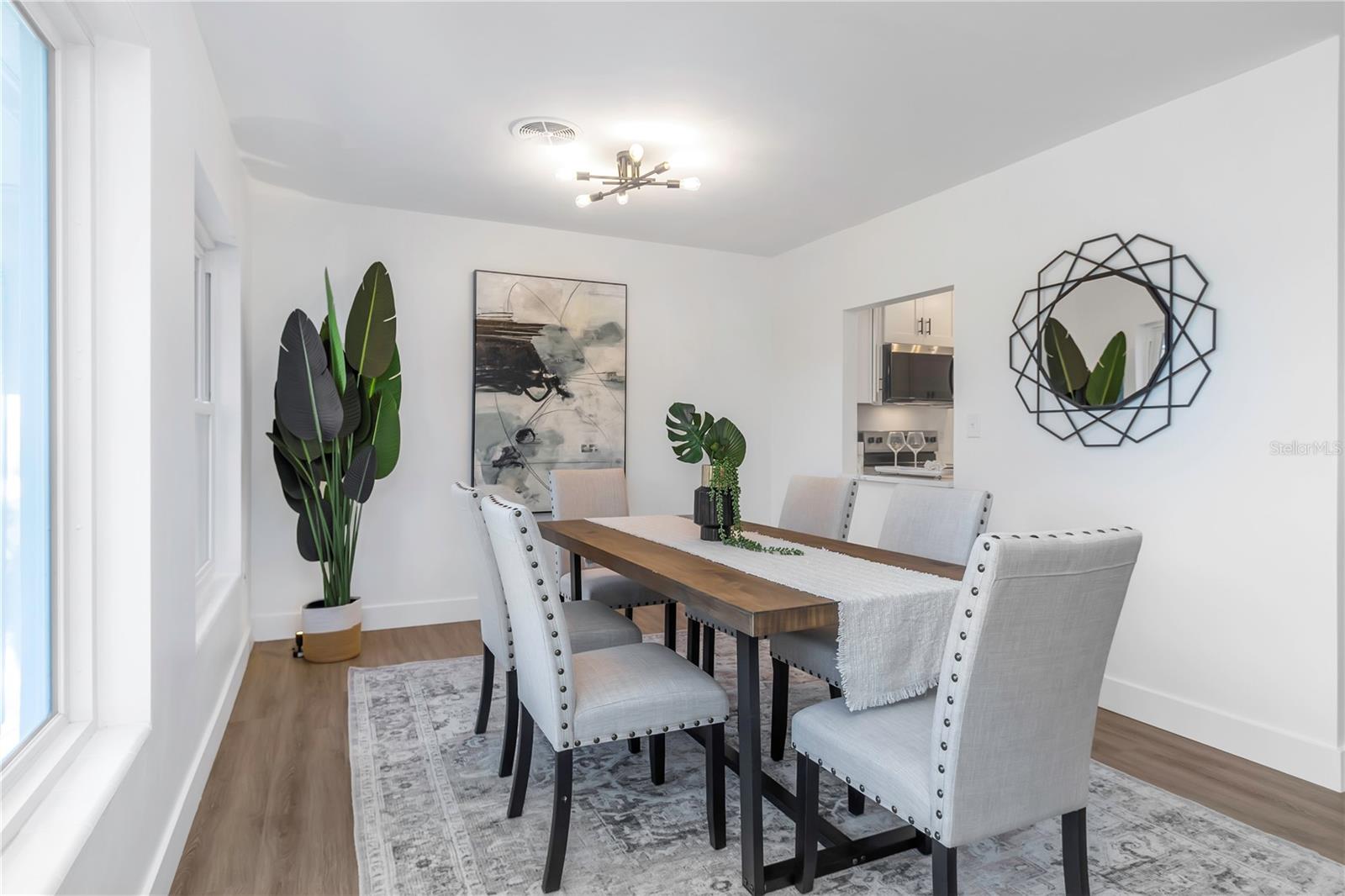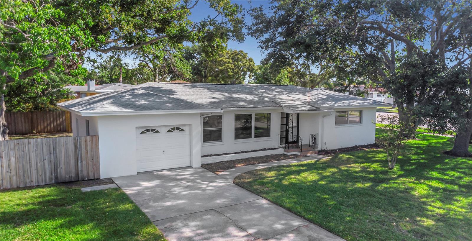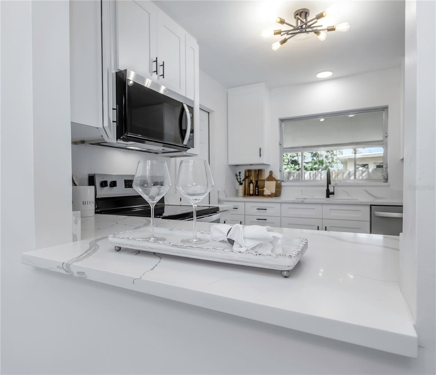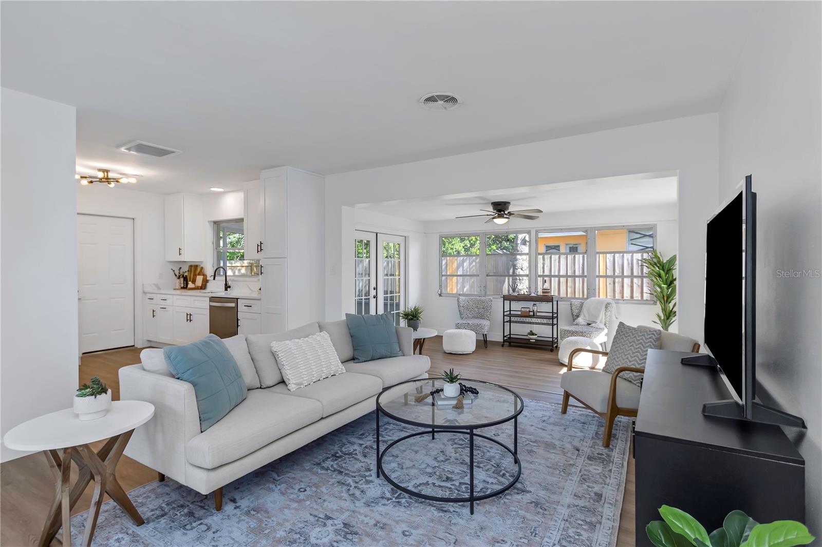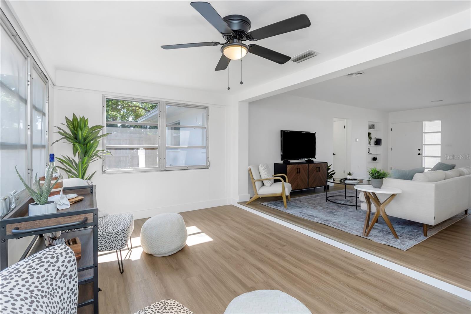 Nestled in the sought-after Keene Acres neighborhood of Clearwater, this beautifully renovated 2-bedroom, 2.5-bath residence is the perfect blend of modern design and everyday comfort. From the moment you walk through the front door, you'll be greeted by abundant natural light, freshly painted interiors, and an airy, open-concept layout that makes this home feel bright and inviting. The home features brand-new luxury vinyl plank flooring and elegant new baseboards, setting a clean and contemporary tone throughout. The reimagined kitchen is a true centerpiece—equipped with brand-new stainless steel appliances, stylish quartz countertops, and all-new cabinetry. A charming wall cutout opens the kitchen to the dining area, making serving and entertaining effortless. Whether hosting friends or enjoying a quiet night in, this home offers multiple spaces to relax and unwind. The formal dining area flows seamlessly into the spacious living room, sunroom, and a screened-in porch, creating an ideal layout for indoor-outdoor Florida living. Located on the east wing of the home are two comfortable bedrooms. One includes its own private half-bath, while a full bathroom with new vanity is located in the hallway. For added convenience, a second full bathroom is tucked away in a private room within the single-car garage—perfect for use as a workshop washroom. With thoughtful updates throughout and a prime location (high and dry flood zone X) close to parks, shops, and just minutes from Clearwater’s stunning beaches, this move-in ready home is truly a gem. Don’t miss your opportunity to experience the charm and comfort of Keene Acres living! Highlights include: complete interior and exterior paint (2025), new baseboards (2025), luxury vinyl plank floor throughout (2025), new kitchen cabinetry and countertops (2025), new stainless kitchen appliances (2025), all new door hardware, fans and light fixtures (2025), new front storm door (2025), roof (2022), HVAC (2021).