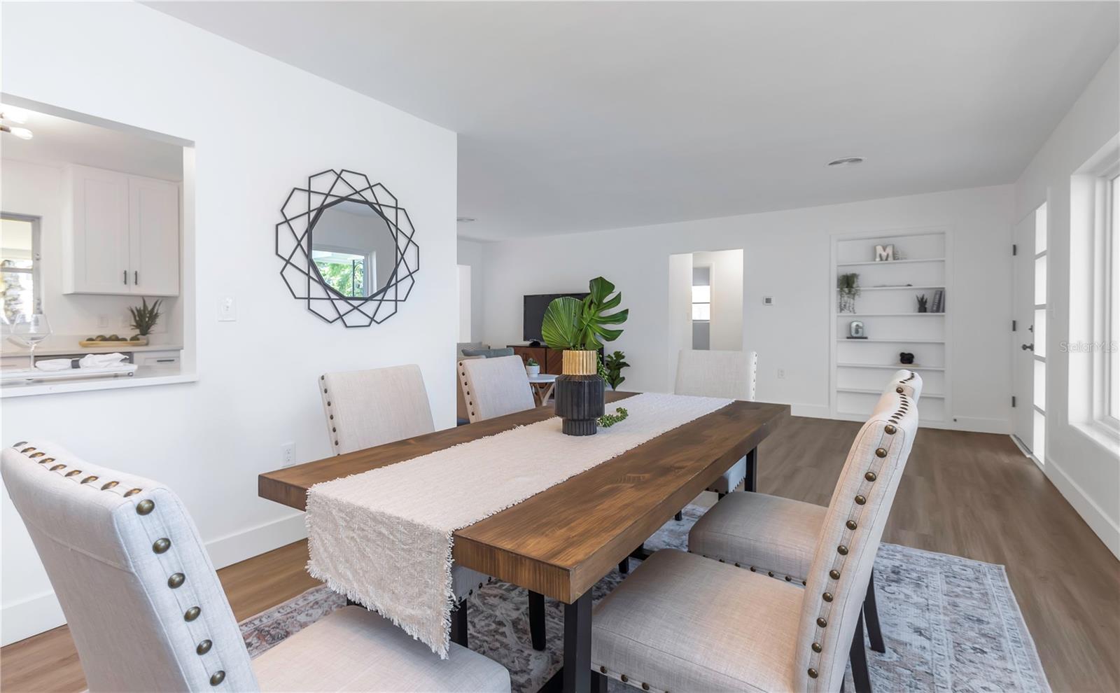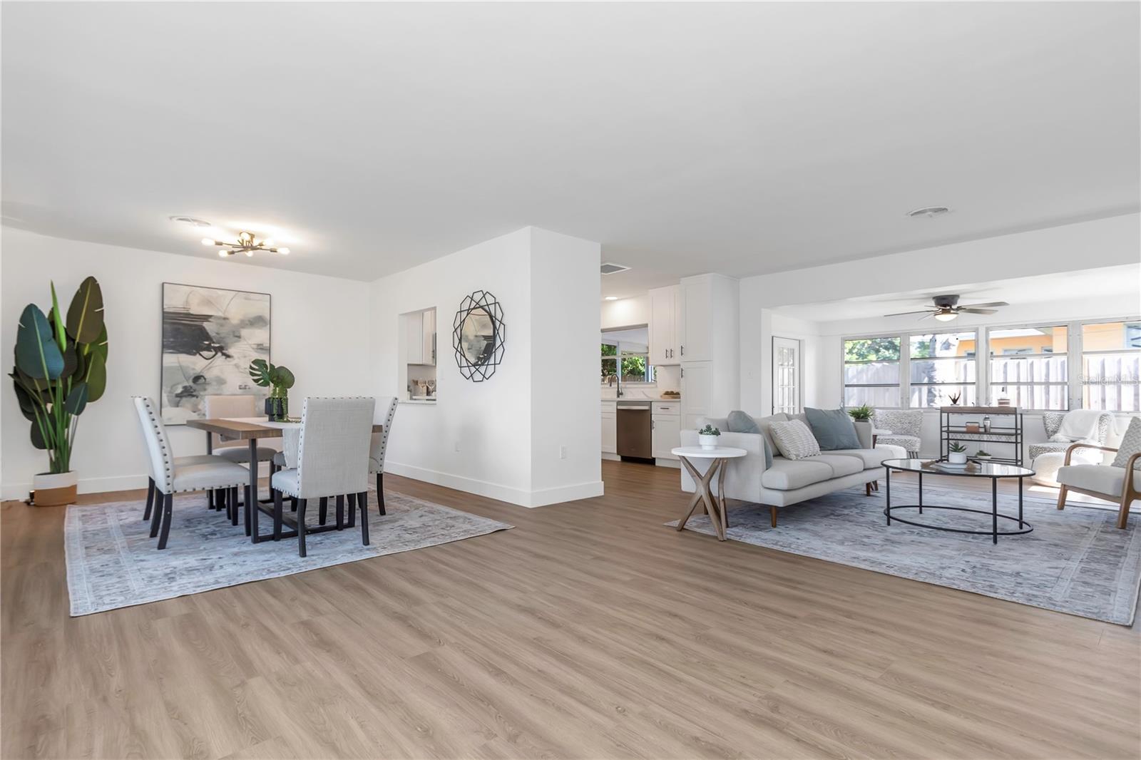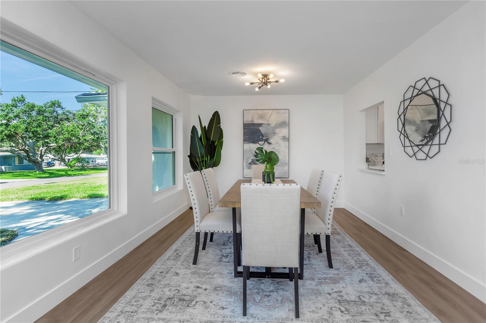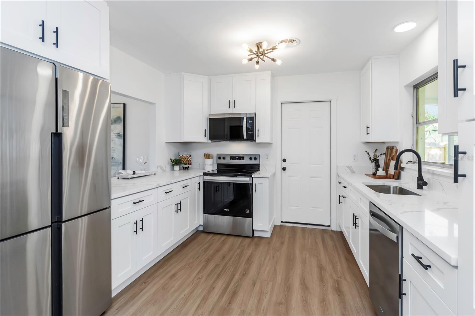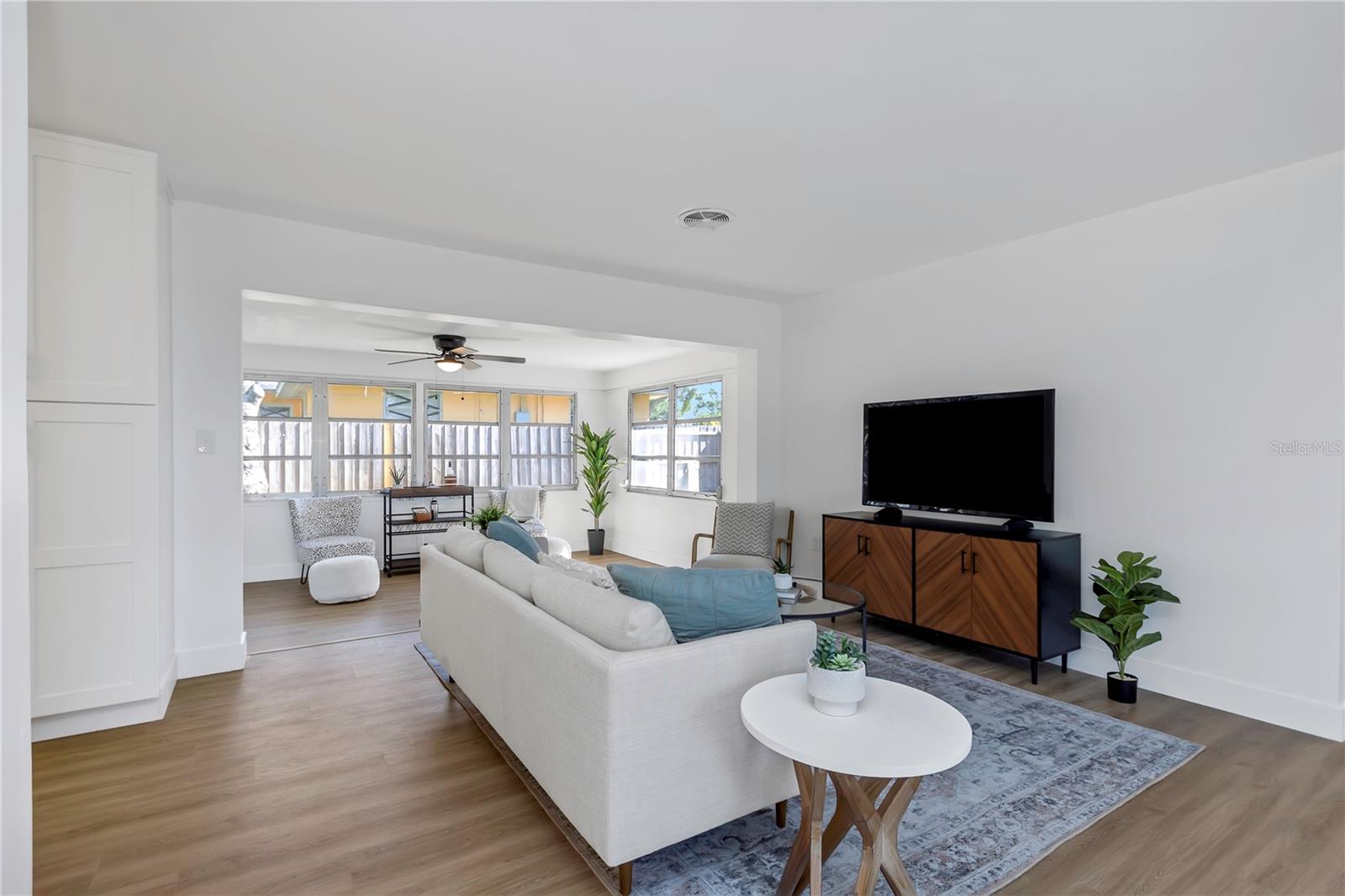 Nestled in the sought-after Keene Acres neighborhood of Clearwater, this beautifully renovated 2-bedroom, 2.5-bath residence is the perfect blend of modern design and everyday comfort. From the moment you walk through the front door, you'll be greeted by abundant natural light, freshly painted interiors, and an airy, open-concept layout that makes this home feel bright and inviting. The home features brand-new luxury vinyl plank flooring and elegant new baseboards, setting a clean and contemporary tone throughout. The reimagined kitchen is a true centerpiece—equipped with brand-new stainless steel appliances, stylish quartz countertops, and all-new cabinetry. A charming wall cutout opens the kitchen to the dining area, making serving and entertaining effortless. Whether hosting friends or enjoying a quiet night in, this home offers multiple spaces to relax and unwind. The formal dining area flows seamlessly into the spacious living room, sunroom, and a screened-in porch, creating an ideal layout for indoor-outdoor Florida living. Located on the east wing of the home are two comfortable bedrooms. One includes its own private half-bath, while a full bathroom with new vanity is located in the hallway. For added convenience, a second full bathroom is tucked away in a private room within the single-car garage—perfect for use as a workshop washroom. With thoughtful updates throughout and a prime location (high and dry flood zone X) close to parks, shops, and just minutes from Clearwater’s stunning beaches, this move-in ready home is truly a gem. Don’t miss your opportunity to experience the charm and comfort of Keene Acres living! Highlights include: complete interior and exterior paint (2025), new baseboards (2025), luxury vinyl plank floor throughout (2025), new kitchen cabinetry and countertops (2025), new stainless kitchen appliances (2025), all new door hardware, fans and light fixtures (2025), new front storm door (2025), roof (2022), HVAC (2021).