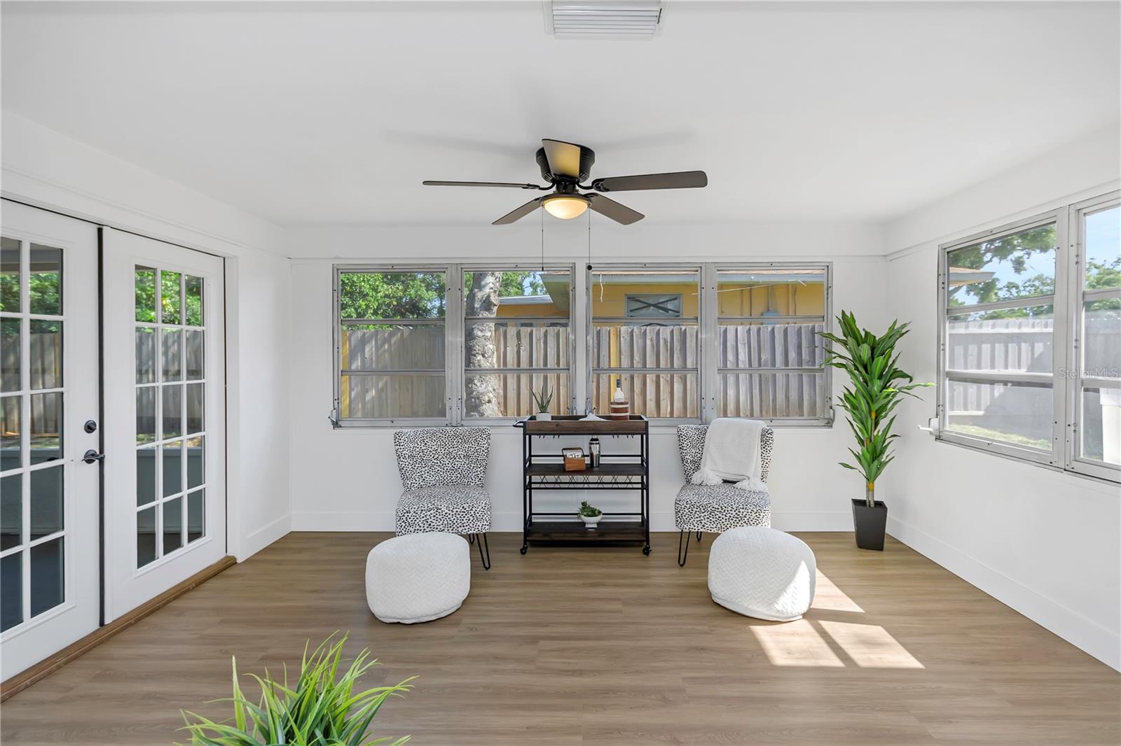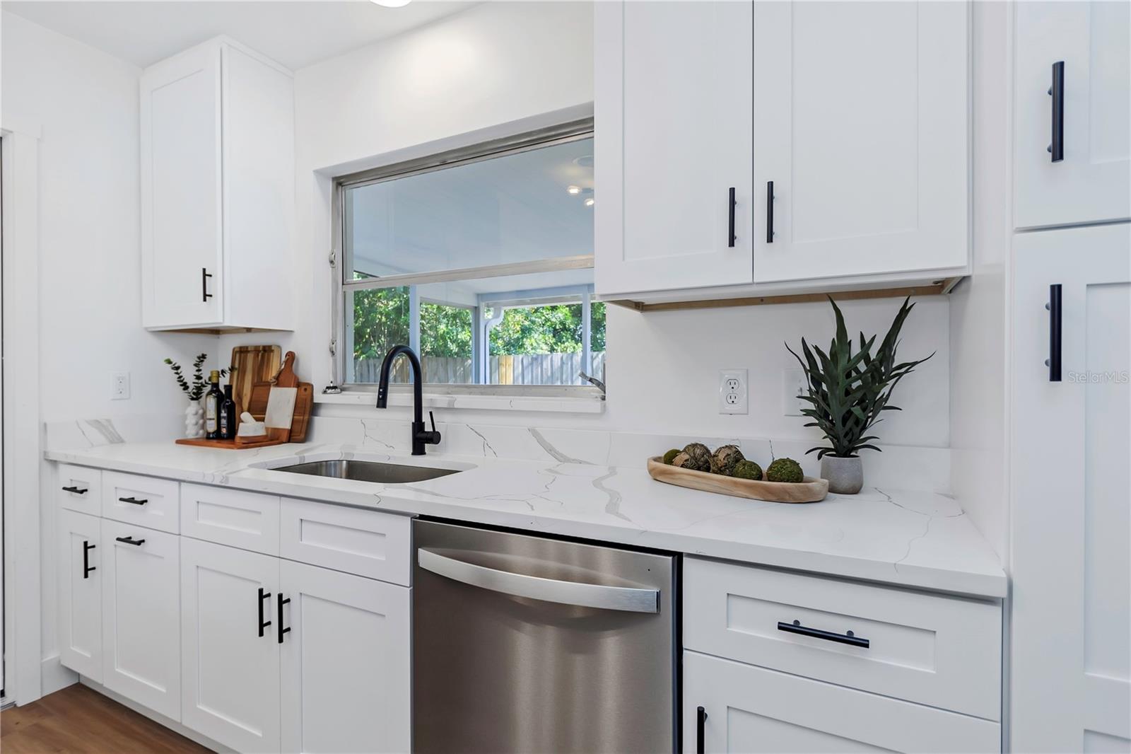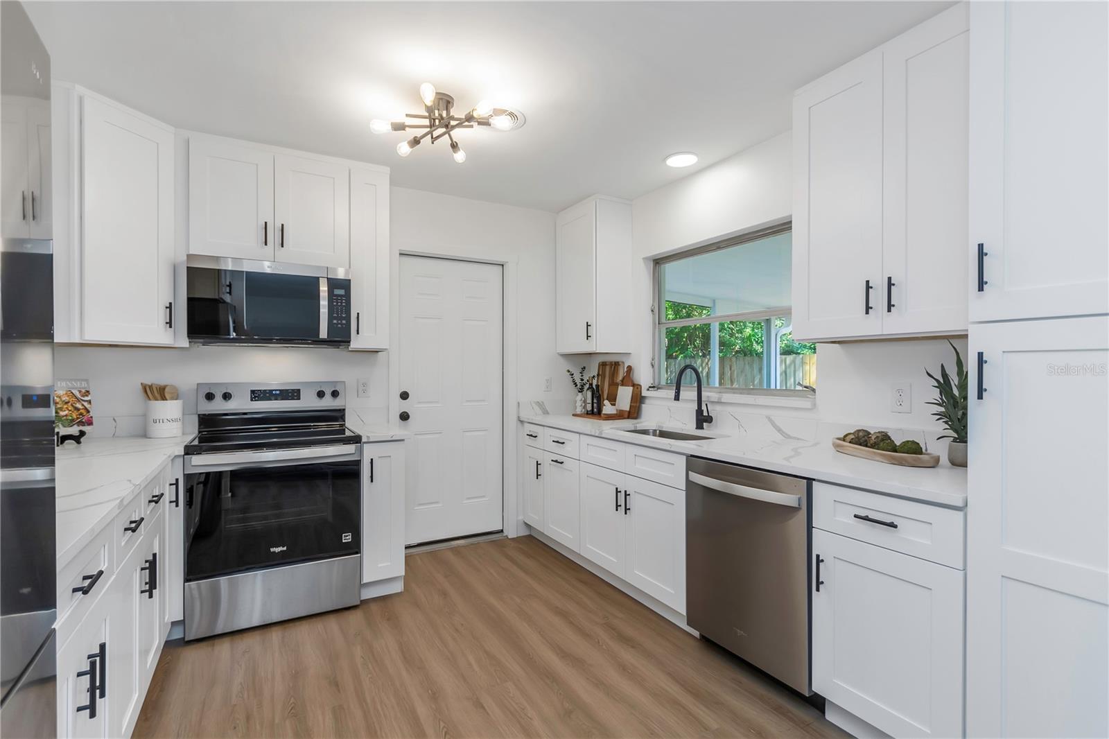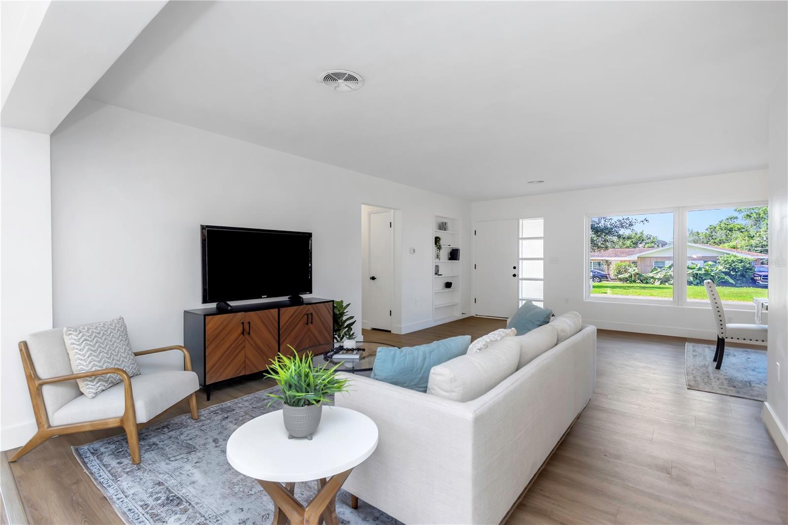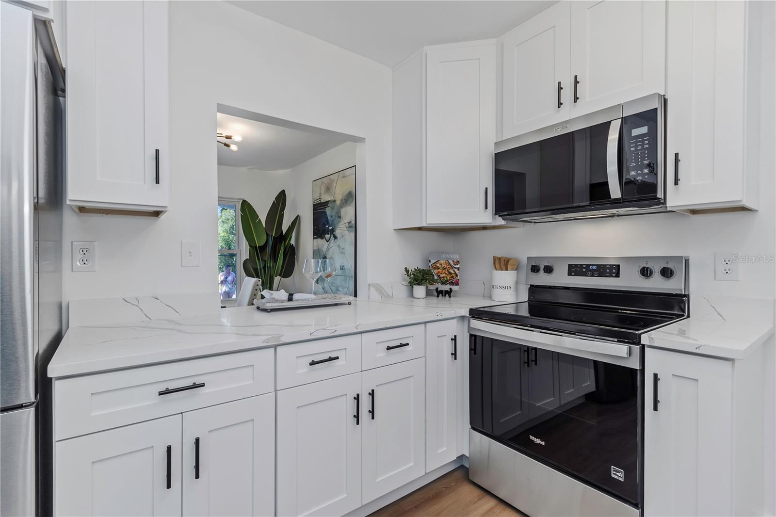 Nestled in the sought-after Keene Acres neighborhood of Clearwater, this beautifully renovated 2-bedroom, 2.5-bath residence is the perfect blend of modern design and everyday comfort. From the moment you walk through the front door, you'll be greeted by abundant natural light, freshly painted interiors, and an airy, open-concept layout that makes this home feel bright and inviting. The home features brand-new luxury vinyl plank flooring and elegant new baseboards, setting a clean and contemporary tone throughout. The reimagined kitchen is a true centerpiece—equipped with brand-new stainless steel appliances, stylish quartz countertops, and all-new cabinetry. A charming wall cutout opens the kitchen to the dining area, making serving and entertaining effortless. Whether hosting friends or enjoying a quiet night in, this home offers multiple spaces to relax and unwind. The formal dining area flows seamlessly into the spacious living room, sunroom, and a screened-in porch, creating an ideal layout for indoor-outdoor Florida living. Located on the east wing of the home are two comfortable bedrooms. One includes its own private half-bath, while a full bathroom with new vanity is located in the hallway. For added convenience, a second full bathroom is tucked away in a private room within the single-car garage—perfect for use as a workshop washroom. With thoughtful updates throughout and a prime location (high and dry flood zone X) close to parks, shops, and just minutes from Clearwater’s stunning beaches, this move-in ready home is truly a gem. Don’t miss your opportunity to experience the charm and comfort of Keene Acres living! Highlights include: complete interior and exterior paint (2025), new baseboards (2025), luxury vinyl plank floor throughout (2025), new kitchen cabinetry and countertops (2025), new stainless kitchen appliances (2025), all new door hardware, fans and light fixtures (2025), new front storm door (2025), roof (2022), HVAC (2021).
