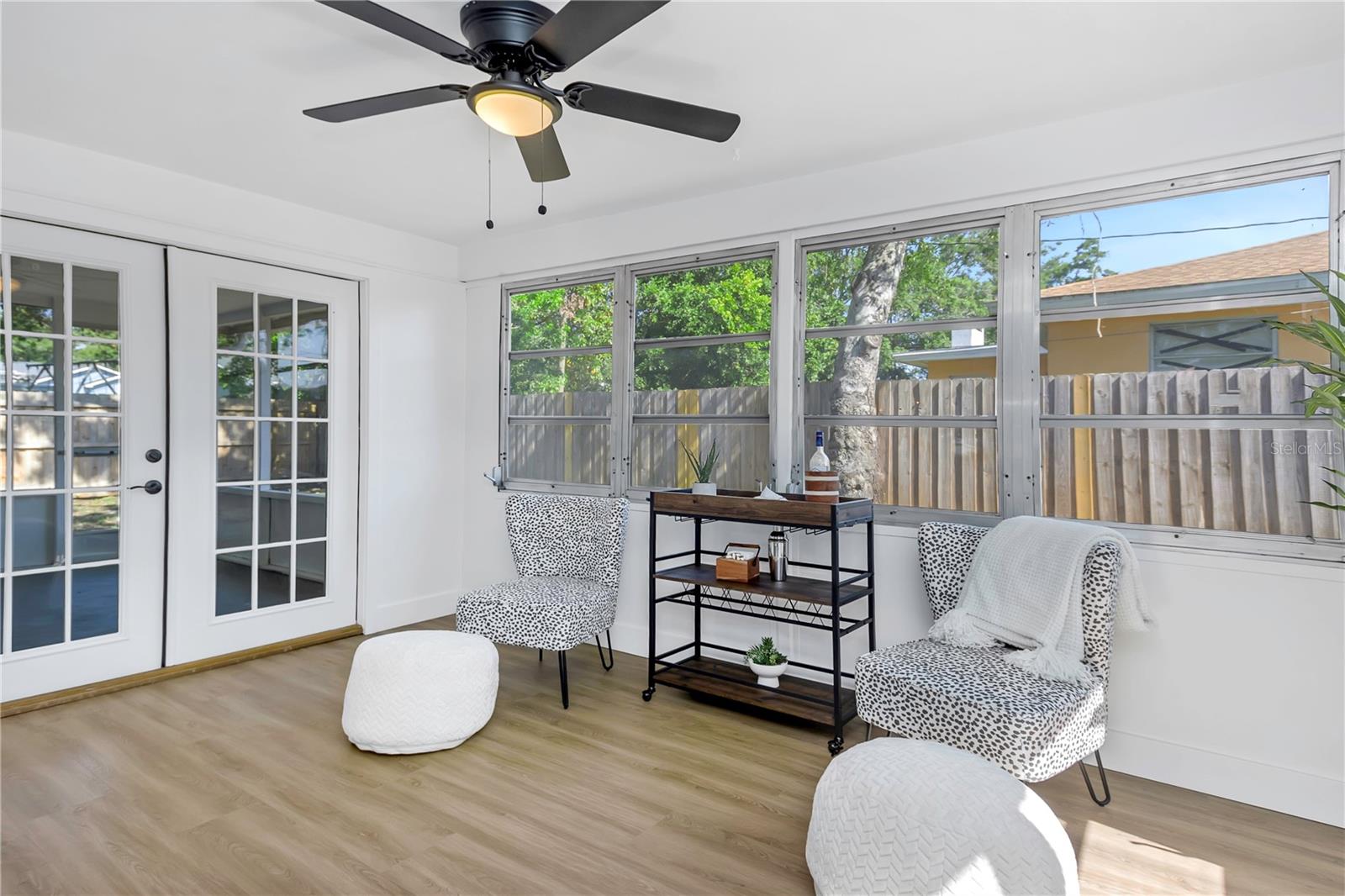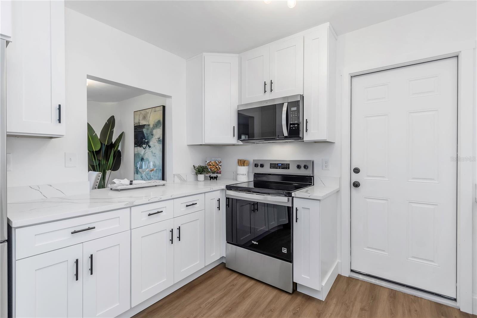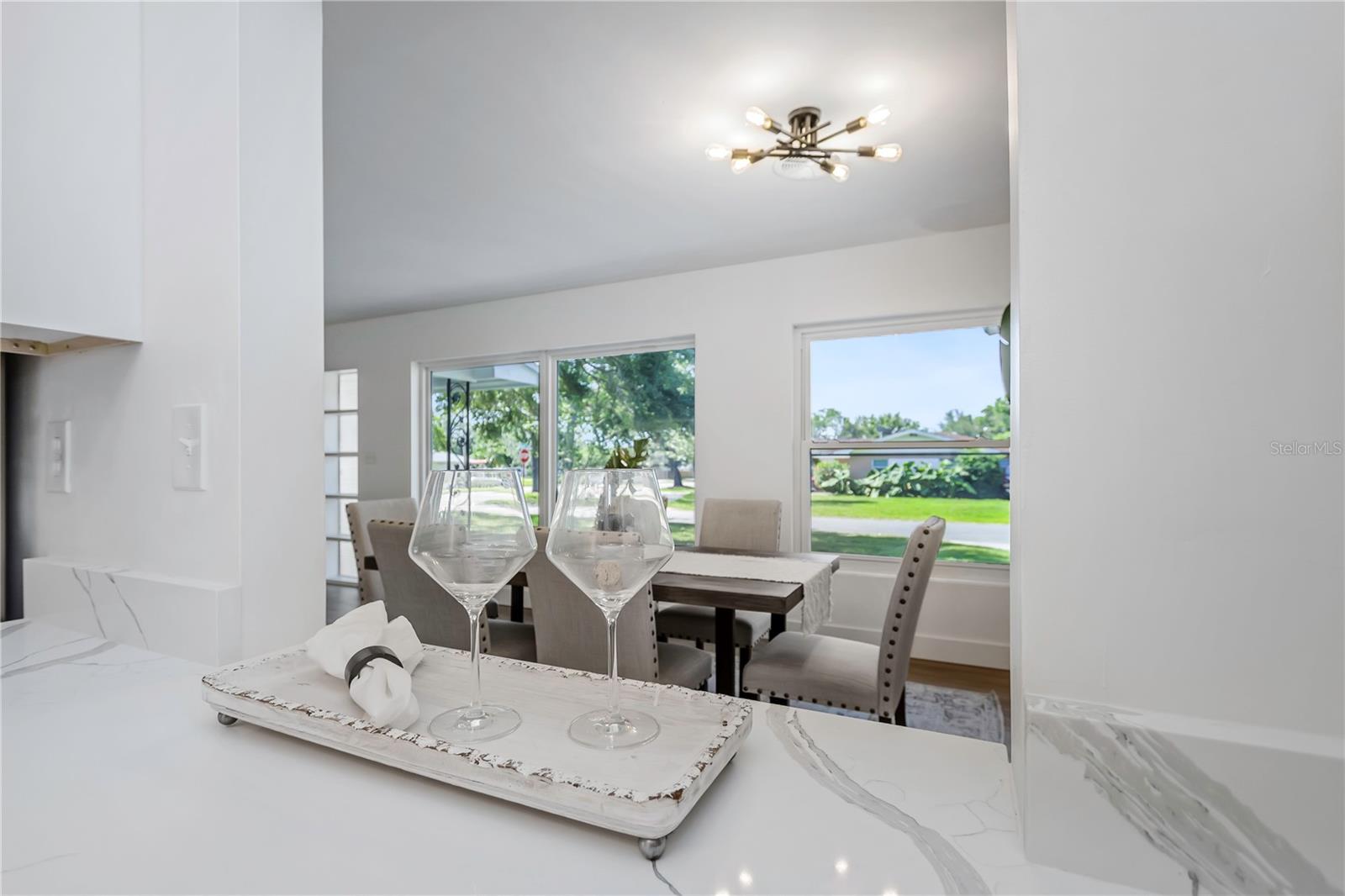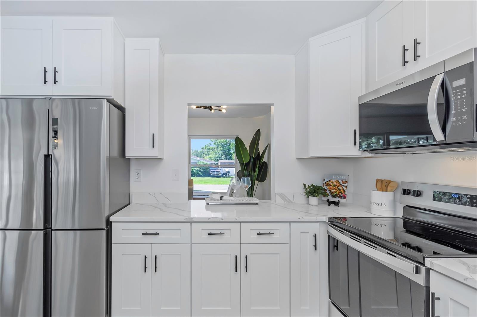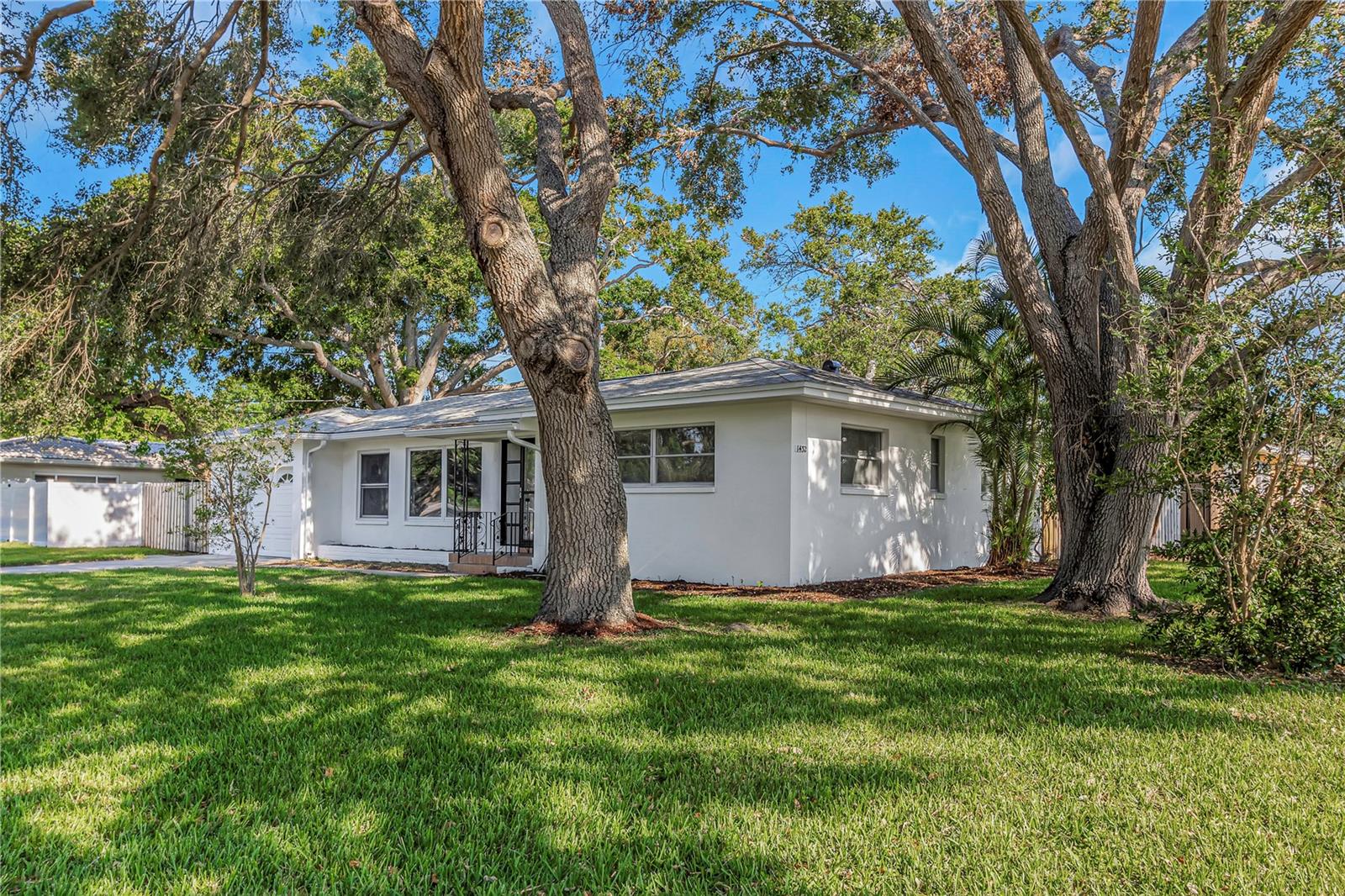 Nestled in the sought-after Keene Acres neighborhood of Clearwater, this beautifully renovated 2-bedroom, 2.5-bath residence is the perfect blend of modern design and everyday comfort. From the moment you walk through the front door, you'll be greeted by abundant natural light, freshly painted interiors, and an airy, open-concept layout that makes this home feel bright and inviting. The home features brand-new luxury vinyl plank flooring and elegant new baseboards, setting a clean and contemporary tone throughout. The reimagined kitchen is a true centerpiece—equipped with brand-new stainless steel appliances, stylish quartz countertops, and all-new cabinetry. A charming wall cutout opens the kitchen to the dining area, making serving and entertaining effortless. Whether hosting friends or enjoying a quiet night in, this home offers multiple spaces to relax and unwind. The formal dining area flows seamlessly into the spacious living room, sunroom, and a screened-in porch, creating an ideal layout for indoor-outdoor Florida living. Located on the east wing of the home are two comfortable bedrooms. One includes its own private half-bath, while a full bathroom with new vanity is located in the hallway. For added convenience, a second full bathroom is tucked away in a private room within the single-car garage—perfect for use as a workshop washroom. With thoughtful updates throughout and a prime location (high and dry flood zone X) close to parks, shops, and just minutes from Clearwater’s stunning beaches, this move-in ready home is truly a gem. Don’t miss your opportunity to experience the charm and comfort of Keene Acres living! Highlights include: complete interior and exterior paint (2025), new baseboards (2025), luxury vinyl plank floor throughout (2025), new kitchen cabinetry and countertops (2025), new stainless kitchen appliances (2025), all new door hardware, fans and light fixtures (2025), new front storm door (2025), roof (2022), HVAC (2021).
