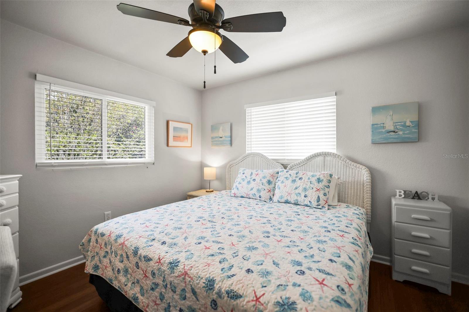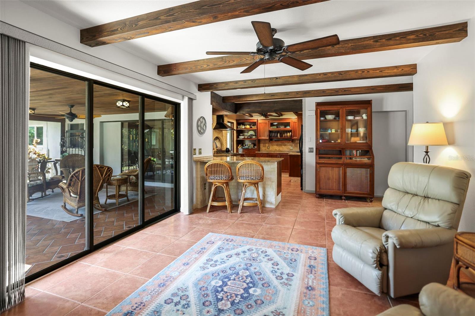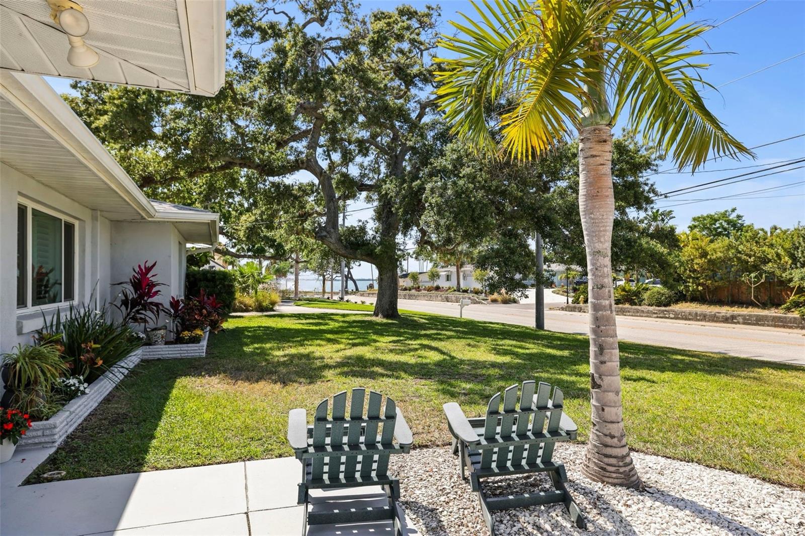 Welcome to 1039 Union Street – NOT in a flood zone and no damage from recent storms. This beautifully updated 3-bedroom, 2.5-bath block home is elevated above the flood zone and ideally situated where Clearwater meets Dunedin, offering peaceful water views from the front yard and patio. Set on a quarter-acre lot, the property features a spacious private backyard with room for a pool. Inside, the home showcases beamed ceilings, an adjacent sitting area with a fireplace, and an open-concept living and dining space with large windows, plantation shutters, a ceiling fan, and full-width pocket sliding glass doors that open to the lanai. The kitchen includes tile and granite countertops and connects seamlessly to the living areas. The primary suite features bay windows with views of the backyard and fountain, a walk-in closet, and an en-suite bathroom with a walk-in shower, marble tile, and riverstone shower flooring. Two additional full-sized bedrooms with closets share a guest bath with vintage tile and marble floors. The large screened lanai includes terracotta tile flooring, a decorative stone accent wall with a passthrough to the kitchen, triple pocket sliding doors from both the main living area and sitting room, and a finished ceiling with a fan and lighting—perfect for indoor/outdoor living. Additional highlights include a dedicated laundry room, a garage with built-in storage and a half bath, PGT impact-rated windows and doors, hurricane-rated garage door, new Trane HVAC with updated ductwork, new roof, 200-amp electrical panel with generator-ready sub-panel, new gutters, and reclaimed water irrigation. Located just minutes from Downtown Dunedin, the Pinellas Trail, waterfront parks, shops, breweries, and restaurants—this move-in ready home offers both custom style and peace of mind in a prime location.