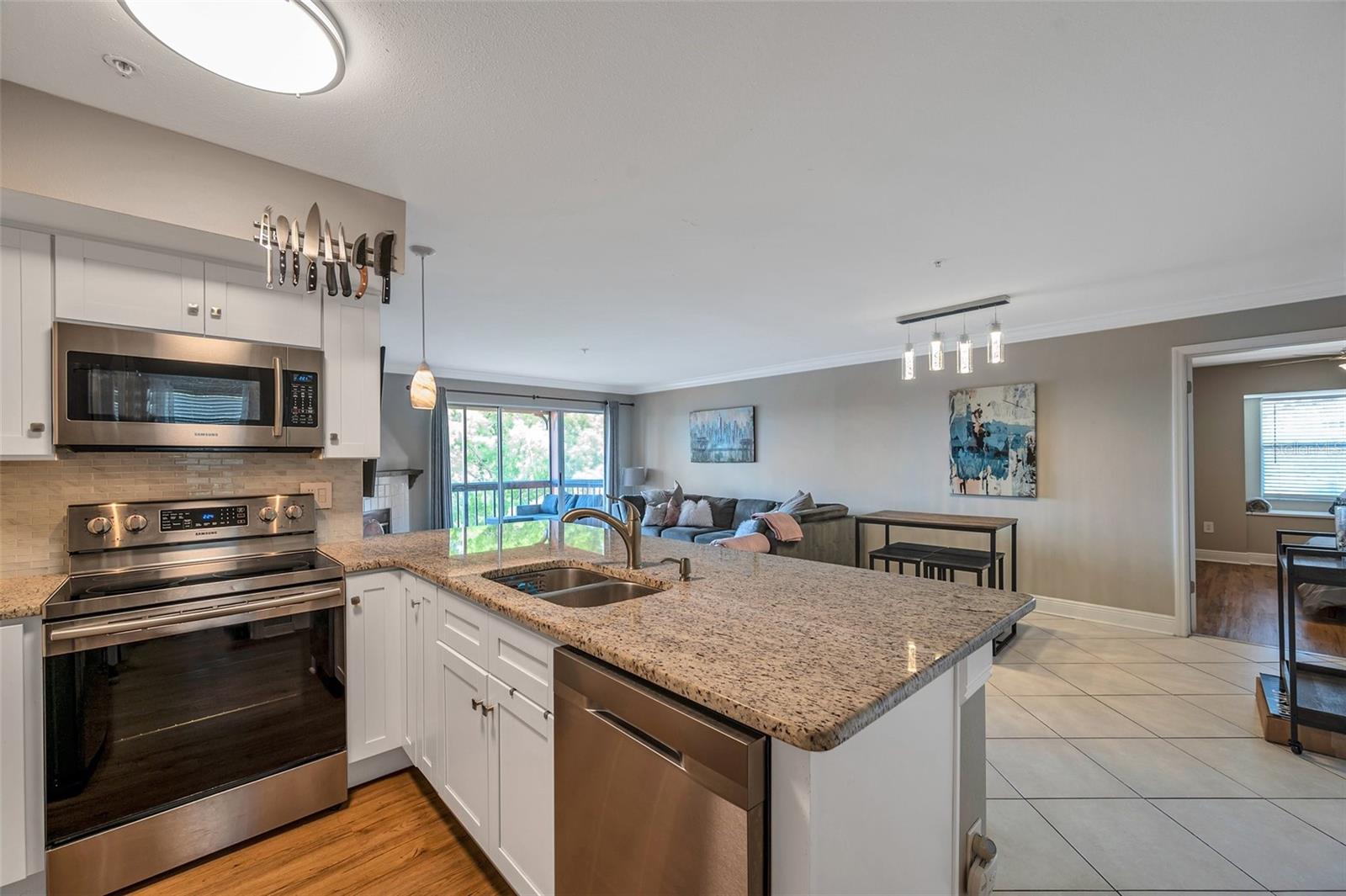 *** Huge Price Reduction for a 3 bedroom condo **** Welcome to your dream modern CORNER UNIT condo nestled on the third floor with picturesque pond views! This stunning abode boasts a myriad of fantastic amenities, including a heated community pool and spa, tennis courts, a basketball court, an exercise/weight room, and a clubhouse where you can socialize with neighbors and friends. But that's not all – your condo fee covers the Spectrum TV Platinum package with over 300 channels and lightning-fast 400 Mbps internet, ensuring entertainment and connectivity are always at your fingertips. Convenience is key with this prime location offering easy access to St. Pete, Tampa, and Clearwater, as well as local airports, top-notch shopping destinations, breathtaking beaches, and an array of delectable restaurants. Step inside and be greeted by the allure of laminate and tiled flooring throughout. The kitchen is a chef's delight with solid wood cabinets, granite countertops, and stainless steel appliances. Adjacent, you'll find an inside laundry closet equipped with a washer and dryer for added convenience. Relax and unwind in the living room adorned with a cozy wood-burning fireplace, crown molding, tiled floors, and sliders leading to your private balcony/porch. Take in the serene views of the pond and the community pool while enjoying the outdoors. The balcony/porch also features a storage closet for your convenience. Retreat to the master suite boasting an ensuite bathroom with updated cabinets and a spacious walk-in closet. Two additional bedrooms share a Jack and Jill bathroom, also tastefully updated for your comfort. PARKING IS A BREEZE WITH TWO DEEDED SPOTS - ONE DIRECTLY IN FRONT AND ANOTHER UNDER CARPORT TO SHIELD YOUR VEHICLE FROM FLORIDA WEATHER. Experience luxury, convenience, and tranquility all in one with this beautiful updated condo – your perfect retreat awaits!