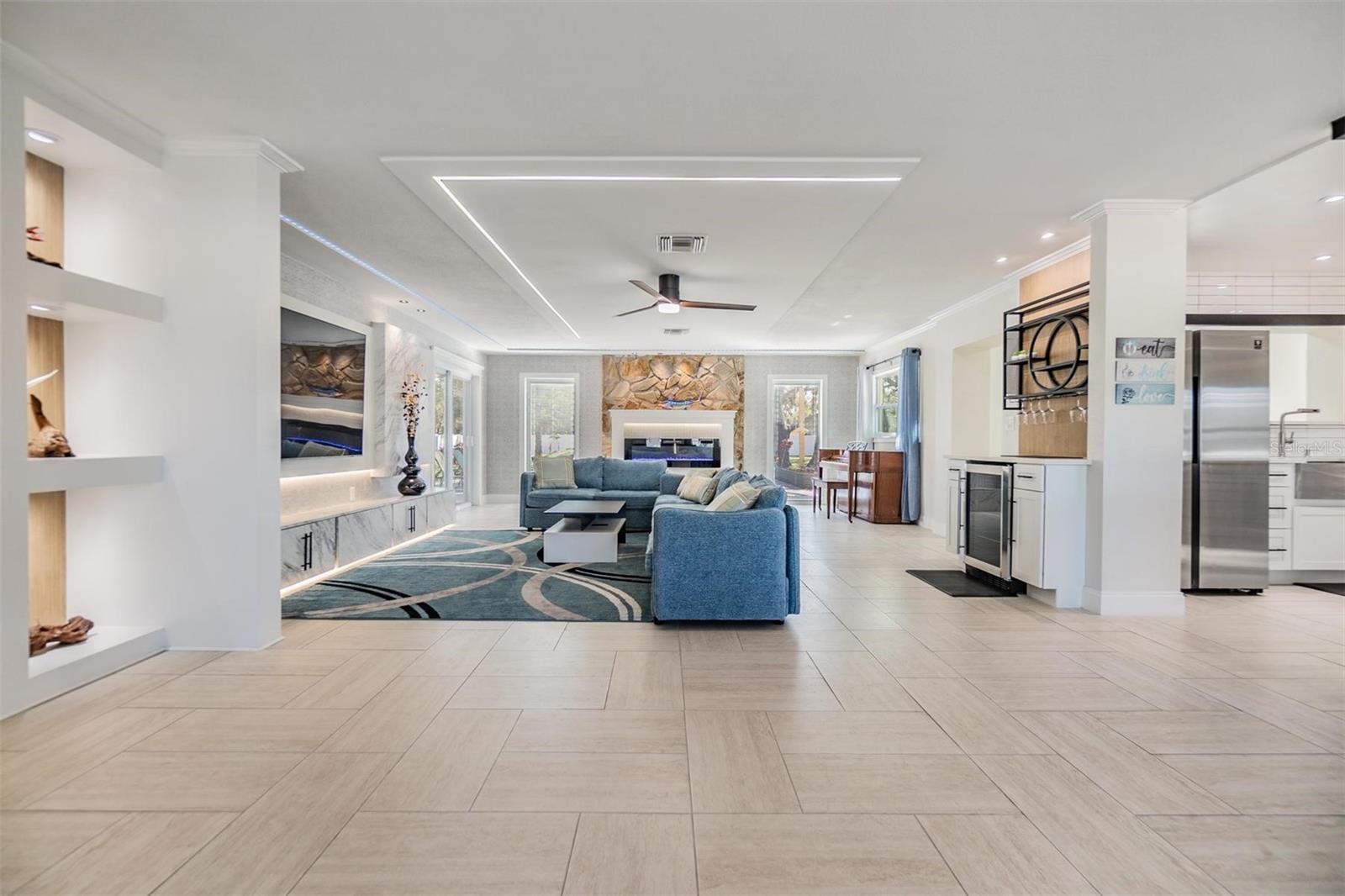 Welcome to 5744 150th Ave N—where luxury, space, and privacy meet! This completely rebuilt and fully furnished 4-bedroom, 3-bath modern residence sits on a sprawling 0.88-acre lot in unincorporated Clearwater—no HOA, no deed restrictions, and endless possibilities. Whether you're looking for a forever home or a high-performing short-term rental, this turnkey property checks every box. Inside, you'll find a brand new interior showcasing sleek design and thoughtful craftsmanship throughout. The open-concept living space is filled with natural light, featuring custom integrated LED lighting, a cozy fireplace, and a built-in coffee and wine bar. Plus, a pristine porcelain wood-look tile flooring throughout the entire house. The showstopping kitchen features shaker cabinetry, pristine quartz countertops, and a massive island—perfect for entertaining and everyday living. This fully renovated 4-bedroom, 3-bath home includes all new drywall, new HVAC, plumbing, electrical, water heater, and energy-efficient double-pane windows and sliding doors—a true like-new construction experience. The en-suite primary bath offers a true spa-like experience. Conveniently located within the primary bedroom, impresses with a frameless glass walk-in shower, a freestanding soaking tub, and refined tile accents—designed to provide both elegance and relaxation. Step outside to your private resort-style paradise. Unwind on the low-maintenance Trex deck with a lifetime warranty, take a dip in the resurfaced in-ground pool (2022), or relax in the brand-new hot tub beside a tranquil water fountain. Beautifully updated new landscaping, newer pavers, and a fully fenced yard create the ultimate outdoor sanctuary. Need space for hobbies, toys, or business? The detached 3+ car garage with 832 square feet. The circular driveway and extra plenty of room for RV, boat. Nestled on a rare and oversized 0.88-acre lot, this property offers peace and privacy—yet it's just minutes from Clearwater’s beaches, Tampa International Airport, major Highway, shoppings and dinings. Roof replaced in 2021. Live in it, rent it out, or both—the possibilities are endless.