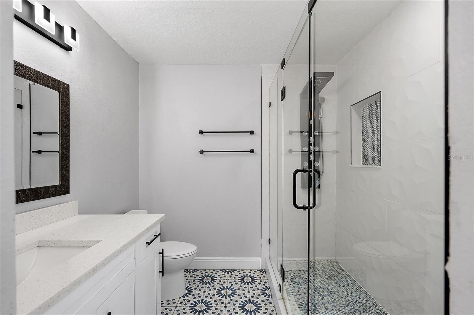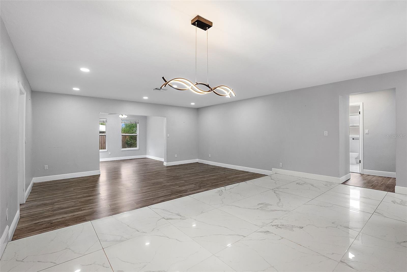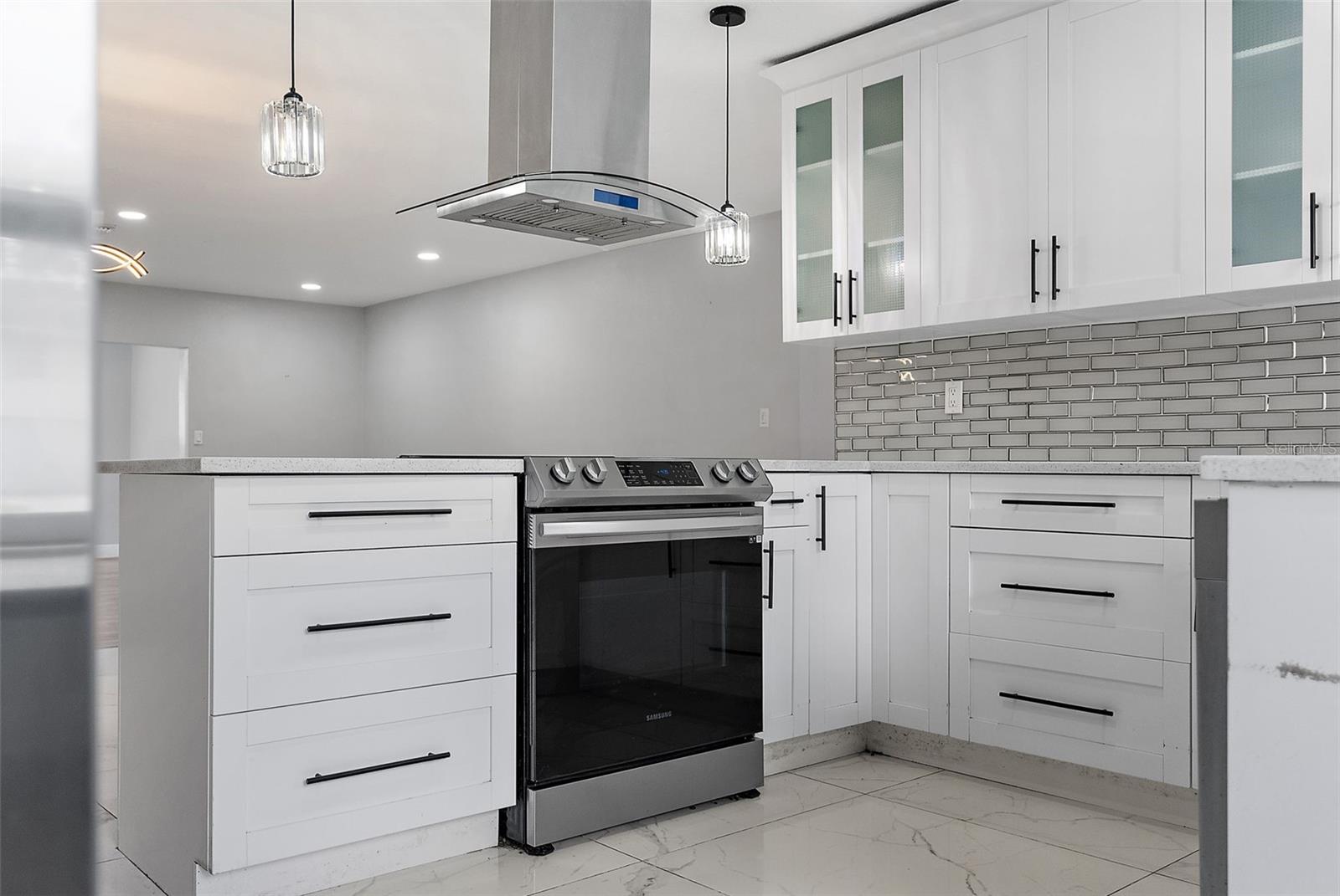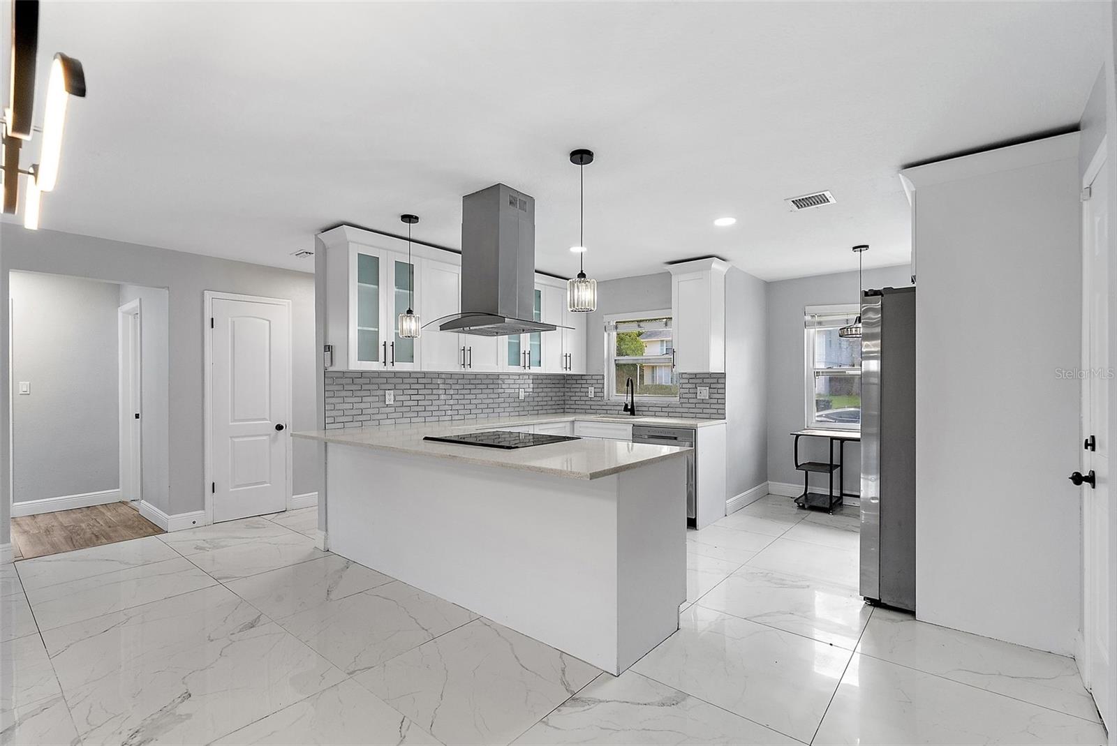 Meticulously renovated and move-in ready, this 3-bedroom, 2-bathroom, 2-car garage home is tucked away in the desirable Highland Estates neighborhood of Clearwater. Step inside to discover a light and airy open-concept layout featuring a spacious living room, dining area, and family room that flow seamlessly into the heart of the home—the showstopping kitchen. Thoughtfully redesigned, the kitchen stuns with modern shaker-style soft-close cabinetry, sleek quartz countertops, a stylish glass subway tile backsplash, and top-of-the-line Samsung appliances—including a smart fridge with a built-in info center. The cozy eat-in area offers the perfect spot to enjoy your morning coffee, while wide-plank, water-resistant engineered wood floors run throughout the main living spaces, adding warmth and durability. The split floor plan provides privacy, with the spacious primary suite tucked away featuring a large walk-in closet and a luxurious en-suite bathroom with a frameless glass walk-in shower and chic barn doors. Both bathrooms have been fully remodeled with designer finishes, high-end fixtures, and attention to detail throughout. Additional upgrades include a newer AC, updated electrical panel, double-pane windows, a new garage door and opener, new interior two-panel doors, updated lighting, and fresh knock-down ceiling texture. A set of sliding glass doors leads to the expansive backyard, complete with a patio perfect for entertaining, relaxing, or creating your dream outdoor retreat. With ample room to park your RV, boat, or extra vehicles, this home offers flexibility and functionality. Centrally located just minutes from world-famous Clearwater Beach, vibrant Downtown Dunedin, parks, shopping, and dining—this is Florida living at its finest. Don’t miss your chance to make this beautifully updated home yours!