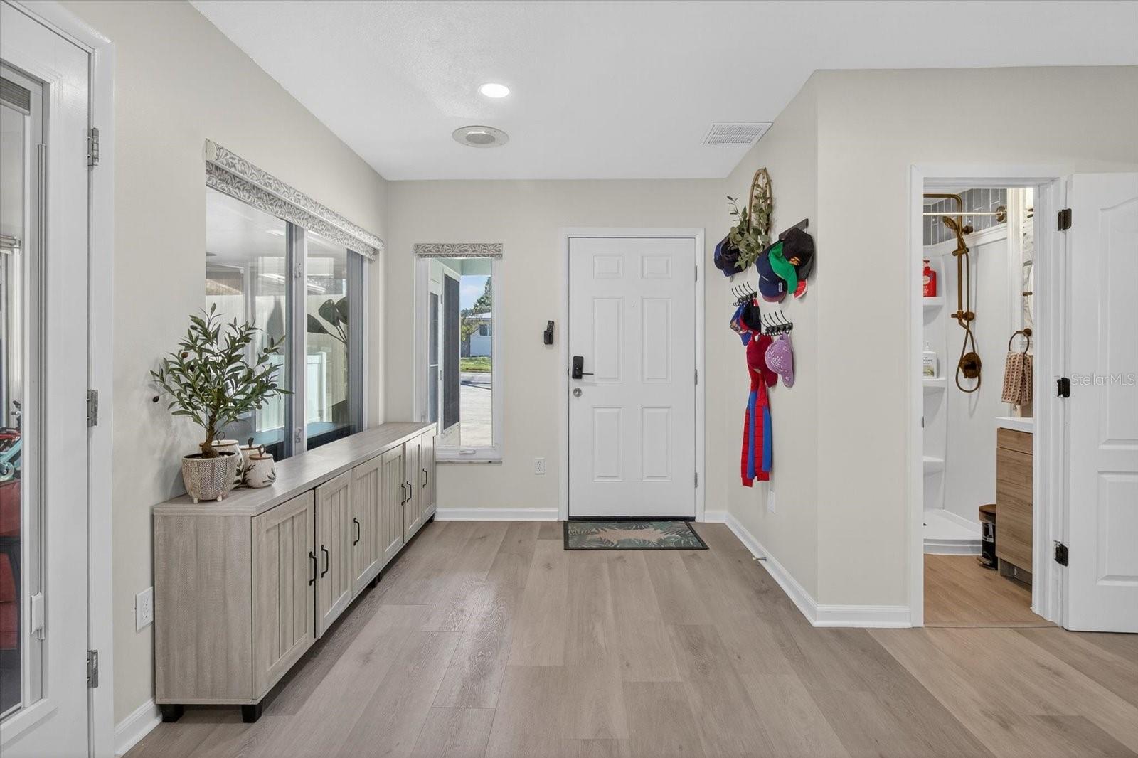 Welcome home to this perfect corner property that is designed for modern, efficient living. Enjoy yourself in this wonderful space that features a solar panel system that will significantly cut your electric bills and a salt-free water filtration system for cleaner, healthier water throughout the entire house. Plus, with new Category 5 windows, you'll benefit from enhanced energy efficiency and security, while the expansive windows fill the home with natural light. Adding further to peace of mind are new impact doors to all exterior openings, a steel impact garage side door and hurricane rated garage door. Pre-wired generator hook-up should you install a generator for power outages providing extra security and peace of mind. The 13x38 Florida room with covered patio extension is spacious and beautiful, complete with tempered glass, security doors and AC unit to maximize comfort. So many upgrades including new interior paint, updated bathrooms, shower, light and faucet fixtures, new vanities, and new wall aesthetic. The kitchen is also updated with new cabinets, double-oven, dishwasher, oversized refrigerator, sink, disposal, light fixtures and an added pantry area to extend the kitchen. The irrigation is supplied by a deep well and Smart Irrigation system. Located on a desirable high and dry corner lot with a fenced-in yard, this property provides added space and a grander presence. This is the ideal home for those who value both quality and location. This home is just minutes from the famous white sands of Clearwater Beach while at the same time an easy drive to the Tampa International Airport. Key features: Roof (2016), Cat 5 Windows (2019), AC including all new ducts (2019), Plumbing throughout (2019), Tankless water heater (2019), Solar Panels (2020), Luxury Vinyl (2024).