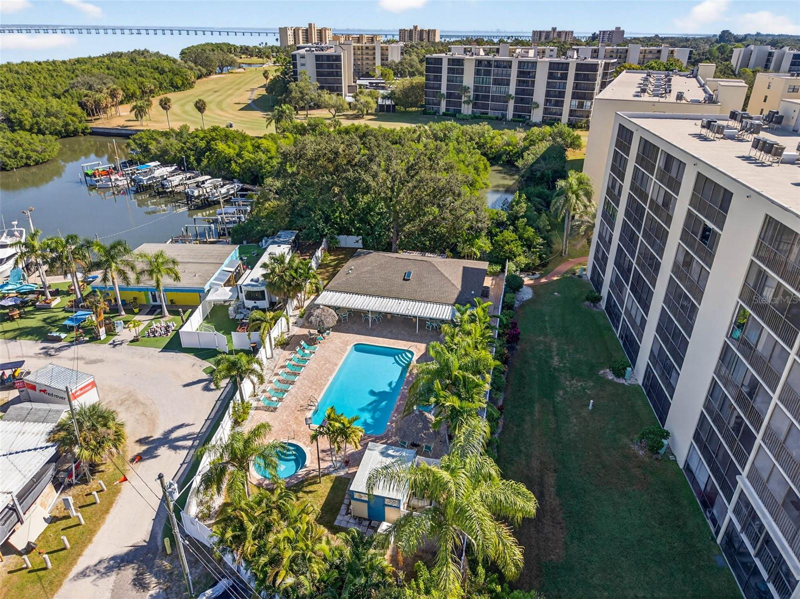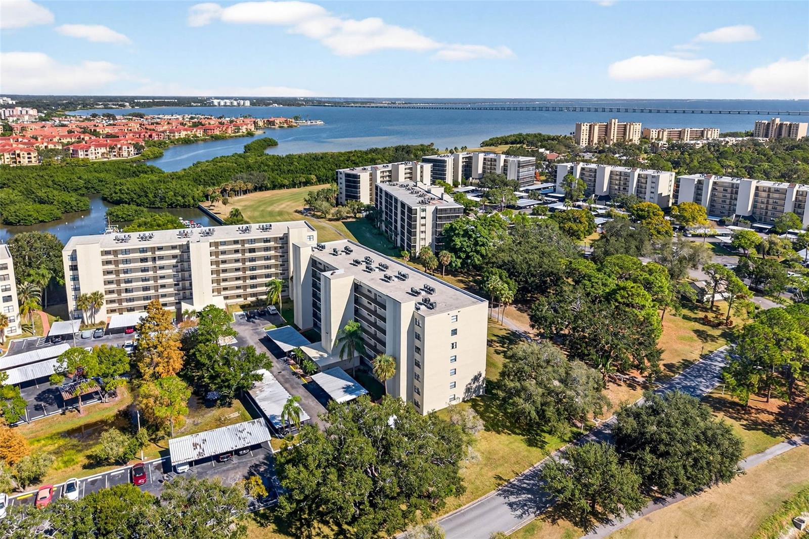 Welcome to resort-style living at Cove Cay! This beautifully updated 2-bedroom, 2-bath condo is perched on the 4th floor and offers stunning views overlooking the tee and fairway of the 9th hole of the Cove Cay Country Club golf course—truly a serene setting and a golfer’s dream. Step inside to a welcoming foyer with hardwood flooring that flows into the dining area. The updated kitchen features warm wood cabinetry, granite countertops, stainless steel double sink, and a convenient coffee bar with a pass-through to the living space. The open-concept living and dining room is light and inviting, complete with crown molding, neutral tones, and sliding glass doors leading to the spacious screened-in balcony—perfect for morning coffee, evening sunsets, or simply relaxing while enjoying the peaceful golf course views. The primary bedroom offers private access to the balcony, double closets, and an ensuite bath with a separate vanity and walk-in shower. The second bedroom and bath are equally comfortable, offering ample space and tasteful finishes. This unit includes an assigned parking space, and residents have access to fantastic community amenities. The recreation area is fully fenced for privacy and features a heated pool, spa, lush landscaping, and a lovely gathering space for friends and neighbors. Cove Cay is truly “Paradise Found,” featuring an 18-hole championship golf course overlooking Old Tampa Bay, the Bayview Grille & bar (open 7 days a week), and a full-service marina with waterfront dining—all within the community. Lush, gated grounds and 24-hour security provide peace of mind in this sought-after Florida lifestyle destination. Come experience the beauty, comfort, and convenience of Cove Cay living!