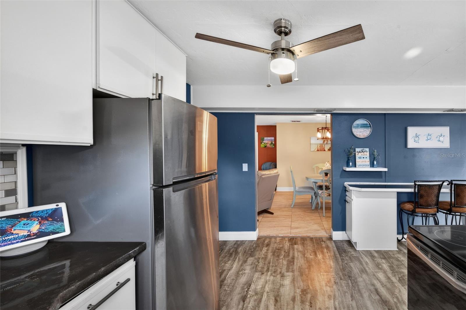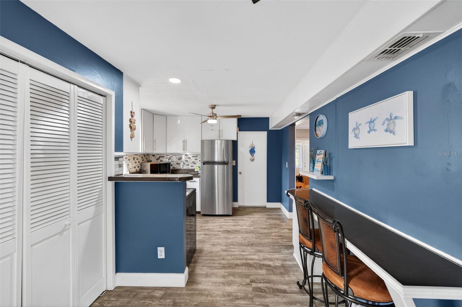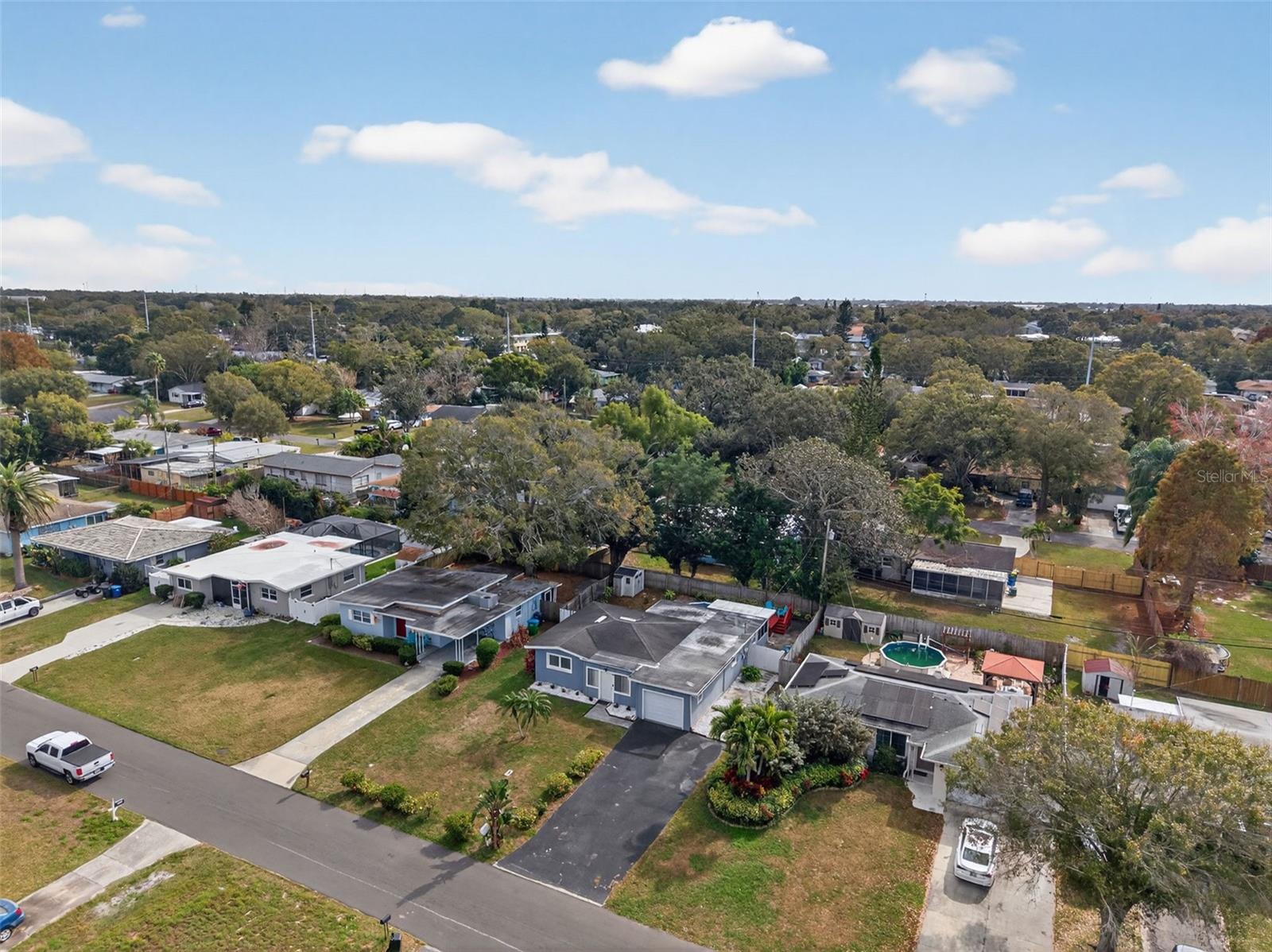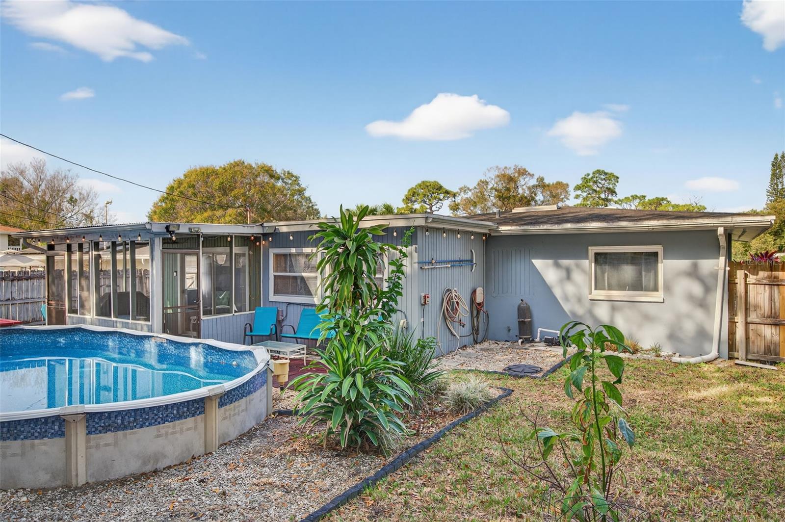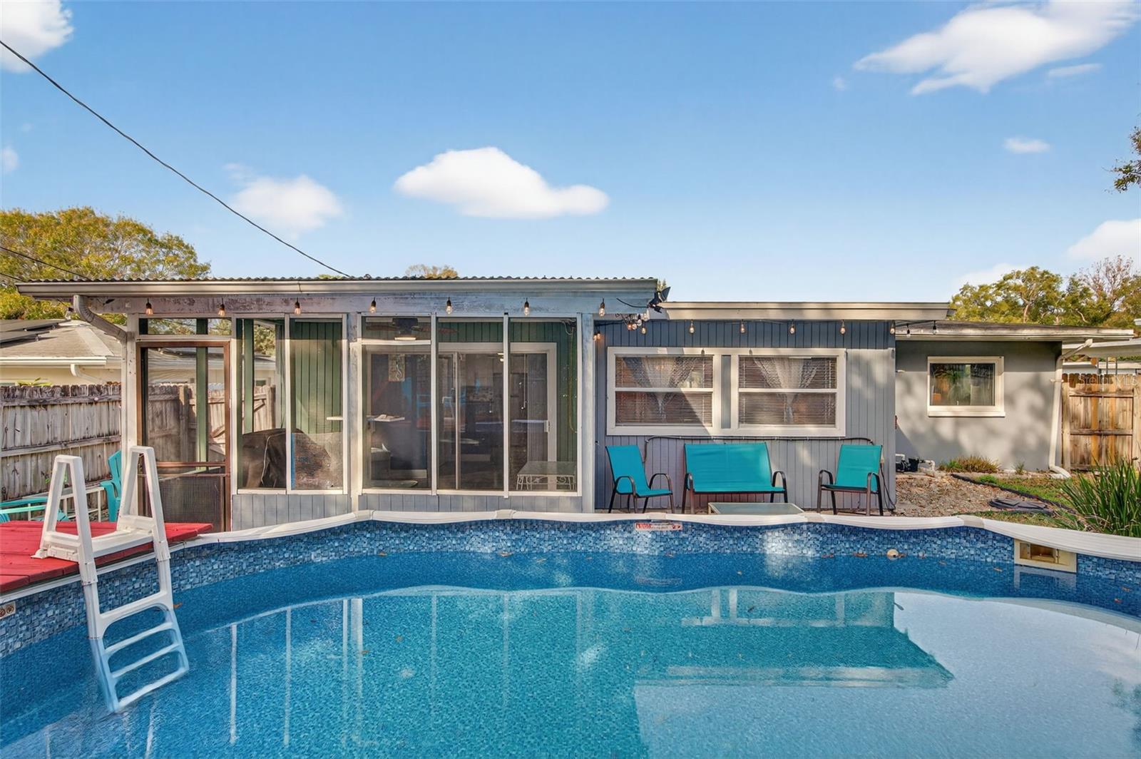 Welcome to this charming and versatile 3-bedroom, 1-bath home with a 1-car garage, offering 1,261 sq. ft. of comfortable living space—perfect for first-time homebuyers, seasonal residents, or as a vacation retreat. Step inside to a bright and inviting open floor plan, where the living and dining areas flow seamlessly, enhanced by modern, neutral tile flooring that creates a spacious and airy feel. The kitchen is thoughtfully designed with wood cabinetry, stainless steel appliances, a stylish mosaic glass backsplash, and a convenient breakfast bar, ideal for casual dining or entertaining. An inside laundry closet adds everyday convenience while keeping everything neatly tucked away. Down the hallway, you’ll find two generously sized bedrooms and a shared full bathroom. The third bedroom, currently used as a home office, features charming barn-style doors and offers serene views of the backyard—ideal for a flexible living space. Enjoy Florida living outdoors in the fully fenced backyard, complete with an above-ground pool and surrounded by lush landscaping, providing a private and peaceful setting for relaxing or entertaining. Additional highlights include no flood insurance required and a prime location off Hercules Ave. and SR-580, offering quick access to shopping, dining, US-19, and less than 2 miles from vibrant downtown Dunedin. Don’t miss this opportunity—schedule your private showing today!