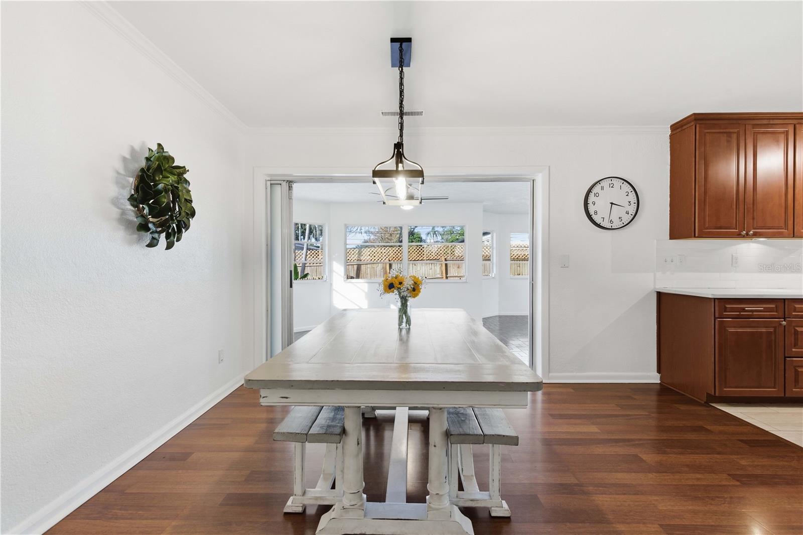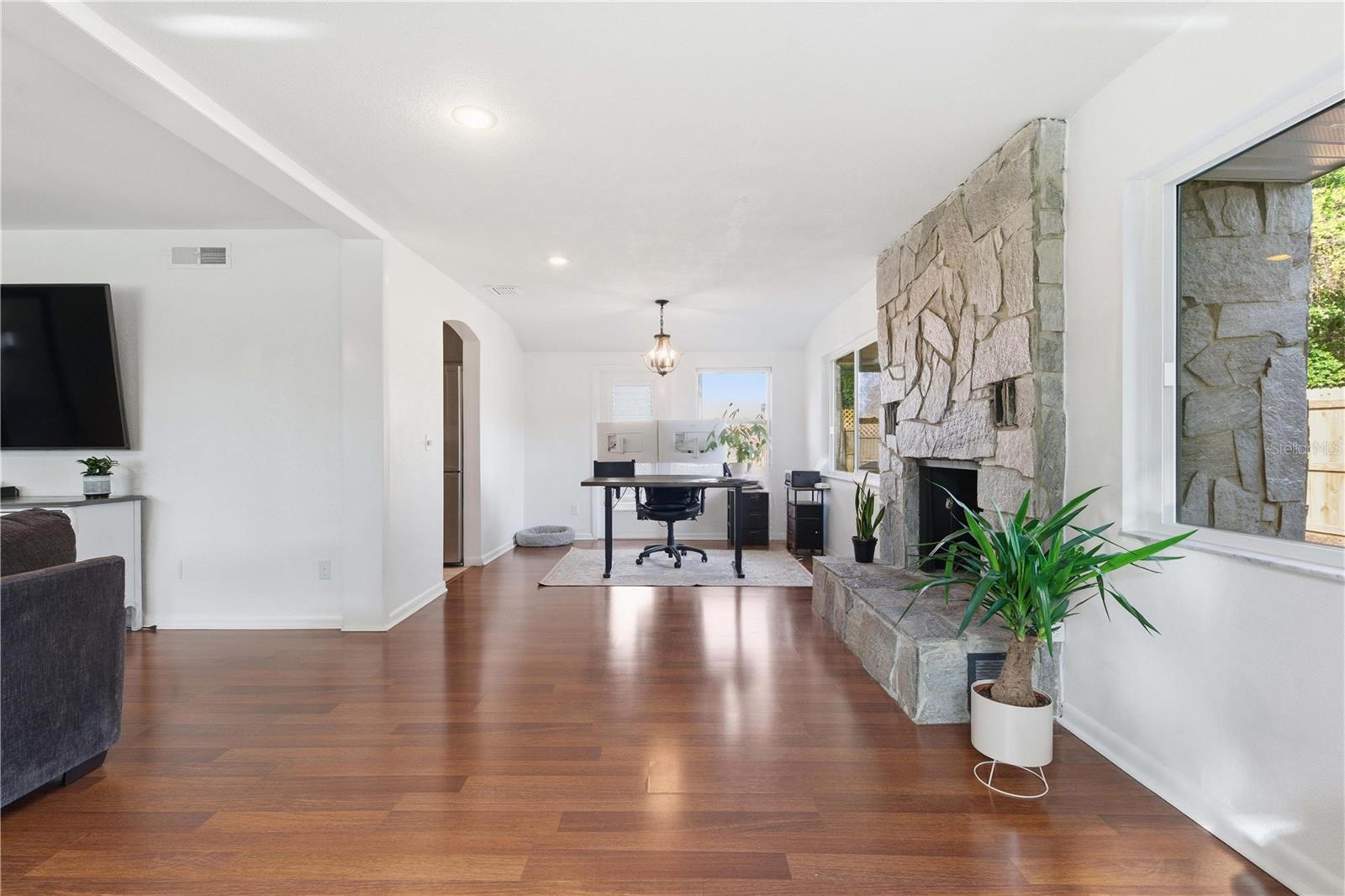 One or more photo(s) has been virtually staged. Located in the desirable Glenwood neighborhood of Clearwater, this charming mid-century home sits on a rare double lot along a quiet, tree-lined street with beautifully manicured landscaping and standout curb appeal. Step inside to an inviting open floorplan where engineered wood floors and a cozy wood-burning fireplace create a warm, welcoming atmosphere with plenty of flexibility for a home office, reading nook, or additional seating area. The kitchen is centrally positioned for easy everyday living and entertaining, flowing seamlessly into the main living spaces. Just beyond, a spacious rear family room offers endless possibilities as a playroom, media room, home gym, or flex space tailored to your needs. The primary bedroom features an ensuite bath and comfortable proportions, while the additional bedrooms are generously sized and share a well-appointed bathroom. Out back, the expansive yard spans over a quarter acre across two lots, providing ample room to relax, entertain, or expand outdoor living. Recent improvements include new impact-rated windows, updated electrical and panel with generator readiness, a whole-home water filtration system with under-sink reverse osmosis, irrigation on a well, new sod, new fencing, and a new pavered patio. The two-car garage is climate-controlled with A/C and includes an 8x8 office, offering a perfect work-from-home setup. Ideally located near the Clearwater Country Club, Clearwater Executive Airport, nearby schools, and baseball fields, this home is just about five miles from Clearwater Beach. Enjoy the coastal lifestyle without the worry of flood insurance, HOA, or CDD fees in this non-evacuation zone—an exceptional opportunity in one of Clearwater’s most established neighborhoods. Schedule your showing today!