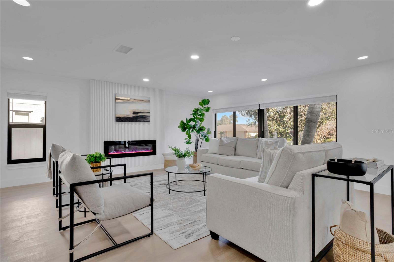 Prepare to be impressed by this fully remodeled Clearwater gem, ideally located off Rollingwood and Landmark Drive. From the moment you arrive, the curb appeal and prime corner-lot setting set the tone. Situated on a fenced ¼-acre cul-de-sac lot, this home offers space, privacy, and a location that immediately excites buyers. The updated French entry doors welcome you into a home that truly opens up. Inside, expansive ceilings and a wide-open layout create an immediate sense of light and flow. The oversized dining room makes a statement, complemented by knockdown texture throughout and energy-efficient LED lighting that enhances the modern design. The kitchen anchors the home, seamlessly connecting to the living area-perfect for entertaining and everyday living. Featuring all-new two-tone cabinetry with abundant pull-out drawers, this space is designed to satisfy the home chef. Quartz countertops, stainless steel appliances, and a sleek contemporary backsplash complete the look. The living room is elevated by a custom built-in entertainment center with an electric fireplace and dedicated space for home entertainment. The primary suite offers tranquil poolside views and a stunning, fully updated en-suite bathroom with a glass-enclosed shower and tub. Dual vanities with modern finishes and lighted mirrors bring both style and function. Just off the primary suite, the fourth bedroom provides incredible flexibility ideal for a home office, nursery, sitting room, or additional bedroom. A true split floor plan places two additional bedrooms on the opposite side of the home, along with a beautifully updated hall bath featuring contemporary charm. Impact-rated windows enhance energy efficiency while improving storm readiness and peace of mind. Major systems have been updated in 2025 and 2026, including the main electrical panel, HVAC water heater, roof, pool pump and windows, offering buyers confidence and long-term value. Step into the backyard and see where this home truly shines. The oversized pool has just been refinished with a durable Diamond Brite surface for years of low-maintenance enjoyment. The pool deck and entry walkway feature contemporary stamped concrete, flowing seamlessly to the covered back patio. Rain or shine, outdoor living continues with an expansive covered entertaining space just off the kitchen, complete with an outdoor refrigerator to keep gatherings effortless. The large two-car garage easily accommodates vehicles and even fits a golf cart (sold separately). This is a rare opportunity to own a turnkey, fully remodeled home with space, style, and a backyard built for Florida living, all in a desirable Clearwater location.
