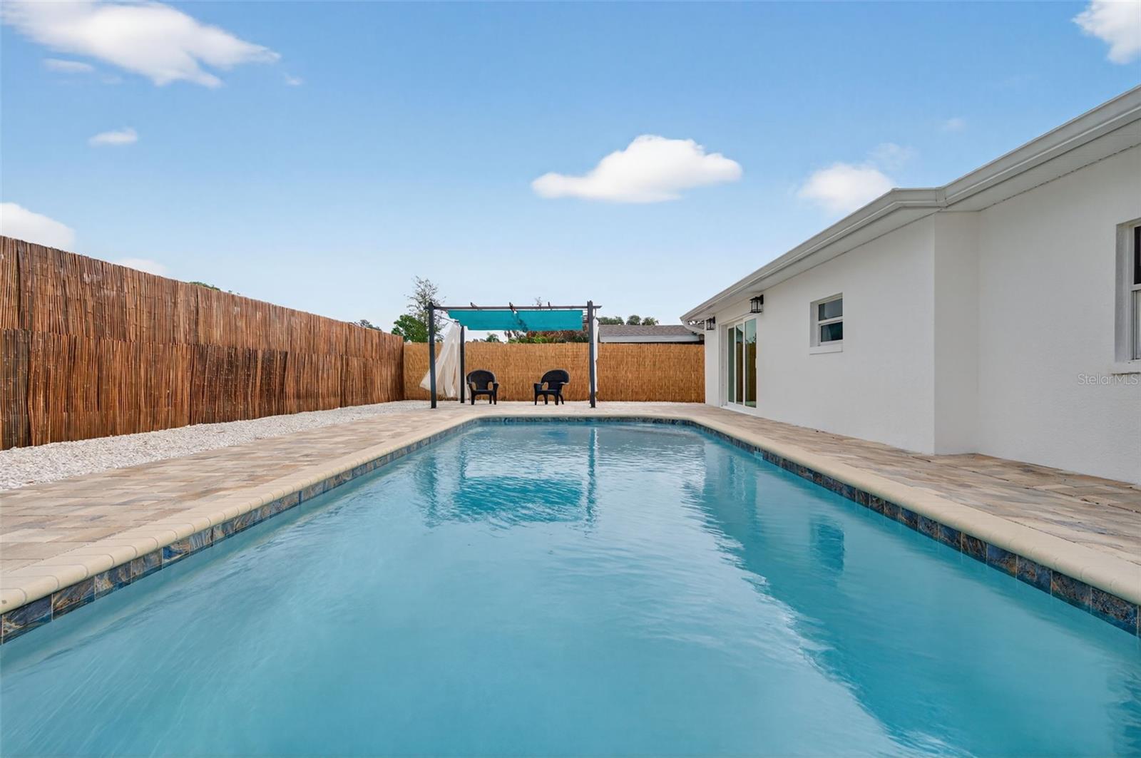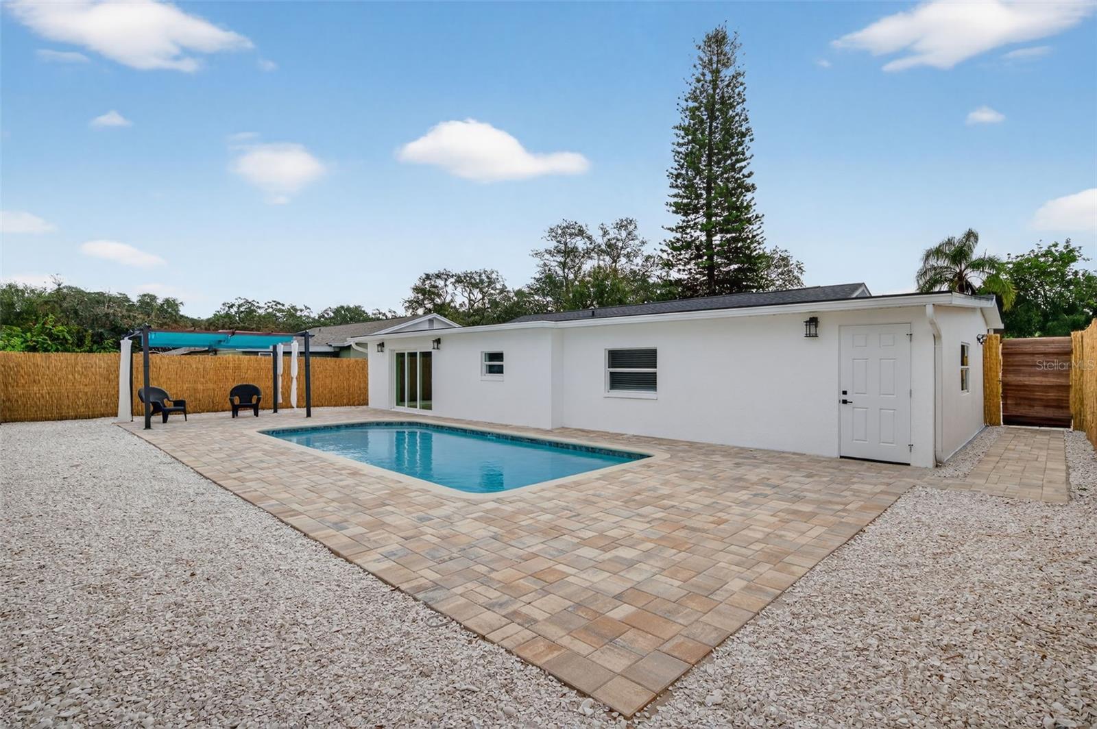 Charming cul-de-sac home in a darling neighborhood, ideally located just minutes from Dunedin’s lively downtown, renowned beaches, and state parks. This thoughtfully designed residence offers 4 bedrooms and 2 full bathrooms with a split floor plan that provides privacy and functionality for everyday living. The home features an open-concept kitchen and living area, styled with earth tones and natural hues, incorporating organic materials and mixed textures to create a warm, grounded, and timeless aesthetic with modern sophistication. The kitchen boasts ample cabinetry and storage, new appliances, a spacious island, and seamless flow into the main living space—perfect for entertaining. An additional large family room overlooks the backyard and pool, offering a bright and inviting retreat. The primary suite is privately situated with an ensuite bathroom and walk-in closet, while the three additional bedrooms are located in the front wing of the home and share a full bathroom. A centrally located laundry room sits conveniently between the primary bedroom, family room, and kitchen. Outside, enjoy a generous lot with a bamboo-fenced backyard, sparkling pool, pavers and shell accents, and a pergola, creating a serene outdoor oasis. Completing the property is a one-car garage and a wrap-around driveway along the front side of the home.