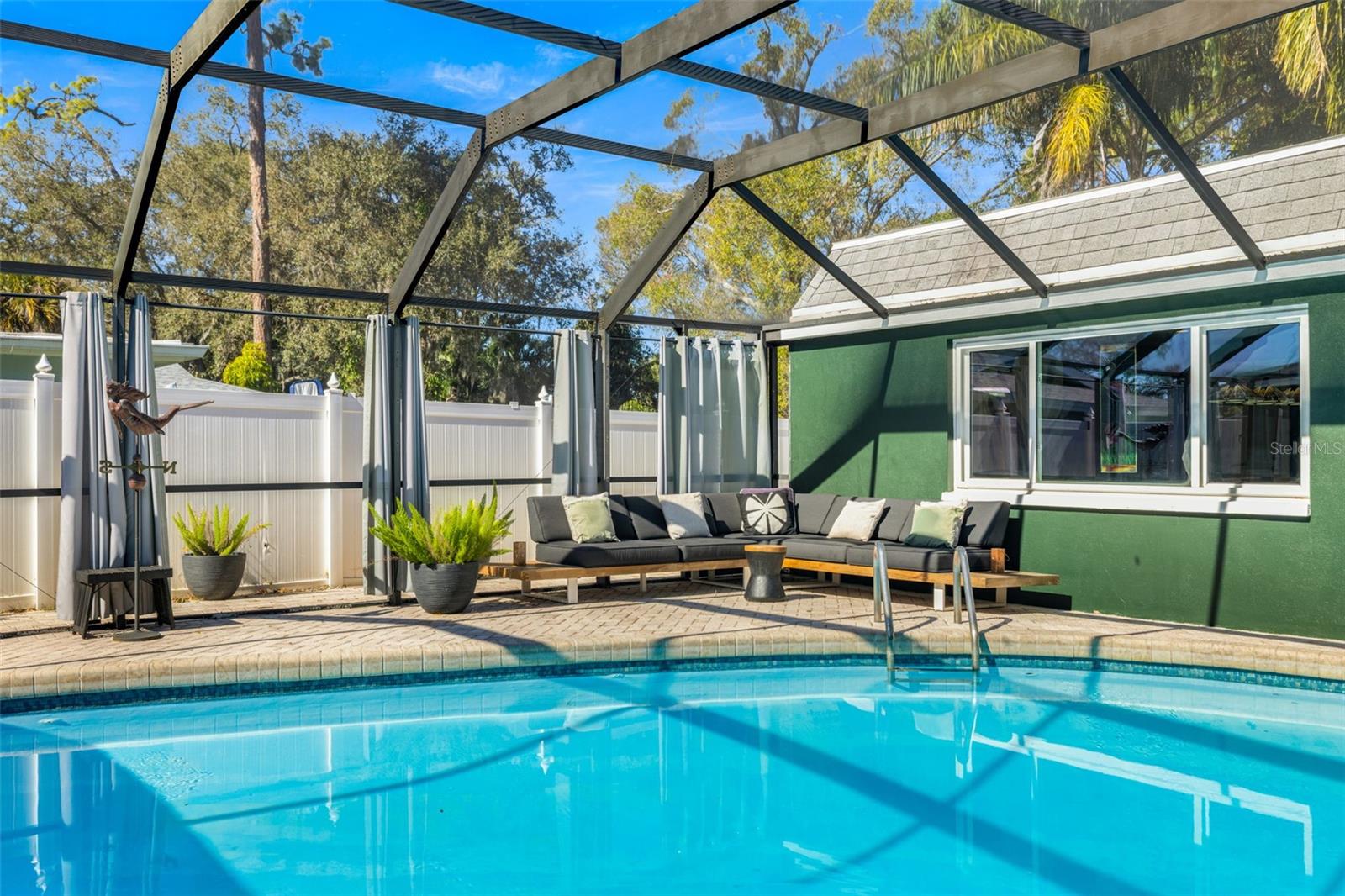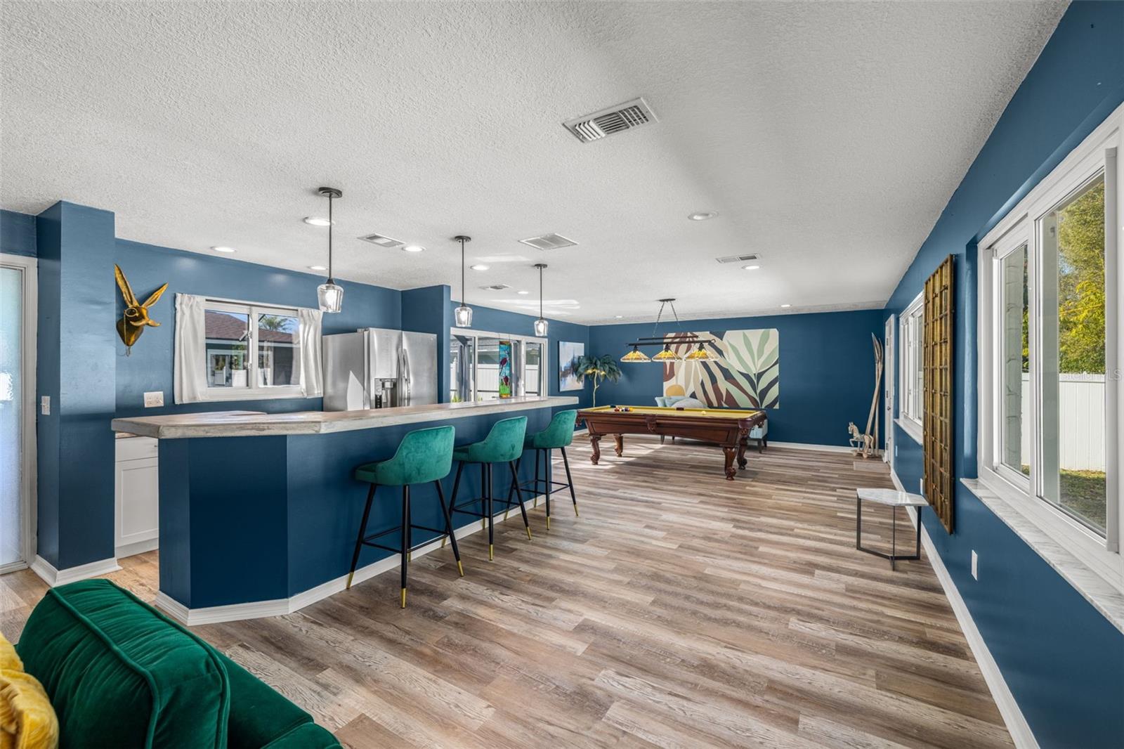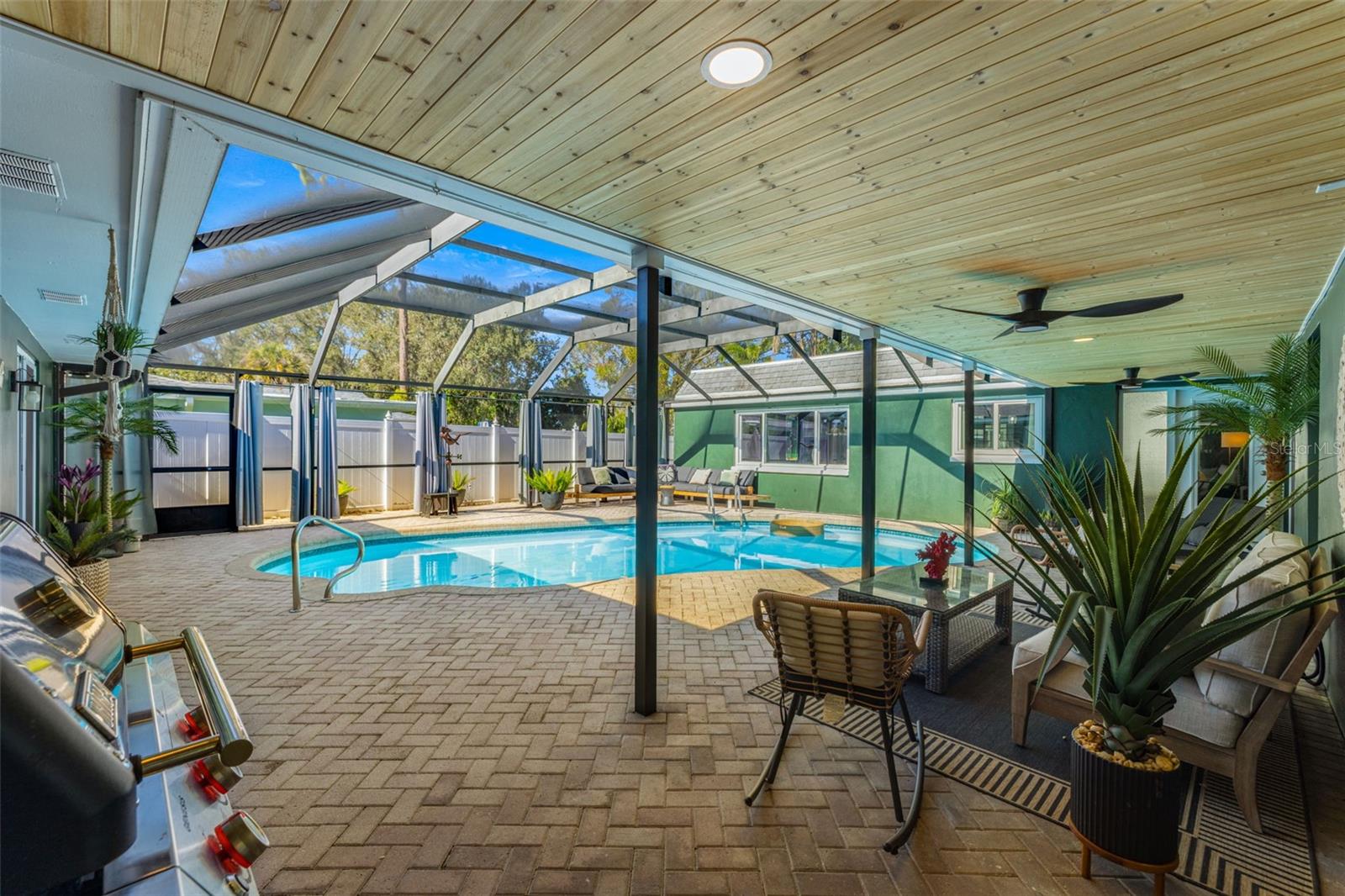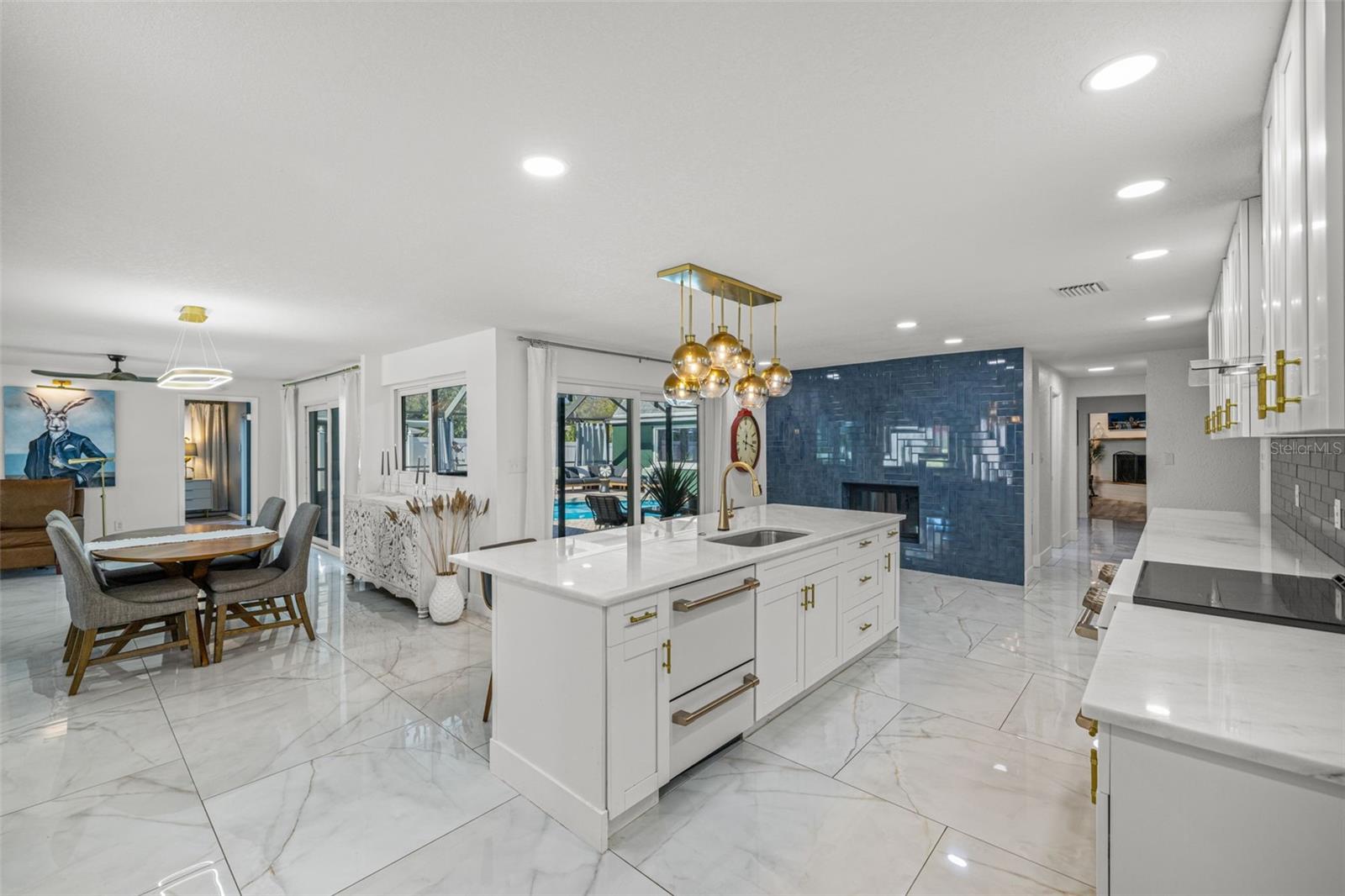 If you’ve been waiting for a home that truly checks every box, this is the one. Set on a quarter-acre lot, this entertainer’s dream home makes an unforgettable first impression with a pavered driveway and walkway framed by lush landscaping and winding sidewalks, setting the tone for a property that has been thoughtfully updated and beautifully maintained. Inside, over 3,500 square feet of living space unfolds with oversized 30-inch porcelain tile throughout the main living areas, kitchen, hallway, and flex space, creating a sleek and modern feel. The entry opens into a spacious living and dining area that flows seamlessly into the kitchen, making entertaining effortless. The kitchen is both stylish and functional with granite countertops offering generous barstool seating, modern backsplash, shaker cabinetry, and a striking wood-burning fireplace with a fully tiled wall surround. High-end Café appliances elevate the space and include a dual oven, double drawer dishwasher, and a refrigerator with a flex drawer. Down the hallway, a large family room delivers the ultimate entertaining experience. This space features a serving area with a full-sized refrigerator, concrete countertop, and barstool seating, ideal for entertaining. A dedicated beverage station, a wood-burning fireplace, and a pool table that conveys with the home create the ultimate gathering space. The primary suite is privately located near the front of the home and offers a true retreat with an ensuite bathroom featuring dual sinks, a large walk-in shower, and direct access to the pool for easy indoor-outdoor living. Two additional bedrooms share a Jack and Jill bathroom with dual sinks, while a dedicated office and a convenient pool bath both offer direct access to the outdoor living area. A spacious laundry room provides ample cabinetry, storage, and a utility sink for everyday convenience. A newer 2025 water heater offers peace of mind for years to come. Outside, the home truly comes to life. The screened-in lanai features recently replaced screens and overlooks a sparkling private pool and pavered pool deck, creating the perfect setting for relaxing, entertaining, and enjoying the Florida sunshine. Zoned for A-rated Belcher Elementary School just down the road and less than 10 minutes from Eagle Lake Park with its playground, dog park, picnic shelters, boardwalks, paved trails, and fishing areas. With easy access to US-19, this location keeps you close to shopping, dining, and entertainment while putting you right in the center of it all. Homes like this don’t come around often, schedule your showing today!