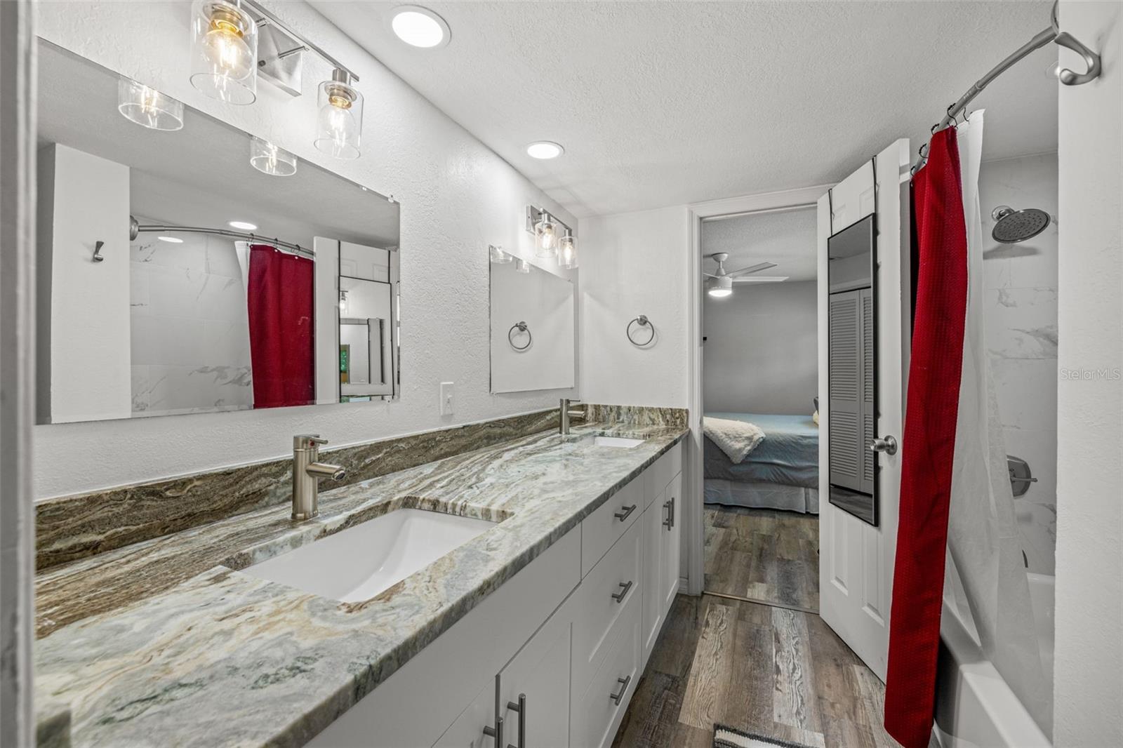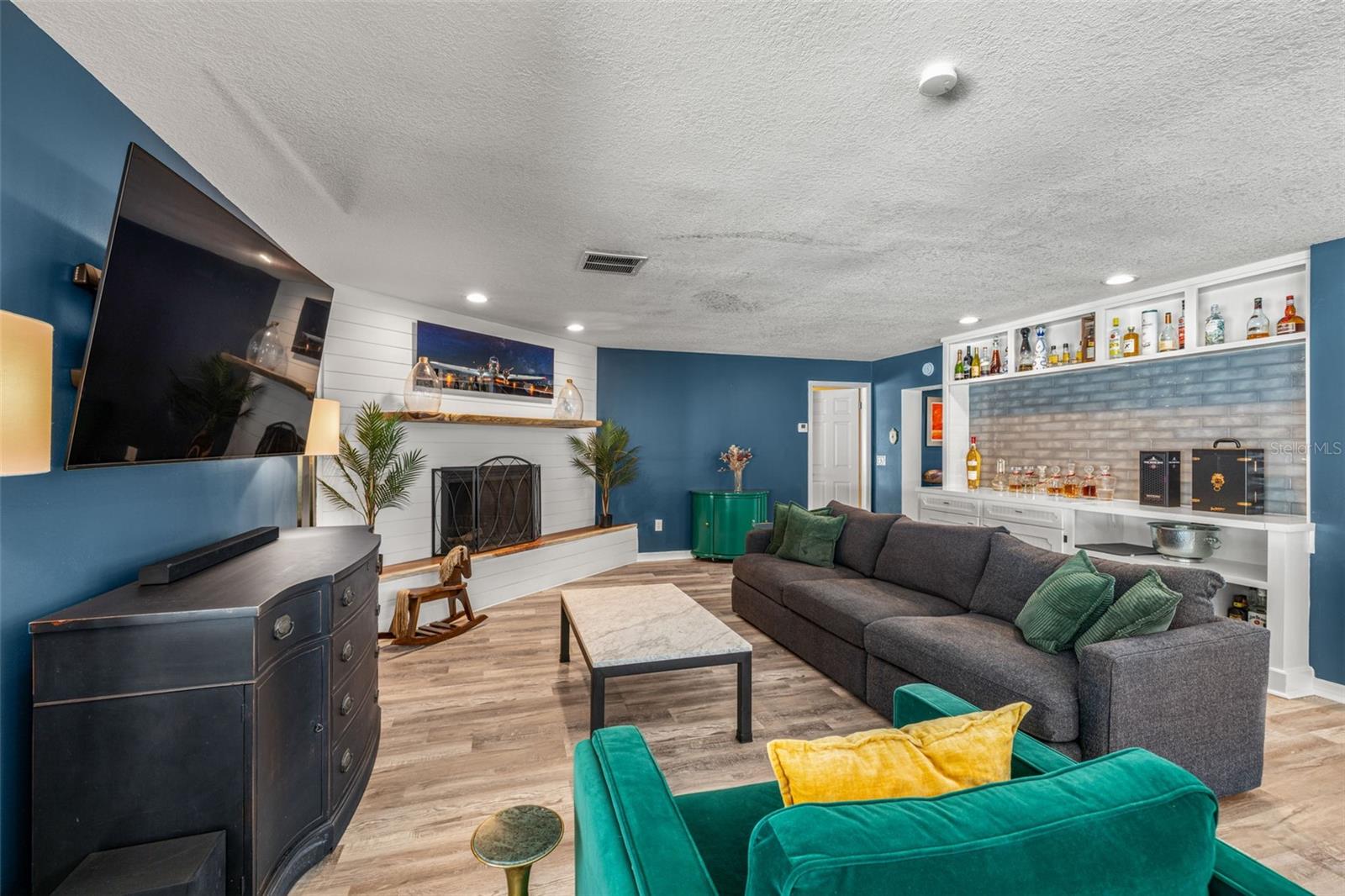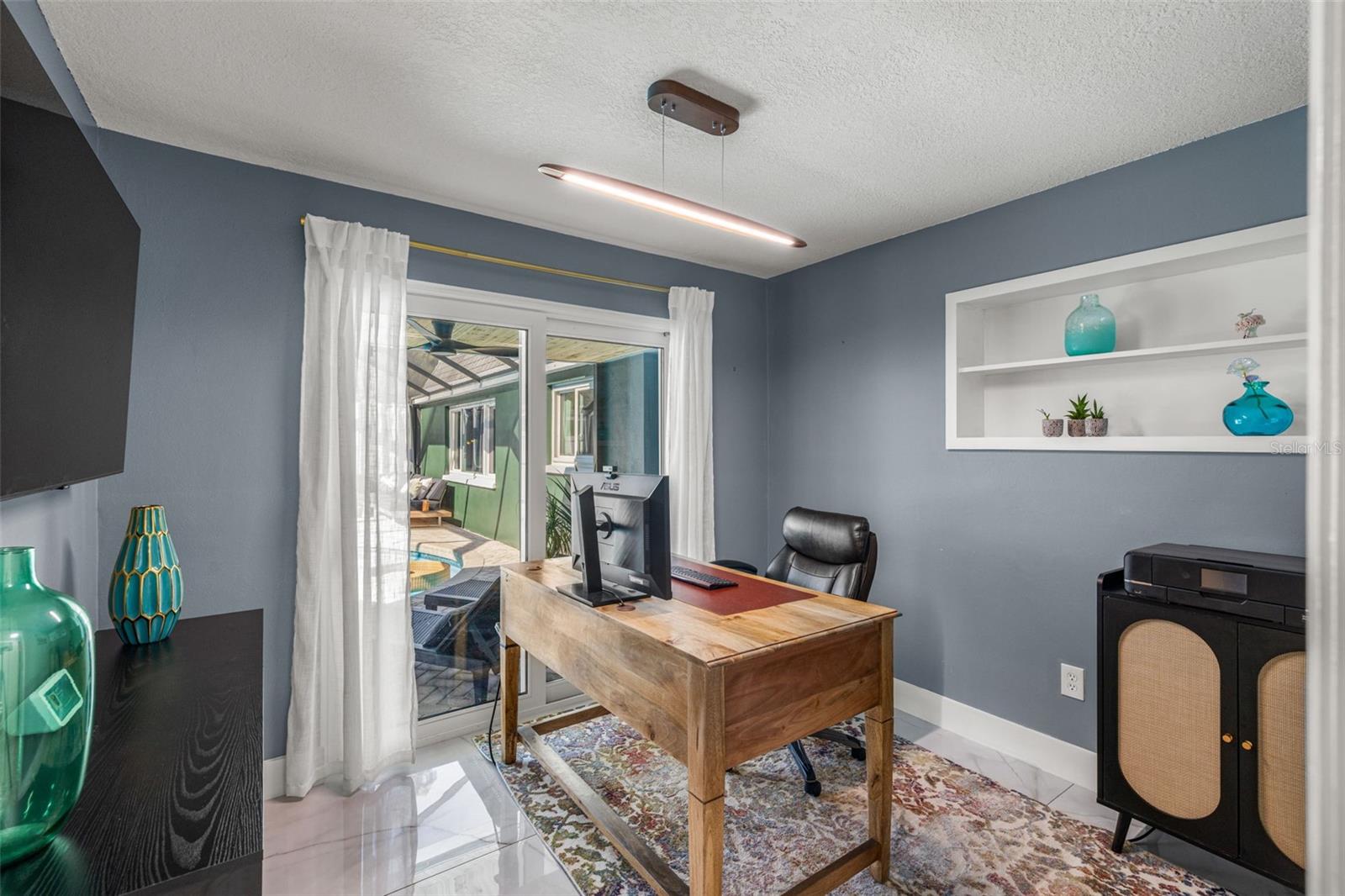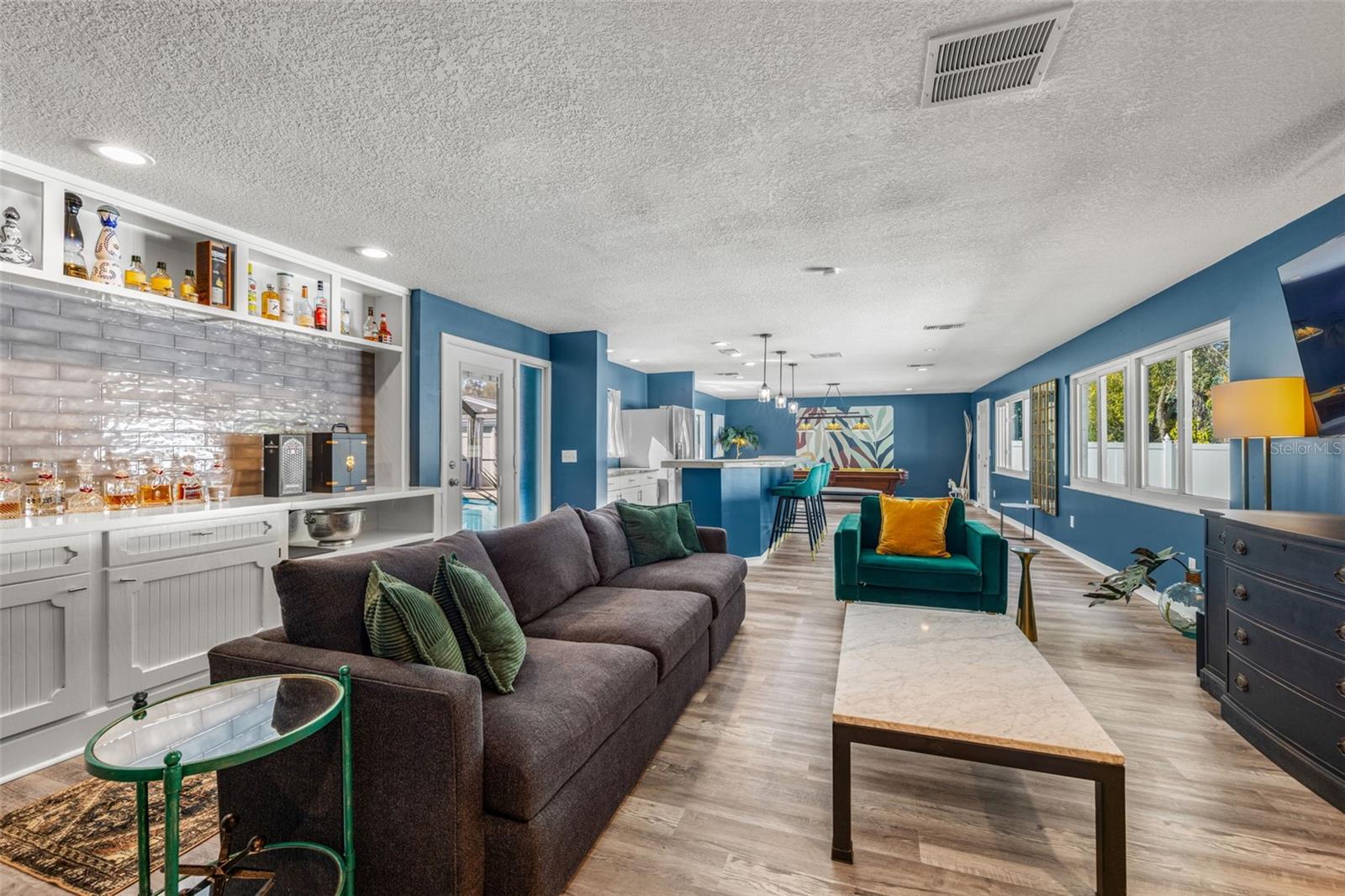 If you’ve been waiting for a home that truly checks every box, this is the one. Set on a quarter-acre lot, this entertainer’s dream home makes an unforgettable first impression with a pavered driveway and walkway framed by lush landscaping and winding sidewalks, setting the tone for a property that has been thoughtfully updated and beautifully maintained. Inside, over 3,500 square feet of living space unfolds with oversized 30-inch porcelain tile throughout the main living areas, kitchen, hallway, and flex space, creating a sleek and modern feel. The entry opens into a spacious living and dining area that flows seamlessly into the kitchen, making entertaining effortless. The kitchen is both stylish and functional with granite countertops offering generous barstool seating, modern backsplash, shaker cabinetry, and a striking wood-burning fireplace with a fully tiled wall surround. High-end Café appliances elevate the space and include a dual oven, double drawer dishwasher, and a refrigerator with a flex drawer. Down the hallway, a large family room delivers the ultimate entertaining experience. This space features a serving area with a full-sized refrigerator, concrete countertop, and barstool seating, ideal for entertaining. A dedicated beverage station, a wood-burning fireplace, and a pool table that conveys with the home create the ultimate gathering space. The primary suite is privately located near the front of the home and offers a true retreat with an ensuite bathroom featuring dual sinks, a large walk-in shower, and direct access to the pool for easy indoor-outdoor living. Two additional bedrooms share a Jack and Jill bathroom with dual sinks, while a dedicated office and a convenient pool bath both offer direct access to the outdoor living area. A spacious laundry room provides ample cabinetry, storage, and a utility sink for everyday convenience. A newer 2025 water heater offers peace of mind for years to come. Outside, the home truly comes to life. The screened-in lanai features recently replaced screens and overlooks a sparkling private pool and pavered pool deck, creating the perfect setting for relaxing, entertaining, and enjoying the Florida sunshine. Zoned for A-rated Belcher Elementary School just down the road and less than 10 minutes from Eagle Lake Park with its playground, dog park, picnic shelters, boardwalks, paved trails, and fishing areas. With easy access to US-19, this location keeps you close to shopping, dining, and entertainment while putting you right in the center of it all. Homes like this don’t come around often, schedule your showing today!