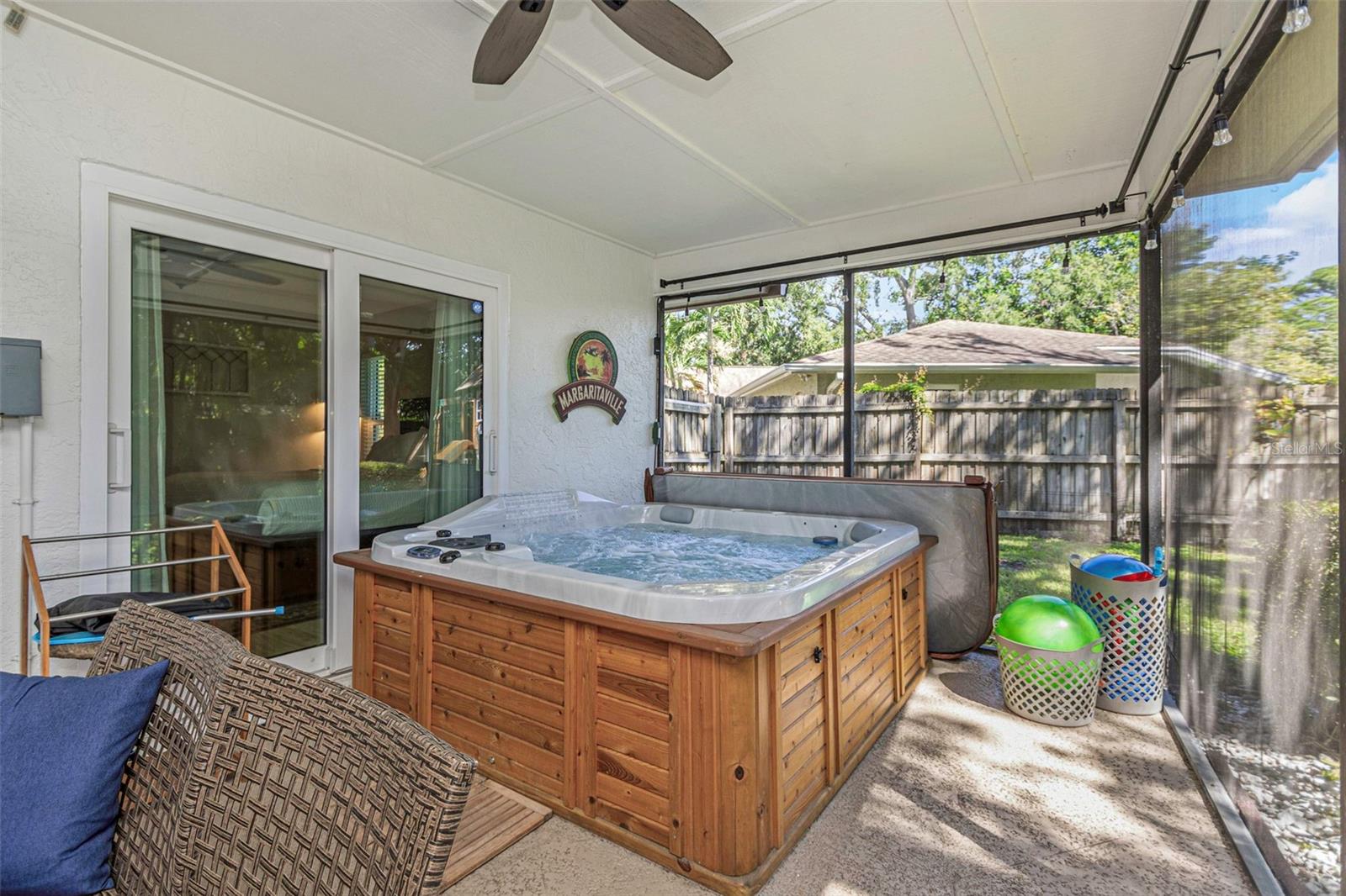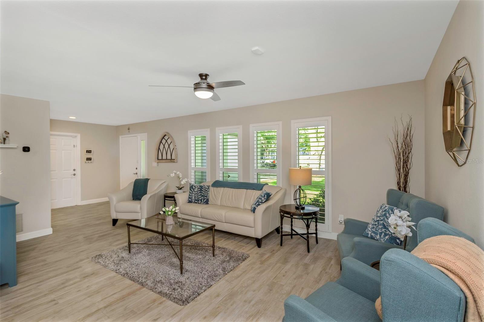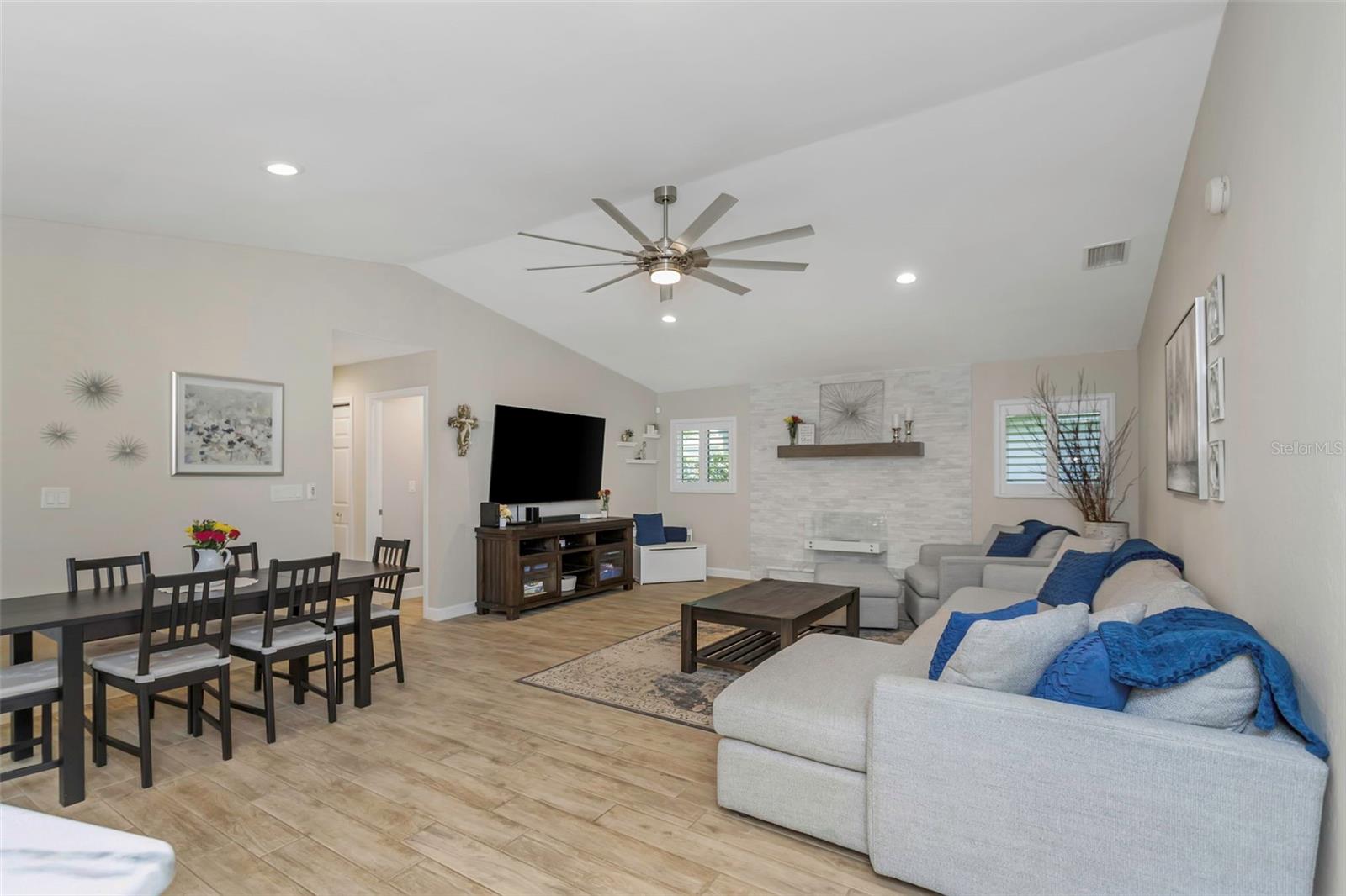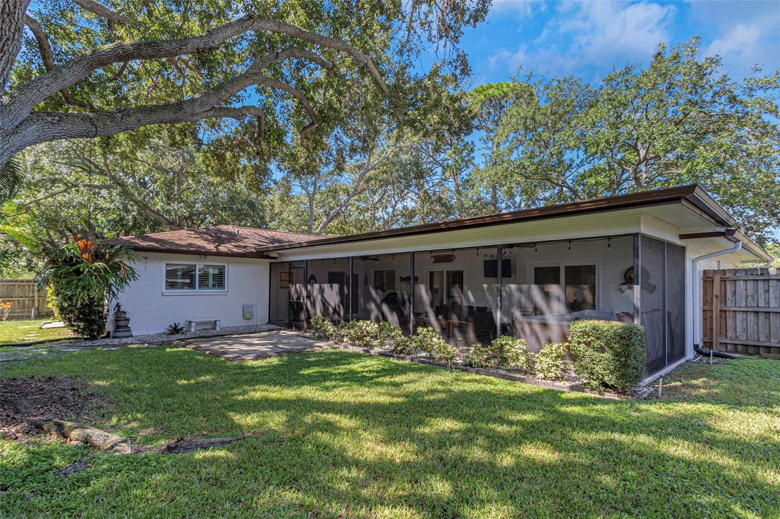 Welcome to this beautifully renovated 3-bedroom, 2-bathroom home located in the highly sought-after, exclusive golf club community of Feather Sound. Built in 1983, this meticulously maintained 2,087 sq ft block-constructed residence sits on a cul-de-sac surrounded by majestic oak trees, lush landscaping, and privacy palms. The home features a two-car garage and an oversized 396 sq ft screen-enclosed lanai complete with a 5-person luxury spa, making it ideal for year-round relaxation and entertaining. Notably, the property remained unaffected during the 2024 storms, offering valuable peace of mind. Inside, you’ll find a seamless, open flow enhanced by porcelain wood-look tile throughout the main living areas and primary suite, while newer carpeting complements the desirable split-bedroom floor plan in the second and third bedrooms. The renovated kitchen is thoughtfully designed with a raised ceiling, crown molding, recessed lighting, custom wood cabinetry with LED under-cabinet lighting, KitchenAid stainless steel appliances, a built-in wine refrigerator, and elegant calcite countertops. The spacious family/great room features a cathedral ceiling, new ceiling fan, and a custom ethanol fireplace with stacked stone, wood beam mantel, and raised hearth topped with calcite—creating a stunning focal point. All popcorn ceilings in the main living areas and primary suite have been removed and re-textured, with fresh interior paint throughout. Both the primary and secondary bathrooms have been updated with raised ceilings, recessed lighting, new tile, custom wood double-sink vanities, and calcite countertops. Additional highlights include PGT hurricane-rated impact windows and sliding glass doors (2023), Therma-Tru pedestrian garage door (2023), plantation shutters (2024), a Whirlpool Pro Series 31,000-grain water softener/filtration system (2025), newer HVAC (2022), water heater (2022), electrical panel (2021), exterior flat roof resurfacing (2021), exterior paint (2021), gutters (2020), and professionally updated landscaping with St. Augustine turf and areca palms (2020). This home offers a refined blend of rustic warmth and modern elegance with timeless finishes and thoughtful design throughout. Conveniently located near I-275 and just minutes from Tampa and St. Pete/Clearwater airports. Schedule your private showing today—this one won’t last.