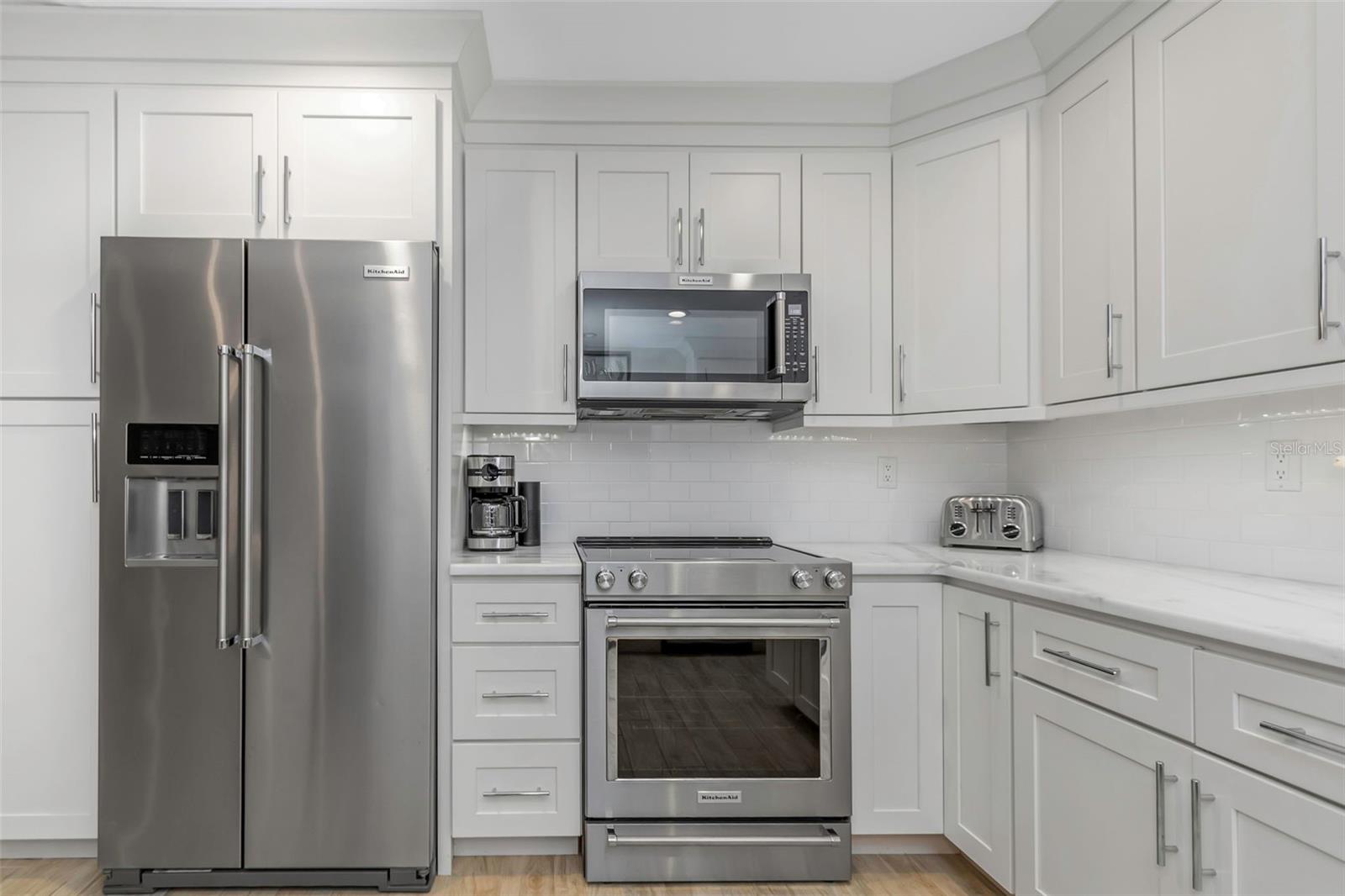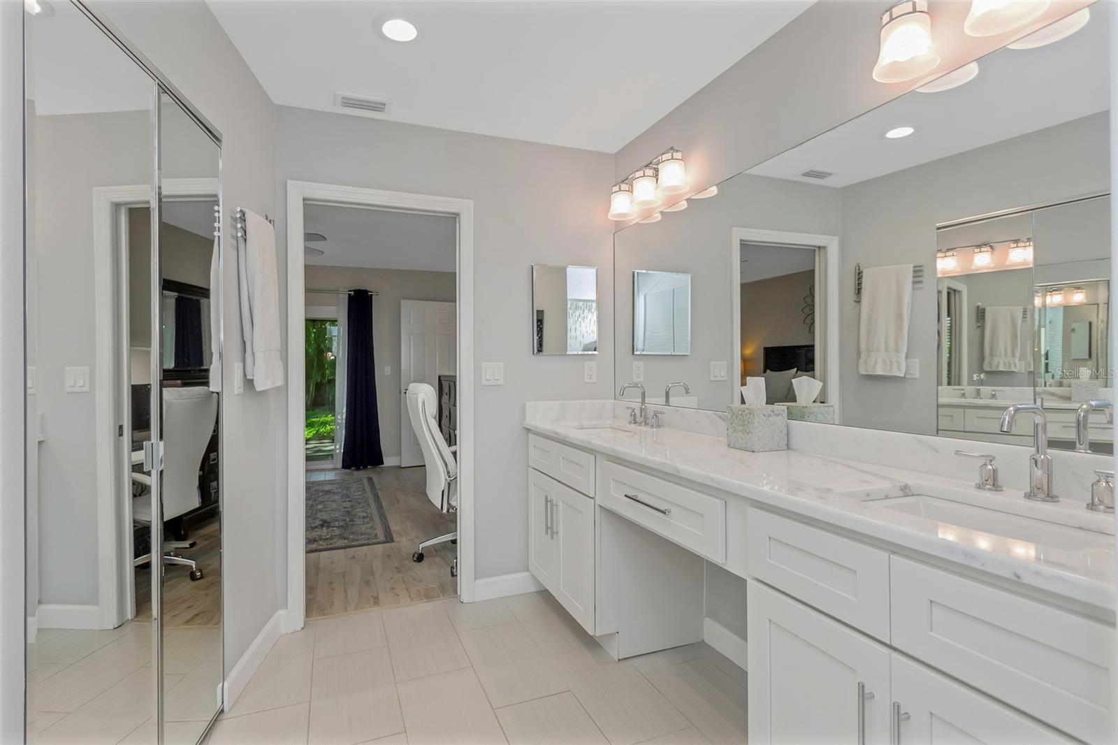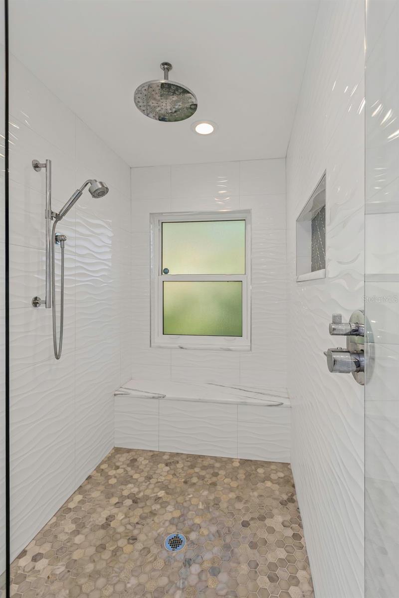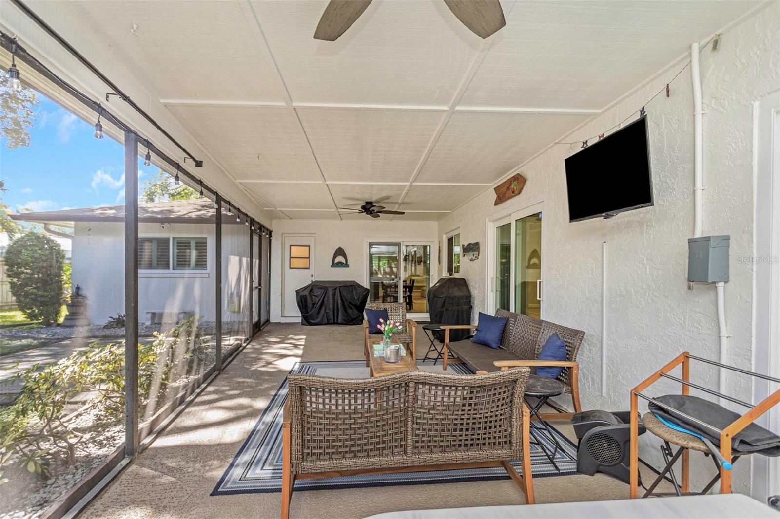 Welcome to this beautifully renovated 3-bedroom, 2-bathroom home located in the highly sought-after, exclusive golf club community of Feather Sound. Built in 1983, this meticulously maintained 2,087 sq ft block-constructed residence sits on a cul-de-sac surrounded by majestic oak trees, lush landscaping, and privacy palms. The home features a two-car garage and an oversized 396 sq ft screen-enclosed lanai complete with a 5-person luxury spa, making it ideal for year-round relaxation and entertaining. Notably, the property remained unaffected during the 2024 storms, offering valuable peace of mind. Inside, you’ll find a seamless, open flow enhanced by porcelain wood-look tile throughout the main living areas and primary suite, while newer carpeting complements the desirable split-bedroom floor plan in the second and third bedrooms. The renovated kitchen is thoughtfully designed with a raised ceiling, crown molding, recessed lighting, custom wood cabinetry with LED under-cabinet lighting, KitchenAid stainless steel appliances, a built-in wine refrigerator, and elegant calcite countertops. The spacious family/great room features a cathedral ceiling, new ceiling fan, and a custom ethanol fireplace with stacked stone, wood beam mantel, and raised hearth topped with calcite—creating a stunning focal point. All popcorn ceilings in the main living areas and primary suite have been removed and re-textured, with fresh interior paint throughout. Both the primary and secondary bathrooms have been updated with raised ceilings, recessed lighting, new tile, custom wood double-sink vanities, and calcite countertops. Additional highlights include PGT hurricane-rated impact windows and sliding glass doors (2023), Therma-Tru pedestrian garage door (2023), plantation shutters (2024), a Whirlpool Pro Series 31,000-grain water softener/filtration system (2025), newer HVAC (2022), water heater (2022), electrical panel (2021), exterior flat roof resurfacing (2021), exterior paint (2021), gutters (2020), and professionally updated landscaping with St. Augustine turf and areca palms (2020). This home offers a refined blend of rustic warmth and modern elegance with timeless finishes and thoughtful design throughout. Conveniently located near I-275 and just minutes from Tampa and St. Pete/Clearwater airports. Schedule your private showing today—this one won’t last.
