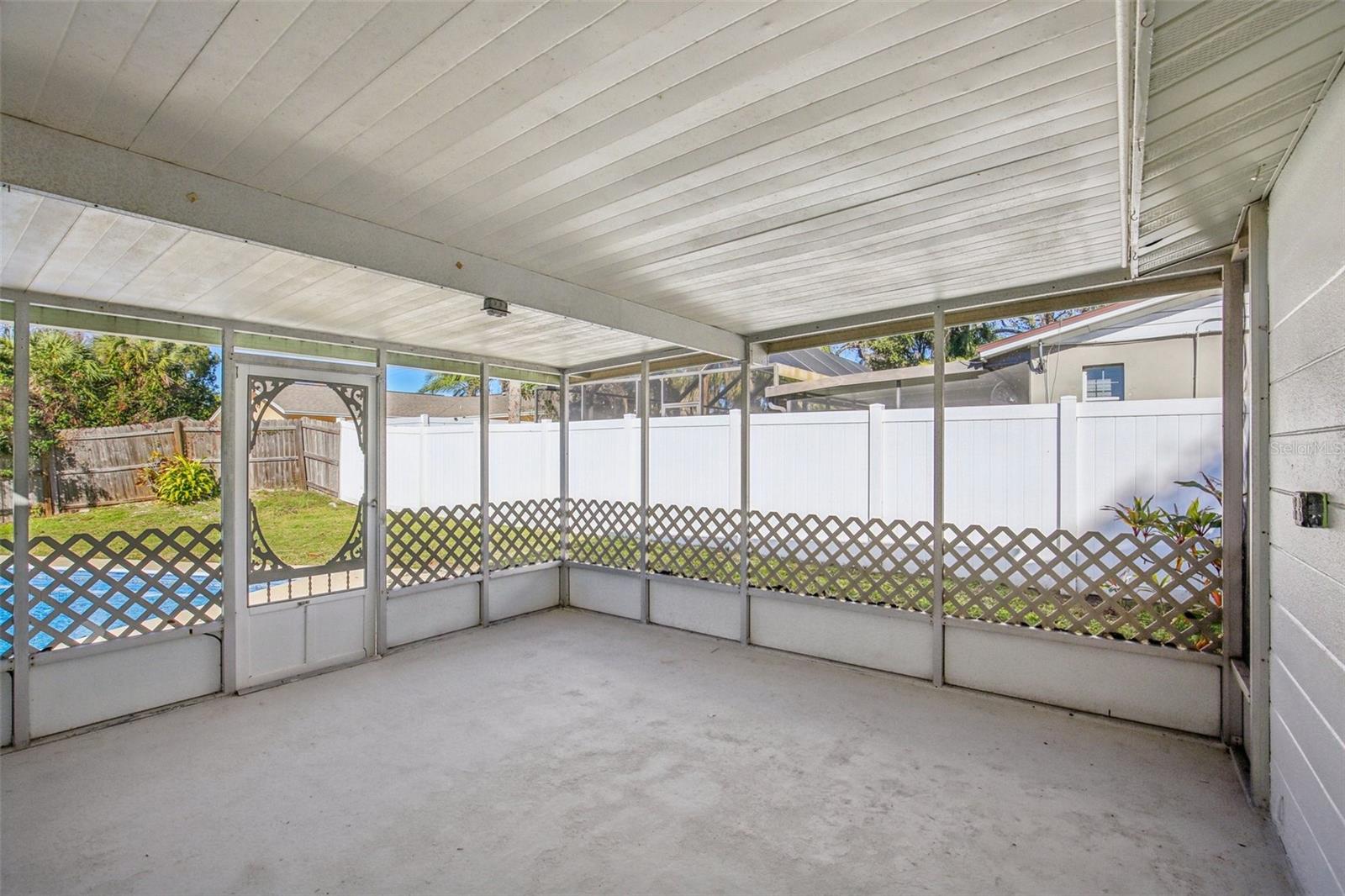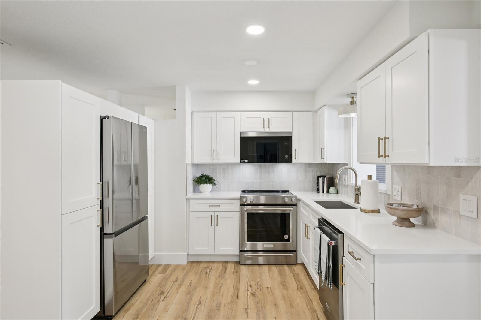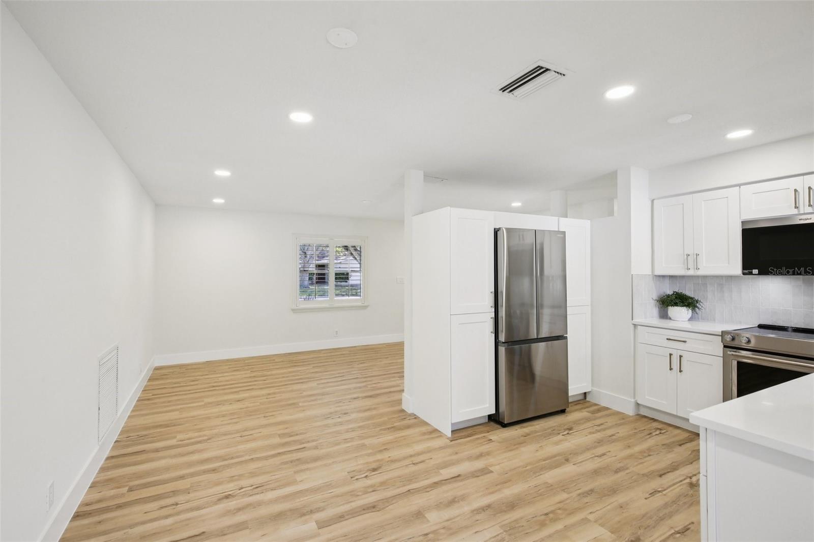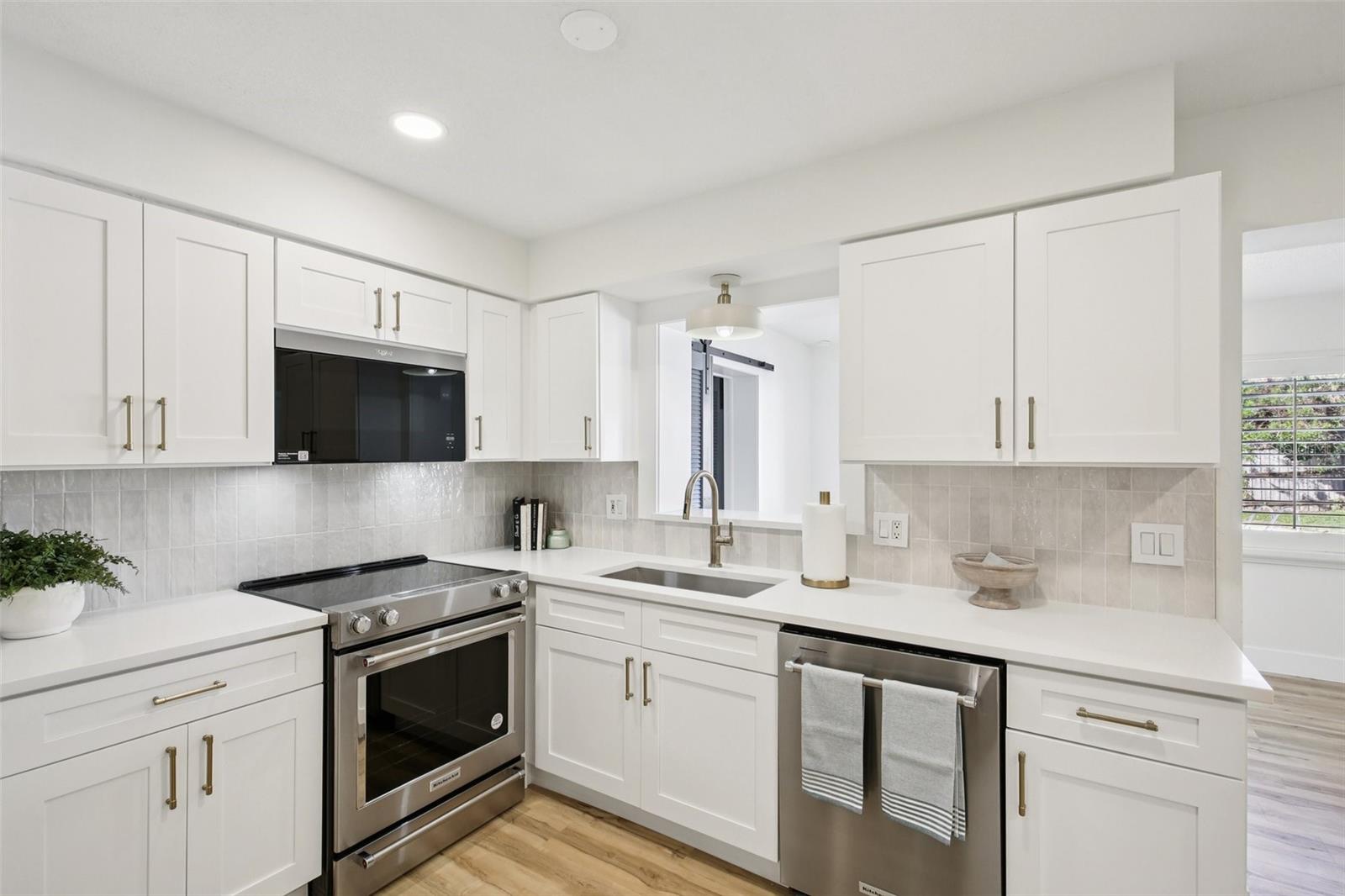 Fully renovated and move-in ready, this 3-bedroom, 2-bath pool home offers modern finishes, a functional layout, and effortless Florida living — all located in Flood Zone X (no flood insurance required). Updated in 2025, the home features luxury vinyl plank flooring, fresh neutral paint, recessed lighting, and updated fixtures throughout. The completely renovated kitchen showcases shaker-style cabinetry, sleek countertops, a clean tile backsplash, and brand-new stainless steel appliances, including a KitchenAid range and dishwasher, Samsung refrigerator, and Whirlpool microwave/vent. The kitchen opens seamlessly to the living and dining areas, creating an ideal layout for everyday living and entertaining. The primary suite includes a beautifully remodeled en-suite bathroom with dual-sink vanity, designer tile shower, modern fixtures, and a custom walk-in closet system. Two additional bedrooms are well sized and share a fully updated guest bathroom. Step outside to a private, fenced backyard featuring an oversized in-ground pool, newly resurfaced in 2025, along with a covered and screened patio — perfect for entertaining, relaxing, or enjoying year-round Florida weather. The lot extends beyond the back fence, offering additional space that can be cleared and customized. Major upgrades include a new roof (2025), A/C (2022), updated windows, and a newer electrical panel. Additional features include a 1-car garage and an indoor laundry room. Located in Clearwater and situated on the edge of Dunedin, just minutes from downtown Dunedin, Clearwater beaches, shopping, dining, and major roadways, this turn-key home is ideal as a primary residence, second home, or investment opportunity.