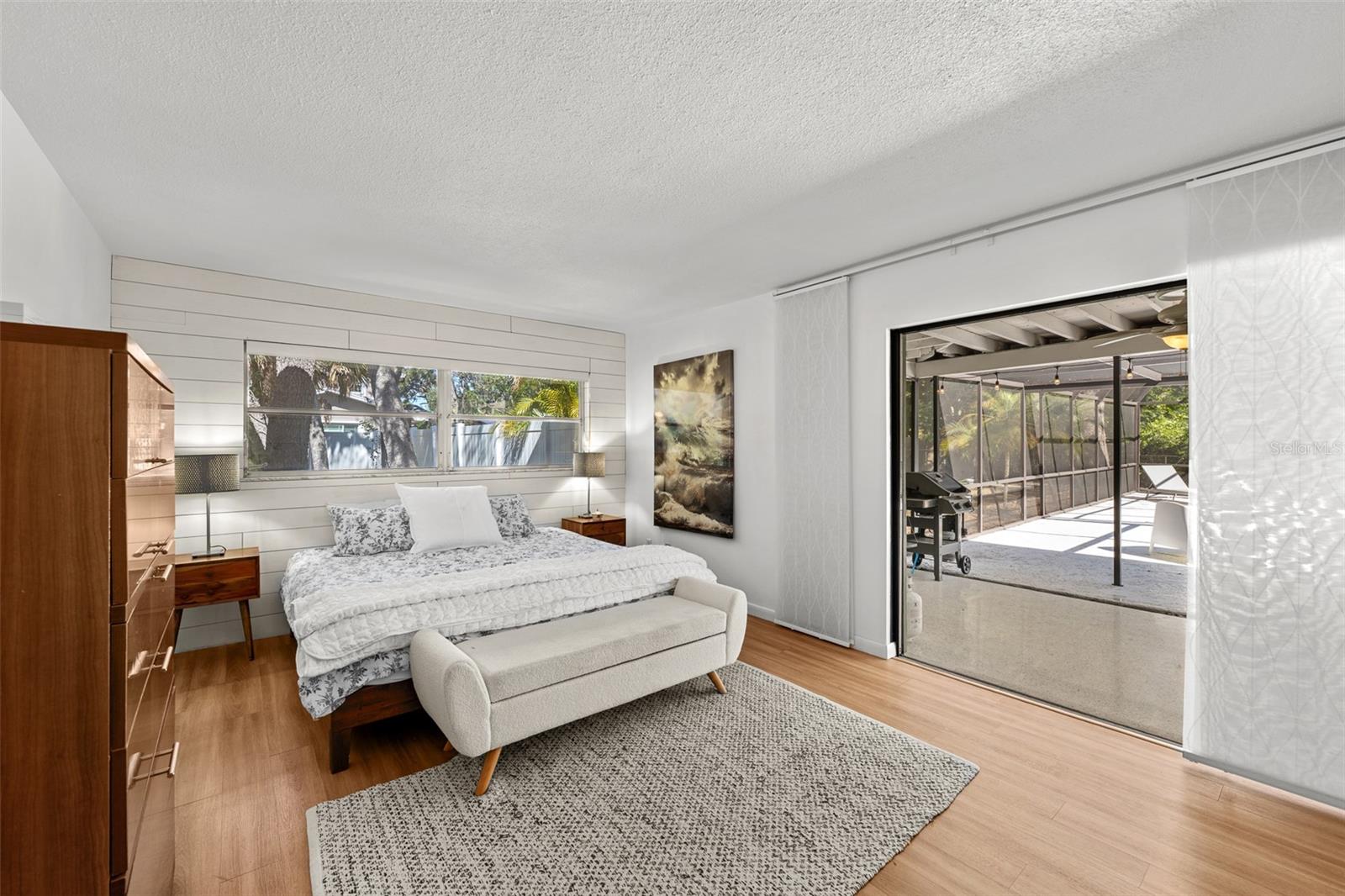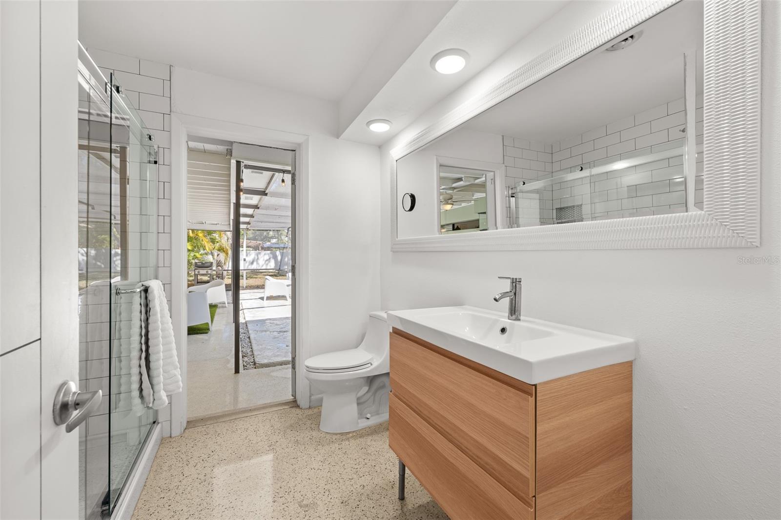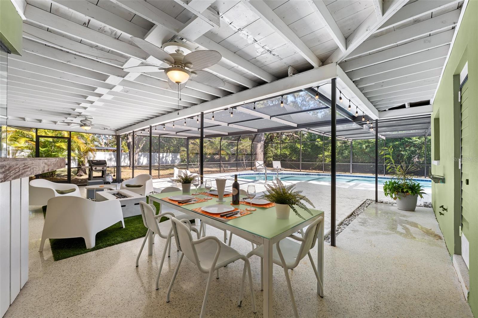 Discover your private sanctuary in Clearwater, perfectly situated on an expansive half-acre lot shaded by beautiful mature oak trees and palm trees. This striking 4-bedroom, 3-bathroom mid-century modern pool residence showcases a bright and open floorplan grounded by durable terrazzo and luxury vinyl plank flooring throughout. The interior is designed for modern entertaining, featuring both a spacious family room and a separate living room, all accentuated by large windows and sliding glass doors. The entertaining kitchen boasting sleek quartz countertops, a glass tile backsplash, stainless steel appliances, a chic dry bar complete with a wine fridge, and an inlaid sink overlooking the pool through a pass through glass window. The desirable split bedroom layout ensures absolute privacy for the primary suite, which along with the living and dining rooms, features large sliding glass doors that dissolve the line between indoors and outdoors. The outdoor amenities are unmatched, featuring a dedicated pool bathroom and a massive backyard complemented by a golf tee box and a vinyl privacy fence, offering ample space for relaxation and play in this one-of-a-kind oasis. All this conveniently located in central Clearwater just a short trip to many desirable dining and entertainment destinations such as Ruth Eckard Hall, BayCare Sound, the Clearwater beaches, and the St. Pete-Clearwater International Airport.