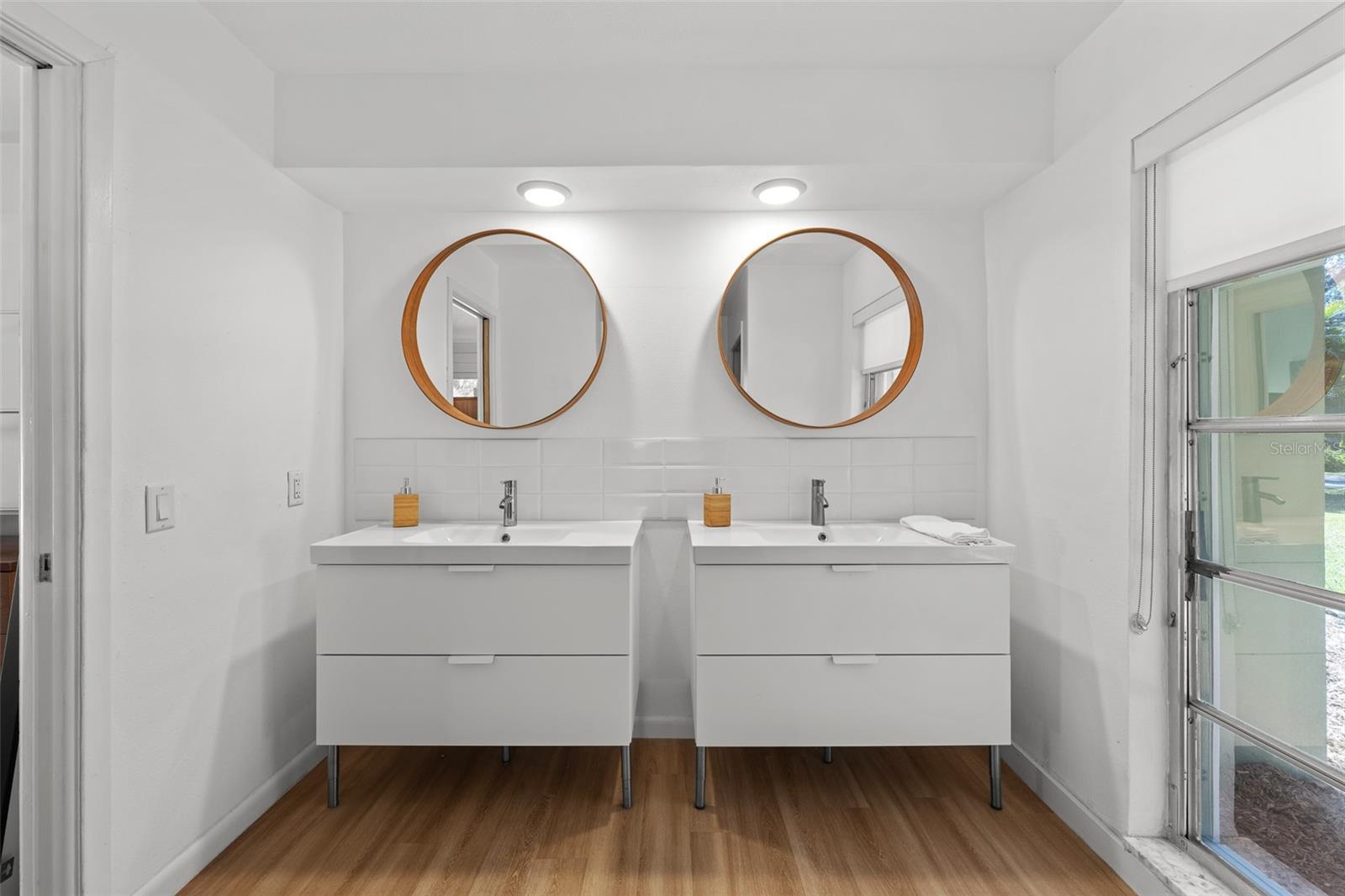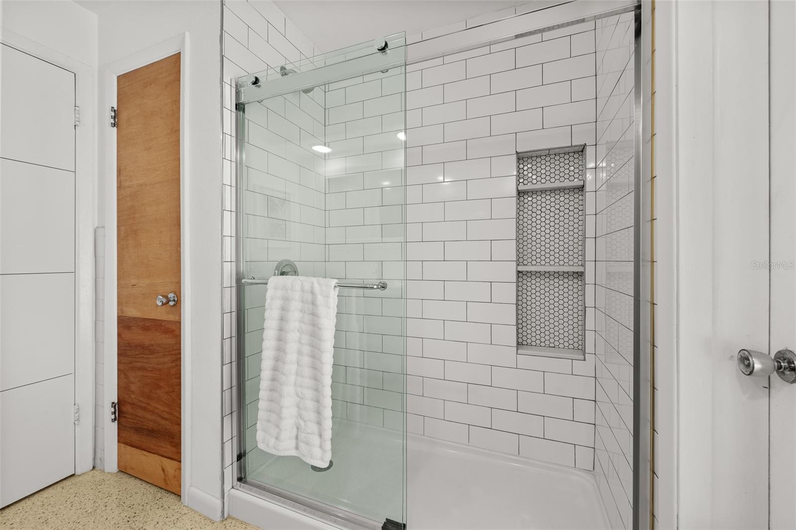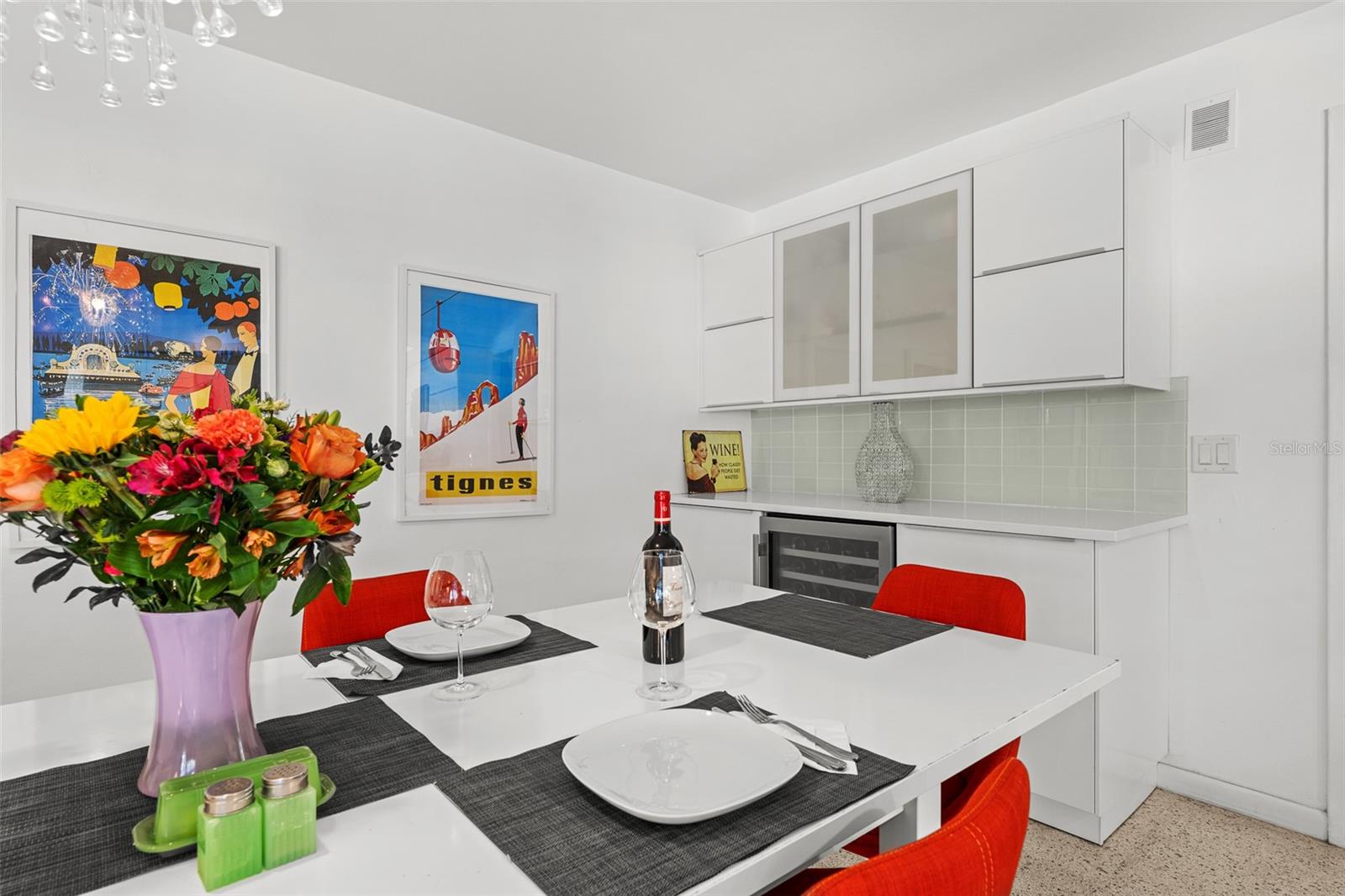 Discover your private sanctuary in Clearwater, perfectly situated on an expansive half-acre lot shaded by beautiful mature oak trees and palm trees. This striking 4-bedroom, 3-bathroom mid-century modern pool residence showcases a bright and open floorplan grounded by durable terrazzo and luxury vinyl plank flooring throughout. The interior is designed for modern entertaining, featuring both a spacious family room and a separate living room, all accentuated by large windows and sliding glass doors. The entertaining kitchen boasting sleek quartz countertops, a glass tile backsplash, stainless steel appliances, a chic dry bar complete with a wine fridge, and an inlaid sink overlooking the pool through a pass through glass window. The desirable split bedroom layout ensures absolute privacy for the primary suite, which along with the living and dining rooms, features large sliding glass doors that dissolve the line between indoors and outdoors. The outdoor amenities are unmatched, featuring a dedicated pool bathroom and a massive backyard complemented by a golf tee box and a vinyl privacy fence, offering ample space for relaxation and play in this one-of-a-kind oasis. All this conveniently located in central Clearwater just a short trip to many desirable dining and entertainment destinations such as Ruth Eckard Hall, BayCare Sound, the Clearwater beaches, and the St. Pete-Clearwater International Airport.