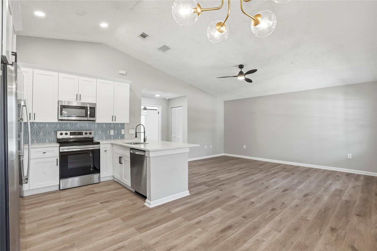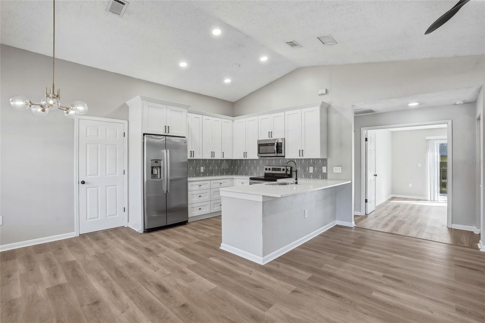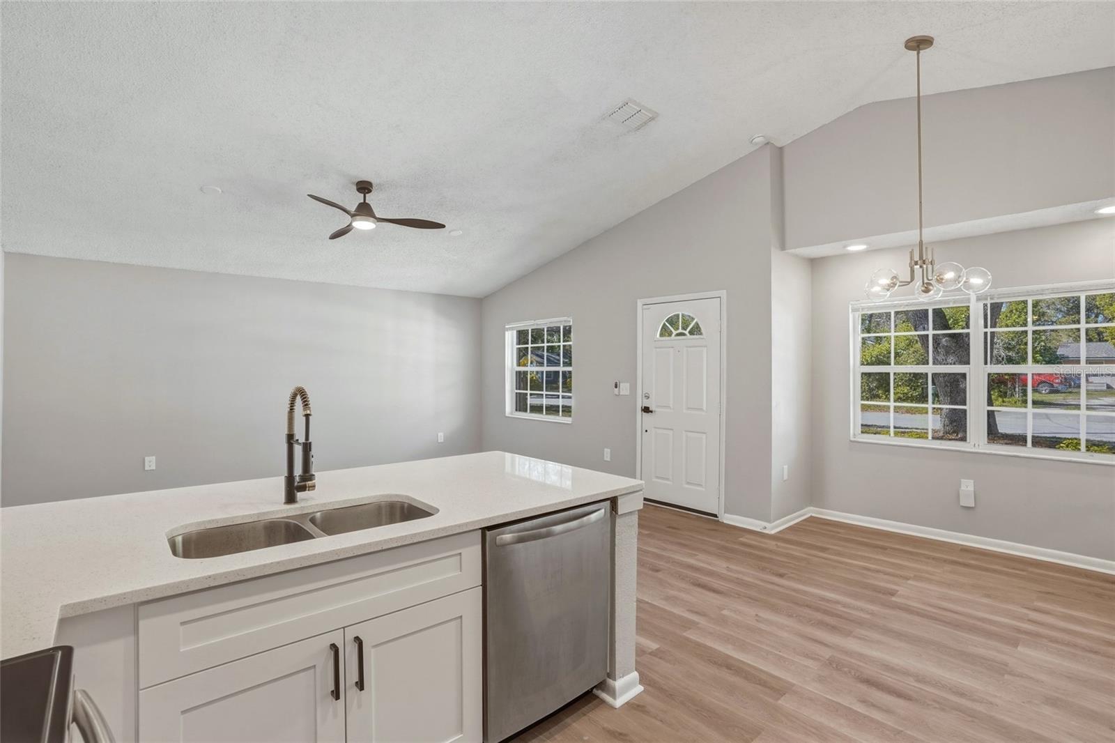 Excellent buying opportunity located in a desirable NO flood zone! This well-maintained two bedroom, two bathroom home features a one car garage and an open floor plan with vaulted ceilings in the kitchen and living area, creating a bright and spacious feel. The beautifully renovated kitchen offers custom-designed cabinetry, quartz countertops, and stainless steel appliances. Both bathrooms have been tastefully updated, complemented by luxury vinyl flooring throughout the main living areas and ceramic tile in the bathrooms. The second bedroom features double-door entry with glass sliders leading to a wood deck and overlooks a large backyard, perfect for relaxing or entertaining. Additional highlights include a newer shingle roof, a spacious primary bedroom with a private en-suite bath, and a prime location close to shopping, dining, and local restaurants. Enjoy easy access to the Gulf Beaches, just a short drive away. Come and see this beautiful home today and make it yours tomorrow!