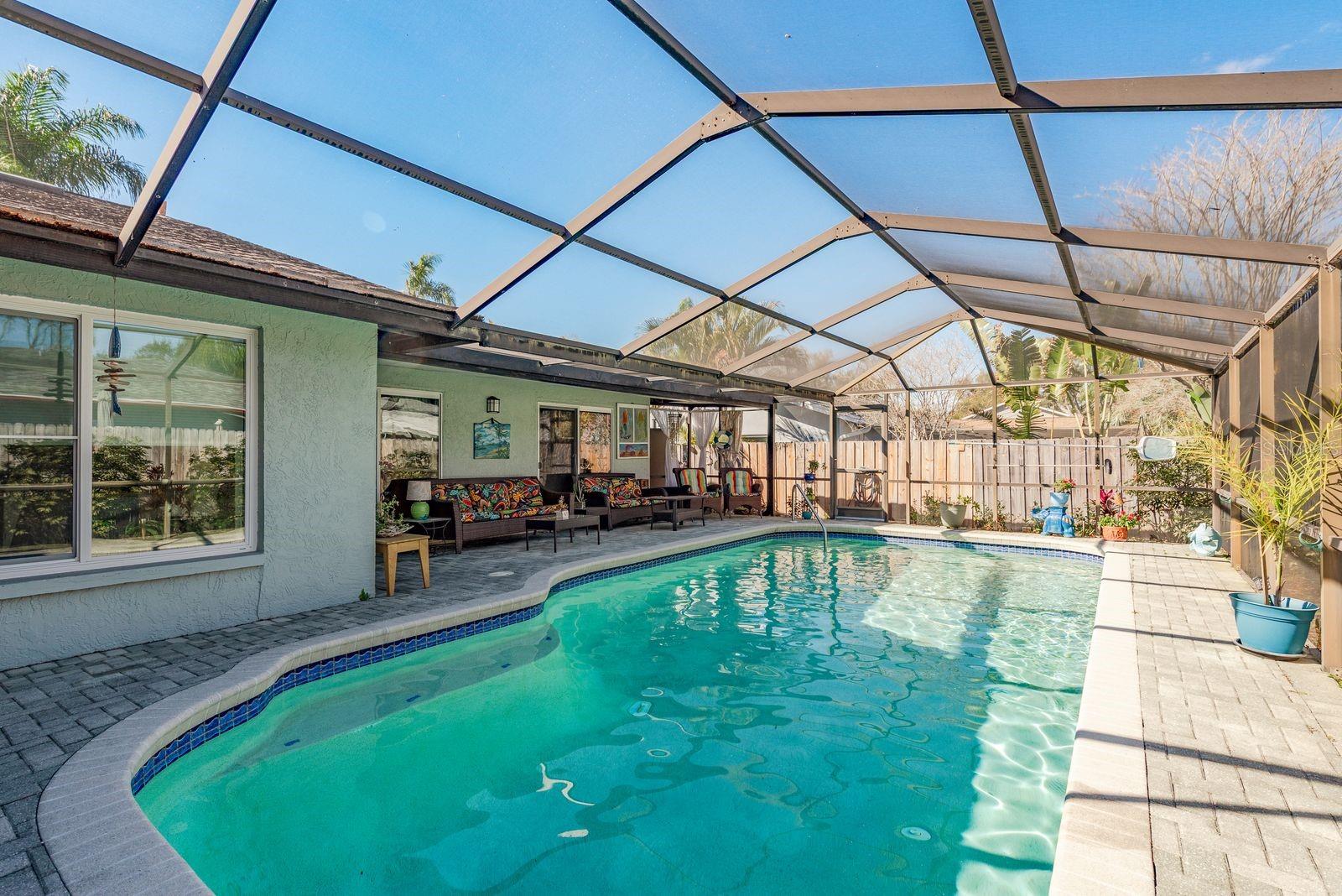 Welcome to 2011 Del Betmar Road in Clearwater, Florida — a beautifully maintained 3 bedroom, 2 bath, 2 car garage pool home located in a non-flood zone and centrally positioned near everything Tampa Bay has to offer. This move-in ready Clearwater residence combines thoughtful updates, open living spaces, and a private screened pool area with covered spaces to create the perfect Florida lifestyle property. The beautiful kitchen features white cabinetry, granite countertops, stainless steel appliances, recessed lighting, and a convenient pass-through to the dining area. Just off the kitchen, you’ll find a charming built-in coffee bar and beverage station with cabinetry and display shelving — perfectly positioned to overlook the pool area through large windows, creating a bright and inviting morning retreat. The kitchen opens seamlessly to the family room and breakfast bar, offering an ideal flow for entertaining and everyday living. The formal living and dining rooms feature sliding glass doors leading to the covered lanai and screened pool, allowing natural light to fill the home and providing true indoor-outdoor living. The spacious primary suite offers private sliders to the pool, a walk-in closet, and an ensuite bath with dual sinks and a beautifully tiled walk-in shower with glass enclosure. Two additional bedrooms share a full bathroom with a tub/shower combo that also functions as a convenient pool bath. An inside utility room with extra storage and utility sink adds functionality and convenience. Step outside to your screened-in pool and covered paver patio — ideal for relaxing, entertaining, and enjoying Florida’s year-round sunshine. The fully fenced yard offers privacy, and a private well for the sprinkler system provides significant savings on irrigation costs. Major updates provide peace of mind, including a roof replaced in 2017, updated impact windows and doors in 2024, a new garage door in 2024, a new water softener in 2025, and a new salt cell for the pool in 2023. Located in a non-evacuation, non-flood zone, this home offers added security and long-term value. 2011 Del Betmar Road is centrally located near Clearwater Beach, Dunedin, Safety Harbor, and Tampa. Enjoy quick access to the Pinellas Trail, Countryside Mall, top-rated restaurants, shopping, parks, golf courses, Clearwater Mall, and medical facilities including Morton Plant Hospital. Both Tampa International Airport and St. Pete–Clearwater International Airport are within easy reach, making travel convenient. If you are searching for a Clearwater pool home with impact windows, updated systems, an inviting coffee bar with pool views, and a prime central location near beaches and amenities, this property delivers exceptional value and the best of Florida living. Call today for your private tour.