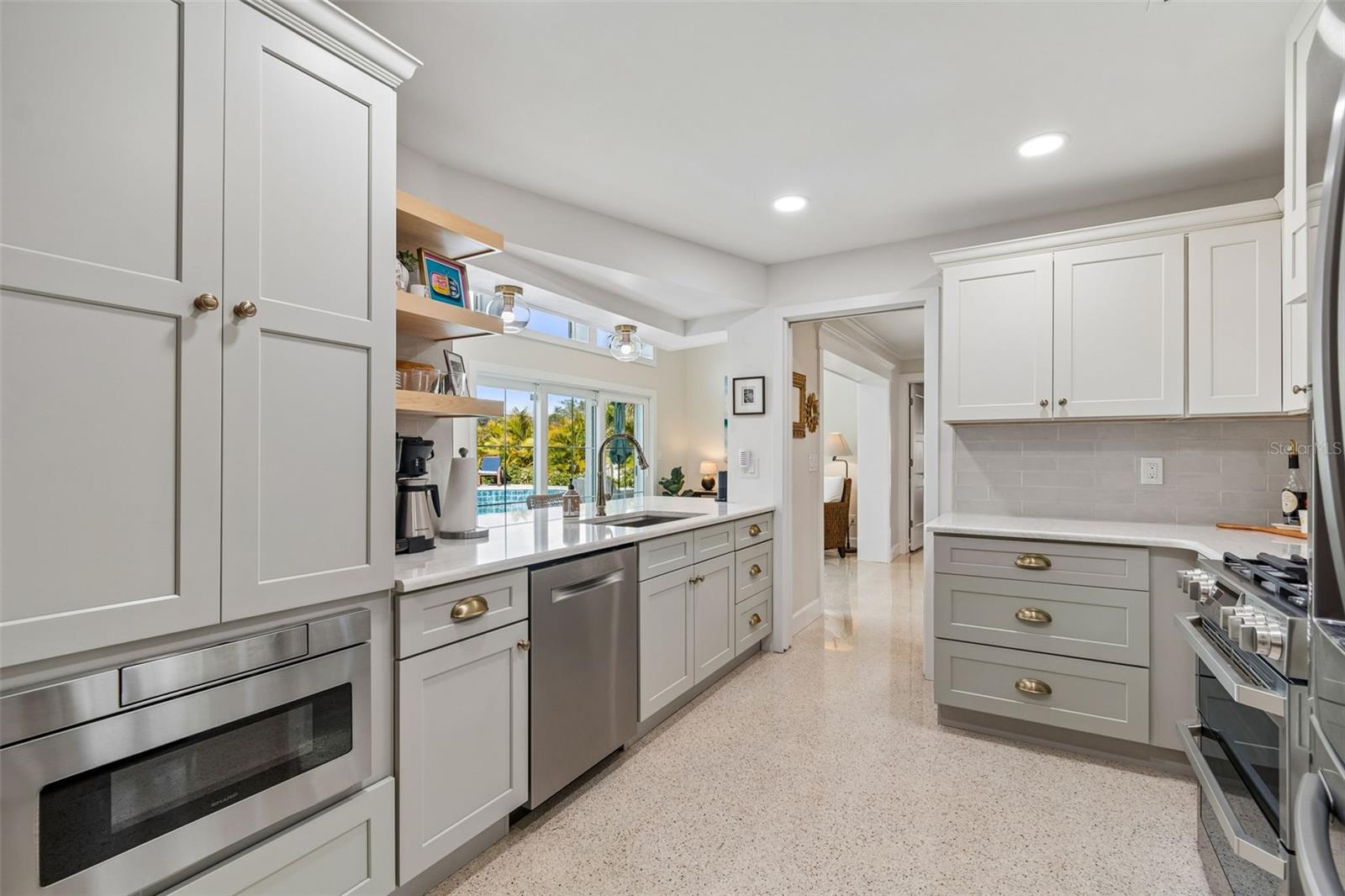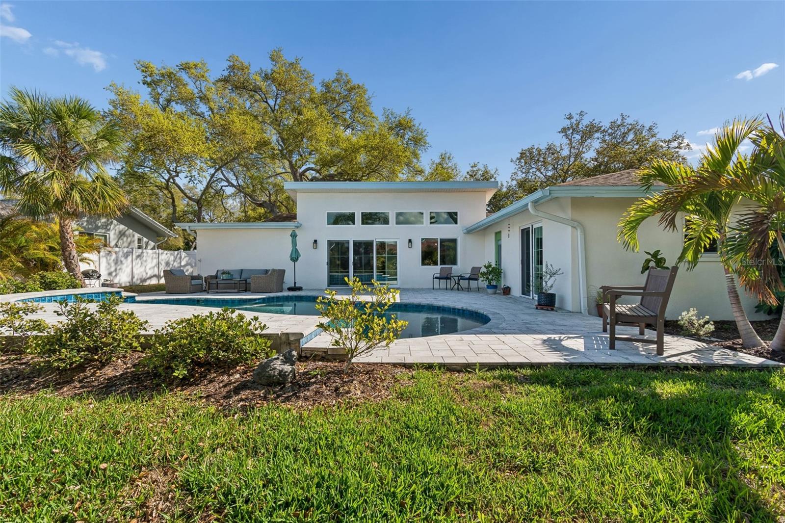 Situated beneath a canopy of mature oaks in the highly sought-after Del Oro Groves neighborhood, this beautifully updated residence offers 4 bedrooms, 3 bathrooms, a 2-car garage, and 2,307 heated square feet (2,838 total). Designed for comfort and functionality, the spacious split-bedroom floor plan is filled with natural light and features rare terrazzo flooring throughout the main living areas, fresh interior paint, crown molding, new interior doors, and updated trim completed in 2022. The renovated kitchen includes new cabinetry, granite countertops, pantry storage, modern appliances, and a gas range. An inside laundry room with utility sink and gas dryer adds everyday convenience. The primary suite offers custom wall detailing and two generous walk-in closets, while all three bathrooms have been updated with new tile showers, vanities, fixtures, lighting, and mirrors. A Jack-and-Jill bath retains a tub for flexibility. A standout feature of the home is the redesigned Florida room, showcasing a high ceiling with impact-rated transom windows and sliding doors that open to the backyard. Outside, the completely renovated pool and patio (2022) create a private outdoor retreat with paver decking, sun shelf with umbrella holder, bubbler, LED lighting, variable-speed pump, and new filtration system. Extensive exterior improvements include new stucco and paint, impact-rated windows at the front and poolside, impact sliders in the Florida room and rear bedroom, custom aluminum Bermuda shutters, new aluminum gutters with leaf guards, updated landscaping with new sod, and a sprinkler system supplied by both well and gray water. A new potable water line to the home was also installed. The garage has been upgraded with a hurricane-rated door, Spartan floor coating, new electrical panel, electric vehicle charger, and tankless gas water heater. Ideally located near Downtown Safety Harbor, this home is a short bike ride to shops, dining, and waterfront parks, within walking distance to Ruth Eckerd Hall, Del Oro Park, and the Ream Wilson Trail, and approximately 20 minutes to Tampa International Airport. This move-in-ready property offers a rare opportunity to enjoy a thoughtfully updated home in one of Clearwater’s most desirable established neighborhoods.