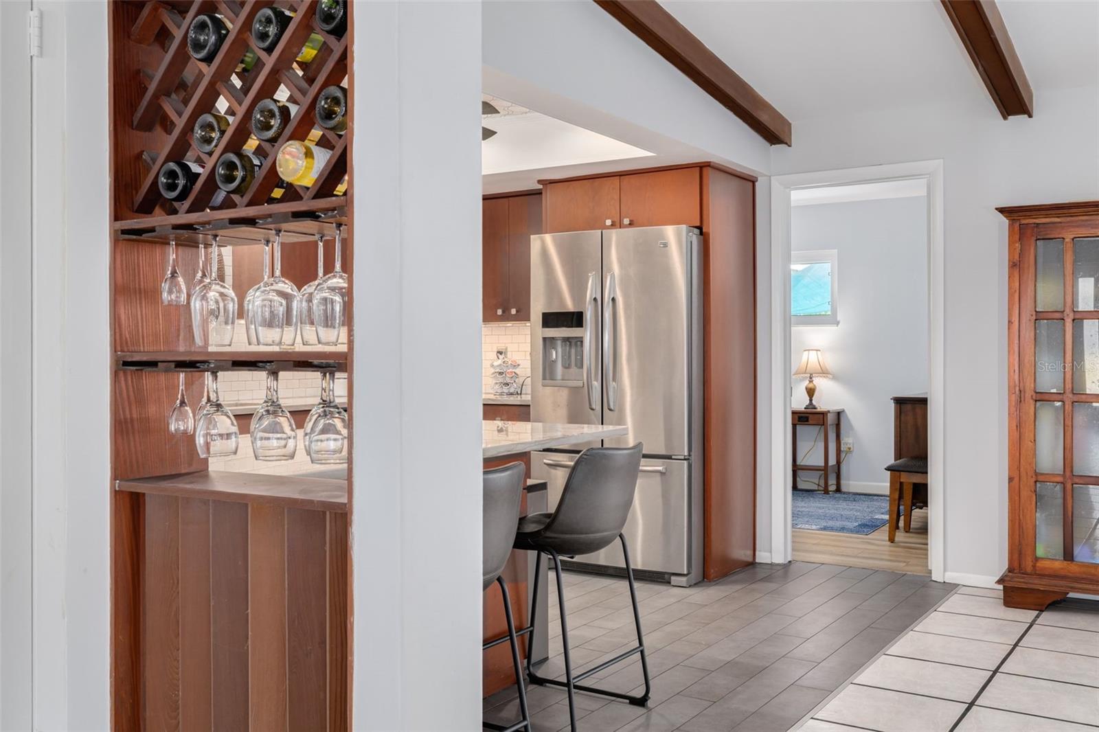 Located in the highly desirable Del Oro Groves neighborhood, this beautifully maintained home offers the perfect blend of character, comfort, and thoughtful updates, complete with a spacious two-car garage. As you enter through the double front doors, you’re immediately welcomed by striking cathedral-style coffered ceilings soaring to approximately 10 feet at the peak, creating an open and inviting feel throughout the main living space. The spacious living room flows seamlessly into a separate dining area. The kitchen offers smooth wood cabinetry, stunning stone countertops, stainless steel appliances, under cabinet lighting and a tile backsplash. The split floor plan provides added privacy, with a generously sized primary suite featuring an en-suite bath with a large walk-in shower and dual vanities. Two guest bedrooms are situated on the opposite side of the home. Relax and unwind in the Florida room overlooking the pool, complete with a tranquil waterfall feature. The screened (caged) pool area is complemented by beautifully landscaped front and back spaces, offering both privacy and room to enjoy the outdoors. Additional highlights include hurricane impact windows and slider, a new roof (April 2026), HVAC (2019), water heater (2021), water softener, and a flat roof replaced in 2022. Just across from Cooper’s Bayou Park, residents enjoy access to fishing, scenic trails, an exercise course, and a launch for kayaks or canoes. Del Oro Park features pickleball courts, a playground, and basketball courts, while the Ream Wilson Trail invites outdoor enthusiasts to explore picturesque routes leading to Safety Harbor or Tampa via the Courtney Campbell Causeway. Hop in your golf cart and head to downtown Safety Harbor, where Main Street offers dining, boutique shopping, breweries, live music, and year-round events like the Third Friday Street Festival and Sunday Farmers Market. The Safety Harbor Marina and the world-renowned Safety Harbor Resort and Spa are just minutes away. Best of all, this home is not located in a required flood insurance zone. This is a rare opportunity to own a move-in-ready home in one of Clearwater’s most sought-after neighborhoods.
