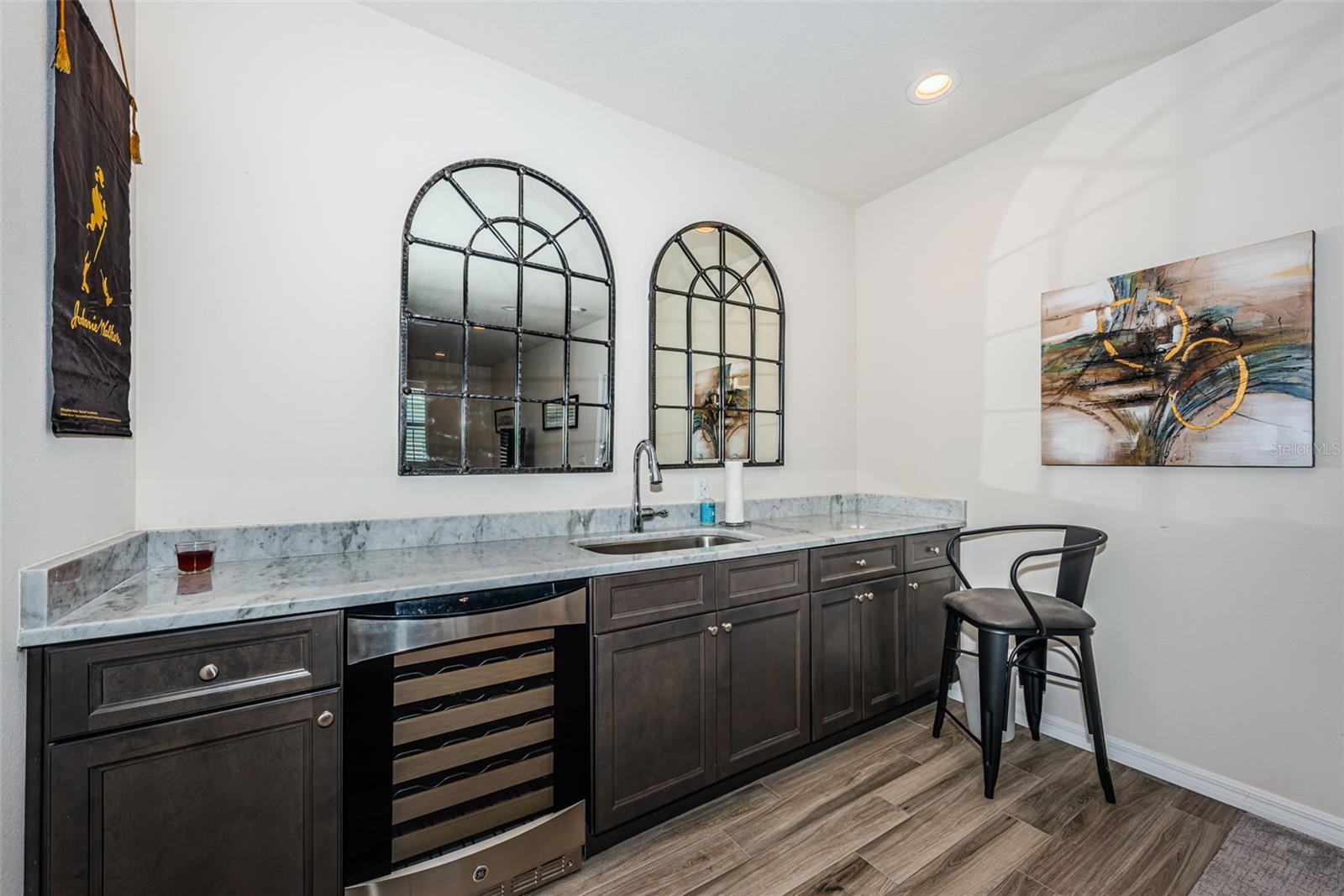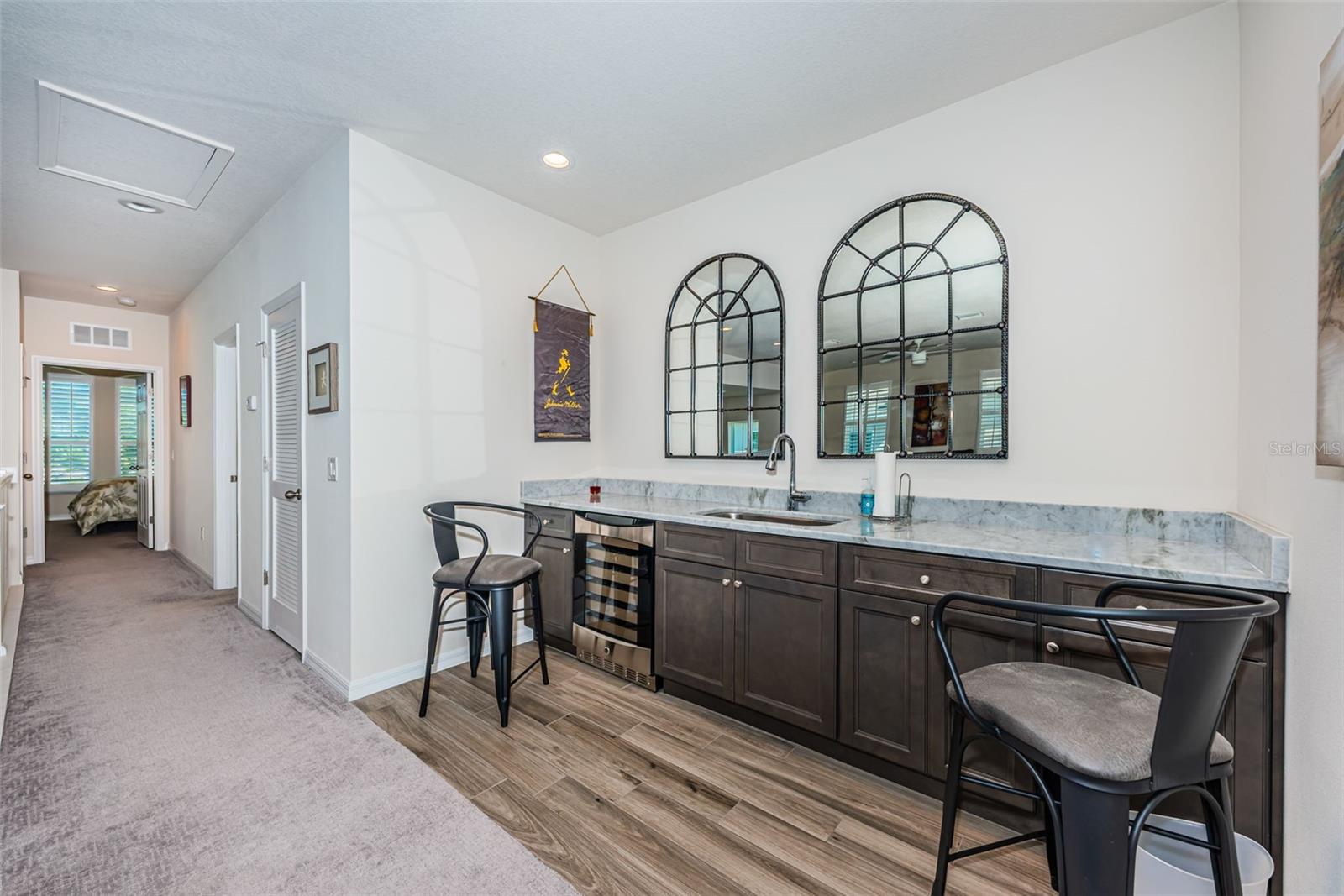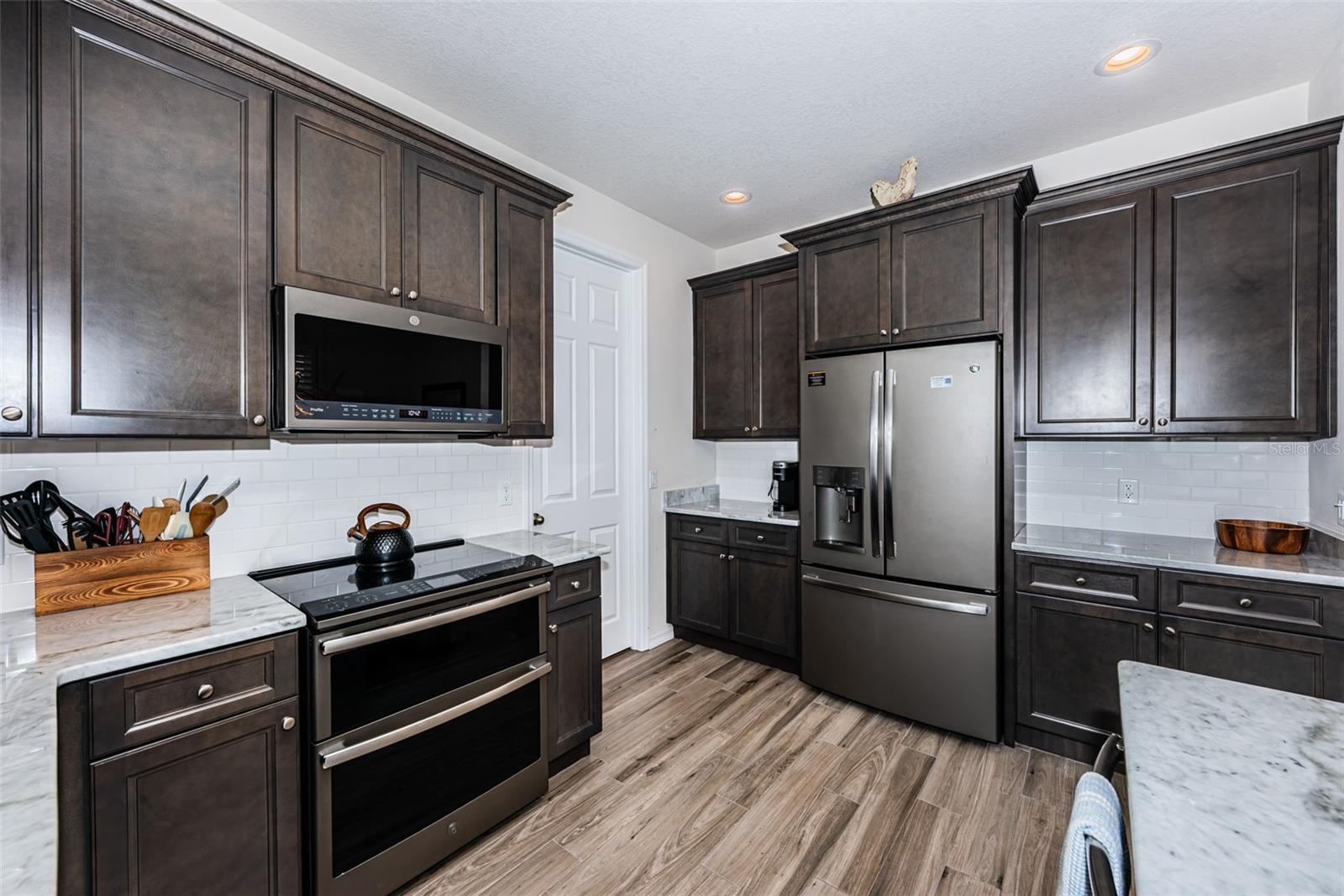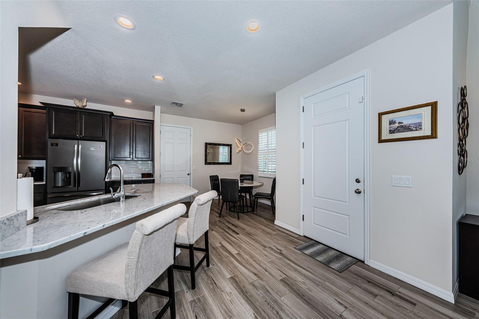 Welcome to an exquisite gated community that redefines luxury living: 2018-constructed “Montclair Lake Townhomes” (only 88 units) in NO FLOOD & NON EVACUATION zone offer a hassle-free lifestyle with peace of mind! Don't miss out on this FULLY FURNISHED 2283 htd. sqft 3-bedroom 2.5-bath 2-car garage END UNIT (“Condor Model”) overlooking a quaint pond from the private, screened porch – watching wildlife like ducks, Sandhill cranes, otters and turtles. This lavish home boasts a DOWNSTAIRS PRIMARY BEDROOM with a luxurious EN-SUITE BATH, double vanities, tub with separate shower, walk-in-& wall closets. Stunning wood cabinetry and beautiful Granite counter tops in attractive & functional Eat-in kitchen, GE stainless steel appliances & Samsung washer/dryer in adjacent laundry room. More features include: downstairs modern plank tile flooring and upgraded carpets in bedrooms, “Hunter Douglas” remote-controlled blinds & sophisticated interior wooden shutters on all windows, ceiling fans throughout, a handy under-staircase storage room, 9ft & 18ft ceilings, Rheem A/C & Aluminum hurricane shutters (stored in garage). The generously-sized upstairs loft area offers the option to TRANSFORM INTO A 4th BEDROOM – it currently serves as an inviting living/ TV room with stylish, long wet bar and wine cooler - enjoy your daily “Happy Hour!” $439.- monthly maintenance fee covers Internet/ WIFI, roof- and building maintenance, lawn care, landscape, irrigation, security gate, a refreshing community pool with Cabana, barbecue & a walking path (Owner pays for water/sewer/trash/power). 2 LARGE PETS and ANNUAL RENTALS OK! Experience grand living nestled in the vibrant heart of Clearwater, minutes to excellent schools, Publix & Walgreens, medical offices, Countryside Mall/ shopping, dining, beautiful parks with hiking trails, sports venues & ball parks, the artsy downtowns of Safety Harbor and Dunedin, Fred Marquis Pinellas Trail, Ruth Eckerd Hall theater, a short ride to Tampa Bay International Airport, and 20 minutes' drive to world-famous Clearwater Beach, ranking among the top beaches in the nation. Hurry, don't let this beauty get away – exceptional value!