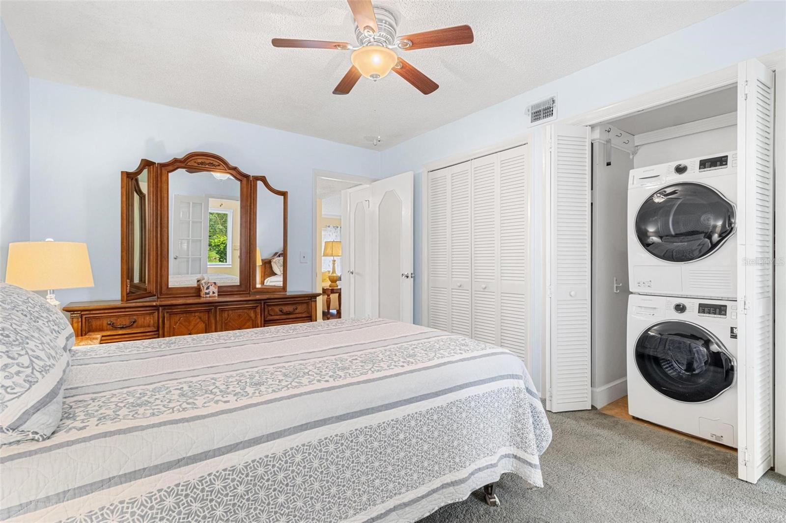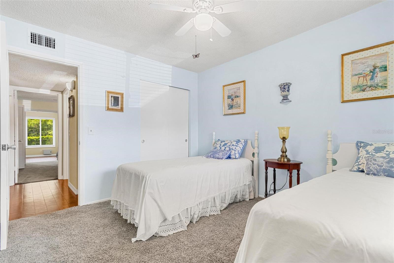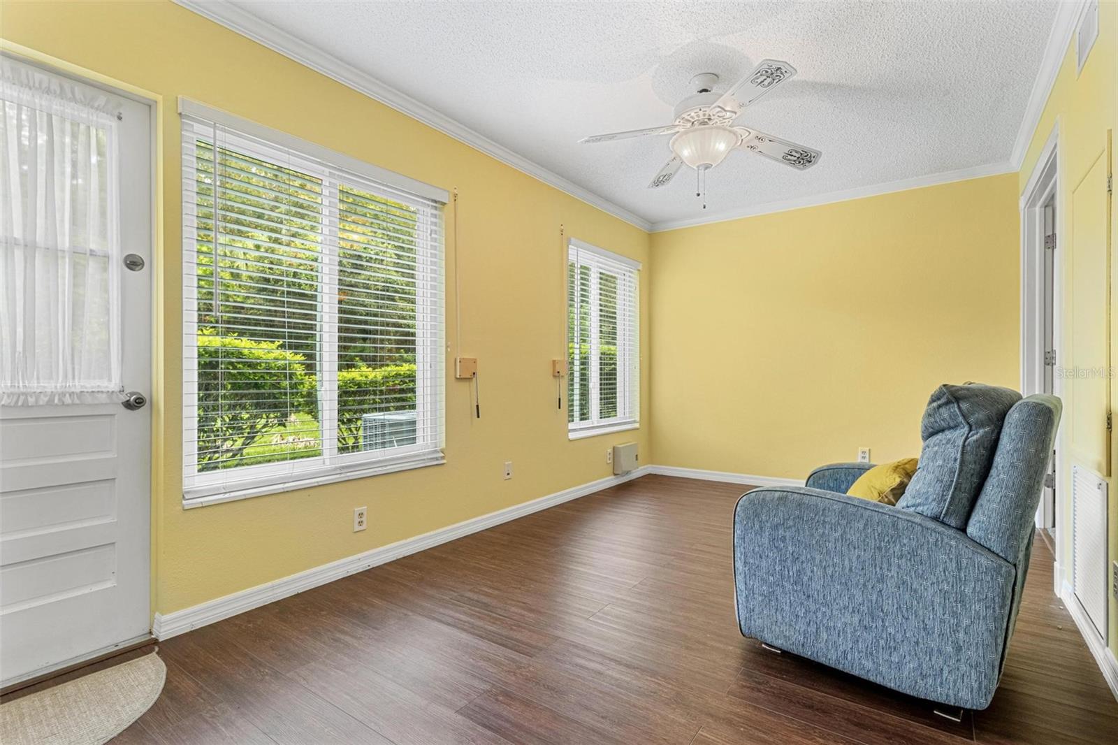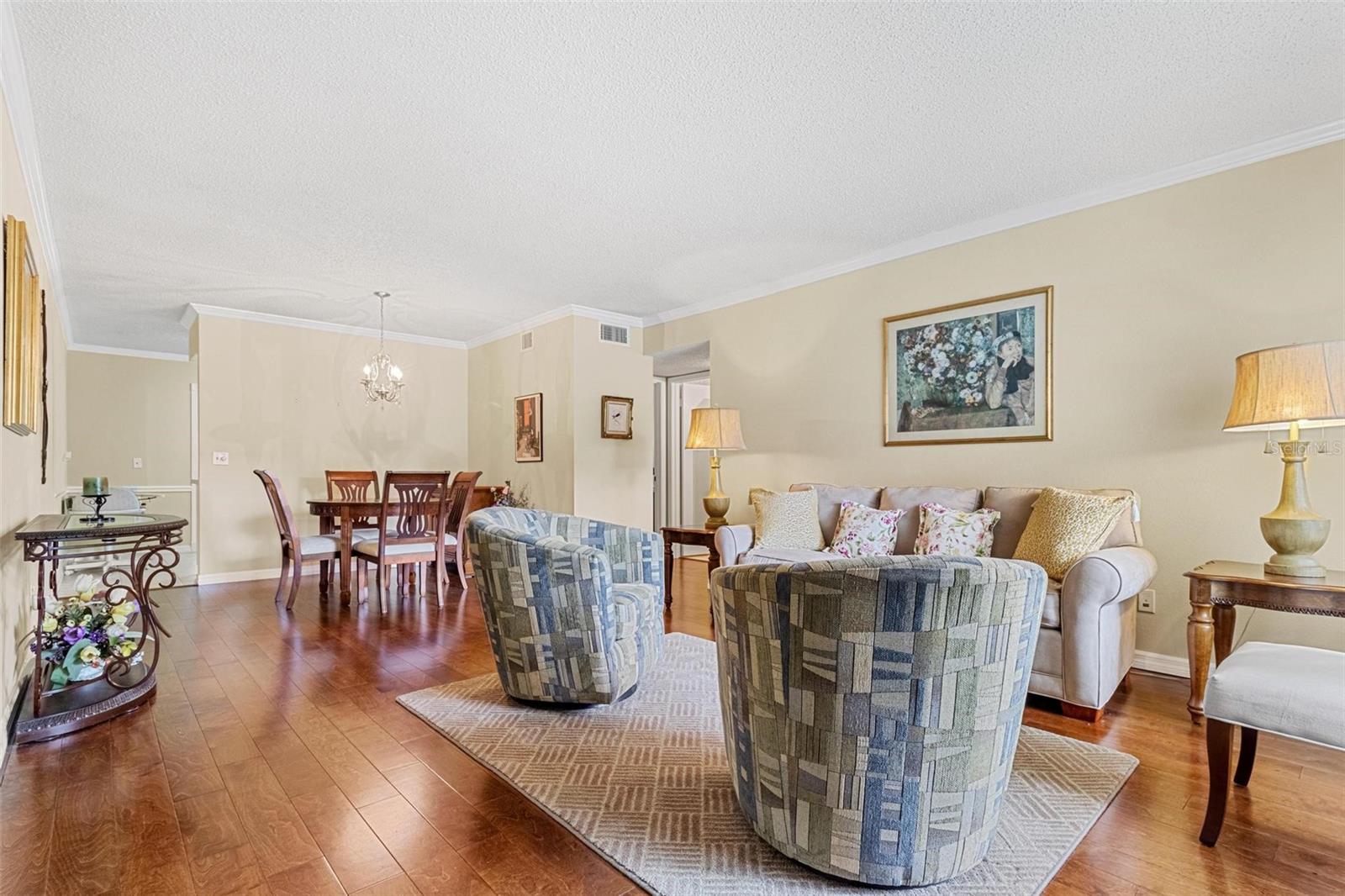 Look no further! This meticulous first floor condo offers serenity and comfort in a picturesque setting. With two bedrooms and two bathrooms, this fully furnished retreat provides an ideal living space for those seeking a peaceful lifestyle. As you enter, you're greeted by the warmth of engineered hardwood flooring that extends through the living room and hallway, adding an elegant touch to the interior. The spacious living area is perfect for relaxation or entertaining guests, with ample natural light filtering in through the updated windows. The cozy kitchen features plenty of cabinet space, making meal preparation a breeze. The airy primary bedroom features an en-suite bath, and generous closet space as well. Not to mention a washer and dryer, for your added convenience. Step outside to discover your own private patio, where you can unwind amidst the tranquil surroundings and savor the lush, wooded view. For added peace of mind during storm season, hurricane shutters are throughout, providing protection and security. With its inviting ambiance, convenient amenities, and idyllic location, this magnificent condo offers a wonderful opportunity to embrace the joys of 55+ community living. Schedule your private showing today! Assigned parking. The 55+ community has two activity centers, and two private golf courses with 9 and 18 holes, free exclusively for resident owners. There are two heated swimming pools. The remodeled Cardio Gym has the latest exercise equipment. A very pet-friendly community, there is a fenced dog park with covered seating. There are hobby studios, and a wood shop for the exclusive use of the residents. Activities include fitness classes, dancing, clubs, cards, billiards, entertainment, classes, and much more. The on-site Good Karma Café has take & bake meals and snacks. Close to beaches, transportation, shopping, entertainment, and fine dining. All room sizes, floor plans and square footage are approximate. This property is being transferred by a leasehold estate deed. Association approval is required. If financing, a 35% down payment is required. All washer, dryer and hookups must be approved by the association.